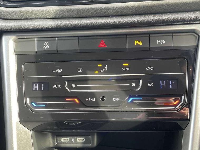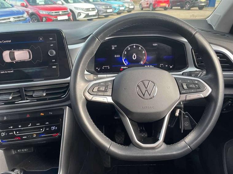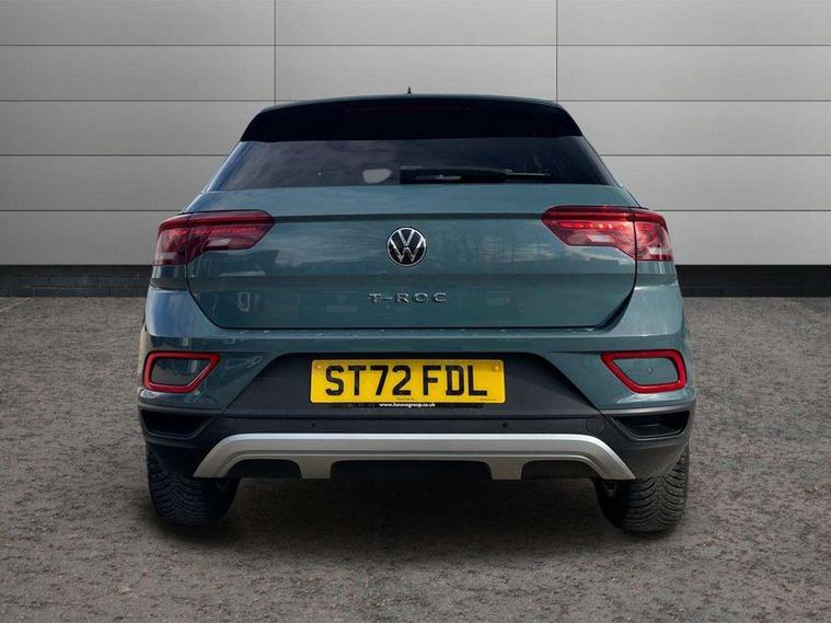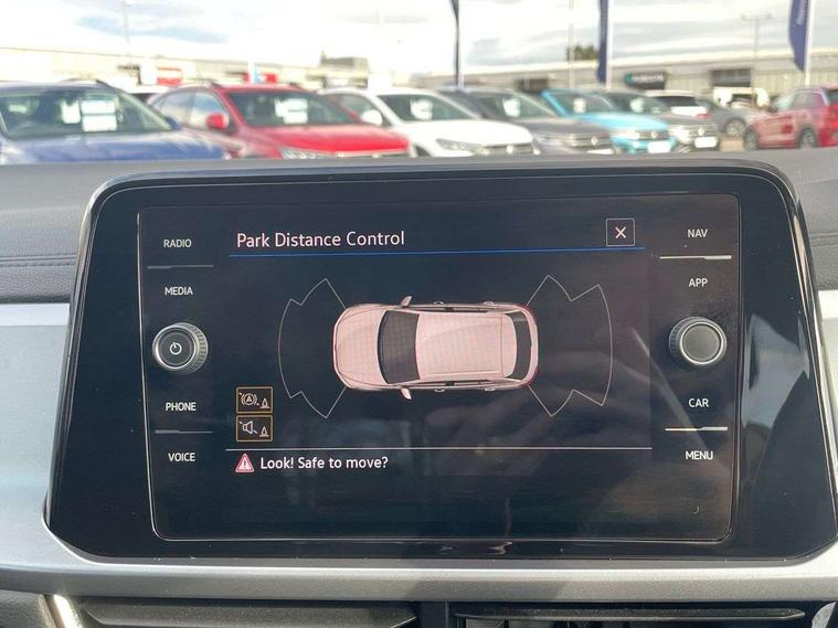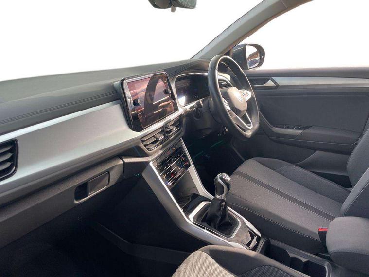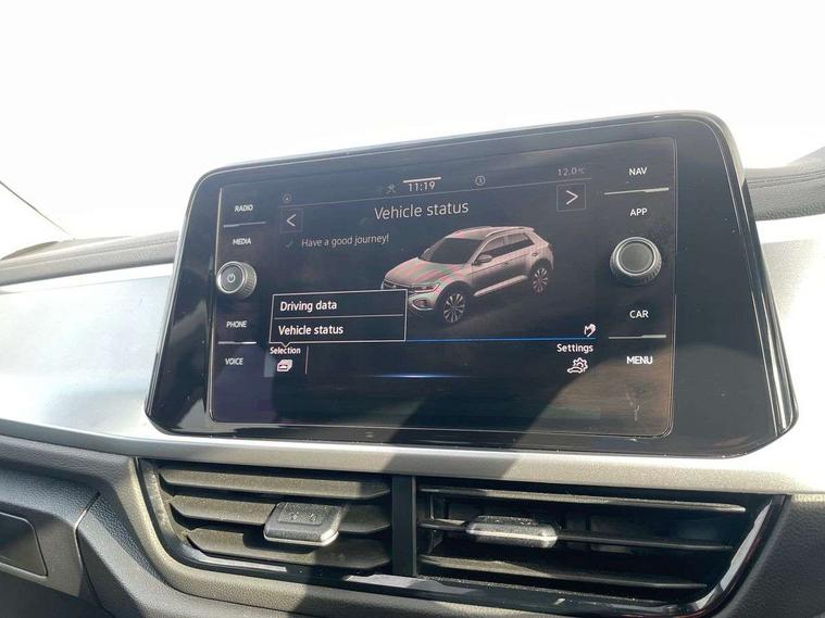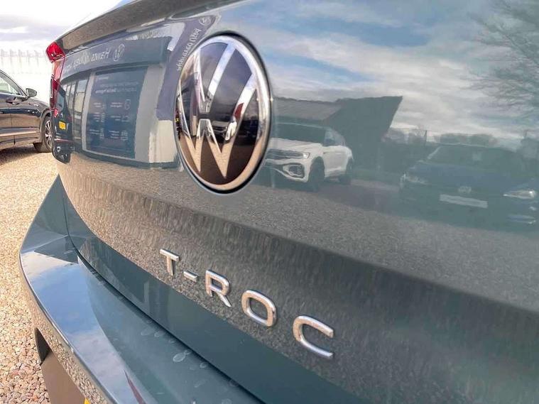 Bluetooth mobile phone interface, Driver alert system with fatigue detection, Driver tips and journey analysis, Emergency call service, Lane keeping system Lane Assist, Modified key software - reduce switch off time for key status change to Long no motion, Online services, Park assist including front and rear parking sensors, Power assisted speed sensitive steering, Service interval indicator, Tailgate/trunk lid release from outside, Think blue trainer driver tips and journey analysis, Warning sound and light for front seatbelts unfastened, Wireless app connect, Battery regeneration during braking, Front shock absorption, Rear shock absorption chassis with increased ride height, Start/stop function with battery regeneration, DAB Digital radio, Diversity antenna for FM reception, Front and rear 6 speakers, Music playback - MP3, WMA and AAC files, Premium USB cable in choice of either Apple or Android smartphone compatibility, SD card slot, Simultaneous pairing of 2 compatible mobile devices, Title and cover art display, We Connect and We Connect Plus functionality, 3rd brake light, Auto dimming interior rear view mirror, Automatic hazard lights activation under emergency braking, Automatic headlight control with LED separate daytime running lights with coming/leaving home function, Black roof rails, Body coloured bumpers and radiator grille with chrome trim and front fog lamps with chrome bezel, Body coloured exterior mirror housings and door handles, Extended roof spoiler, Exterior mirrors aspherical on driver side, convex on front passenger side, External USB type C socket and charging sockets, Front windscreen wiper with intermittent wipe and 4 position delay, Heated rear window, LED Headlights, LED rear combination lamps, LED rear number plate lights, LED tail lamp rear comination lamps, Power windows with comfort operation and circuit breaker, Rain sensor, Rear exhaust tailpipe, Rear fog light on one side and reversing lights on both sides, Rear side wing doors, Rear wash/wipe with intermittent wipe setting, Remote electrically foldable door mirrors, puddle lights and reverse activated passenger's door mirror, 12V power socket in centre console, 3 rear head restraints, 3 seat bench in 2nd row, 4 load lashing points in luggage compartment, Air care climatronic air conditoning system with active combination filter and 2-zone temperature control, Ambient lighting with mirror logo projection, Cloth upholstery, Door and side trim panel in cloth, Drawer under drivers seat, Driver/front passenger seat height adjustment, Front centre armrest, Front comfort sports seats, Front cupholders x 2, Front reading light, Instrument lighting, white adjustable panel illumination, Interior light delay, Isofix child seat preparation, Leather gearshift handle, Load-through provision with cup holder when folded down ('Unsplit rear seat bench, split folding backrest, with centre armrest), Luggage compartment lighting, Lumbar support for driver's and front passengers seat, Non-folding front passenger seat backrest, Single front passenger seat, Storage compartment in left and right luggage area, Storage compartment in rear doors, Storage compartments in driver and front passenger doors, Sunvisors with illuminated vanity mirrors, Variable boot floor, height adjustable and removable, Driver assistance pack without proactive passenger protection - T-Roc, 3 point height adj front seatbelts + pretensioners, 3 point seatbelts in outer rear with ECE label, ABS, Child locks on rear doors, Driver and front passenger airbag with front passenger airbag deactivation, Driver and front passenger safety-optimised head restraints, Drivers seatbelt reminder, Electronic parking brake, Electronic Stability Control (ESC) inc EDL (Electronic Differential Lock) and ASR (Traction Control), Front and rear passengers curtain airbag system including front side airbags, Front assist with city emergency braking and pedestrian monitoring, Front disc brakes, Front seat side impact airbags, Hill start assist, Predictive pedestrian protection, Rear disc brakes, Single tone horn, Tyre pressure loss indicator, Volkswagen roadside assistance, Alarm with interior protection, Anti-theft alarm system with interior monitoring, backup horn, and towing protection, Remote central locking with SAFELOCK, radio remote control with 2 remote control folding keys, Pewter matt decorative inserts for intrument panel, centre console and door panels at the front, Trims for alloy wheels,
