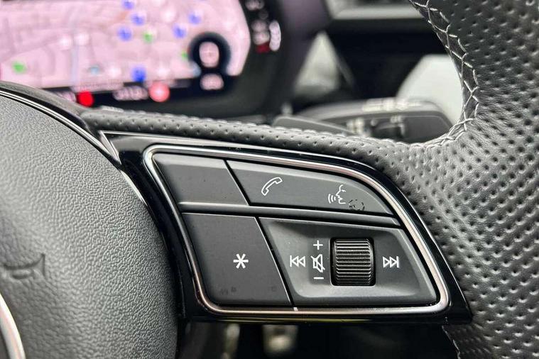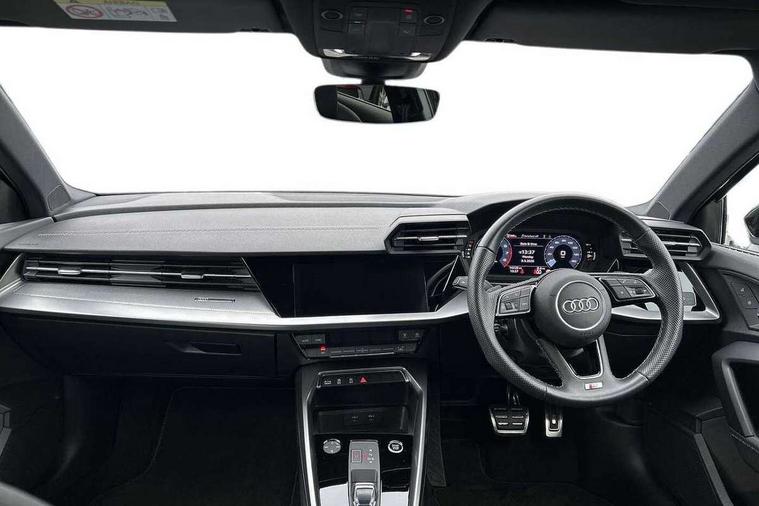 Audi drive select (Auto, Comfort, Dynamic, Efficiency and Individual), Audi smartphone interface, Audi Virtual Cockpit - 10.25" digital and colour instrument cluster, Automatic start/stop system with recuperation, Bluetooth interface, Camera based traffic sign recognition, Collision avoidance assistant, e-Call (emergency call), Electromechanical power speed sensitive steering, Lane departure warning system, MMI Navigation Plus with high resolution 10.1" colour touch screen display, Service indicator, Trip computer, Voice control system with natural language interaction, Sports suspension, 2xUSB-C connection with data and charging functions, 6 passive loudspeakers, DAB Digital radio, 3rd brake light, Acoustic glass windscreen, Aluminium window trim, Auto dimming frameless rear view mirror, Body colour exterior mirrors, Electrically adjustable/heated/folding/auto dimming door mirrors with integrated LED indications + kerb view function for passenger side, Front electric windows, Illuminated door sills with aluminium inserts at the front with S logo, LED daytime running lights, LED headlights with LED rear lights and dynamic rear indicators, Light and rain sensors, Privacy glass - dark tinted rear window, rear door and side windows, Rear electric windows, Rear side air outlets in grained matt black, Rear side wing doors, Rear wiper, S line bumpers, S roof spoiler, 12V socket and storage compartment in front centre console, 3 seat bench in 2nd row, 3 spoke leather multifunction steering wheel with paddle shift, 4 way electrically adjustable lumbar support for driver and front passenger, 60/40 split folding rear seat bench, Black cloth headlining, Dual zone electronic climate control, Front and rear centre armrest in artificial leather, Front and rear headrests, Front/rear floor mats, Height and reach adjustable steering wheel, Interior lighting - glove compartment light and right hand side, Luggage compartment floor covering, Manual boot compartment lid, Manually adjustable front seats, Seat side bolsters, Single front passenger seat, Stainless steel pedals and front footrest in black, Twin leather upholstery with front sports seats S embossed logo, Aluminium interior elements pack - A3 Sportback, LED interior lighting pack - A3 Sportback, S line styling pack - A3 Sportback, 3x3 point rear seat belts, Driver and front passenger airbag with passenger airbag deactivation, Electronic Stabilisation Control (ESC) including ABS, ASR and EDL, First aid kit with warning triangle and 2 safety vests, Front side airbags with head airbags and interaction airbag, Pre-sense front with pedestrian and cyclist detection, Seatbelt monitoring, Tyre pressure loss indicator, Anti theft alarm, Anti-theft wheel bolts, Electronically operated child locks, Immobiliser, Remote control central locking, Dark spectrum aluminium inlays, accent surfaces in the dashboard and centre console in platinum grey silk effect paint finish,