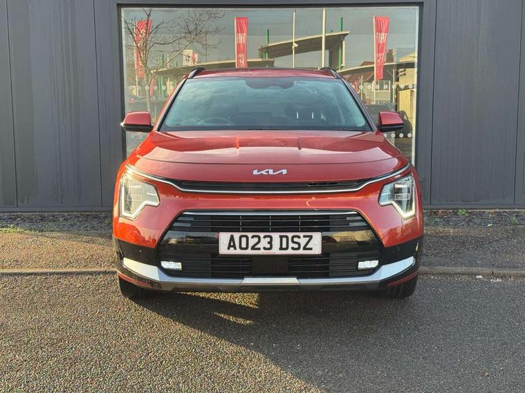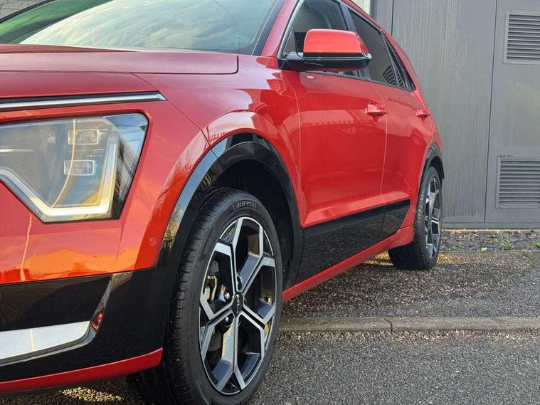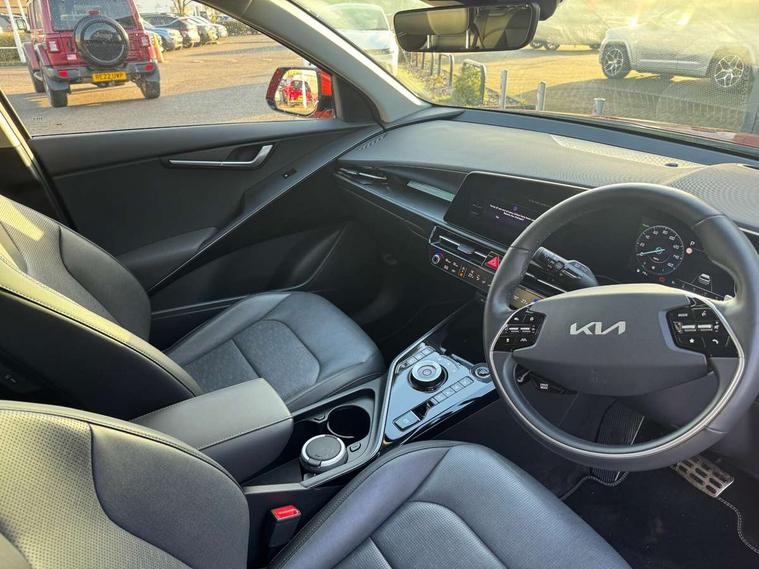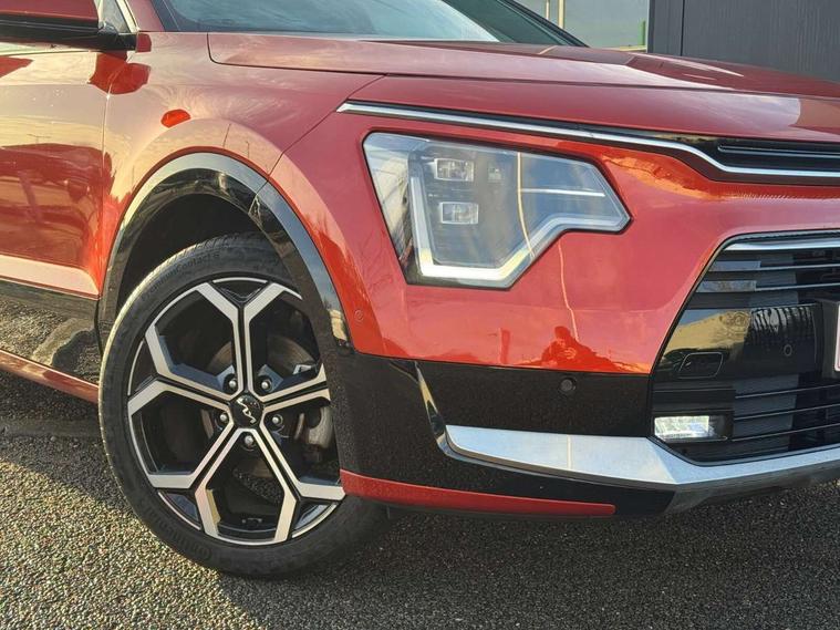 10.25" Supervision colour cluster display, 10.25" touchscreen satellite navigation, Adaptive smart cruise control function (SCC) with stop and go, Apple car play/Android Auto with voice control, Blind spot collision avoidance assist, Drive mode select (Eco, sport), E-call, Emergency stop signalling system, Forward Collision-Avoidance Assist (FCA) 1.5 - City/Pedestrian/Cyclist/Junction turning, Front parking sensors, Head up Display, Highway Driving Assist (HDA), Kia Connect (UVO), Lane Following Assist (LFA), Lane keep assist, Motor driven power steering, Parking collision avoidance assist (PCA), Power opening/closing tailgate, Rear cross traffic alert, Rear parking sensors, Remote smart parking assist, Reversing camera with dynamic guide lines, Safe exit warning (SEW), Speed limit assist, Trip computer with distance/fuel consumption/average speed, Wireless Smartphone charger, 220v AC Inverter, 'Shark fin' mobile antenna, 2 type C USB ports on front seats, 2 USB ports in centre console including 1 type C, 6 speakers, Bluetooth with music streaming, DAB Digital radio, Steering wheel mounted controls, Acoustic windshield, All round electric windows with drivers and front passenger auto up/down and safety function, Auto dimming rear view mirror, Automatic defog system, Automatic headlight control system, Black grille with chrome surround, Body colour bumpers, Body colour exterior door handles, Deluxe door scuff plates, Dual LED headlights (low and high projection), Electric heated door mirrors, Electrically folding door mirrors, Front and rear chrome skid plates, Front fog lights, Heated rear window with timer, High gloss black cladding, High gloss black door mirrors, LED daytime running lights, LED rear combination lights, LED third brake light, One touch single tilting/sliding power sunroof, Privacy glass - Rear windows and tailgate, Rain sensing front wipers, Rear fog lights, Rear side wing doors, Rear spoiler, Rear wiper, Roof rails, Solar glass windscreen, Welcome and follow-me home light functionality, Windscreen Washer Level Warning, 12V socket in front, 12V socket in luggage compartment, 3 seat bench in 2nd row, 60:40 split remote folding rear seats, All-round height adjustable headrests, Aluminium pedals, Artificial leather centre console storage box, Artificial leather steering wheel, Centre console cupholder, Chrome coating interior door handles, Driver and front passenger power adjusted seat, Driver power adjusted memory seat, Driver/passenger sunvisors with illuminated vanity mirrors, Drivers seat power lumbar support, Dual zone automatic air conditioning, Front and rear door storage, Heated front seats, Heated outer rear seats, Heated steering wheel, Illuminated glovebox, Interior door lock/unlock function, ISOFIX Child seat top tethers and anchor fixings, LED overhead console, 2nd row and luggage lamp, Luggage area load cover, Luggage board, Paddle shifts, Passenger premium relaxation seat, Power adjustable lumbar support on front passenger seat, Rear armrest, Seatback pocket - driver, Seatback pocket - front passenger, Shift by wire SBW, Single front passenger seat, Tilt/telescopic adjustable steering wheel, Vegan leather upholstery, Ventilated front seats, Ventiliation ducts to rear compartment, Towing pack - Niro, 3 point seatbelts on all seats, ABS, Automatic unlocking of doors in case of impact, Centre side front airbags, Curtain and side airbags, Drivers knee airbag, Dual shell horn, Electric parking brake with auto hold function, Electronic stability control, Front passenger airbag deactivation, Height adjustable front seatbelts, Hill start assist control (HAC), Manual rear child locks, Rear seat alert system, Traction control, Tyre pressure monitoring system, Alarm system and engine immobiliser, Deadlocks, Engine Start/Stop Button with Smart Entry System, Locking wheel nuts, Visible vehicle identification number, Warranty - 7 Years/ 100, 000 miles, Centre fascia chopped carbon, 18" Alloy wheels, Tyre mobility kit,