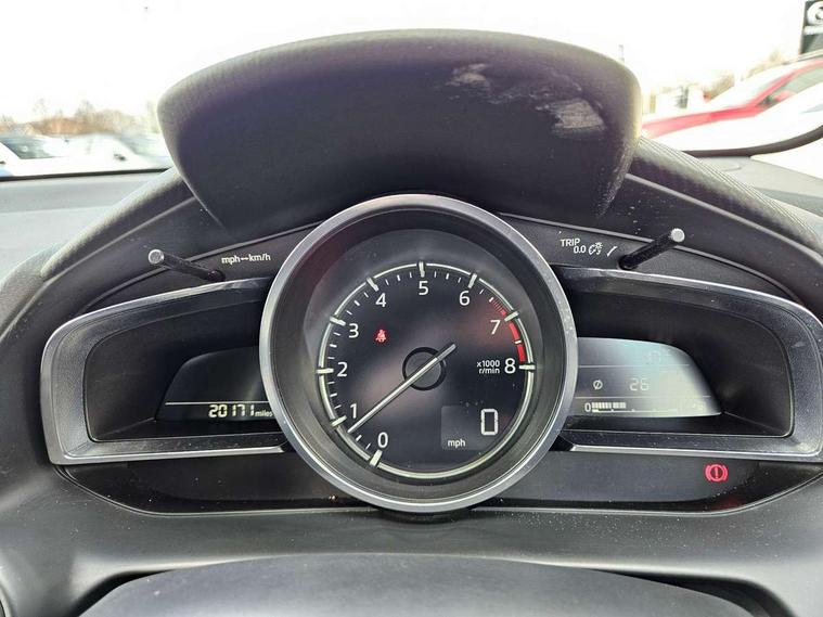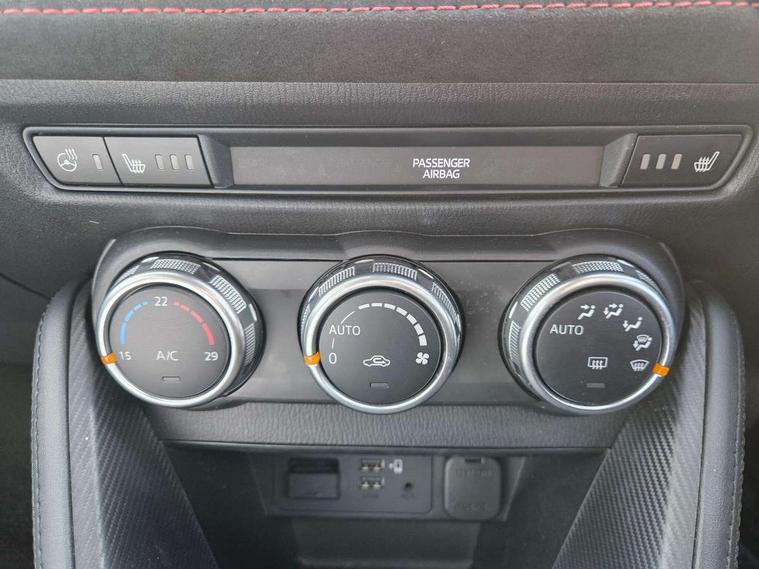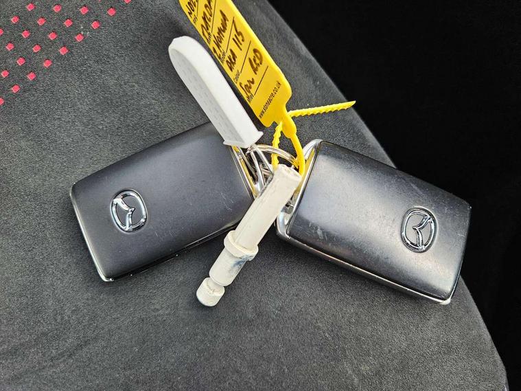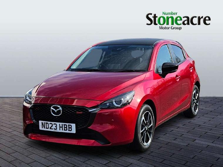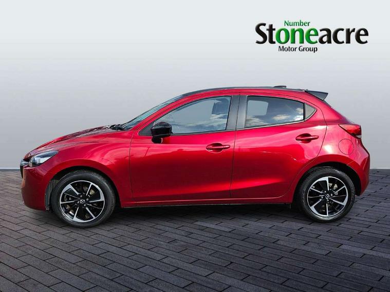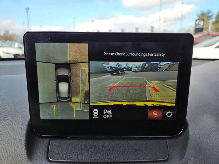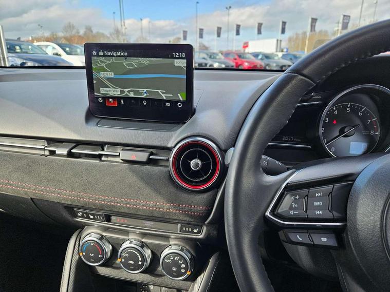 Adjustable speed limiter, Analogue rev counter, Cruise control, Digital instrument cluster, Digital speed display meter, E-call, Emergency stop signalling system, Engine start/stop button, Integrated bluetooth, Lane departure warning system, Lane keep assist, Mazda connect with 8" colour touch screen, Navigation system, PAS, Service indicator, Tailgate, Trip computer, Wireless Apple CarPlay and wired Android Auto, i-stop, Mazda M hybrid, AM/FM/DAB radio with 6 speakers with USB and AUX inputs, Multimedia Commander including separate volume dial, Steering wheel mounted audio/bluetooth controls, Auto dimming rear view mirror, Auto headlight levelling, Black carbon effect roof, Black door mirrors, Black Shark-fin antenna, Body coloured front bumper with black lower bezel, Body coloured rear bumper with black lower mouldings and red accent, Chrome exhaust tailpipes, Coming/leaving home lighting function, Dusk sensing headlights, Electric adjustable/heated/folding door mirrors, Electric front/rear windows with one touch auto up/down for driver's window, Front honeycomb grill with red accent, Gloss black finish signature wing, Heated rear window, LED indicator lights, LED third brake light, Privacy glass, Rain sensing front wipers with adjustable sensitivity and speed, Rear side wing doors, Rear wiper, Signature LED daytime running lights, 3 seat bench in 2nd row, 60/40 split rear seats, Black/red air vent accents, Climate control air conditioning, Driver, Front passenger and two rear grab handles with coathooks, Drivers seat manual slide recline and height adjustment, Drivers/front passengers covered vanity mirrors and drivers ticket holder, Front centre storage with two cupholders, Front head restraints, Front passenger and driver door pockets, Front passenger seat manual slide, recline and height adjust, Front passenger seatback pockets, Gear shift indicator, Glovebox, Heated front seats with 3 stage setting, Heated leather steering wheel, Interior courtesy light with integrated spotlight, ISOFIX child seat anchorage points attached on outer rear seats, Leather gear knob, Leather handbrake, Leather/Cloth upholstery, Luggage compartment light, Single front passenger seat, Three height adjustable rear head restraints, Tilt/telescopic adjustable steering wheel, Driver Assistance pack - Mazda 2, 2x3 point front seatbelts with pre-tensioners, 3 point seatbelts on all rear seats, Anti-lock braking system (ABS), Collision mitigation braking system, Dynamic stability control + Traction control, ESP, Front and rear curtain airbags, Front driver, passenger and rear seat seatbelt warning, Front dual stage driver and single stage front passenger airbags, Front side airbags, Front smart city brake support, G-Vectoring control plus, Hill launch assist, Manual child lock in rear doors, Passenger airbag cut-off switch, Tyre pressure monitoring system, Deadlocking system, Power door locks, Remote central locking, Smart keyless entry, Thatcham accredited alarm and immobiliser, Black soft touch dashboard panel with red stitching colour coordination, 16" Black metallic machined alloy wheels, Emergency tyre repair kit,
