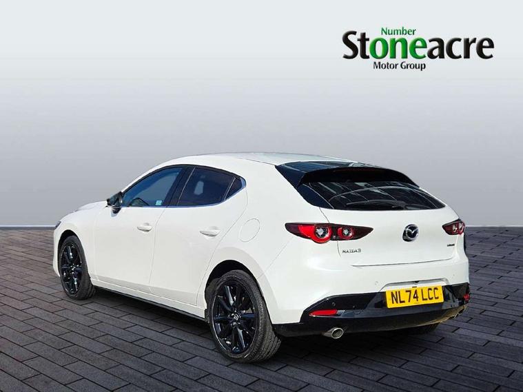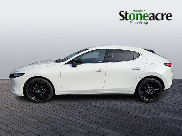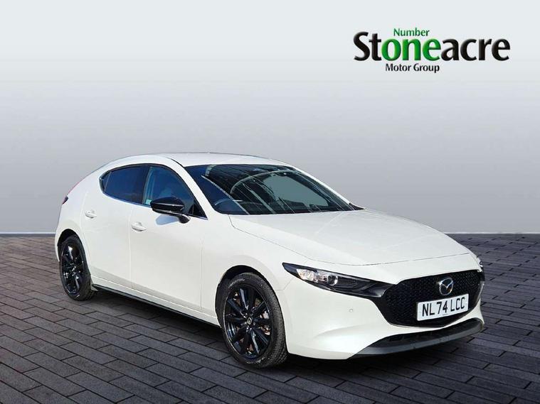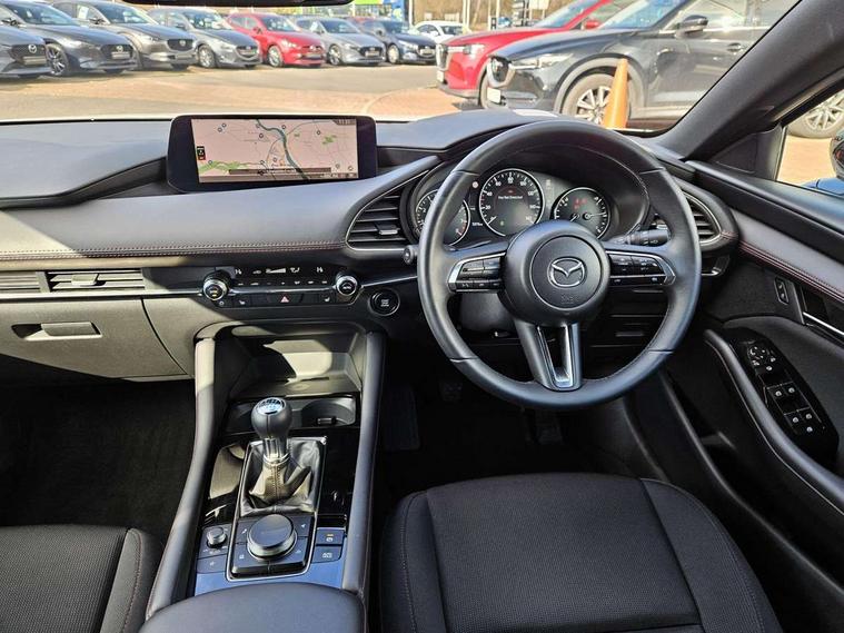 10.25" display with Mazda Connect infotainment, 7" colour TFT display, Audio transfer from bluetooth devices, Blind spot monitoring with rear cross traffic alert, Colour active driving display inc Windscreen projected, Traffic Sign Recognition, turn-by- turn navigation and Mazda Radar Cruise Control information, Digital instrument cluster, Driver attention alert system, E-call with GPS, Emergency stop signalling system, Engine start/stop button, Front and rear parking sensor with audible and visual warning, Head up Display, Integrated bluetooth with steering wheel mounted controls, Intelligent speed assist, Lane keep assist system (LAS) with Lane departure warning system (LDWS), Mazda connected services, Mazda Navigation System with european mapping, Mazda Radar Cruise Control, Mobile App interface, Multimedia Commander, PAS, Reversing camera, Service indicator, Tailgate, Traffic sign recognition (TSR), Trip computer, Wireless Apple CarPlay/Android Auto, Wireless charging, Cylinder Deactivation, i-stop, 2 USB-C ports in the front, Mazda Multimedia System with AM / FM / DAB radio with 8 speakers, Auto dimming rear view mirror, B-pillar garnish in piano black, Black door mirrors, Coming/leaving home lighting function, Dark metallic finish signature wing, Daytime running lights, Dual chrome tailpipes tip, Dusk sensing headlights, Electric front/rear windows with one touch/auto up/down, Electrically adjustable, heated auto power folding door mirrors, Front body coloured bumper with black lower bezel, Front kodo turn signal, Gloss black finish front grille, Gloss black rear roof spoiler, High beam control, LED front fog lights, LED headlamps with auto levelling, LED indicator lights, LED rear combination lights, LED third brake light, Privacy glass with dark tinting on rear side windows and rear window, Rain sensing front wipers with adjustable sensitivity and speed, Rear colour coded bumper with gloss black lower moulding, Rear fog lights, Rear side wing doors, Speed adjustable rear wash wiper with intermittent wipe, 12v electrical power outlet, 3 seat bench in 2nd row, 60/40 split fold down rear seats, Black with red stiching steering wheel, gearshift gaitor, dashboard panel, armrest, Cloth upholstery, Dark cloth door panel inserts, Dark roof headlining, ceiling and pillars, Driver seat manual slide, recline, height and seat tilt adjust, Driver, front passenger and two rear door pockets, Driver, Front passenger and two rear grab handles with coathooks, Driver/passenger sunvisors + vanity mirrors (drivers side with ticket holder), Dual zone climate control air conditioning, Folding rear centre armrest with two cup holders, Front and rear courtesy lamps, Front armrest, Front centre storage with two cupholders, Front head restraints, Front passenger seatback pocket, Front passengers seat manual slide, recline and height adjustment, Gear shift indicator, Heated front seats with 3 stage setting, Illuminated glovebox, Interior colouration dashboard and doorcards in black with dark stitching, ISOFIX child seat anchorage points attached on outer rear seats, Leather wrapped gear shift knob, Leather wrapped steering wheel, LED interior light, LED light in luggage compartment, Power outlet in luggage compartment, Roof mounted sunglasses holder, Single front passenger seat, Three height adjustable rear head restraints, Tilt/height adjustable steering wheel, 3 point ELR front seatbelts with pretensioners, 3 rear 3 point seatbelts with ELR, Anti-lock braking system (ABS), Drivers knee airbag, DSC - Dynamic Stability Control, Dual stage driver and single stage passenger airbags, EBD - Electronic brakeforce distribution, Electronic parking brake with auto disengage function and auto hold function, Front and rear curtain airbags, Front passenger airbag cut-off switch, Front side airbags, Front smart city brake support, G-Vectoring control plus, Hill launch assist, Intelligent Traction Control system, Manual child lock in rear doors, Mild Hybrid system with regenerative braking, Seatbelt reminder for driver/front passenger and rear seats, Tyre pressure monitoring system (TPMS), Auto door lock when driving, Remote central locking + deadlocks, Smart keyless entry, Thatcham accredited alarm and immobiliser, 18" Black alloy wheels, Emergency tyre repair kit,