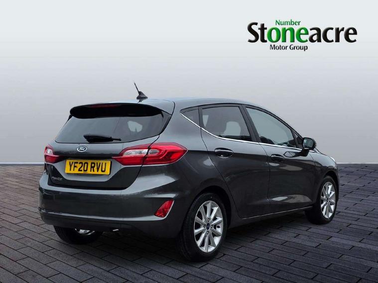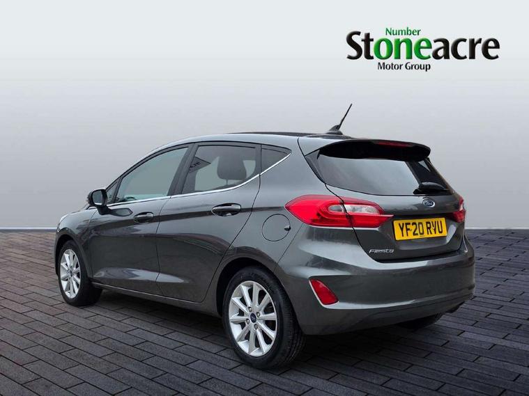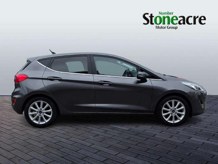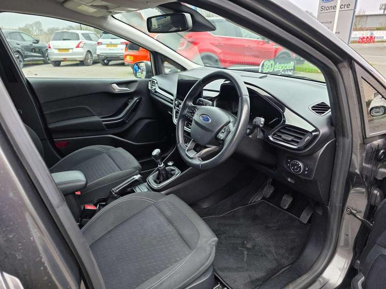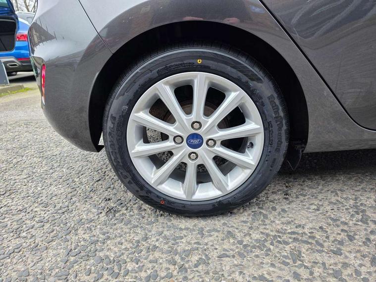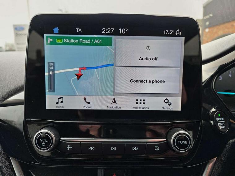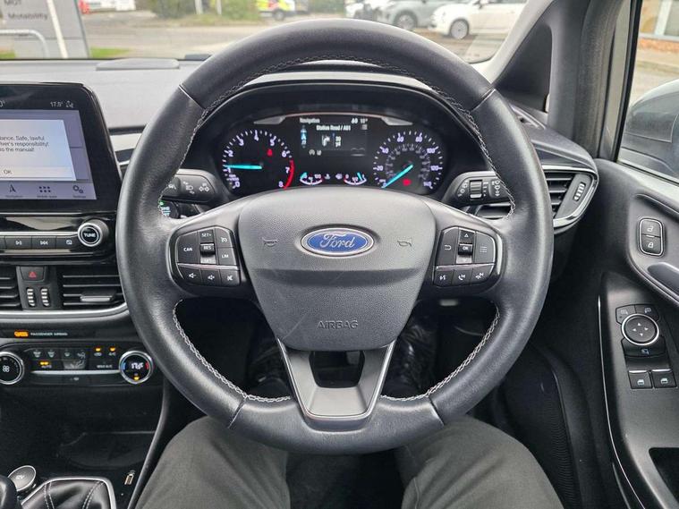 Driver assistance pack - Fiesta/Titanium/Titanium X/Active B+O/Active X/ST-Line X, NCAP Pack - Fiesta, 16" 10 spoke alloy wheels, MyKey system, Remote central locking & engine immobiliser, Thatcham Cat.1 alarm, 2 USB ports, Auxiliary input socket, DAB Digital radio, Steering wheel mounted controls, 3 point seatbelts on all rear seats, ABS+EBA, Curtain airbags, Driver and passenger airbags, Drivers knee airbag, Electronic stability control with hill start assist, Front passenger airbag deactivation, Front side airbags, Seatbelt warning, Tyre pressure monitoring system, Auto dimming rear view mirror, Body colour bumpers, Body colour door handles, Body colour electric adjustable heated door mirrors with integral indicators, Body colour rear spoiler, Chrome beltline trim, Chrome lower window surround, Cornering front fog lights, Electric front windows/one touch facility, LED Night signature to rear lights, LED rear lights, Power foldable door mirrors with puddle lights, Privacy glass, Quickclear heated windscreen, Rain sensing wipers and auto dimming rear view mirror, Rear privacy glass, Rear wiper, Tinted glass, Upper front grille chrome surround, 12V Accessory socket in centre console, 3 spoke leather trimmed steering wheel with audio control, 60/40 split folding rear seat, Adjustable head restraints, Ambient lighting, Boot carpet, Centre console with armrest and illuminated cupholders, Chrome inner door handles, Cloth upholstery, EATC - Electronic Auto Temperature control, Footwell illumination, Front and rear velour floor mats, Front map reading lights, Front seat and rear pockets, Height adjustable driver's seat, Illuminated glovebox, Leather gear knob, Leather trimmed handbrake handle, Load area light, Luxury woven headliner, Overhead console with sunglasses holder, Pollen filter, Rake/reach adjustable steering wheel, Rear centre head restraint, Bluetooth system, Electric power steering, Ford easy fuel, Ford SYNC 3 Navigation system incl 8" touchscreen, 7 speakers, FordPass connect, Apple carplay, android auto, voice control and emergency assistance, Trip computer,