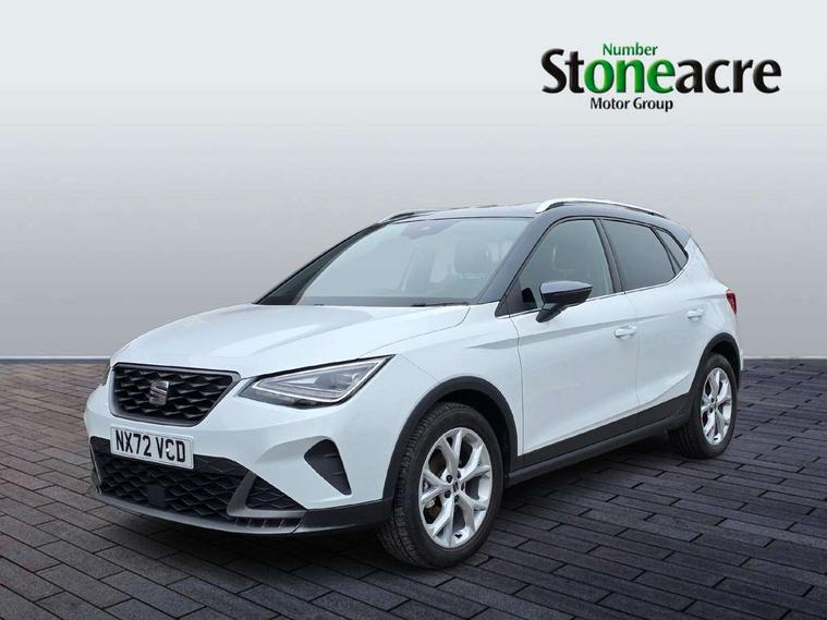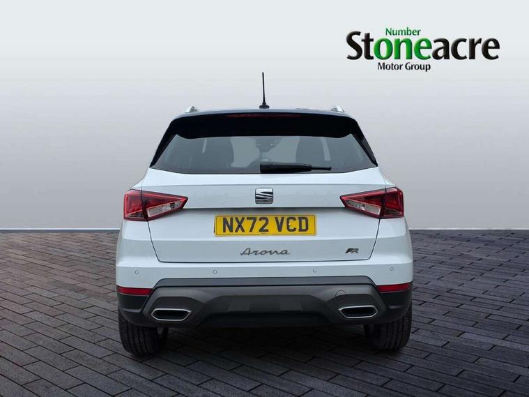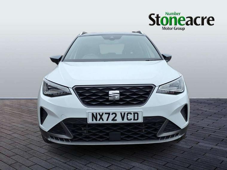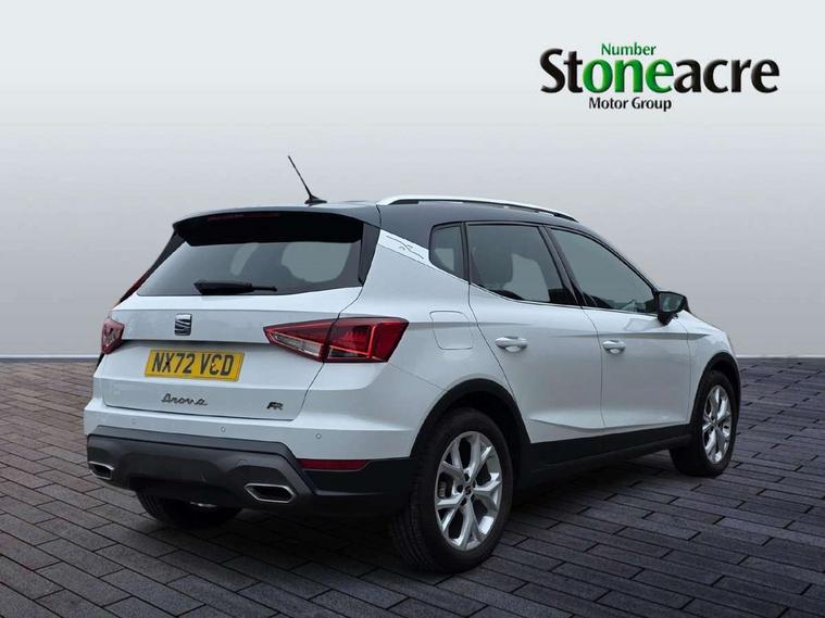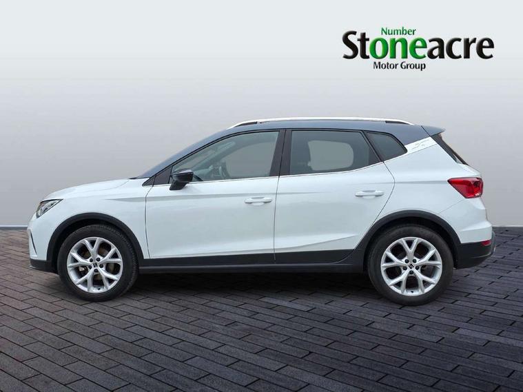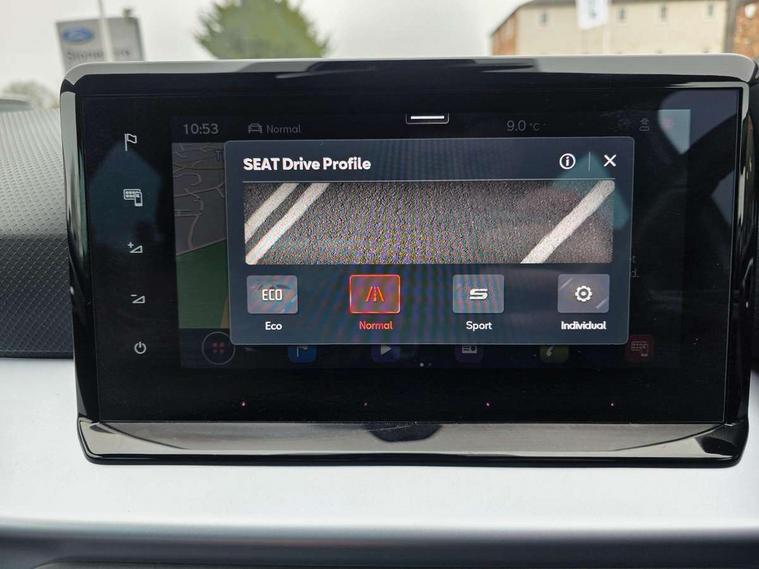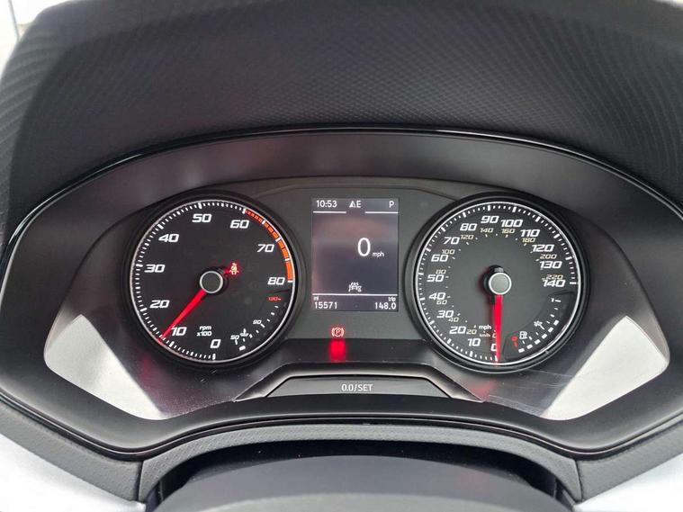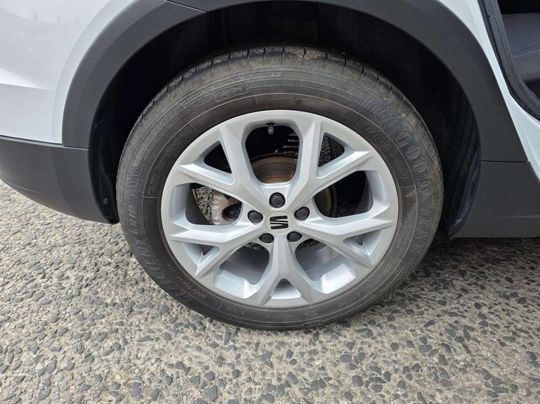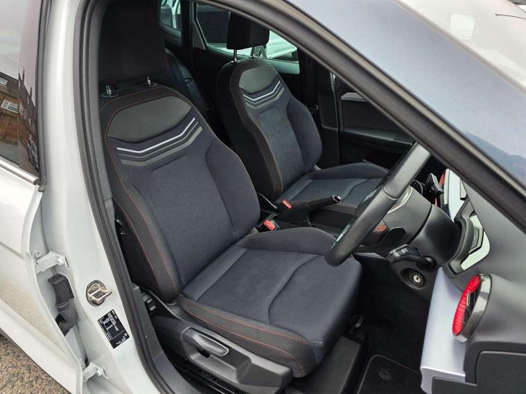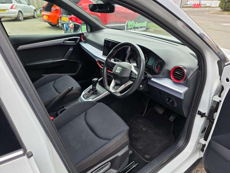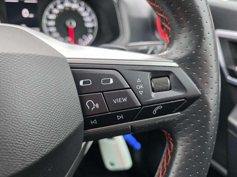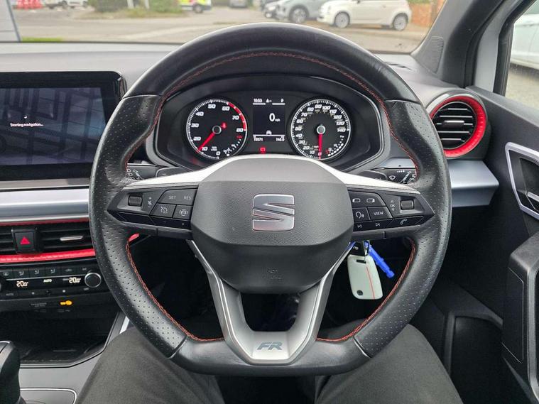 'Lights On' Reminder warning buzzer, 8" Digital cockpit, Digital clock, E-call, Electric speed sensitive power steering, Full Link Smartphone Integration with Mirror Link, Apple Car Play, Google Android Auto with USB Type C cable for Apple and Android compatibility, Lane keeping system, Low fuel warning light, Outside temperature display, Rear parking sensor, RPM counter, Seat connect with safety, service, remote and online, SEAT Drive profile - Four different models normal-sport-eco-individual, steering response, throttle response and gear shifts mode, Trip computer, Wireless phone charger, 9.2" colour touchscreen with navigation system, voice control and USB port (type c), Bluetooth interface for hands free and audio streaming, DAB digital radio and AM/FM radio, Steering wheel mounted audio controls, Anti theft roof antenna, Auto dimming interior rear view mirror, Automatic activation of hazard warning lights, Body coloured bumpers, Body coloured door handle inserts, Chrome roof rails and window surrounds, Dark tinted rear windows, Electric front/rear windows, Electrically adjustable, heated and folding door mirrors, Front fog lights with cornering function and rear fog light, FULL LED automatic headlights with dynamic headlight range control, coming and leaving home, LED daytime running lights, LED rear tail lights and licence plate lights, Protective side mouldings, Rain sensing wipers, Rear side wing doors, Rear spoiler, Rear window wash/wipe, Roof colour door mirrors, Third brake light, Twin exhaust pipe styling hidden exhaust pipe, Visible VIN plate, Windshield wiper with intermittent control and potentiometer, 2 cupholders, 3 seat bench in 2nd row, 60/40 split folding rear seat, Aircare filter, Black interior roof, Cloth upholstery, Double boot floor, Driver sunvisor with covered mirror + card holder, Dual zone climate control, Front courtesy light with 2x front and 2x rear reading lights, Front sport seats, Gear shift indicator, Height adjustable front seats, Height/reach adjustable steering column, Illuminated boot, Instrument lighting with brightness control, Interior ambient lighting, Interior light in footwell, central console and door panel, ISOFIX points in outer rear seats with top tether anchorage points, Passenger sunvisor with vanity mirror, Perforated flat bottomed leather steering wheel/gear knob/handbrake with red stitching and FR logo, Single front passenger seat, Steering wheel mounted gearshift paddles, Two front and three rear height adjustable headrests, Interior chrome pack - Arona, 3 point seatbelts on all rear seats, ABS, Active front headrests, Child locks on rear doors, Driver and front passenger airbags with front passenger airbag de activation, front side and curtain airbags, Electronic stability control, Emergency Brake Assist (EBA) and front assist, Front and rear seatbelt reminder, Hill hold control, Multi-Collision braking, Tiredness recognition system, Traction control, Tyre pressure monitoring system, Alarm with back-up horn, Electronic engine immobiliser, Locking wheel bolts, Remote central locking + deadlocks, Tow away protection, Titan black dashboard, 17" Dynamic alloy wheels,