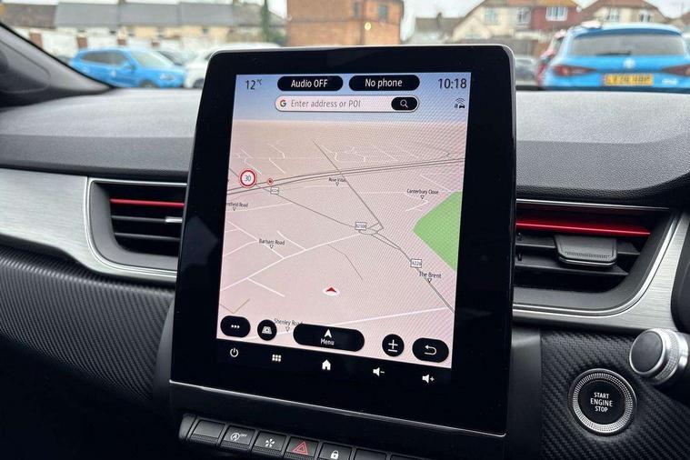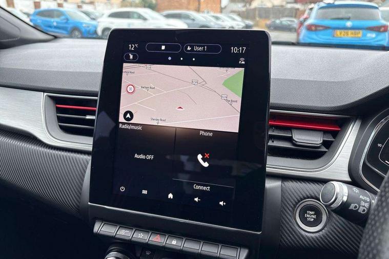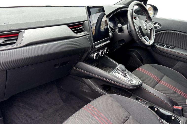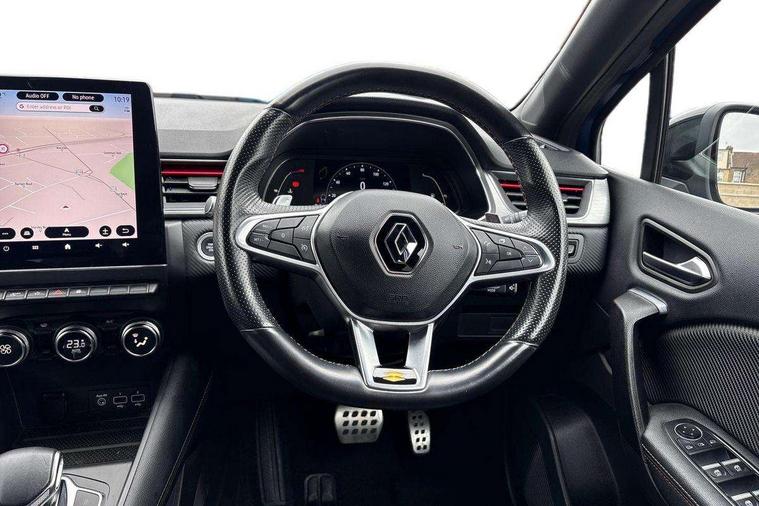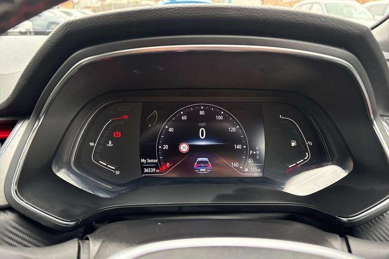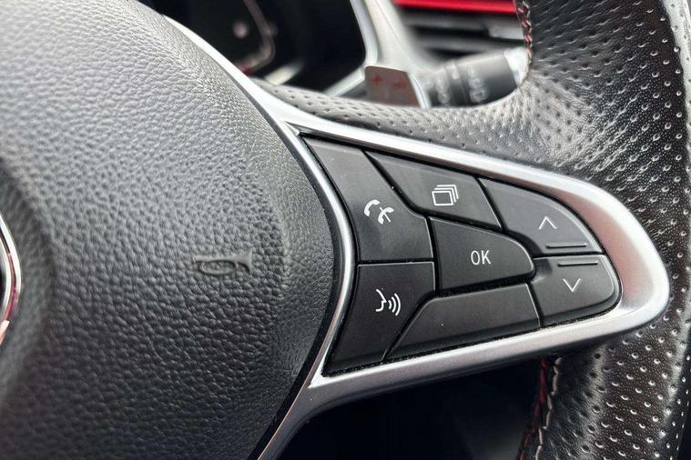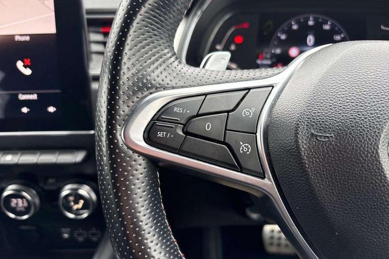 10" TFT Driver information display, Cruise control + speed limiter, eCall emergency call system, Eco mode, Front and rear parking sensors with rear view camera, Gear change indicator, Lane departure warning system, Lane keep assist, Multisense with 3 driving modes + 8 ambient lighting colours, Traffic sign recognition with over speed prevention, Trip computer, Variable assistance power steering, EasyLink Nav 9.3" portrait touchscreen with navigation, bluetooth, DAB radio, USB ports, compatible with Apple carplay/Android auto, Aluminium Renault sport door sills, Auto dimming rear view mirror, Automatic front wipers with rain sensors, Automatic headlights, Automatic high beam - AHB, Black side door protection with chrome effect, Body colour door handles, Body coloured bumpers, C Shaped LED front and rear lighting signatures with 3D effect on the rear lights, Double chromed exhaust tailpipes element, Drivers one touch window with anti-pinch feature, Electric adjustable/heated/folding door mirrors, Electric rear windows, Extra tinted glass in rear windows and tailgate, Frameless rear view mirror, Front bumper with F1 blade and honeycomb front grille, Front grille with chrome upper trim, Full LED headlights, Grey front and rear skid plate, LED front fog lights, LED rear fog light, Longitudinal roof bars, Rear wiper, RS Line badges on front wing and hatch door, Shark fin antenna, 12V Accessory socket, 3 rear headrests, 60/40 split and fixed base rear seat bench, Aluminium pedals, Automatic climate control with one touch demist function, Black roof lining, Centre console storage tray, Flying console with e-shifter, Front head restraints, Glovebox, Heating system with pollen filter, Height adjustable driver's seat, Height adjustable passenger seat, Height/reach adjust steering wheel, ISOFIX child seat fixing points on rear outermost seats, LED front roof lights, Middle console with armrest and storage, Perforated leather steering wheel with red stitching and RS Line badge, Rear air vents, Red insert on air vent, RS Line synthetic leather/cloth upholstery with red lines and red stitching, Sliding rear bench, 3 rear seatbelts, ABS+EBA, AEBS, Distance warning alert, Driver and front passenger, side, head and curtain airbags, Driver height adjustable seat belt, Electric parking brake with auto hold function, Electronic stability control, Front and rear no seatbelt warning sound, Front dash warning indicator in case of heavy braking, Front driver and passenger side airbag deactivation, Hill start assist, Rear door and window child locking function for rear door, Tyre pressure warning light, Anti drill door locks and locking fuel cap, Central door locking, Deadlocking system, Hands free keycard with push button and start/stop function, RAID (Renault Anti-Intruder Device) automatic door locking, Carbon style soft touch dashboard, 18" Le castellete diamond cut alloy wheels,