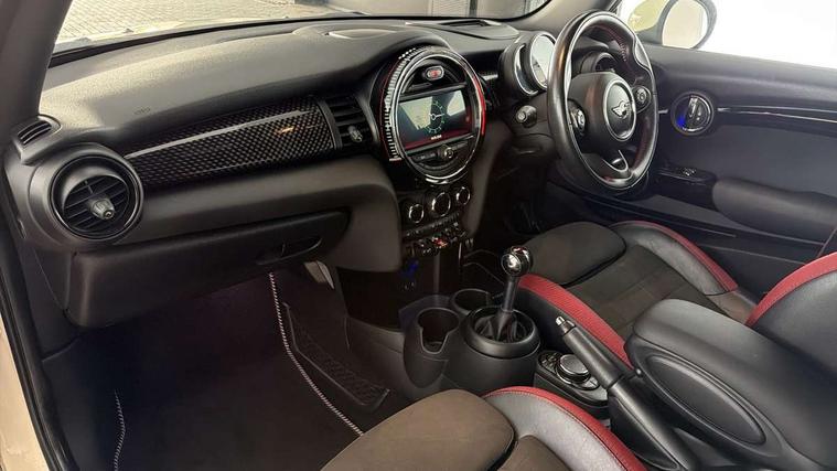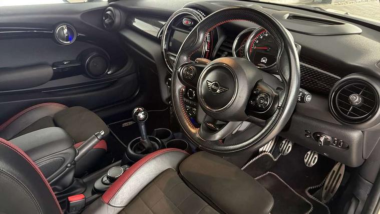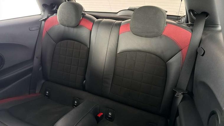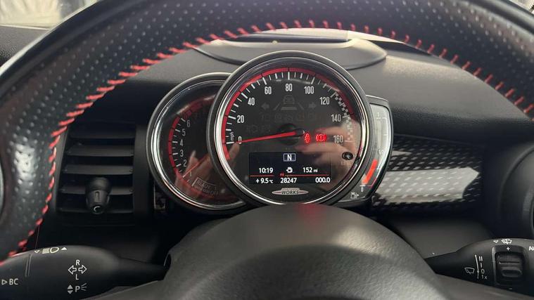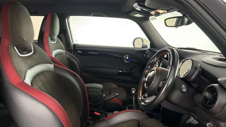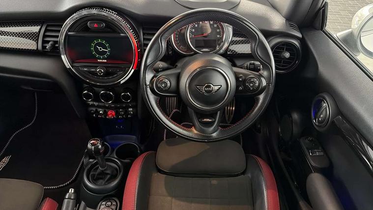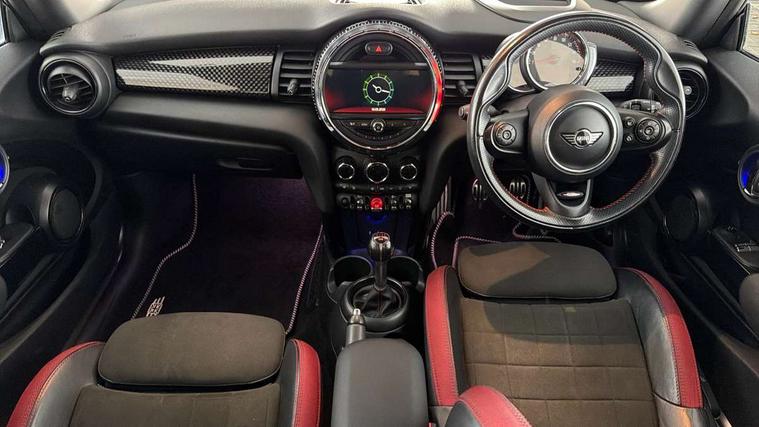 Acoustic seat-belt warning, Basic bluetooth function with USB audio, Brake fluid level warning light, Brake pad wear indicator warning light, DTC - Dynamic traction control, Exterior temperature gauge, Intelligent emergency call, MINI Driving Modes - centre toggle switch to control driving setting (sport, mid and green), MINI TeleServices, Oil level indicator, On board computer, Push button starter, Service interval indicator, Servotronic PAS, Electronic differential lock, Performance Control, Auxiliary input socket, DAB digital radio module, 2 speed wipers+intermittent wipe, Anti dazzle mirror, Anti trapping/one touch open close front windows, Body colour scoop integrated into engine- compartment lid, Body coloured bumpers, Chili red grille bar, Chrome bezels around rear lights and headlights, Chrome door handles, Chrome plated fuel cap, Chrome plated trim on bottom edge of window, Chrome strip on lower grille, Electric front windows, Electric rear windows, Electrically adjustable door mirrors, Extended wheel arches, Follow me home headlights, Green tinted heat insulating glass, Heated door mirrors/heated windscreen washers, Heated rear window with auto timer, High gloss black tailgate, Honeycomb radiator grille, John Cooper Works body kit, John Cooper Works roof spoiler, LED fog lights, LED rear lights, Metal look door sill finishers, Rear wiper, Side scuttles, Twin chromed exhaust pipes, White indicator lights, 2 rear head restraints, 4 boot load lashing points, 6 way manually adjustable passenger seat, 6-way manually adjustable driver's seat, Active carbon filter, Adjustable front seats backrest, Air recirculation system, Anthracite headlining, Auxiliary socket in centre console storage compartment, Centre console storage, Driver's seat height adjuster, Driver/passenger sunvisors, Easy entry seats, Front and rear cupholders, Front head restraints, Front passenger grab handle, Front seat backrest storage nets, Front sports seats, Gear/selector and handbrake in artificial leather, Internal chrome door handles, Isofix child seat preparation, Luggage compartment lighting, Multifunction steering wheel, Passenger seat height adjuster, Reach + rake adjustable steering column, Rear grab handles, Rear storage trays, Split folding rear seats, Stainless steel pedals with rubber inserts, Storage compartments in doors, Toolkit in luggage compartment, 3 point seatbelts, 3x3 point rear seatbelts, ABS/EBD, ASC+T, Brake calipers in red, Cornering brake control (CBC), Crash Sensor - activates hazard/interior lighting + unlocks doors, Driver and passenger airbags, Driver/front passenger side airbags, DSC - Dynamic Stability Control, Fuel cut off safety device, Head airbags, Hill start assist, Manual passenger airbag deactivation function, Seatbelt pretensioners, Tyre pressure warning, Ventilated front disc brakes, Drive away door locking, Locking wheel bolts, Remote central locking/doors+fuel cap+tailgate, Second remote key, Thatcham category 1 alarm + immobiliser,