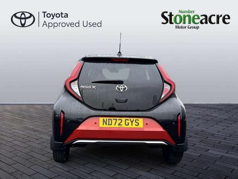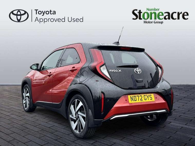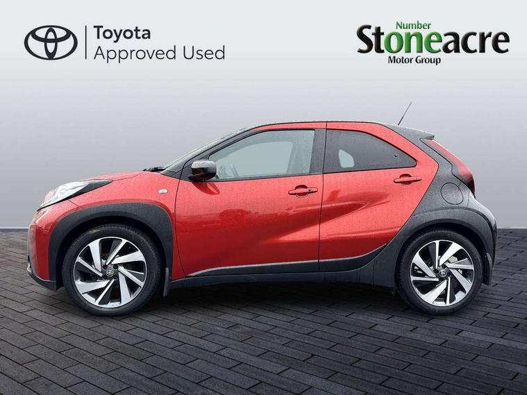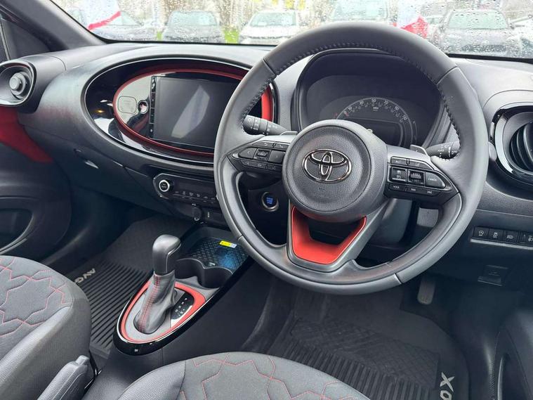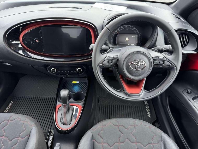 4.2" TFT colour screen, Adjustable speed limiter, Analogue speedometer, Bluetooth connectivity, Digital tachograph, Driver attention alert system, eCall emergency call system, ECO-driving indicator, Electric power steering, Front and rear parking sensors with auto brake, Intersection turn assist, Key reminder warning, Noise reduction kit, Pre collision system with emergency steering assist, Remote boot door release on key, Reversing camera with static guide lines, Smart entry and push button start, Speed limit display, Start and stop, Wireless charger, Wireless Smartphone Integration includes Apple CarPlay and Android auto, Vehicle Stability Control (VSC), 4 speakers, 9" HD multimedia display touch screen with Toyota smart connect, DAB digital audio broadcast, USB connector, Auto headlights, Auto wipers, Automatic headlights cut-off, Automatic high beam On/Off switch, Bicycle towing hook, Black fog light surrounds, Black side protection mouldings, Black wheel arch mouldings, Body colour door handles, Body coloured front bumper, Boot door scuff plate, Eclipse black rear bumper, Electric heated door mirrors, Follow me home headlights, Front and rear underruns in silver, Front fog lights, Front power windows, Gloss black door mirrors, Gloss black upper front grille, Headlight cut-off reminder, LED daytime running lights guide, LED front light guide, LED High mounted stop lamp, LED projector headlights, Manual day/night rear view mirror, Manual headlight levelling, Pagoda roof, Power adjustable door mirrors, Privacy glass, Rain sensor, Rear combination lights LED bulb type, Rear side wing doors, Rear windscreen defogger, Rear windscreen wiper, Remote hazard lights system, Short antenna, Variable intermittent windscreen wipers, 12v power outlet - front, 2 seat bench in 2nd row, 3 spoke leather steering wheel, 50/50 split folding rear seat, Adhesive roof headlining, Adjustable speed limiter switch on steering wheel, Audio and telephone switches on steering wheel, Auto air conditioning, Black roof lining, Body colour satin anodised insert on steering wheel, Boot light, Centre room light, Chrome interior door handles, Chrome surround on air conditioning buttons, Clean air filter, Floor mats, Front and rear cup holders, Front head rest deco art, Front head restraints, Gear shift indicator, Height adjustable driver seat, Intelligent adaptive cruise control switch on steering wheel, ISOFIX child restraint system on rear seats, Lane departure alert switch on steering wheel, Leather gearshift knob, Light blue ambient lighting in centre console, Manual tilt steering wheel, Manually reclining and sliding driver seat, Manually reclining and sliding front passenger seat, Multimedia switches on steering wheel, Paddle shift levers on steering wheel, Partial synthetic leather upholstery, Pollen filter, Rear door pockets, Rear head restraints, Remote air-conditioning system, Satin silver insert on gear shift knob, Single compartment glovebox with lights, Single front passenger seat, Soft tonneau cover, Sun visors with mirror on driver and passenger side, Voice recognition switch on steering wheel, Toyota safety sense pack - Aygo X, Anti lock braking system + Electronic brake force distribution, Child safety door lock, Emergency brake light signal (EBS), Hill start assist control (HAC), Passenger airbag on/off switch, Seat belt reminder for front and rear seats, Supplement restraints system (SRS) - 6 airbags, Traction control, Tyre pressure warning system, Immobiliser, Remote power door locks, Black wheel centre caps, Tyre repair kit,