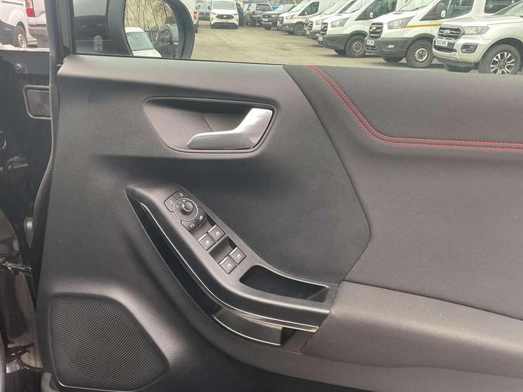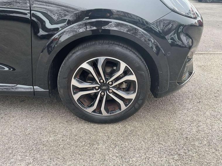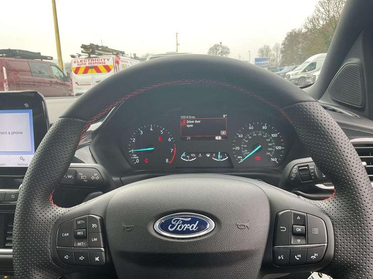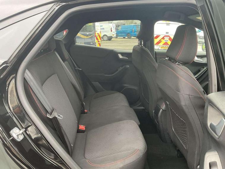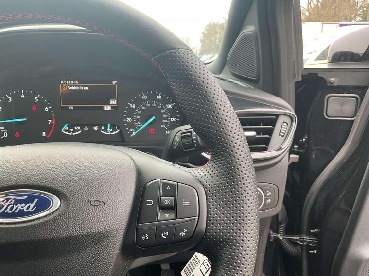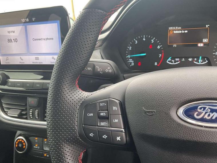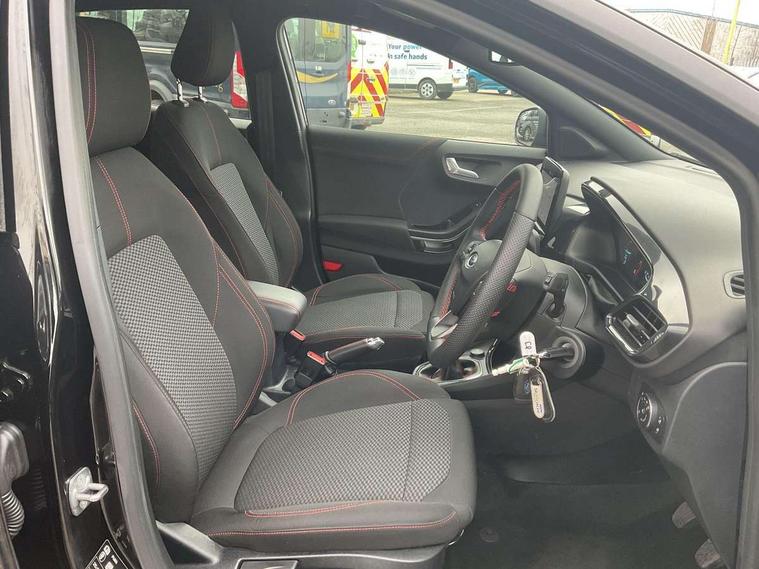 Driver impairment monitor, Emergency call service, Ford easy fuel, Full digital 12.3" instrument cluster, Lane keeping aid with lane departure warning, Power assist steering, Power start button, Rear parking sensor, Selectable drive modes(Normal, Eco, Sport, Slippery and Trail), Speed sign recognition, Sport suspension, Automatic headlights with auto high beam, Automatic rain sensing wipers, LED rear lamps, Power foldable heated door mirrors with puddle lamps, Projector headlamps with LED day time running lights and front fog lamps, Quickclear heated windscreen, Rear side wing doors, Rear wiper, ST-Line body styling kit with unique grille and large body colour rear spoiler, Third brake light, 3 seat bench in 2nd row, Centre console with armrest and stowage, Ford megabox extended bootspace, Front and rear head restraints, Front floor mats, Manual 2 way passenger seat adjustment, Manual 4 way driver seat adjust with lumbar adjustment, Single front passenger seat, ST- Line cloth trim with red stitching, ST-Line flat bottomed sensico leather steering wheel with leather handbrake and aluminium gear knob, Ford SYNC 3 navigation pack - Puma, 3 rear seatbelts, Child safety lock, Electronic stability control (ESC) and hill start assist, Pedestrian/cyclist detection & post-collision braking, Pre collision assist system, Tyre pressure monitoring system (TPMS), Thatcham alarm,