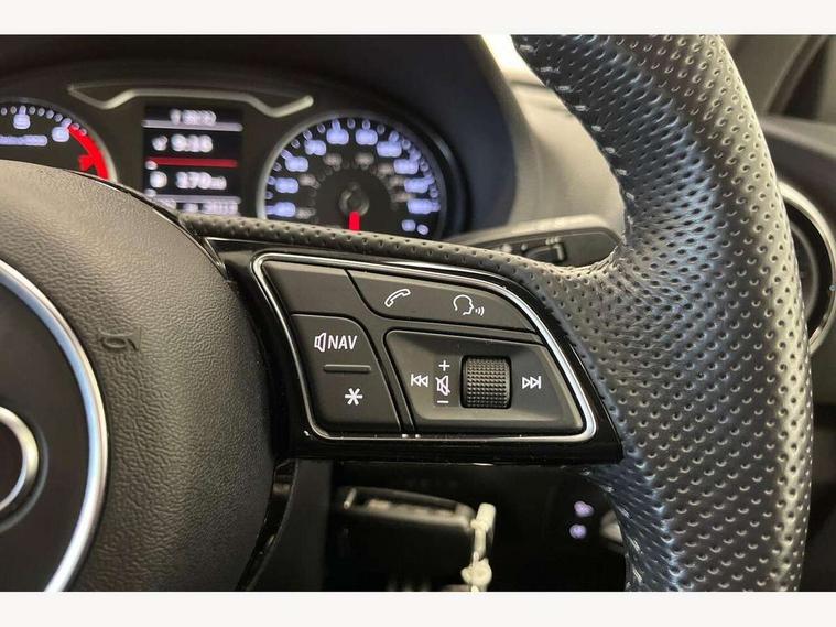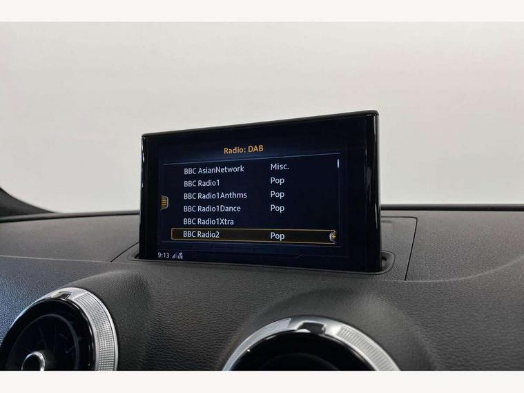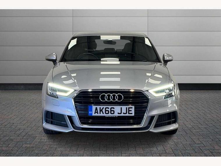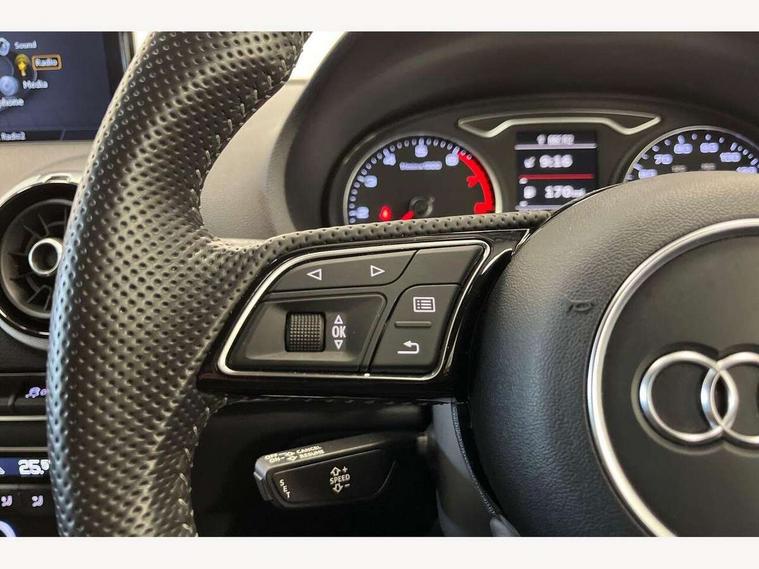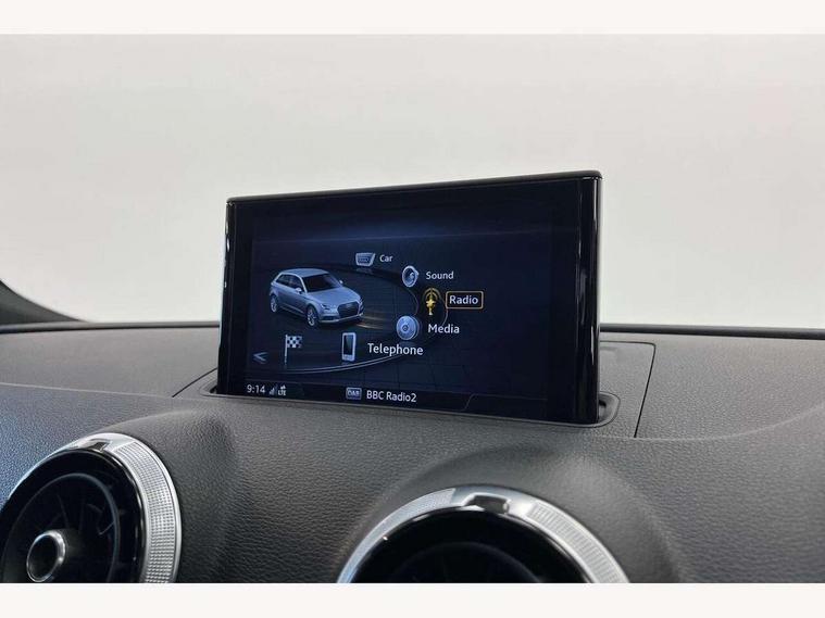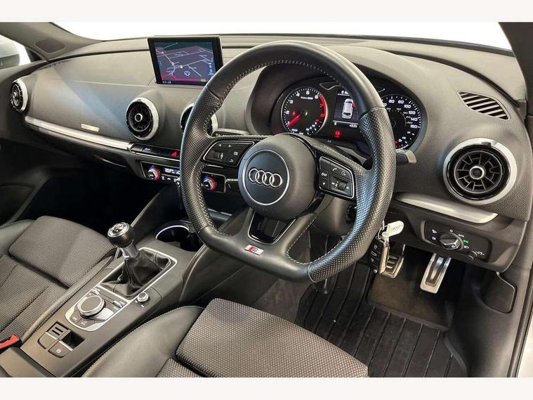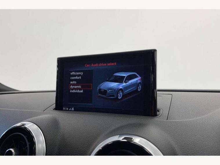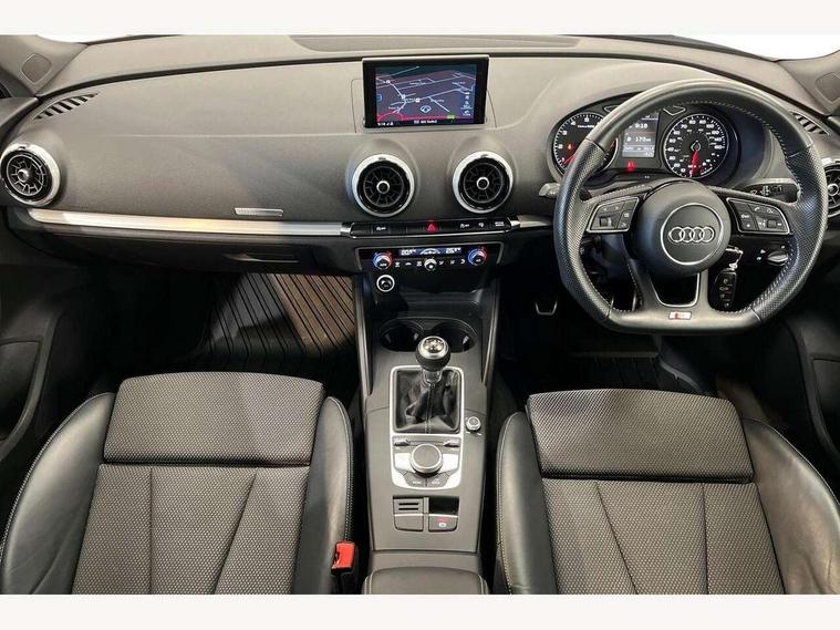 Audi connect, Audi drive select, Audi smartphone interface, Colour driver's information system display, Electro-mechanical PAS, Mobile telephone preparation - bluetooth interface, Service interval indicator, Speed limit display, Voice control system, 2 USB ports, Audi music interface, Auxiliary input socket, DAB Digital radio, Aluminium window trim, Body colour bumpers, Body colour door mirrors with integral indicators, Body colour roof spoiler, Chrome exhaust tailpipes, Electric front windows, Electric operated/heated door mirrors, Electric rear windows, Heated windscreen washer jets, Matt black radiator grille, Rear wiper, S Line body styling, Single exhaust tailpipe, Sport specific side air inlet grille and diffuser insert, 3 adjustable rear headrests, 3 spoke flat bottomed multi-function leather steering wheel, 4 lashing points to secure luggage, Adjustable front armrest, Black cloth headlining, Dual zone electronic climate control, Front and rear interior lights with delay, Front passenger seat isofix location point, Front/rear floor mats, Height/depth adjustable steering column, Illuminated door sills, Illuminated glovebox, Illuminated luggage compartment, ISOFIX child seat preparation+airbag deactivation, Jack and tool kit, Stainless steel pedals, Storage compartment in centre console, Storage compartment under front seats, Storage compartments in doors, LED interior light pack - A3/RS3, Light and rain sensor pack - A3 Hatchback/Sportback, Storage and luggage pack - A3/RS3, 3 point seatbelts on all seats, ABS/EBD, Active bonnet, Active front headrests, ASR, Curtain airbags, Driver and passenger side airbags, Driver/Front Passenger airbags, Drivers knee airbag, EDL, Electromechanical parking brake, ESC - Electronic Stability Control + traction control, Front passenger airbag deactivation, Manual rear child locks, Multi-Collision braking, Seatbelt warning, Tyre pressure monitor, Warning triangle and first aid kit, Anti-theft wheel bolts, Remote control central locking, Thatcham category 1 alarm + immobiliser, Aluminium air vent surrounds, Aluminium trim elements, Space saver spare wheel,