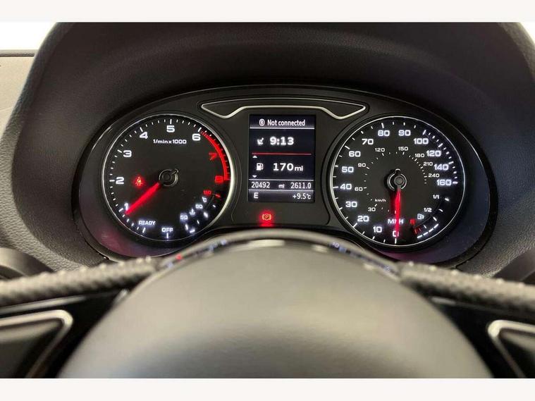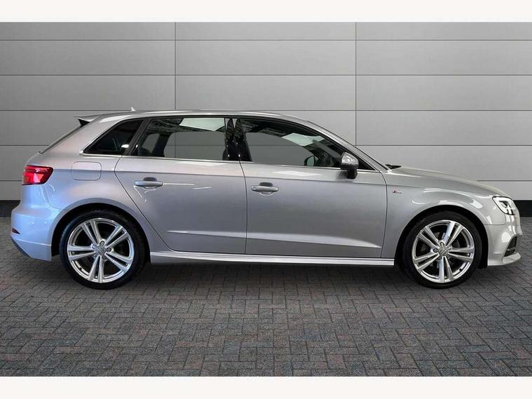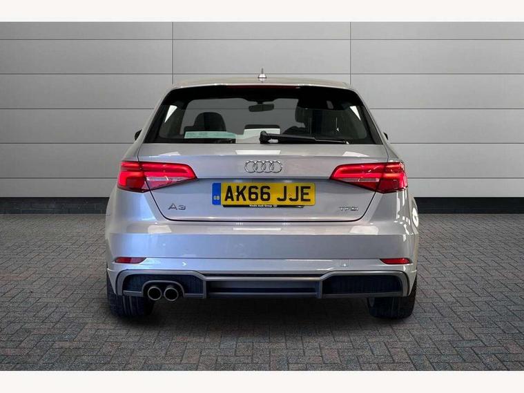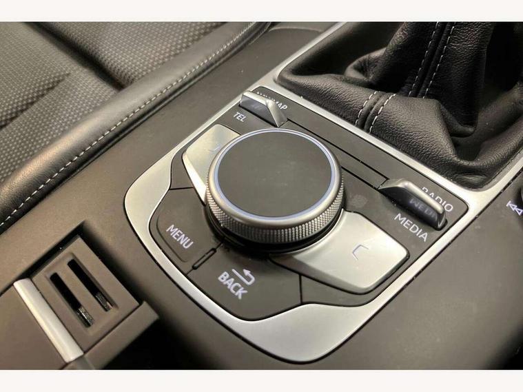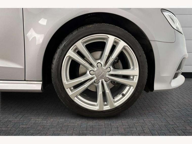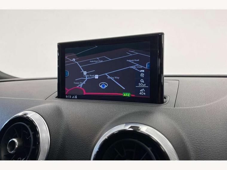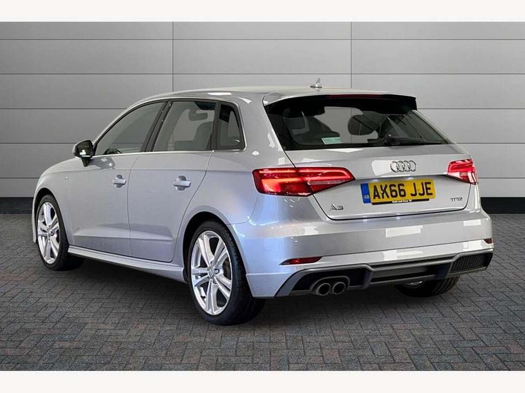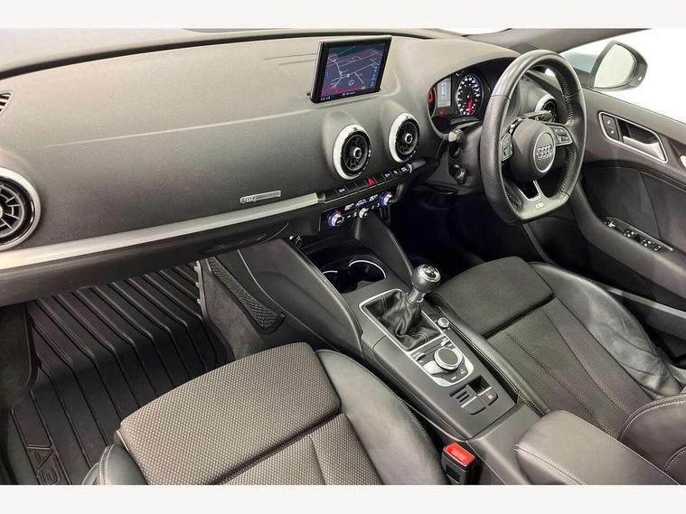 Audi connect, Audi drive select, Audi smartphone interface, Colour driver's information system display, Electro-mechanical PAS, Mobile telephone preparation - bluetooth interface, Service interval indicator, Speed limit display, Voice control system, 2 USB ports, Audi music interface, Auxiliary input socket, DAB Digital radio, Aluminium window trim, Body colour bumpers, Body colour door mirrors with integral indicators, Body colour roof spoiler, Chrome exhaust tailpipes, Electric front windows, Electric operated/heated door mirrors, Electric rear windows, Heated windscreen washer jets, Matt black radiator grille, Rear wiper, S Line body styling, Single exhaust tailpipe, Sport specific side air inlet grille and diffuser insert, 3 adjustable rear headrests, 3 spoke flat bottomed multi-function leather steering wheel, 4 lashing points to secure luggage, Adjustable front armrest, Black cloth headlining, Dual zone electronic climate control, Front and rear interior lights with delay, Front passenger seat isofix location point, Front/rear floor mats, Height/depth adjustable steering column, Illuminated door sills, Illuminated glovebox, Illuminated luggage compartment, ISOFIX child seat preparation+airbag deactivation, Jack and tool kit, Stainless steel pedals, Storage compartment in centre console, Storage compartment under front seats, Storage compartments in doors, LED interior light pack - A3/RS3, Light and rain sensor pack - A3 Hatchback/Sportback, Storage and luggage pack - A3/RS3, 3 point seatbelts on all seats, ABS/EBD, Active bonnet, Active front headrests, ASR, Curtain airbags, Driver and passenger side airbags, Driver/Front Passenger airbags, Drivers knee airbag, EDL, Electromechanical parking brake, ESC - Electronic Stability Control + traction control, Front passenger airbag deactivation, Manual rear child locks, Multi-Collision braking, Seatbelt warning, Tyre pressure monitor, Warning triangle and first aid kit, Anti-theft wheel bolts, Remote control central locking, Thatcham category 1 alarm + immobiliser, Aluminium air vent surrounds, Aluminium trim elements, Space saver spare wheel,