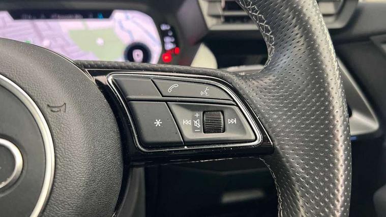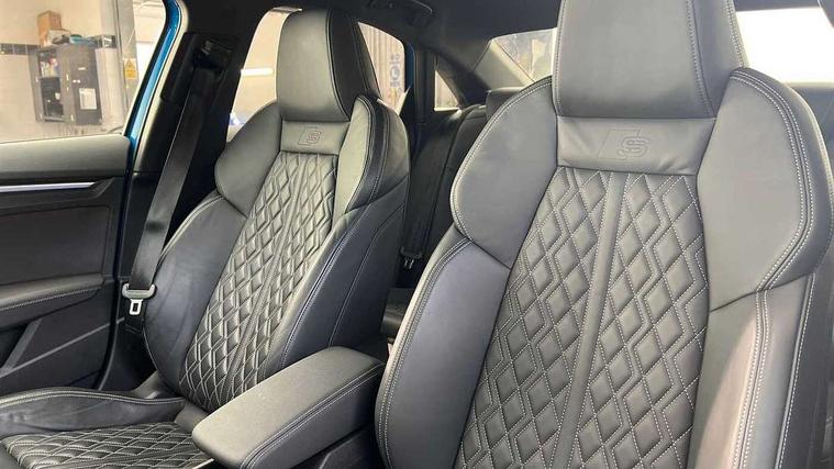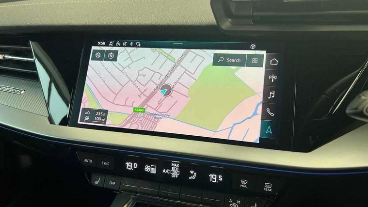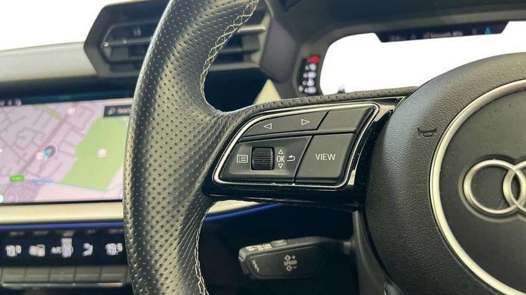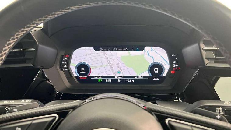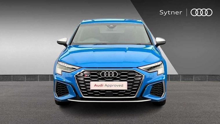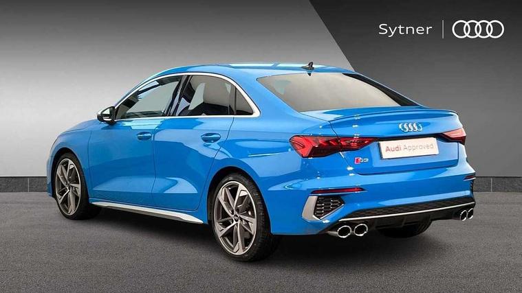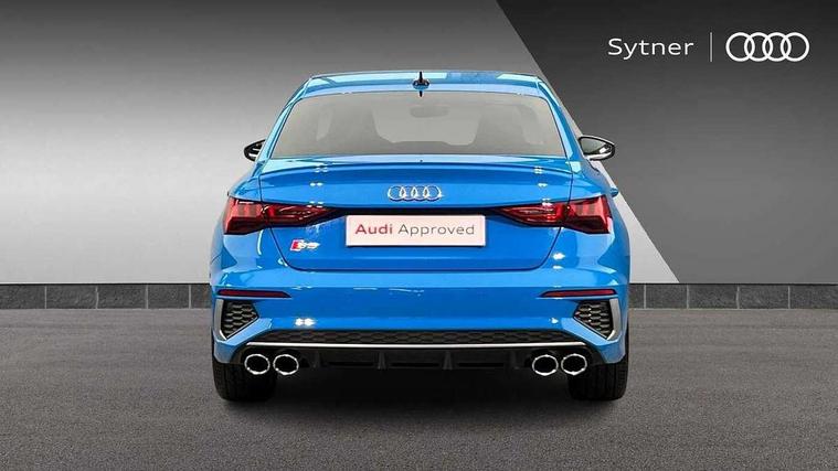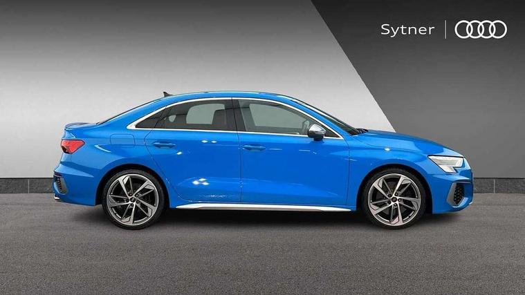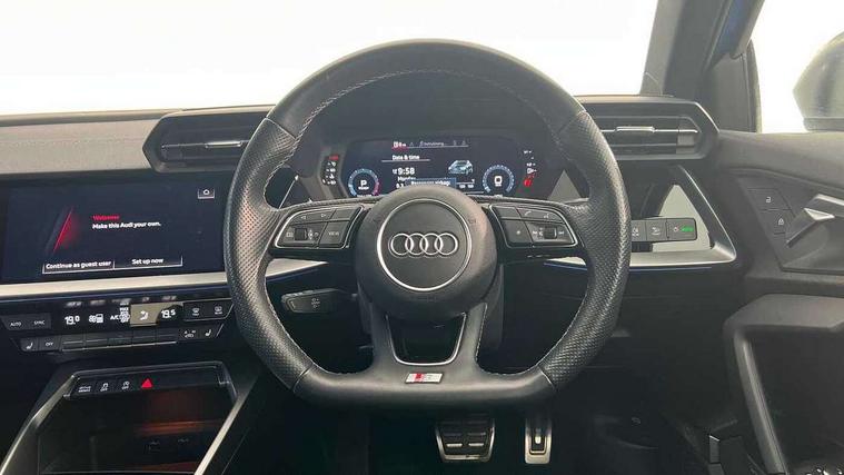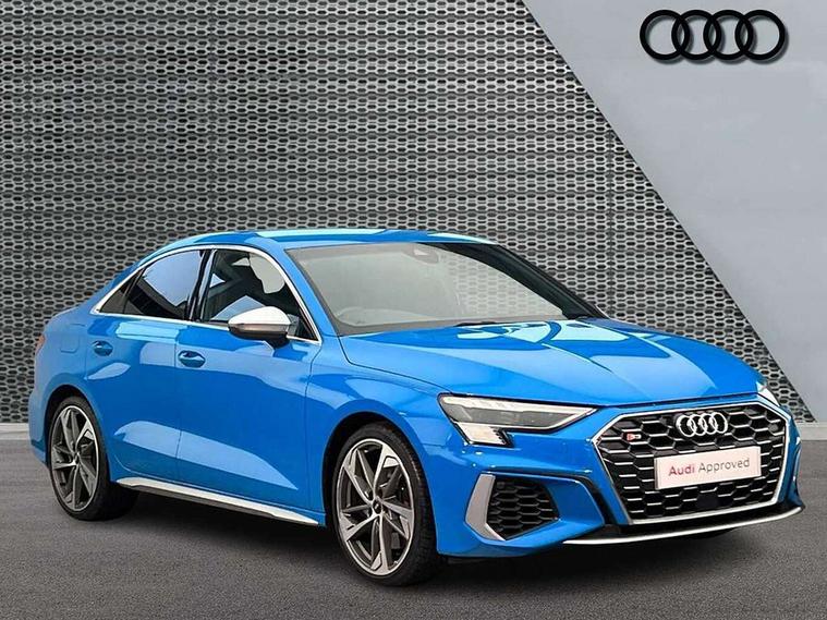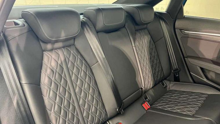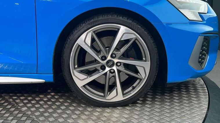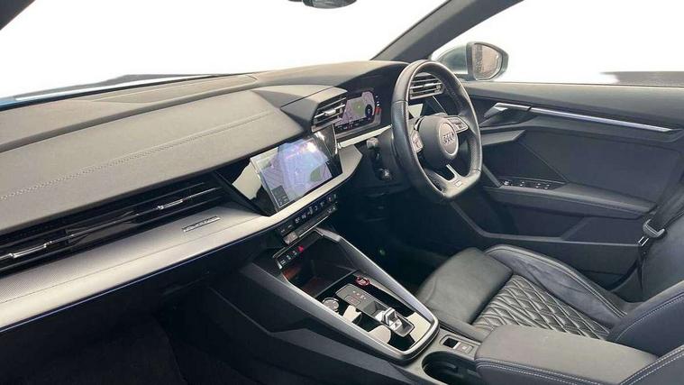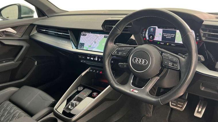 Audi connect emergency call and service, Audi drive select (Auto, Comfort, Dynamic, Efficiency and Individual), Audi smartphone interface, Audi Virtual Cockpit - 10.25" digital and colour instrument cluster, Automatic start/stop system with recuperation, Bluetooth interface, Collision avoidance assistant, Lane departure warning system, MMI Navigation Plus with high resolution 10.1" colour touch screen display, Progressive steering, Service indicator, Voice control system with natural language interaction, Quattro permanent all wheel drive, S sport suspension with spring damper adjustment and lowering by 15mm, 1xUSB-A and 1xUSB-C connection, 6 passive loudspeakers, CD player, DAB Digital radio, Acoustic glass windscreen, Audi Beam uses LEDs to project the Audi logo onto the ground as you exit your S3, Auto dimming frameless rear view mirror, Dual branch oval twin tailpipes in chrome plated finish, Electrically adjustable/heated/folding/auto dimming door mirrors with integrated LED indications + kerb view function for passenger side, Exterior mirror with aluminium look housing, Front electric windows, Illuminated door sills with aluminium inserts at the front with S logo, LED daytime running lights, Light and rain sensors, Model and engine designation badges at rear, Privacy glass - dark tinted rear window, rear door and side windows, Rear electric windows, 12V socket and storage compartment in front centre console, 3 spoke flat bottomed multifunction plus sports contour leather wrapped steering wheel with shift paddles, 40/20/40 split folding rear seat bench with cupholder, Black cloth headlining, Dual zone electronic climate control, Front and rear centre armrest in leather, Front and rear headrests, Front/rear floor mats, Heated front seats, Height and reach adjustable steering wheel, Interior lighting - glove compartment light and right hand side, Luggage compartment floor covering, Manual boot compartment lid, Seat side bolsters, Stainless steel pedals and front footrest, Body styling design pack - S3, Storage pack - A3/S3 Saloon, 3x3 point rear seat belts, Driver and front passenger airbag with passenger airbag deactivation, Electronic Stabilisation Control (ESC) including ABS, ASR and EDL, First aid kit with warning triangle and 2 safety vests, Hill hold assist, Pre-sense front with pedestrian and cyclist detection, Seatbelt monitoring, Tyre pressure loss indicator, Anti theft alarm, Anti-theft wheel bolts, Electronically operated child lock, Immobiliser, Remote control central locking, Aluminium air vent surrounds, Aluminium trim elements, Dark spectrum aluminium inlays, accent surfaces in the dashboard and centre console in platinum grey silk effect paint finish,