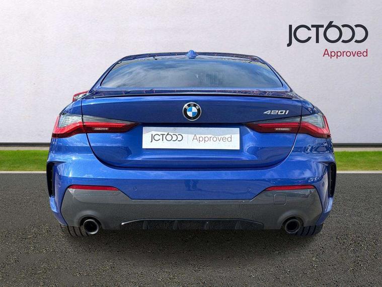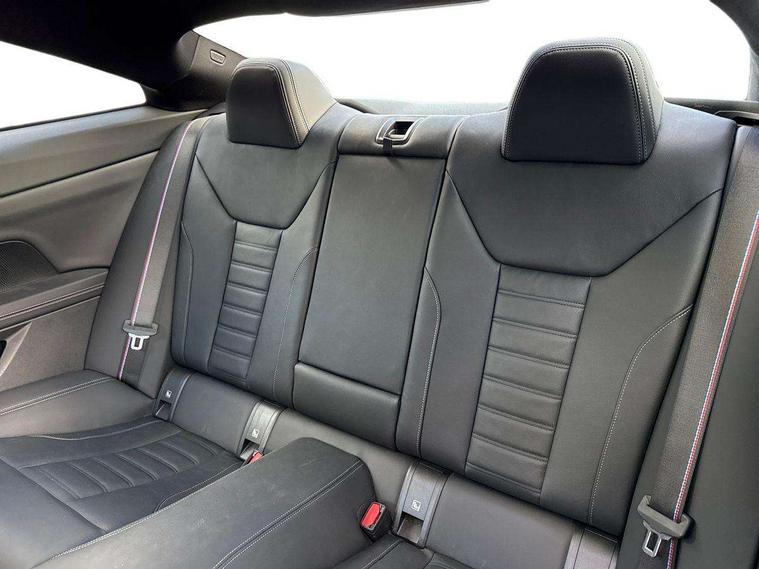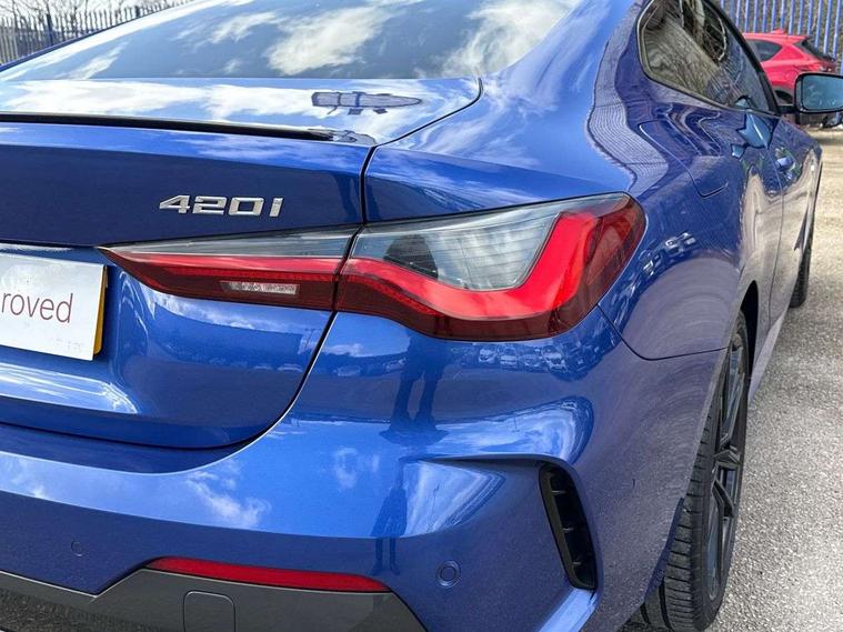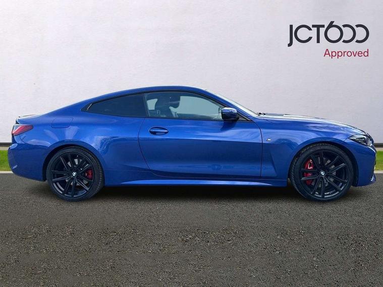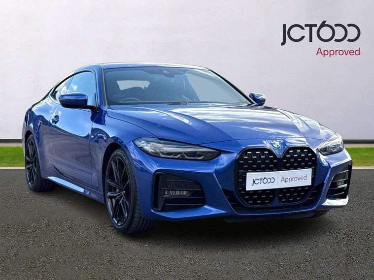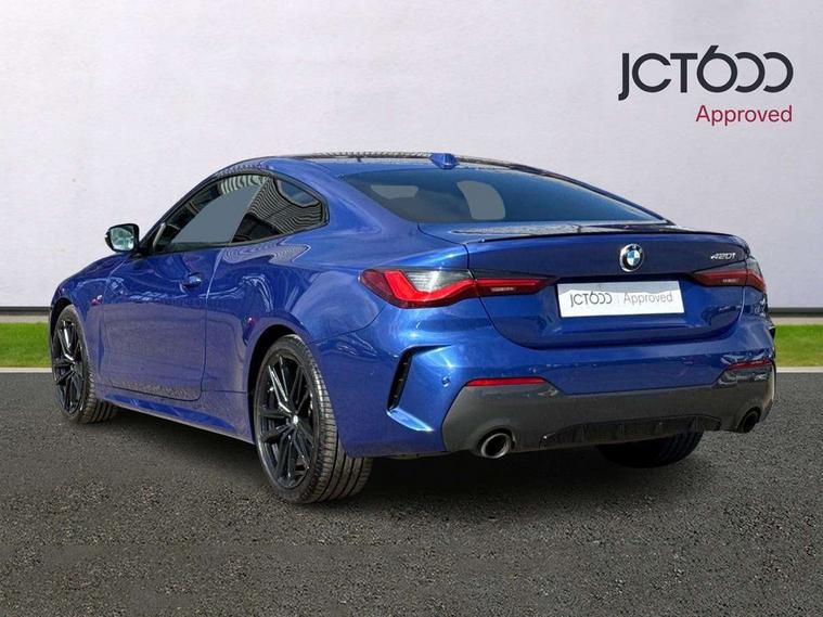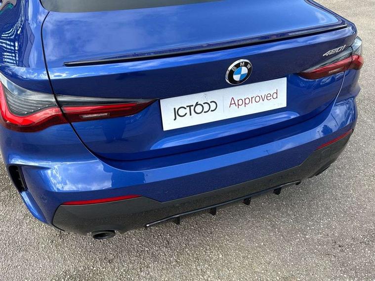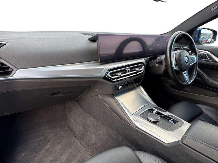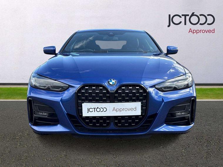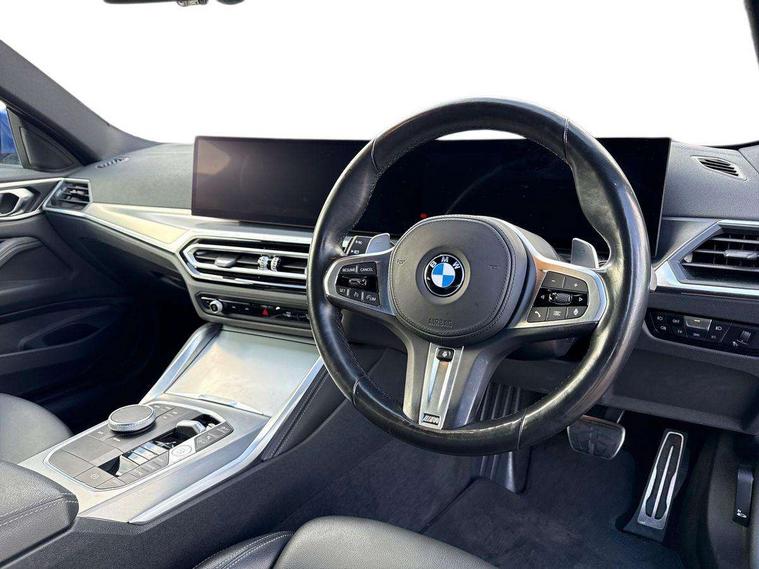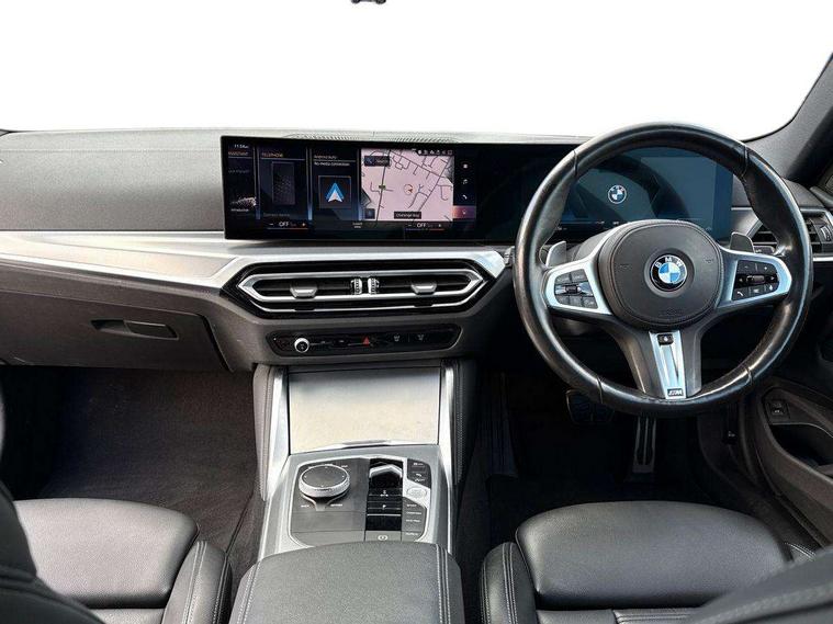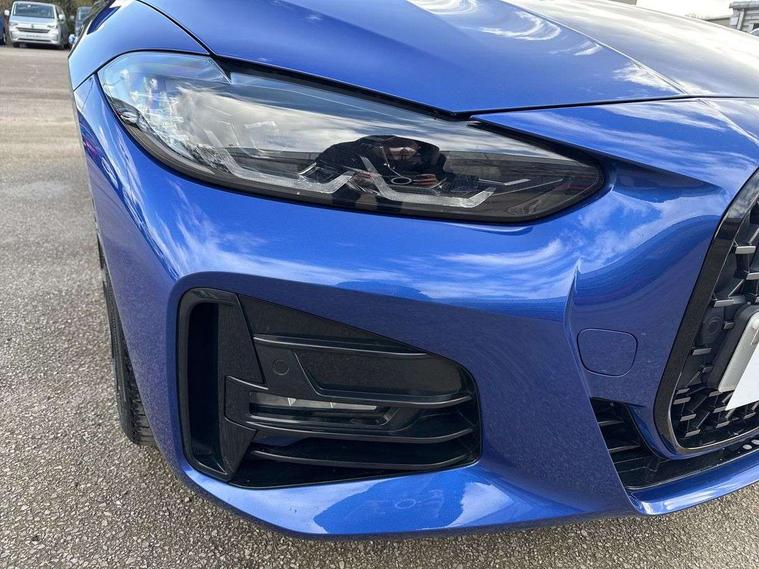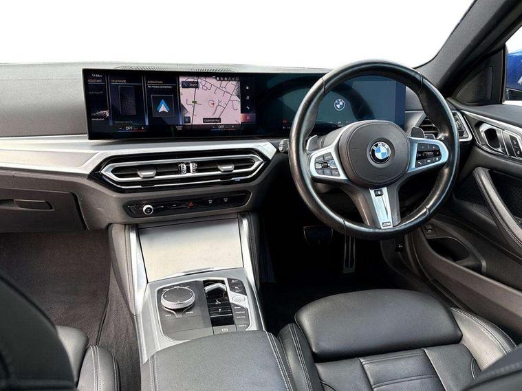 Active guard plus, Attentiveness assist, Auto start-stop, Bluetooth hands free facility with USB audio interface with audio streaming, BMW ConnectedDrive online services, BMW iDrive controller on centre console, BMW Live Cockpit Plus Nav-12.3" instrument&14.9" control Widescreen curved display/Intelligent Voice Assist/iDrive touch/Access 3rd party app/4G LTE, BMW service history, BMW Teleservices, Brake pad wear indicator in front and rear, Check Control warning system for monitoring of lights and door/luggage compartment open warning, Condition based service, Cruise control with speed limit function, Electric power steering with Servotronic steering optimised at all speed ranges, Gearshift time display in manual mode, Instrument cluster with speedometer with mph readout, tachometer, fuel gauge and oil temperature gauge, Integrated owners handbook, Oil sensor for level and grade, warning by check control system, On board computer - average speed, fuel consumption, outside temp display with acoustic warning, clock/date, service interval, odometer/trip meter, Optimum shift indicator, Run flat indicator, Shifting point display, Variable sport steering, 8 speed automatic steptronic transmission with gearshift paddles, Balanced 50/50 weight distribution, Double joint spring strut front axle, Double VANOS, Drive performance control - ECO PRO, comfort and sport modes, Electronic differential lock control (EDLC), High precision injection, Low centre of gravity, M sport suspension, Petrol Particulate Filter, Stroke dependent dampers, VALVETRONIC engine management, 2x USB Type C ports in front centre console for charging and data transfer, 2x USB Type C ports in rear centre console for charging, DAB tuner, Electronic service booklet, Acoustic glazing, Automatic headlight beam throw control with load dependent regulating reaction, dynamic compensation of braking dive and acceleration squat, Automatic windscreen wipers and automatic headlight, Automatically dimming electrochromatic rear view mirror, BMW emblem on engine compartment lid and tailgate, BMW kidney grille with mesh grille front side of the nuggets in matt aluminium and frame in chrome high gloss, Body colour fuel filler flap, Body colour roof fin, Brushed aluminium inserts in the front door sill finishers with BMW designation, Door sill strips, Dynamic brake lights, Electric windows - front and rear, with open/close fingertip control, anti trap facility and comfort closing function all round, Exterior mirrors - electrically folding with anti-dazzle, Fading support, Follow me home headlights, Front and rear bumper system, Front apron plastic in body colour, Green tinted heat protection glazing, High gloss shadow line exterior trim, Illuminated bow type door handles in body colour drivers side with door lock, Interior rear view electrochromatic mirror with automatic anti dazzle function, LED daytime running lights, LED front fog lights, LED front indicators, Licence plate panel integrated into front bumper and tailgate, Lightweight engineering, M designation on front side panels, left and right, M rear boot spoiler, Model designation on right side of tailgate, One piece front bumper cover including towing eye cover in body colour, Preparation for high beam assistant, Rear boot, Reversing light, Side frame decorative moulding black matt, Two part LED tailights in L-shape with components in smoked glass, brake light, LED turn indicator and rear fog light, Visible exhaust tailpipe finisher, Visible VIN plate, Welcome lights in interior and door handle area, Widened track and increased camber values for max transverse dynamics, agility and steering precision, Window recess cover black high gloss, Windscreen wipers with integrated heated washing jets, 12V power socket in front centre console, 2 front cupholder in centre console with clamping elements and matt black inlay, 2 Rear seat headrests, 2 seat bench in second row, 3 spoke M sport leather multifunction steering wheel, 3 zone automatic air conditioning, 4 pieces lashing eyelets in luggage compartment, 40:20:40 split folding rear seat and rear centre armrest with two cupholders, Anthracite headlining, Armrest integrated in front and rear door trim + front centre console armrest, BMW ID, Driver seat backrest width adjustment, Extended storage - Luggage compartment partition net on left side trim panel, Bag hook on both sides of the luggage compartment, Four grab handles integrated in roof lining, Front and rear door pockets, Front and rear reading lights, Front sport seats, Heated driver and front passenger seats, Height adjustable front headrests, Height adjustable mechanically and infinitely variable steering column, Illuminated armrest storage compartment, Illuminated glove compartment with separate small compartment, Make-up mirror lights, Single front passenger seat, Storage compartment in rear centre console, Sunvisors with illuminated vanity mirrors and ticket pocket, Toolkit located in luggage compartment, Velour front floor mats, Vernasca leather upholstery, Ambient lighting pack - 4 Series, Connected professional package - 4 Series, M sport exterior styling pack - 4 Series, 2 x 3-point rear seatbelts, Battery safety cut-off, BMW emergency call, Brake energy regeneration, Braking pre-tensioning, Child seat ISOFIX attachment for the two outer rear seats, Coasting in idle in ECO PRO mode, Cornering brake control (CBC), Crash sensor activating of airbags, Unlocking doors, hazard warning lights, interior light, safety battery terminal, Driver and front passenger side airbags, integrated in the door side seat backrest bolsters for all seat variants, Driver/Front Passenger airbags, Dry braking, Dynamic brake control, Dynamic stability control + (DSC+) - Anti-lock Braking System (ABS) with brake assist and cornering brake control + Automatic Stability Control (ASC), Dynamic Traction Control - DTC, Electric parking brake including automatic hold function and automatic release of the parkin