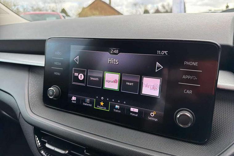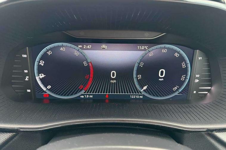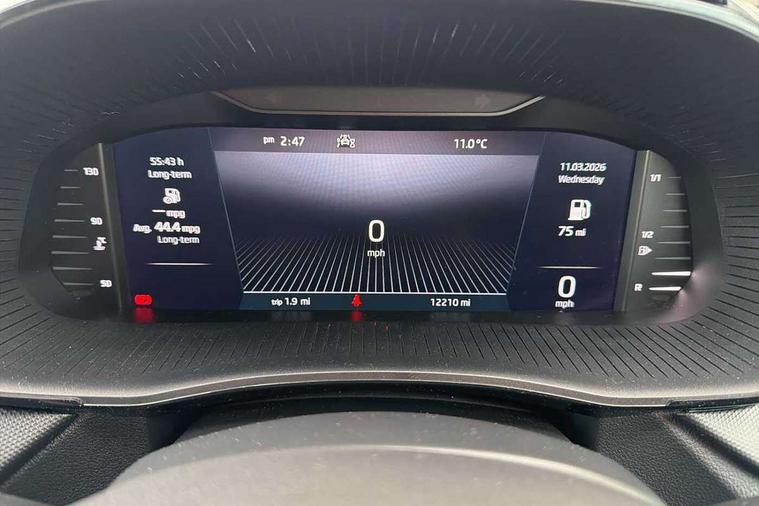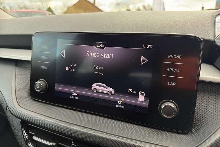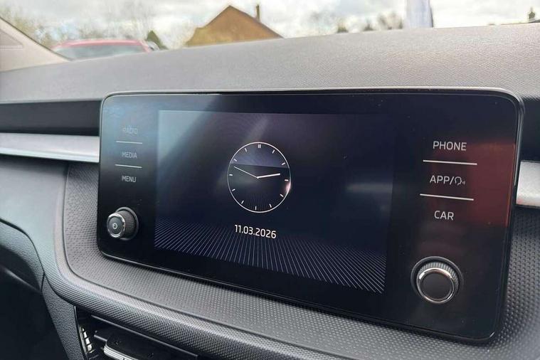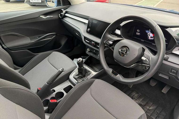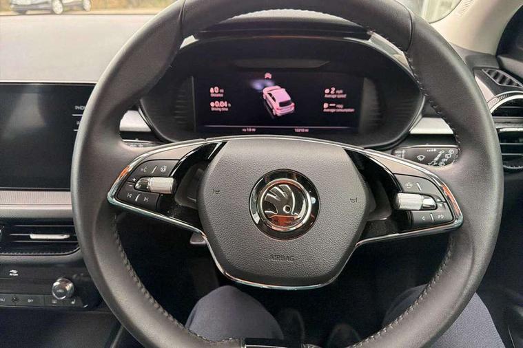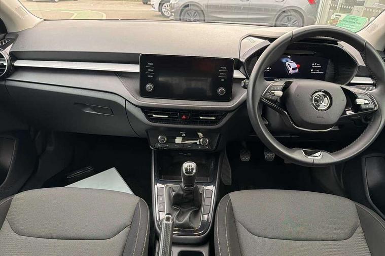 Bluetooth connection, Driver alert system - DAS, Electromechanical power steering, Exterior temperature gauge, Lane assist including road edge detection, Service interval indicator, Virtual cockpit with 10.25" colour display, 2x USB-C in the front (for data transmission and charging), 6 Speakers (4 in front and 2 in rear), Auxiliary socket for external MP3 player, Bolero radio with 8" colour display, DAB digital radio reception, Basic LED Headlights, Body coloured bumpers, Dimming rear view mirror with black frame, Door mirror integrated indicators, Electrically adjustable and heated door mirrors, Electrically adjustable front windows with function auto up/down, Front fog lights, Front window wiper intermittent control, Headlight range control - Automatic, Ice scraper in fuel cap, LED daytime running lights with coming and leaving home feature, Mechanical adjustable rear windows, Privacy glass, Rain sensor, Rear LED fog light, Rear side wing doors, Rear window wiper with washing nozzles, Roof mounted spoiler, SKODA tailgate lettering in chrome, Third brake light, 2 reading lights in front and 2 reading lights in rear, 3 rear headrests, Backrest split and folding, Central console with fixed cup holder and storage box, Chrome handbrake release button, Fabric upholstery, Gearshift knob/handle in leather, Grain satin black interior door handles, Hand brake lever handle in leather, Height adjustable drivers seat, Height adjustable front headrests, Height adjustable steering wheel, ISOFIX and TopTether anchorage points to the outer rear seats, ISOFIX and TopTether on the front passenger seat, Luggage compartment lighting, Pollen filter, Rear seat bench unsplit, Single front passenger seat, Storm grey headlining, Sun visors with mirror and airbag label on passenger side, Ticket holder, Umbrella in drivers door, 3-point height adjustable front seats belts with pretensioner and force limiter, Automatic warning lights in case of crash, Driver and passengers airbag with switch off function, e-Call+, ESC including ABS, MSR, ASR, EDS, HBA and XDS, Front and rear seat belt warning, FRONT ASSIST (AEB City and AEB Inter Urban), Front side airbags, Head airbags, One tone horn, Pedestrian protection, Three rear 3-points safety seat belts with pretensioner and force limiter including stop function for outer rear seat belts, Tyre pressure monitoring system, Anti-theft alarm system including immobiliser, interior monitoring, backup horn, and towing protection, Central locking with radio remote control, interior controls, SAFE function and 2 foldable keys, KESSY - Keyless engine start/stop, Anodized cross line upper decorative trim, Colour Edition air vents, Grain satin black central console cover, Grain satin black lower decorative trim, Satin black door and side trim panel in front, Anti-theft wheel bolts protection, Super-low rolling resistance tyres,