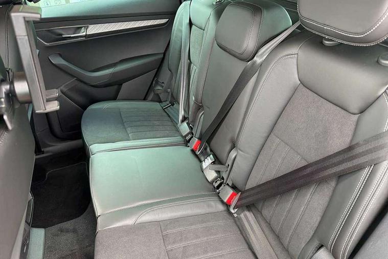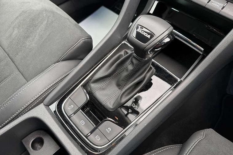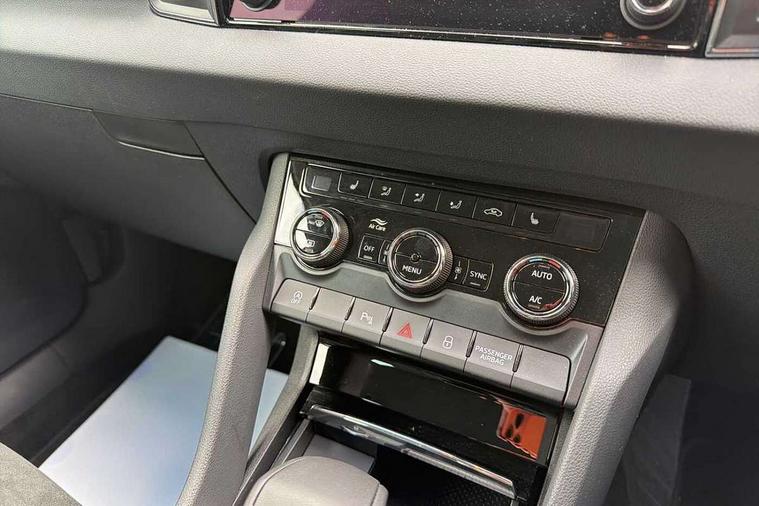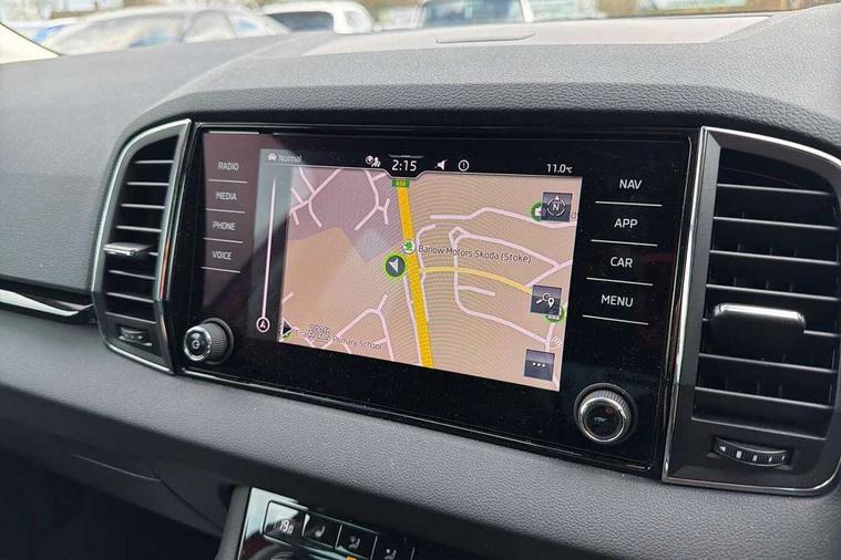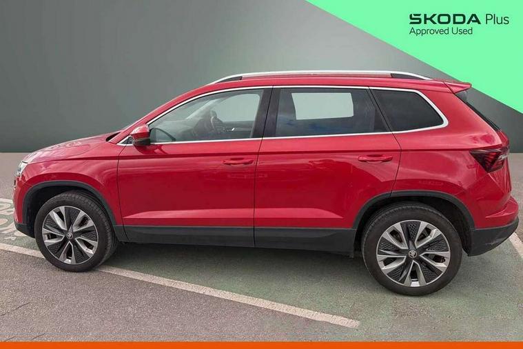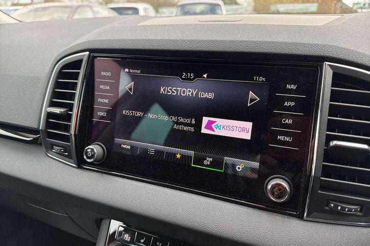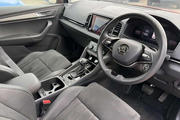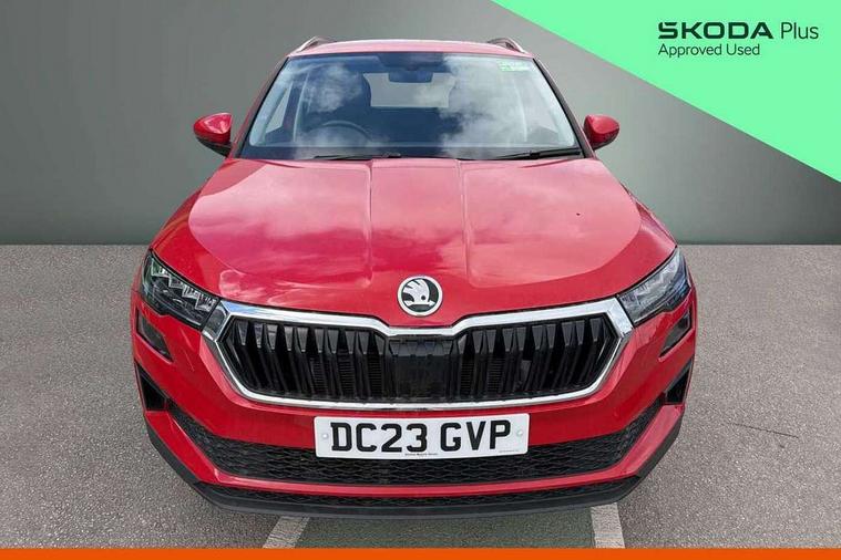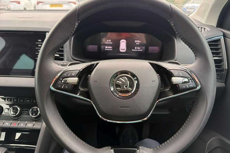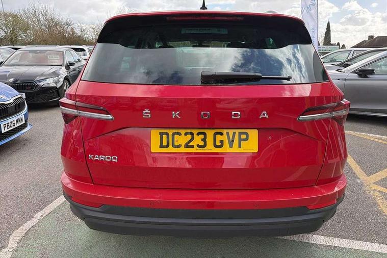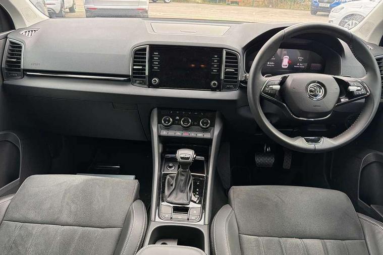 8" Digital display, Care connect, Driver fatigue sensor, Emergency services call system, Outside temperature gauge, Service interval indicator, SmartLink wireless for Apple and wired for Android, Start/stop system with regenerative braking, USB C Port x 2 in front centre console, 8 Speakers, DAB radio with Bluetooth, USB connection, Acoustic glass, Aero front windscreen wipers with intermittent function, Auto dimming rear view mirror with light and rain sensors, Black electric window control buttons, Body colour door mirrors and handles, Dynamic headlight range control with cornering light function, Electric front and rear windows with child proof lock, Heated rear windscreen, LED daytime running lights, LED rear lights with high functionality welcome effect and dynamic indicators, Light assistant (coming/leaving home/tunnel light), Plastic scuff plates, Privacy glass, Rear side wing doors, Rear spoiler, Rear window wiper with washer system and intermittent control, Safety reflectors on front doors, 1.5 litre bottle holders in driver and front passenger door panels, 12V socket in boot, 12v socket in front centre armrest with storage compartment and rear air vents, 2 spoke leather heated multifunction steering wheel with DSG paddles, 2 x Tablet holder, 3 rear height adjustable headrests, 3 seat bench in 2nd row, 4 foldable roof handles with rear coat hooks, Black floor carpet, Chrome inner door handles, Decorative door sills with KAROQ badging, Double sided boot floor, Foldable hooks in the boot, Front head restraints, Height adjustable front three point seats belts with tensioners, Height/reach adjust steering wheel, Ice scraper, Illuminated glovebox, Illuminated luggage compartment, Isofix child seat preparation for front passenger seat, Isofix child seat preparation outer rear, Manual lumbar support for front seats, Pen holder, Pollen filter, Rear boot cover, Rear reading lights, Rubbish bin door, Safety vest holder, Single front passenger seat, Storage box in upper central dashboard closed, Sunvisors with illuminated vanity mirrors, Textile floor mats, Ticket holder, VarioFlex seats with standard rear seat release, Boot pack - Karoq, Chrome roof rails + chrome pack - Karoq, Parking pack - Karoq, Automatic door unlocking in case of crash, Automatic fuel cut off in case of crash, Child locks on rear doors, Driver airbag, Electronic parking brake with auto hold function, Emergency rear braking signal, ESC including ABS, MSR, ASR, EDS, HBA, DSR, RBS, MKB and traction control, Front side airbags, Hill hold control, Knee airbags, Passenger airbag with switch-off function, Pedestrian monitor, Seatbelt reminder signalisation and pretensioner for all seats, Three point seatbelts rear, Two tone horn, Tyre pressure display, Tyre pressure monitor, Alarm with interior monitoring, back up horn and tilt sensor with safe function, Electronic engine immobiliser, Keyless entry and start/stop, Remote central locking with 2 remote folding keys, Chrome framed air vents, 18" Procyon silver alloy wheels with anthracite aero inserts, Anti-theft wheel bolts protection, Storage on wheel cover, Tool kit,