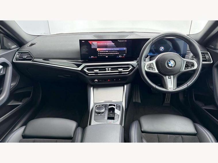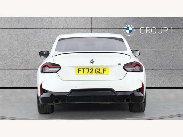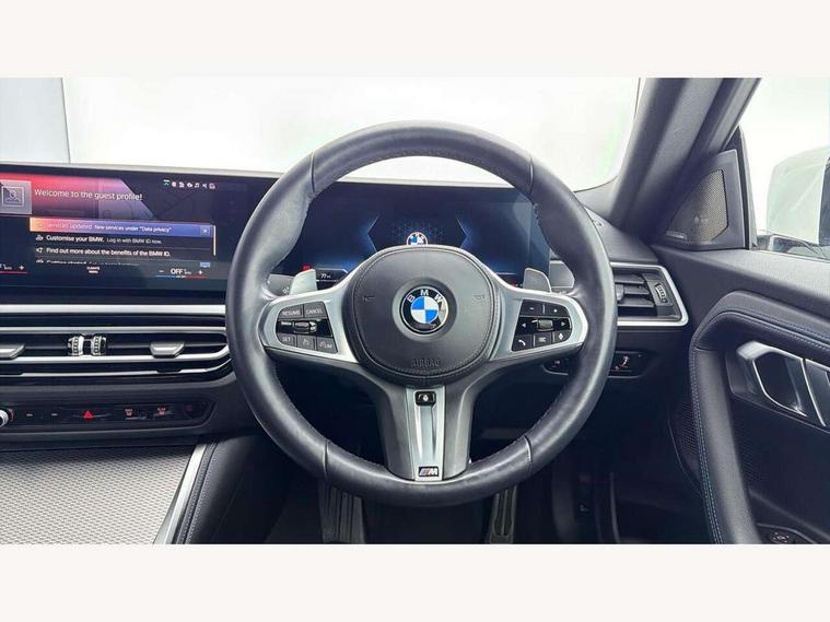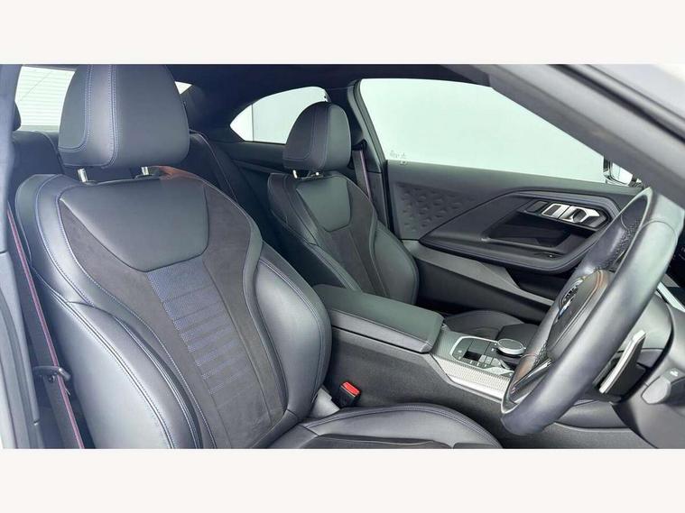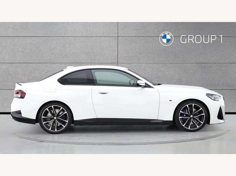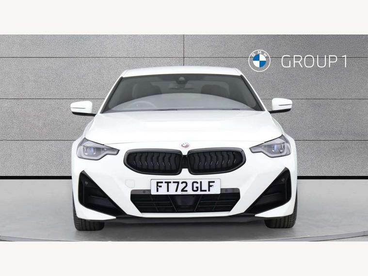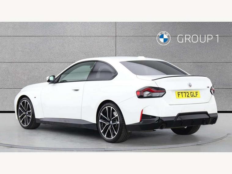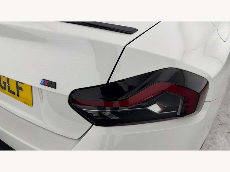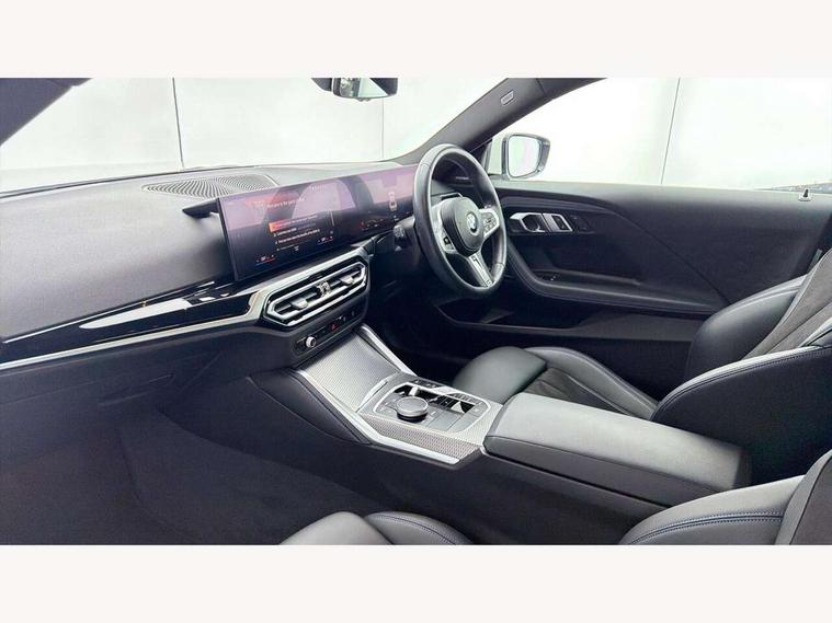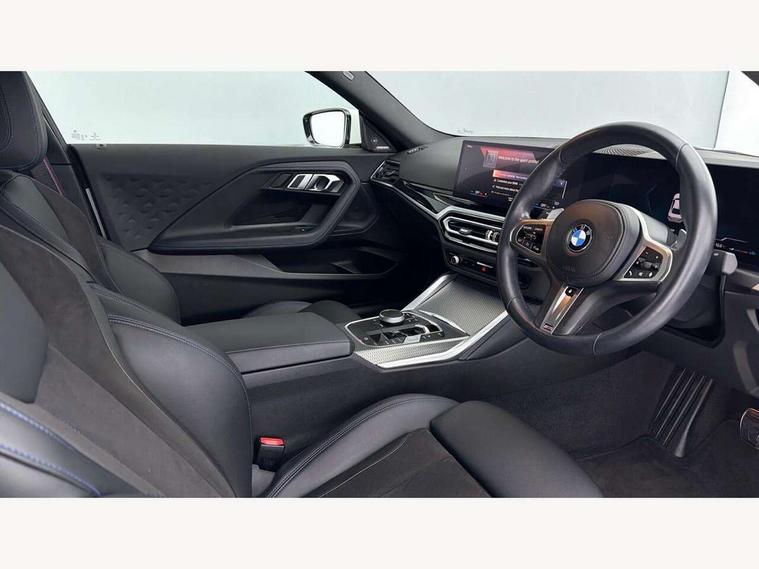 Attentiveness assist, Auto start-stop, Bluetooth, BMW ConnectedDrive online services, BMW Teleservices, Check Control warning system for monitoring of lights and door/luggage compartment open warning, Direct selection buttons, Drive off assistant, Eco pro mode, Electric power steering, Front and rear parking sensors, Front/rear Parking distance control, iDrive controller with turn and press function, Integrated owners handbook, Intelligent functions, Live cockpit plus with nav function 12.3" instrument cluster and 14.9" centre display, Oil sensor for level and grade, Optimum shift indicator, Personal Profile, Touch operation on control display, Variable sport steering, Widescreen multi-media display, Aluminium lightweight construction, Balancer shaft, BMW TwinPower Turbo four-cylinder petrol engine, Double VANOS, Drive performance control with ECO PRO comfort + sport mode, Electronic differential lock, High precision injection, M sport suspension, Petrol Particulate Filter, Sport automatic steptronic transmission with gearshift paddles, manual gearshift time display, launch control, coasting idle ECO PRO/COMFORT modes, Twin scroll turbocharger with Valvetronic, DAB tuner, Acoustic windscreen wipers for reduced driving noise, Adaptive LED Headlights, Automatic windscreen wipers and automatic headlight, Automatically dimming rear view mirror, Body colour door handles flush with door surface, Body colour door mirrors, Body colour front and rear bumpers, Daytime running lights, Electric windows - front and rear, with open/close fingertip control and trap release, Exhaust tailpipes x2 - 90mm in left and right, Fading support, Front and rear bumper system with replaceable deformation elements, Front door sill finishers in black plastic with BMW designation, Front windscreen wipers with integrated washer jets, Green tinted heat protection glazing, High beam assistant, High gloss shadowline exterior trim in mirror triangle cover, mirror cover panel, mirror bezel and window border, High level third brake light, Indicators integrated int mirror housing, LED registration plate light, LED technology rear tail lights, brake lights and turn indicators, Lightweight engineering, Model designation on right side of tailgate, One piece kidney grille with hight gloss chrome surround, Rear boot, Rear fog lights, Reversing light in rear light cluster, Shark fin antenna, Single part LED rear lights with smoked glass components, Trailer stabilisation logic, Visible VIN plate, 12V power socket in front centre console with blanking plug, 2 cupholders in front centre console, 3 zone automatic air conditioning, Ambient lighting, Compartment in front of cupholder, Conditioned based service, Driver seat backrest width adjustment, Front and rear side armrests integrated into door trim, Front armrest, Front door pockets, Front head restraints, Front sport seats, Heated front seats, Illuminated glove compartment with separate small compartment, M headliner Anthracite, M sport leather steering wheel, Manually adjustment steering wheel column, Rear seat backrest with manual 40:20:40 split folding, Rear seat centre foldable armrest with integrated cup holder, Single front passenger seat, Storage compartment between rear seats, Storage tray and compartment with cover in centre console, Sun visors with vanity mirrors and insert tab, Through loading system with 40/20/40 split folding 2 rear seat in 2nd row, Two folding rear seat headrests, Velour floor mats, Additional storage compartment pack without USB - 2 Series Coupe, Connected pack professional - 2 Series Coupe, Interior and exterior mirror pack - 2 Series Coupe, M Sport exterior styling aerodynamics pack - 2 Series Coupe, 2 tone horn, Anti lock braking system (ABS) with cornering brake control, Automatic Stability Control (ASC), BMW emergency call, Brake drying, Child seat ISOFIX attachment for the two outer rear seats, Crash sensor activating of airbags, Unlocking doors, hazard warning lights, interior light, safety battery terminal, Deactivation of fuel pump in the event of a crash, Driver and front passenger airbags, Driver and front passenger side airbags, integrated in the door side seat backrest bolsters for all seat variants, Dynamic brake control, Dynamic stability control + (DSC+), Dynamic Traction Control - DTC, Electrically operated hand brake including automatic hold function and automatic release when driving off, Front and rear disc brakes, Front passenger airbag deactivation, Head airbags for all 4 outer seats, Manual deactivation of front passenger airbag, Seat belt security check for driver and front passenger, Seatbelt warning, Side impact protection, Three point seat belts on 4 seats including front belt stopper, pyrotechnic belt tensioners and belt force limiters, Tyre pressure sensor, Warning triangle and first aid kit, Alarm system (Thatcham 1) with remote control and electronic engine immobiliser, Central locking switch for all doors, fuel filler cap and luggage compartment, Deadlocking function system to all doors, Drive away locking system on all doors and luggage compartment, Locking wheel bolts, Start/Stop button (illuminated) in centre console with keyless engine start and Auto Start-Stop deactivation button, Two remote control key with integrated key - one button for open and close doors/fuel flap/tailgate and separate button for unlock luggage compartment, BMW mobility tyre sealing system, Electrically powered 12V compressor, Reduced rolling resistance tyres,