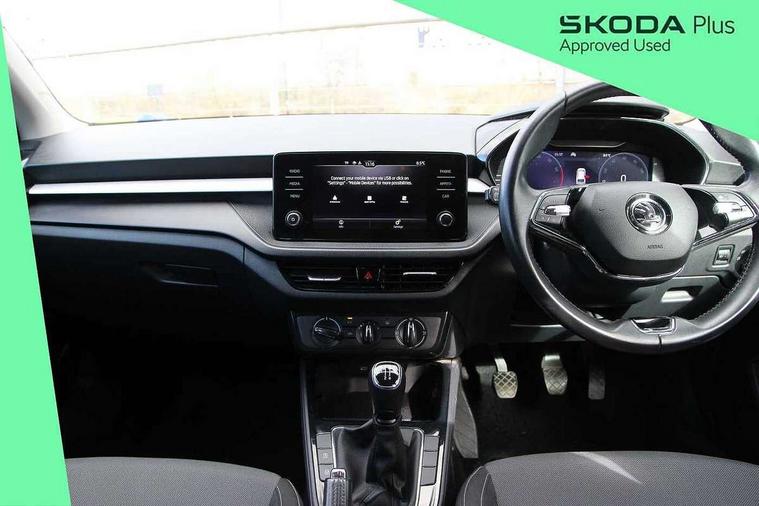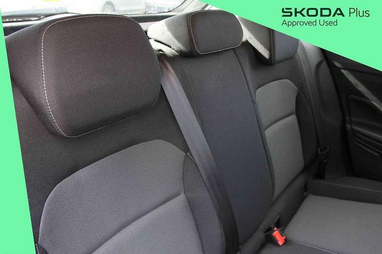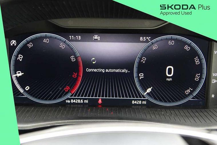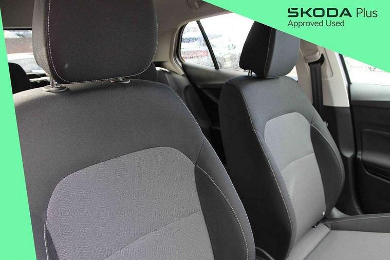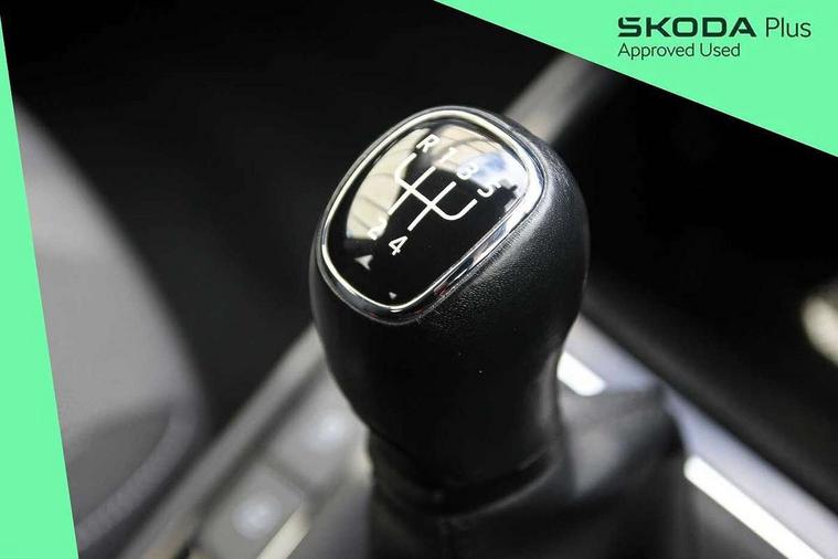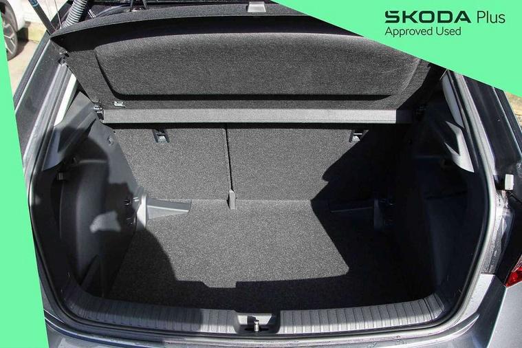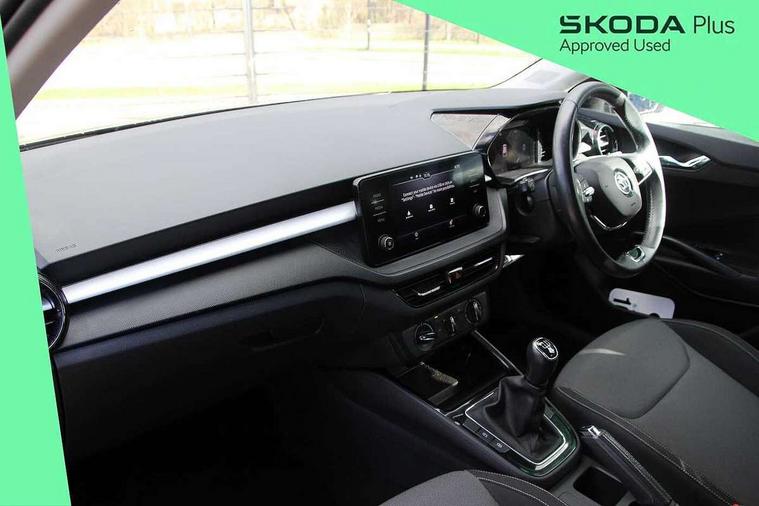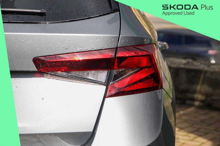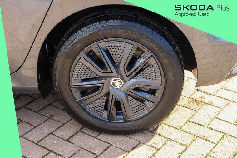 Bluetooth connection, Driver alert system - DAS, Electromechanical power steering, Exterior temperature gauge, Lane assist including road edge detection, Service interval indicator, Virtual cockpit with 10.25" colour display, 2x USB-C in the front (for data transmission and charging), 6 Speakers (4 in front and 2 in rear), Auxiliary socket for external MP3 player, Bolero radio with 8" colour display, DAB digital radio reception, Basic rear lights, Body coloured bumpers, Dimming rear view mirror with black frame, Door mirror integrated indicators, Electrically adjustable and heated door mirrors, Electrically adjustable front windows with function auto up/down, Front window wiper intermittent control, Headlight range control - Automatic, Ice scraper in fuel cap, LED daytime running lights with coming and leaving home feature, Mechanical adjustable rear windows, Privacy glass, Rear LED fog light, Rear side wing doors, Rear window wiper with washing nozzles, Roof mounted spoiler, SKODA tailgate lettering in chrome, Third brake light, 3 rear headrests, Backrest split and folding, Central console with fixed cup holder and storage box, Chrome handbrake release button, Fabric upholstery, Gearshift knob/handle in leather, Grain satin black interior door handles, Hand brake lever handle in leather, Height adjustable front headrests, Height adjustable steering wheel, ISOFIX and TopTether anchorage points to the outer rear seats, ISOFIX and TopTether on the front passenger seat, Luggage compartment lighting, Pollen filter, Rear seat bench unsplit, Single front passenger seat, Storm grey headlining, Sun visors with mirror and airbag label on passenger side, Ticket holder, Umbrella in drivers door, 3-point height adjustable front seats belts with pretensioner and force limiter, Automatic warning lights in case of crash, Driver and passengers airbag with switch off function, e-Call+, ESC including ABS, MSR, ASR, EDS, HBA and XDS, Front and rear seat belt warning, FRONT ASSIST (AEB City and AEB Inter Urban), Front side airbags, Head airbags, One tone horn, Pedestrian protection, Three rear 3-points safety seat belts with pretensioner and force limiter including stop function for outer rear seat belts, Tyre pressure monitoring system, Anti-theft alarm system including immobiliser, interior monitoring, backup horn, and towing protection, Anodized cross line upper decorative trim, Colour Edition air vents, Grain satin black central console cover, Grain satin black lower decorative trim, Satin black door and side trim panel in front, Anti-theft wheel bolts protection, Super-low rolling resistance tyres,