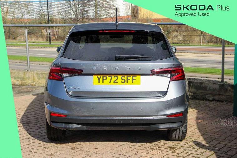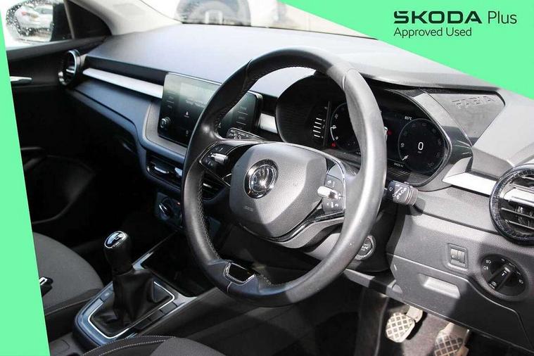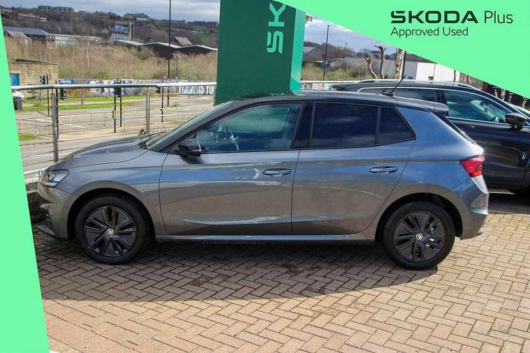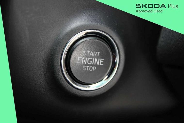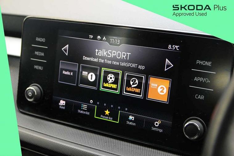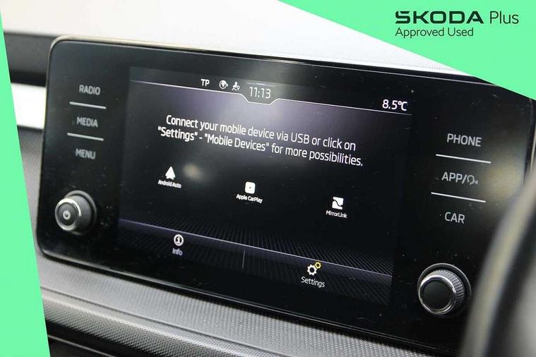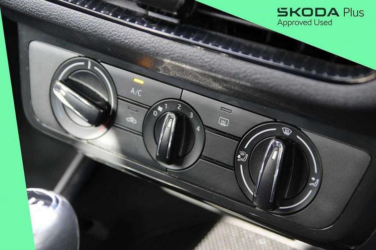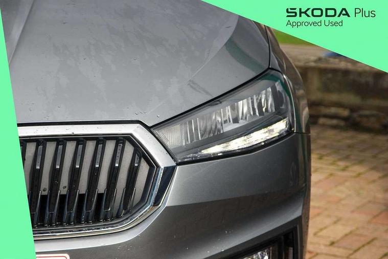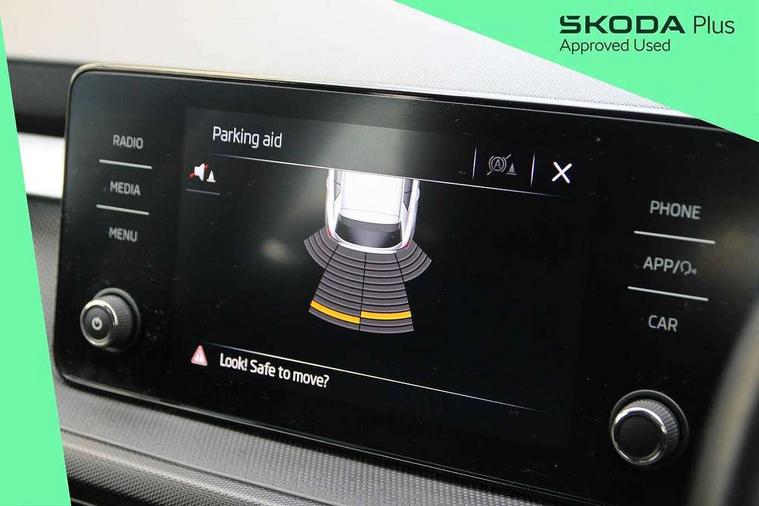 Bluetooth connection, Driver alert system - DAS, Electromechanical power steering, Exterior temperature gauge, Lane assist including road edge detection, Service interval indicator, Virtual cockpit with 10.25" colour display, 2x USB-C in the front (for data transmission and charging), 6 Speakers (4 in front and 2 in rear), Auxiliary socket for external MP3 player, Bolero radio with 8" colour display, DAB digital radio reception, Basic rear lights, Body coloured bumpers, Dimming rear view mirror with black frame, Door mirror integrated indicators, Electrically adjustable and heated door mirrors, Electrically adjustable front windows with function auto up/down, Front window wiper intermittent control, Headlight range control - Automatic, Ice scraper in fuel cap, LED daytime running lights with coming and leaving home feature, Mechanical adjustable rear windows, Privacy glass, Rear LED fog light, Rear side wing doors, Rear window wiper with washing nozzles, Roof mounted spoiler, SKODA tailgate lettering in chrome, Third brake light, 3 rear headrests, Backrest split and folding, Central console with fixed cup holder and storage box, Chrome handbrake release button, Fabric upholstery, Gearshift knob/handle in leather, Grain satin black interior door handles, Hand brake lever handle in leather, Height adjustable front headrests, Height adjustable steering wheel, ISOFIX and TopTether anchorage points to the outer rear seats, ISOFIX and TopTether on the front passenger seat, Luggage compartment lighting, Pollen filter, Rear seat bench unsplit, Single front passenger seat, Storm grey headlining, Sun visors with mirror and airbag label on passenger side, Ticket holder, Umbrella in drivers door, 3-point height adjustable front seats belts with pretensioner and force limiter, Automatic warning lights in case of crash, Driver and passengers airbag with switch off function, e-Call+, ESC including ABS, MSR, ASR, EDS, HBA and XDS, Front and rear seat belt warning, FRONT ASSIST (AEB City and AEB Inter Urban), Front side airbags, Head airbags, One tone horn, Pedestrian protection, Three rear 3-points safety seat belts with pretensioner and force limiter including stop function for outer rear seat belts, Tyre pressure monitoring system, Anti-theft alarm system including immobiliser, interior monitoring, backup horn, and towing protection, Anodized cross line upper decorative trim, Colour Edition air vents, Grain satin black central console cover, Grain satin black lower decorative trim, Satin black door and side trim panel in front, Anti-theft wheel bolts protection, Super-low rolling resistance tyres,