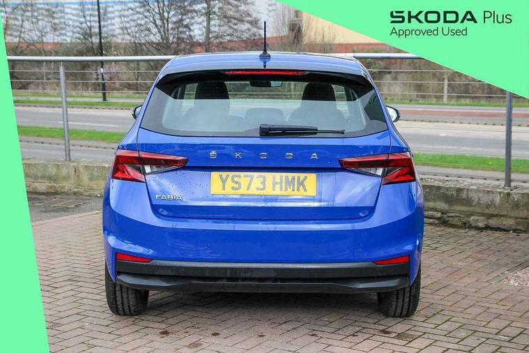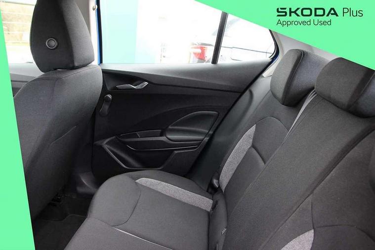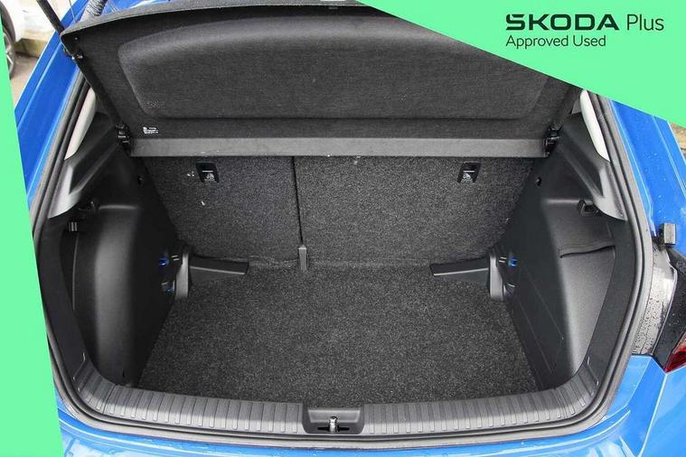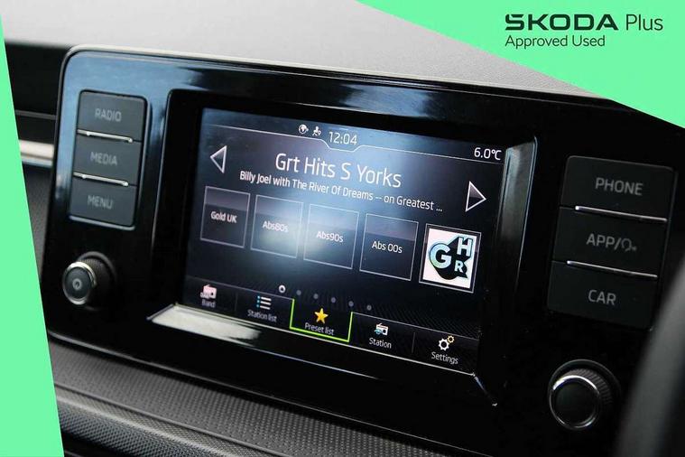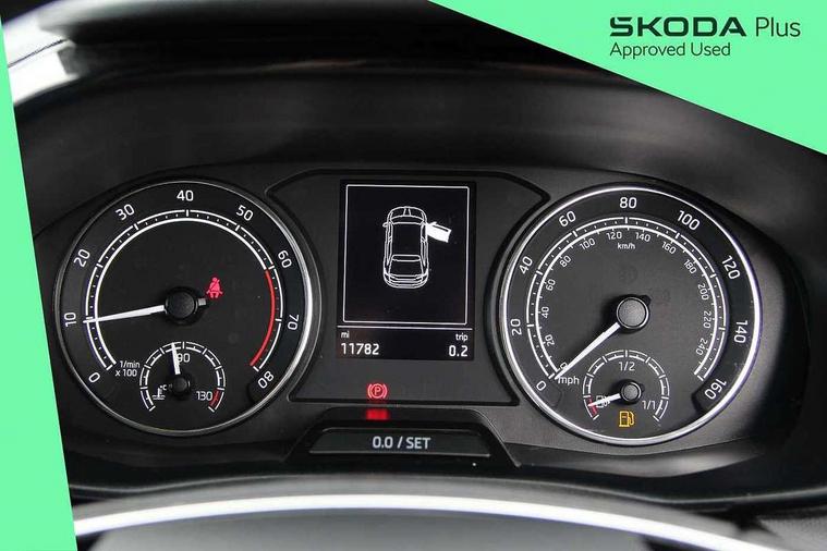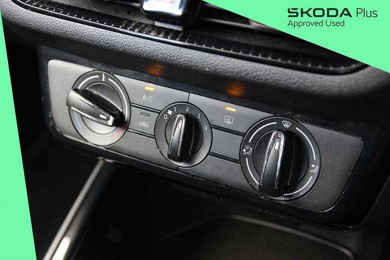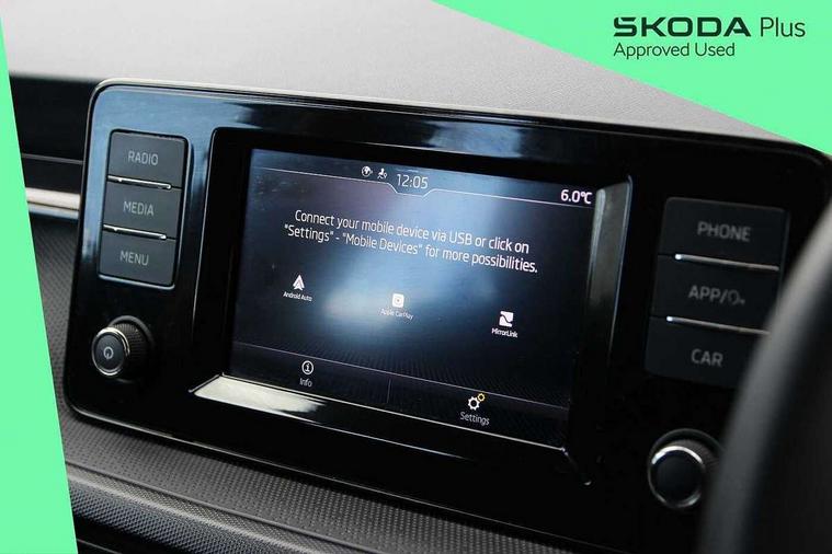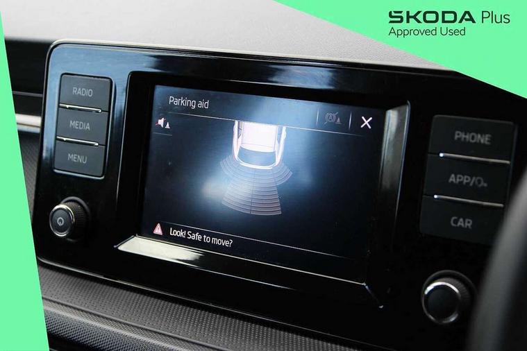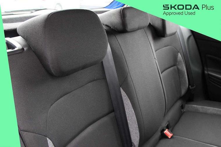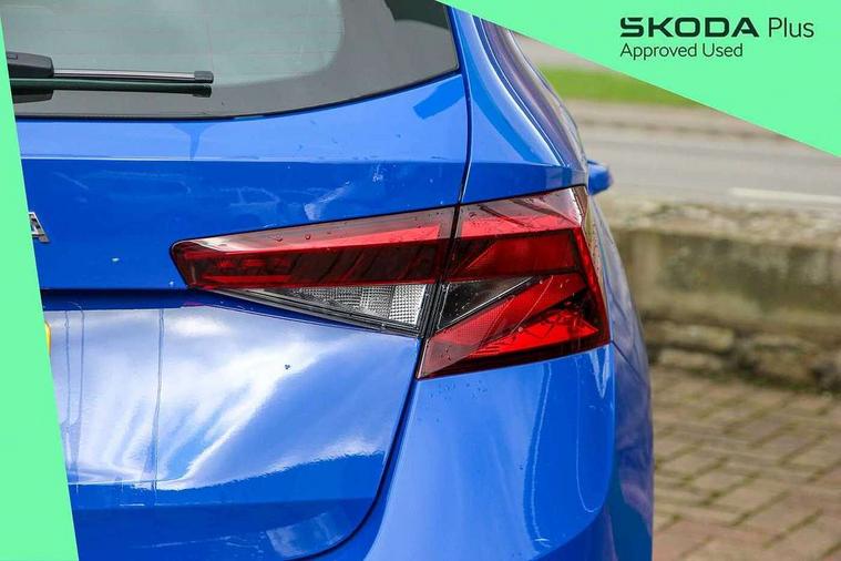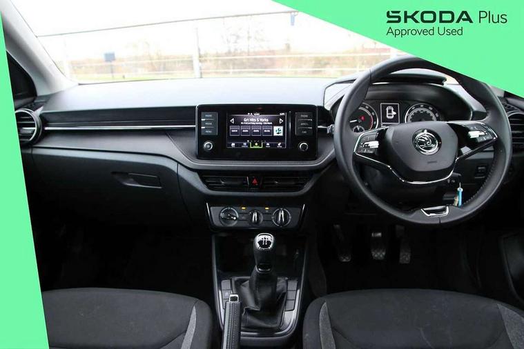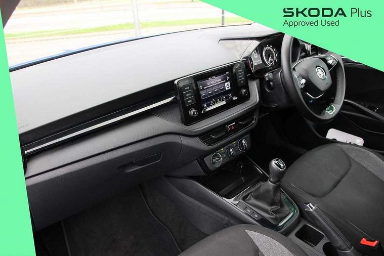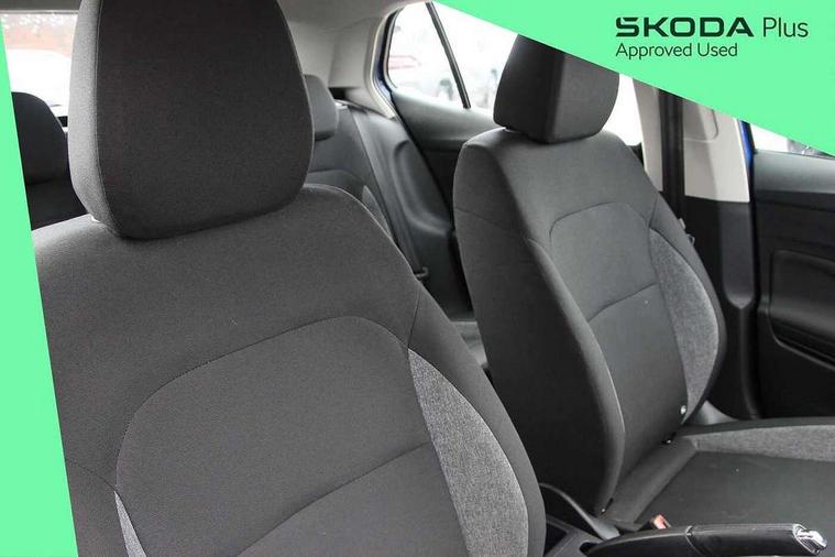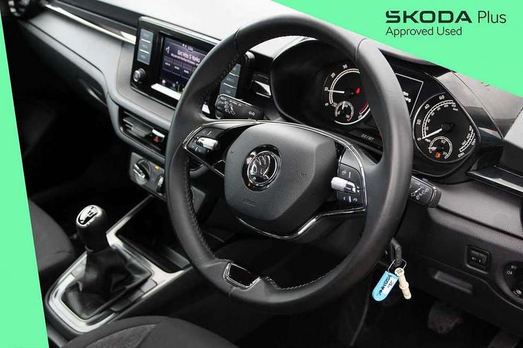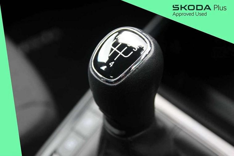 Bluetooth connection, Driver alert system - DAS, Electromechanical power steering, Exterior temperature gauge, Lane assist including road edge detection, Multifunction trip computer in black and white, Service interval indicator, Speed limiter, 2x USB-C in the front (for data transmission and charging), 4 speakers in front, Auxiliary socket for external MP3 player, DAB digital radio reception, Radio Swing with 6.5" colour display, Basic LED Headlights, Body colour door mirrors, Body coloured bumpers, Dimming rear view mirror with black frame, Door mirror integrated indicators, Electrically adjustable and heated door mirrors, Electrically adjustable front windows with function auto up/down, Front fog lights, Front window wiper intermittent control, Headlight range control - Automatic, Ice scraper in fuel cap, LED daytime running lights with coming and leaving home feature, Mechanical adjustable rear windows, Rain sensor, Rear LED fog light, Rear side wing doors, Rear window wiper with washing nozzles, Roof mounted spoiler, SKODA tailgate lettering in chrome, Third brake light, 2 reading lights in front and 2 reading lights in rear, 2 spoke leather multifunction steering wheel, 3 rear headrests, Backrest split and folding, Central console with fixed cup holder and storage box, Chrome handbrake release button, Fabric upholstery, Gearshift knob/handle in leather, Grain satin black interior door handles, Hand brake lever handle in leather, Height adjustable front headrests, Height adjustable front seats, Height adjustable steering wheel, ISOFIX and TopTether anchorage points to the outer rear seats, ISOFIX and TopTether on the front passenger seat, Luggage compartment lighting, Manual air conditioning, Manually adjustable lumbar support in front seats, Pollen filter, Rear seat bench unsplit, Single front passenger seat, Storm grey headlining, Sun visors with mirror and airbag label on passenger side, Ticket holder, 3-point height adjustable front seats belts with pretensioner and force limiter, Automatic warning lights in case of crash, Driver and passengers airbag with switch off function, e-Call+, ESC including ABS, MSR, ASR, EDS, HBA and XDS, Front and rear seat belt warning, FRONT ASSIST (AEB City and AEB Inter Urban), Front side airbags, Head airbags, One tone horn, Pedestrian protection, Three rear 3-points safety seat belts with pretensioner and force limiter including stop function for outer rear seat belts, Tyre pressure monitoring system, Anti-theft alarm system including immobiliser, interior monitoring, backup horn, and towing protection, Central locking with radio remote control, interior controls, SAFE function and 2 foldable keys, Black painted air vents, Glossy black decorative trim, Grain satin black central console cover, Grain satin black lower decorative trim, Satin black door and side trim panel in front, Anti-theft wheel bolts protection, Super-low rolling resistance tyres,