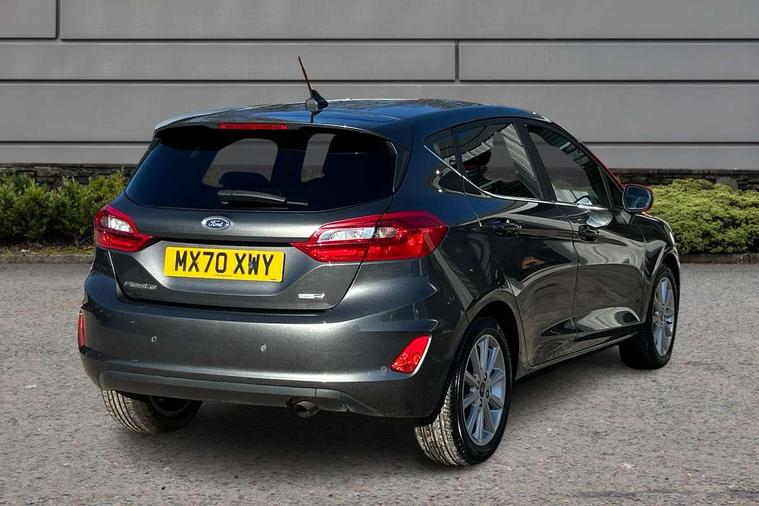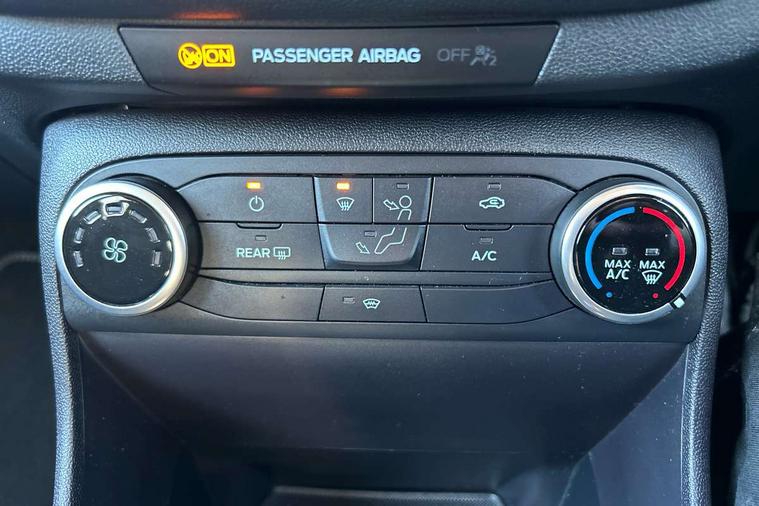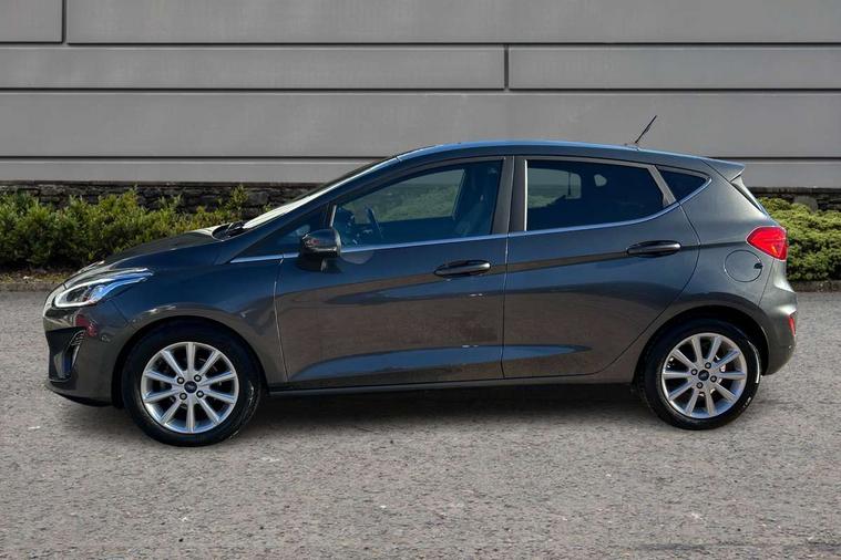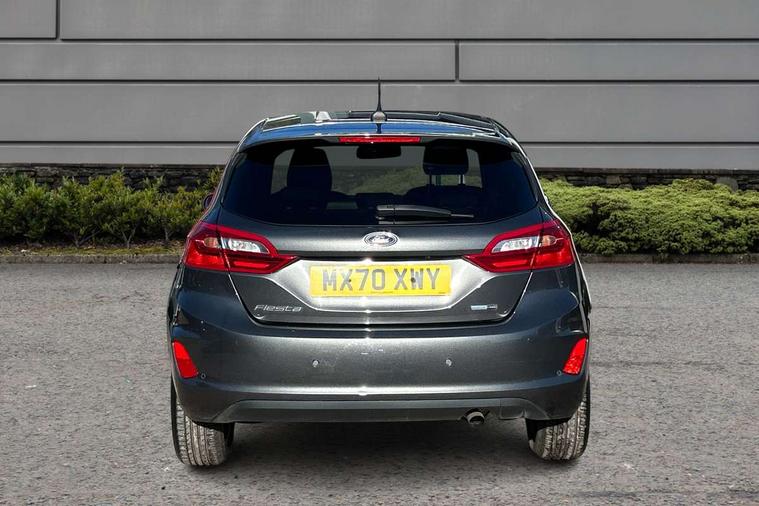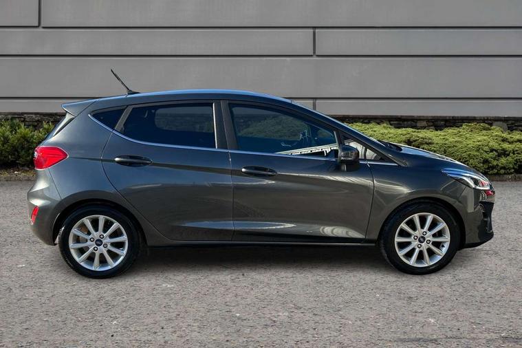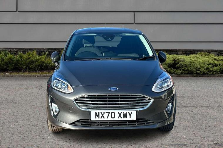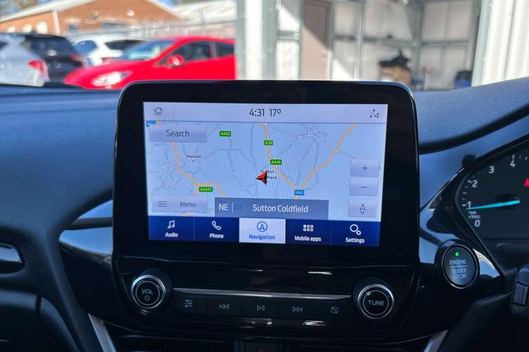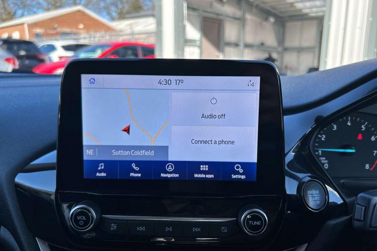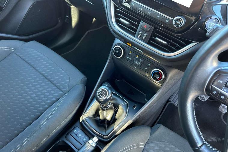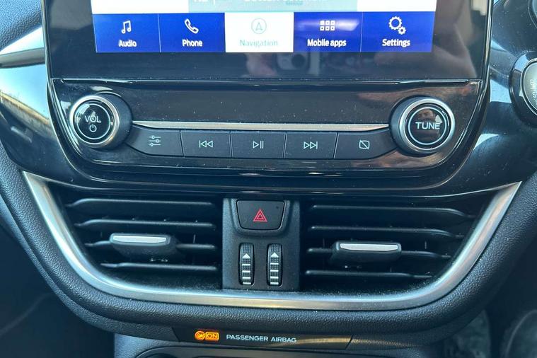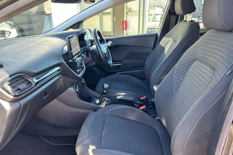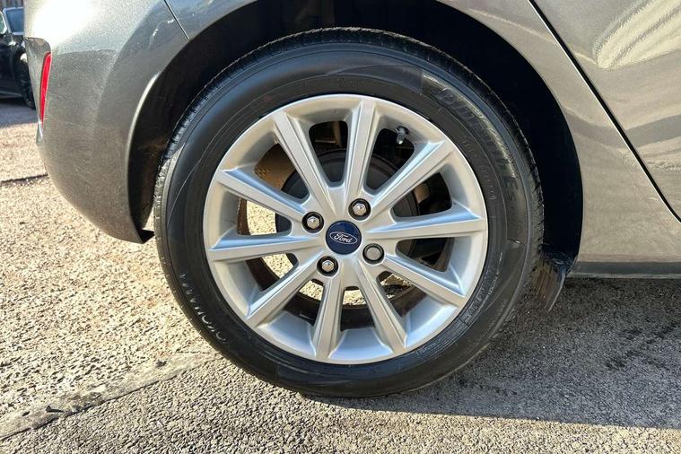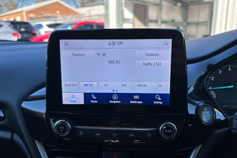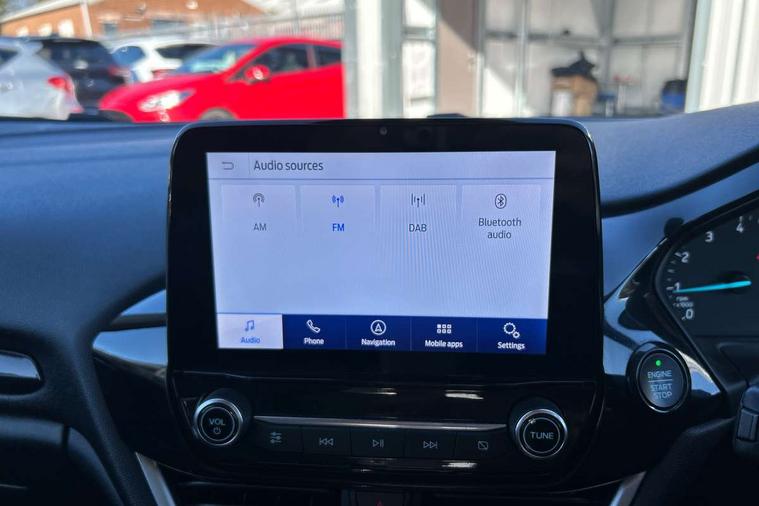 Bluetooth system, Electric power steering, Ford easy fuel, Ford SYNC 3 Navigation system incl 8" touchscreen, 7 speakers, FordPass connect, Apple carplay, android auto, voice control and emergency assistance, Rear parking distance sensors, Trip computer, 2 USB ports, Auxiliary input socket, DAB Digital radio, Steering wheel mounted controls, Body colour bumpers, Body colour door handles, Body colour rear spoiler, Body coloured electrically operated and heated door mirrors with side indicators, Chrome beltline trim, Chrome front grille, Chrome lower window surround, Cornering front fog lights, Electric front windows/one touch facility, Electric rear windows, Power foldable door mirrors with puddle lights, Privacy glass, Quickclear heated windscreen, Rain sensing wipers and auto dimming rear view mirror, Rear wiper, 12V Accessory socket in centre console, 3 spoke leather trimmed steering wheel with audio control, 60/40 split folding rear seat, Adjustable head restraints, Boot carpet, Centre console with armrest and illuminated cupholders, Chrome inner door handles, Cloth upholstery, Footwell illumination, Front floor mats in velour, Front map reading lights, Front seat and rear pockets, Height adjustable driver's seat, Illuminated glovebox, Leather wrapped handbrake and gearknob, LED ambient lighting, Load area light, Luxury woven headliner, Manual air conditioning, Overhead console with sunglasses holder, Pollen filter, Rake/reach adjustable steering wheel, NCAP Pack - Fiesta, 3 point seatbelts on all rear seats, ABS+EBA, Curtain airbags, Driver and passenger airbags, Drivers knee airbag, Electronic stability control with hill start assist, Front passenger airbag deactivation, Front side airbags, Seatbelt warning, Two tone horn, Tyre pressure monitoring system, Keyless start with 'Ford Power' starter button, MyKey system, Remote central locking & engine immobiliser, Thatcham Cat.1 alarm, 16" 10 spoke alloy wheels,