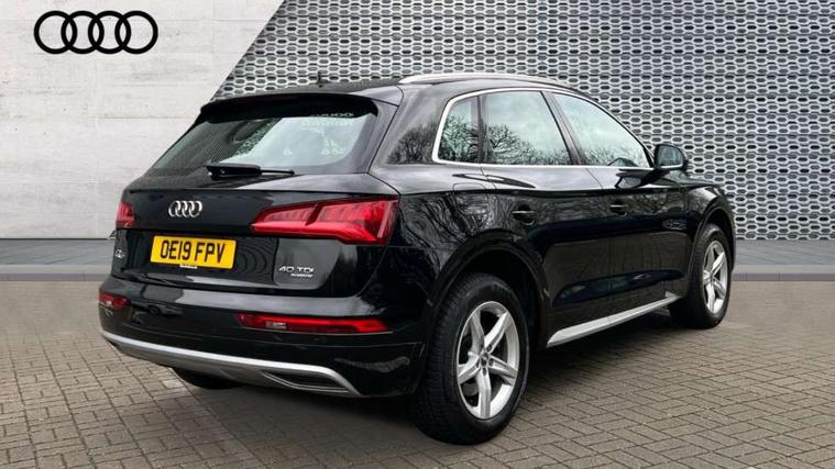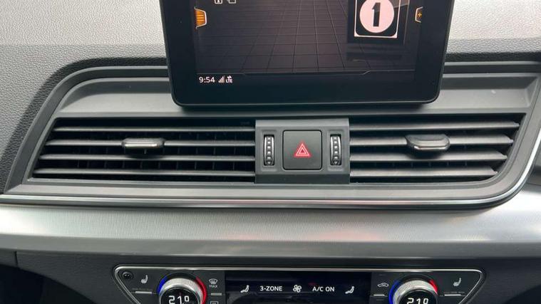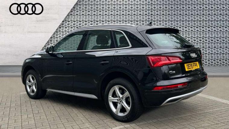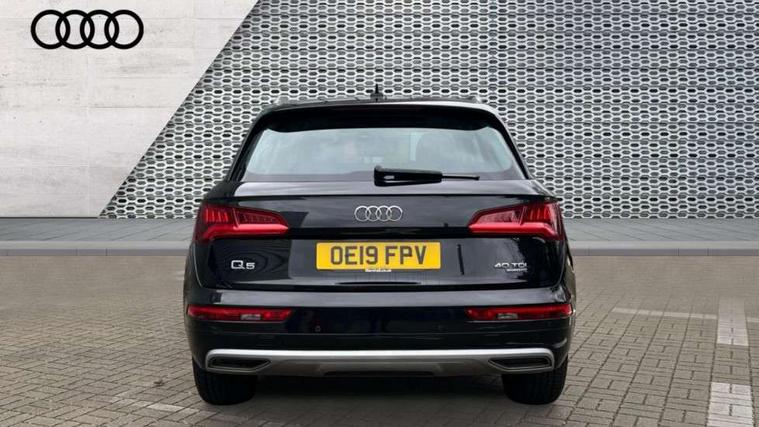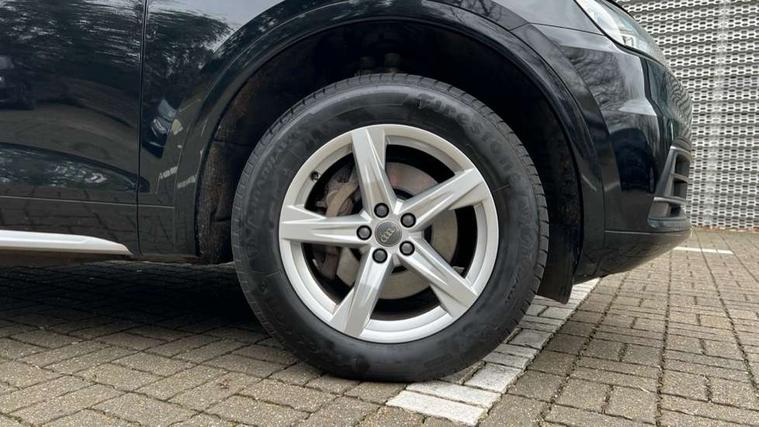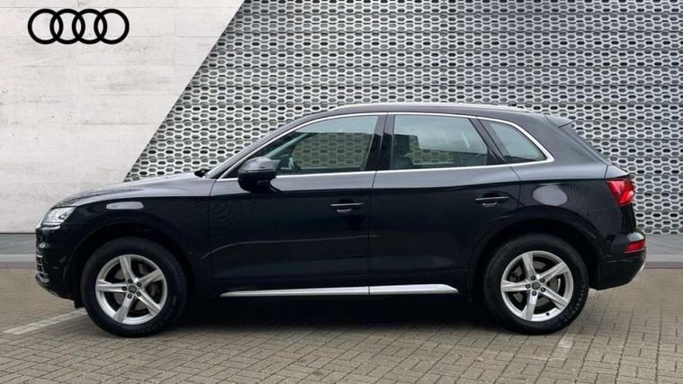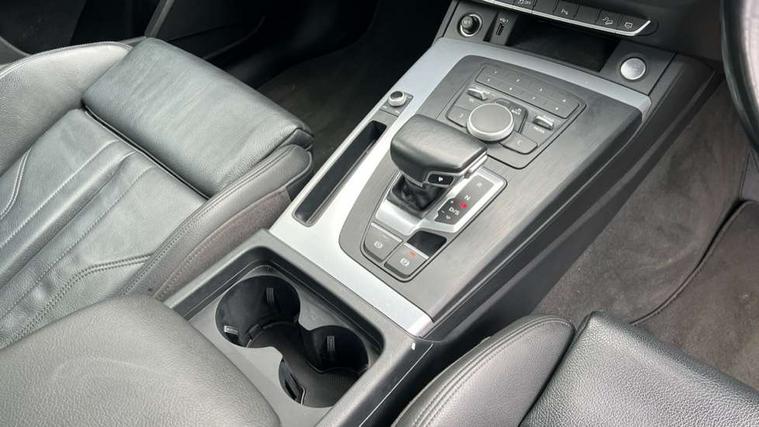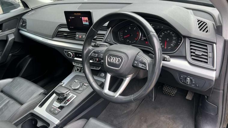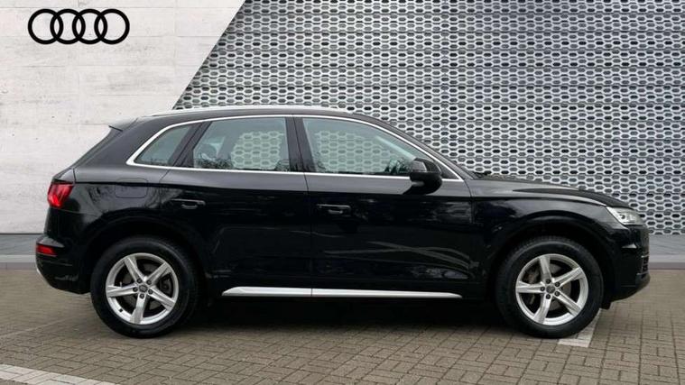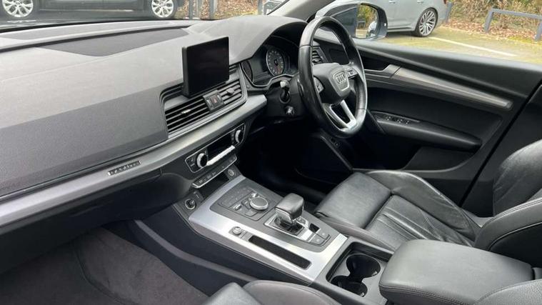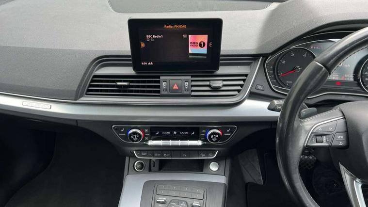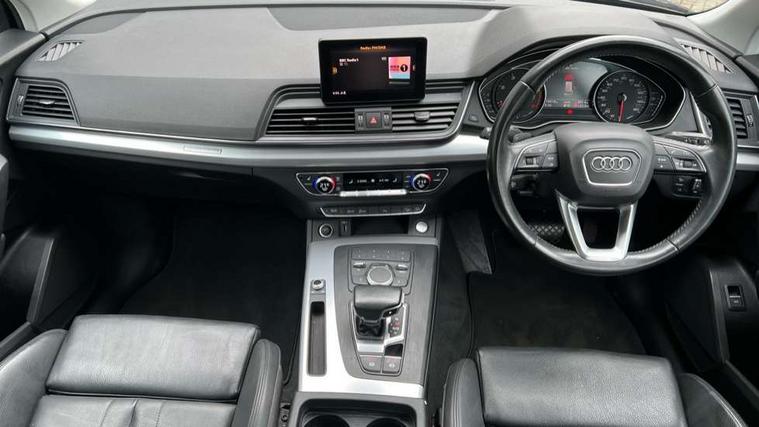 7" Colour driver information system, Audi drive select, Audi parking system plus with front and rear sensors, Audi smartphone interface, Automatic start/stop system, Electro - mechanical power assisted steering, MMI Navigation, Mobile telephone preparation - bluetooth interface, Power tailgate, Service interval indicator, Voice control system, Diesel particulate filter, 2x SD card slot, CD player, DAB Digital radio, MMI radio plus with 7" colour MMI screen and MMI controller, Acoustic windscreen, Air inlets in matt titanium black with blades in matt aluminium silver, Aluminium roof rails, Auto dimming rear view mirror, Automatic headlight levelling, Body colour bumpers, Body colour door mirrors, Chrome exhaust tailpipe, Front and rear electric windows, Light and rain sensor for auto activation of lights and windscreen wipers, Loading sill protector in stainless steel, Matt selenite silver underbody protection, Rear diffuser strip in selenite silver, Rear spoiler, Rear wiper, Side skirts in matt selenite silver, Twilight grey matt radiator grille with matt aluminium horizontal chrome struts, 2 x USB charging port with aux input socket, 3 rear headrests, 3 Spoke leather multi function steering wheel, 3 zone climate control, 4 way electric lumbar support for driver and front passenger, 40:20:40 split folding rear seat with rear centre armrest, Cloth headlining, Door sills trims with aluminium inlays, Front centre armrest, Front/rear floor mats, Height adjustable front head restraints, ISOFIX child seat mounting and top tether, Luggage compartment carpet, Removable luggage compartment floor, Sunvisors with vanity mirrors, Tool kit, Trunk roller cover, High gloss pack - Q5, Non Smokers pack, 3 point seatbelts on all seats, 6 airbags - Driver, front passenger, curtain and side airbags, Electromechanical parking brake, Electronic stabilisation control including ABS, ASR and EDL, Front passenger airbag deactivation, Hill descent control, Hill hold assist, Multi collision brake assist, Pop-up bonnet for pedestrian protection, Pre sense city, Seat belt force limiter, Seatbelt monitoring, Tyre pressure warning, Warning triangle and first aid kit, Anti theft alarm, Anti-theft wheel bolts, Keyless Go access/ignition system, Remote central locking, Aluminium rhombus inlay,