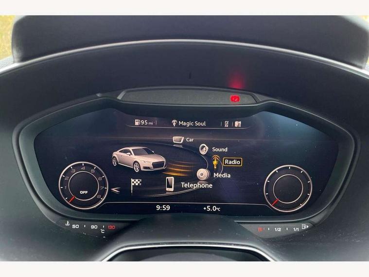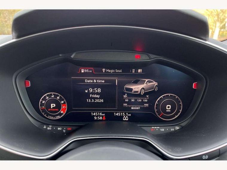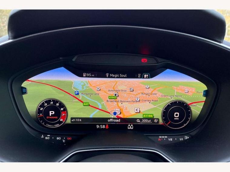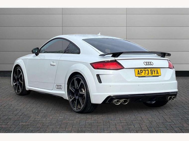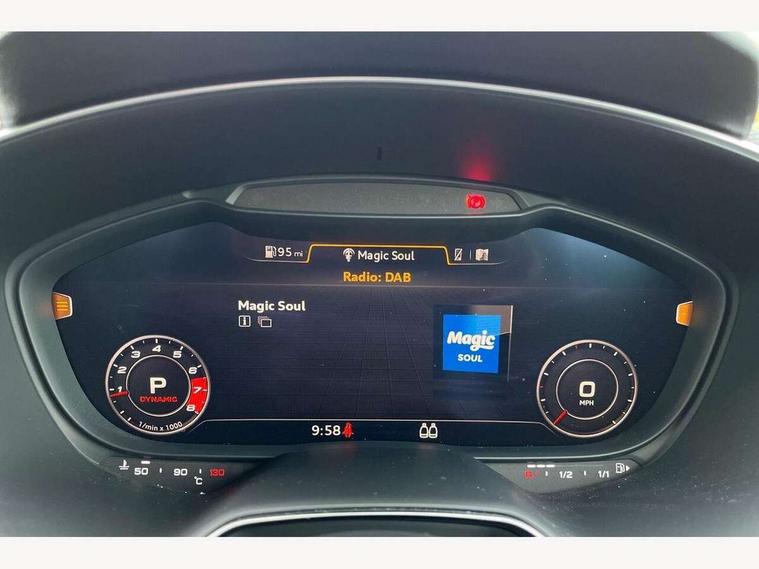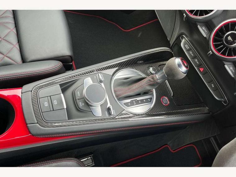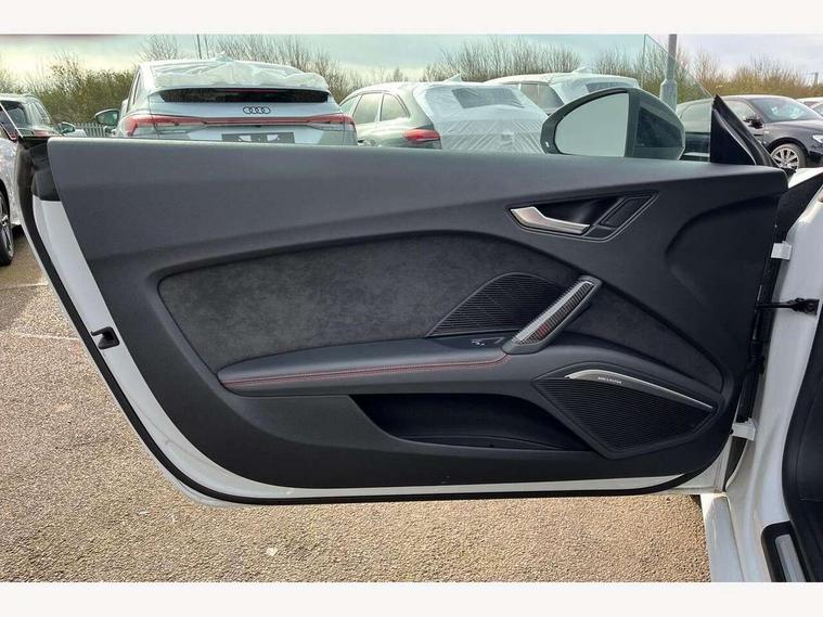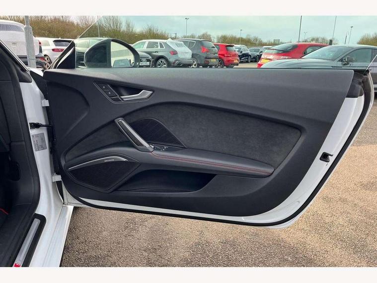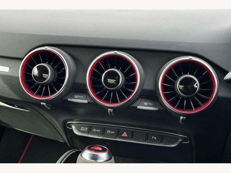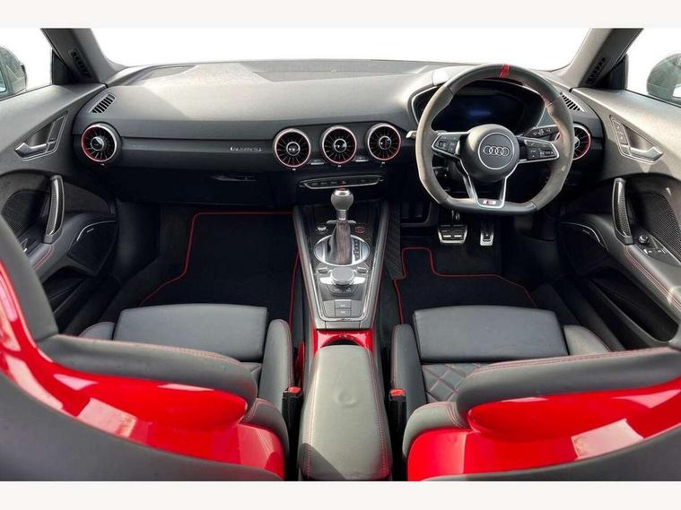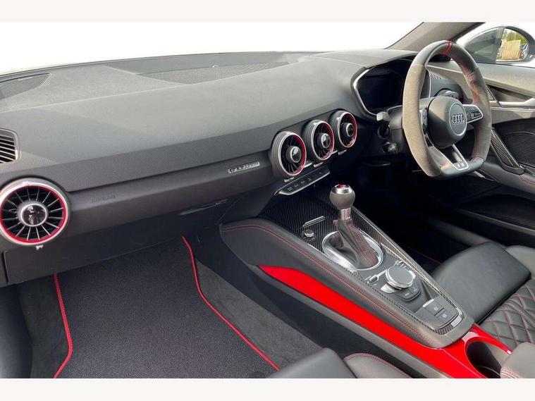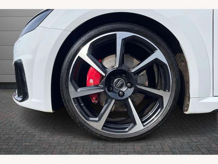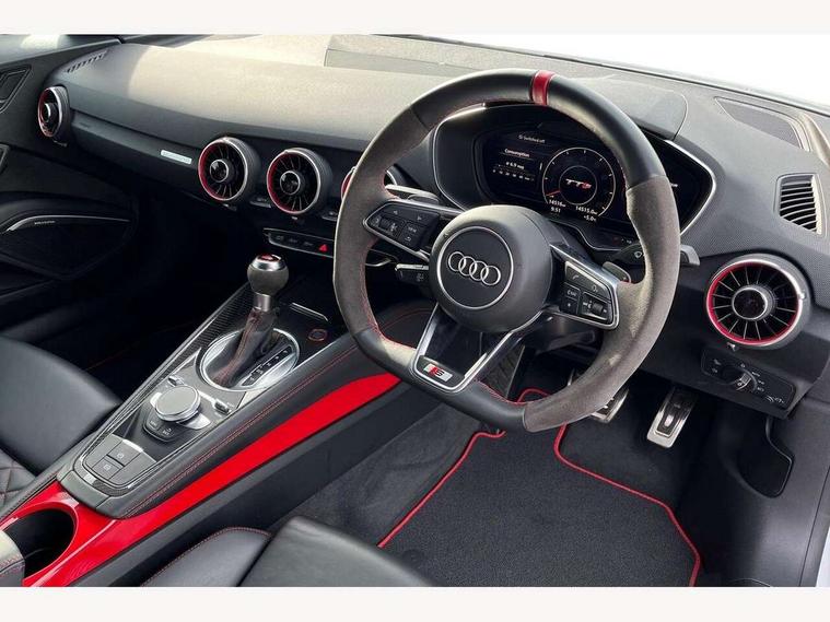 Audi drive select with 4 Pre configured modes, Audi Phone Box with wireless charging - Qi enabled compatible phone and additional bluetooth interface, Audi smartphone interface, Audi virtual cockpit - 12.3" high-resolution LCD display with fully customisable instrument cluster, Cruise control + speed limiter, Emergency call service, Progressive power assisted steering, Service interval indicator, Start/Stop system with energy recuperation, TP memo, Audi magnetic ride, TTS suspension, AM/FM radio, Bluetooth audio streaming, DAB Digital radio, Aluminium door mirror housings, Audi Beam uses LEDs to project the Audi Sport logo, Audi rings decals, Auto dimming rear view mirror, Auto headlight range control, Dark privacy glass from B-pillar backwards, Electric folding door mirrors, Electric front windows, Electrically adjustable and heated door mirrors with integrated LED side indicators, Heat insulating glass in windshield, Heat reflecting windows, LED 3rd brake light, LED daytime running lights, LED headlights with LED rear lights + dynamic rear indicators, Light and rain sensors, Rear boot, 12V socket, 2 rear seats, 3 spoke flat bottomed contour leather multi-function TTS sport steering wheel and TTS badging, 4 way electric lumbar support for driver and front passenger, Alcantara leather with 12o'clock marker and express red contrast stitching in steering wheel, Black headlining, Door sill trims with aluminium inlay and TTS logo, Fine nappa leather upholstery with S embossing + contrasting express red stitching on upholstery, Steering wheel and gear knob gaiter, Front centre armrest, Front passenger seat, Front super sports seats, Heated front seats, Integrated head restraints, ISOFIX child seat mounting for front passenger seat with airbag deactivation, Manual adjustment of seat height, fore/aft position, seat angle, seat depth and backrest angle, Rear head restraints, Rear top tether child seat ISOFIX attachment, Red piped floor mats, Split folding rear seat, Black styling package - TT, Comfort and sound pack - TT, Leather pack - TT, LED interior light pack - TT/TTS, Non smoking pack - TT/TT RS, Plus pack - TT Black Edition/Final Edition Coupe, S design body styling pack - TTS, Technology pack without Audi phone box - TT, 3 point front seat belts, ABS, ASR traction control, Curtain airbags, Driver and front passenger airbag with front passenger airbag deactivation, EDL traction control, Electromechanical parking brake, ESP, First aid kit, Front side airbags, Head airbags, Hill hold assist, Red brake callipers, Seatbelt warning, Tyre pressure loss indicator, Warning triangle, Anti theft alarm, Anti theft wheel bolts, Immobiliser, Remote central locking, Carbon inlays, 20" 7 spoke anthracite black, gloss-turned Audi sport alloy wheels, Tool kit, Tyre repair kit,