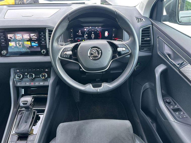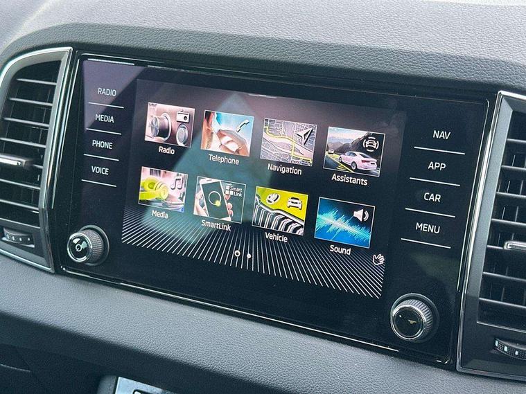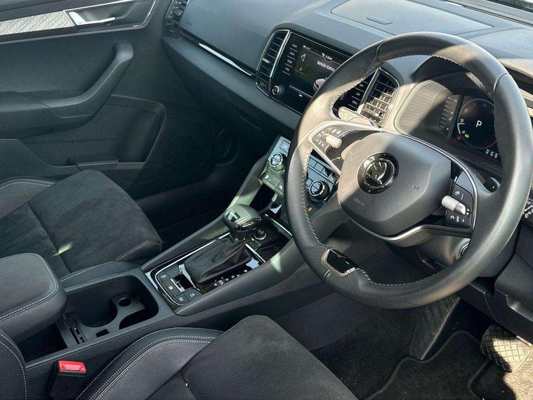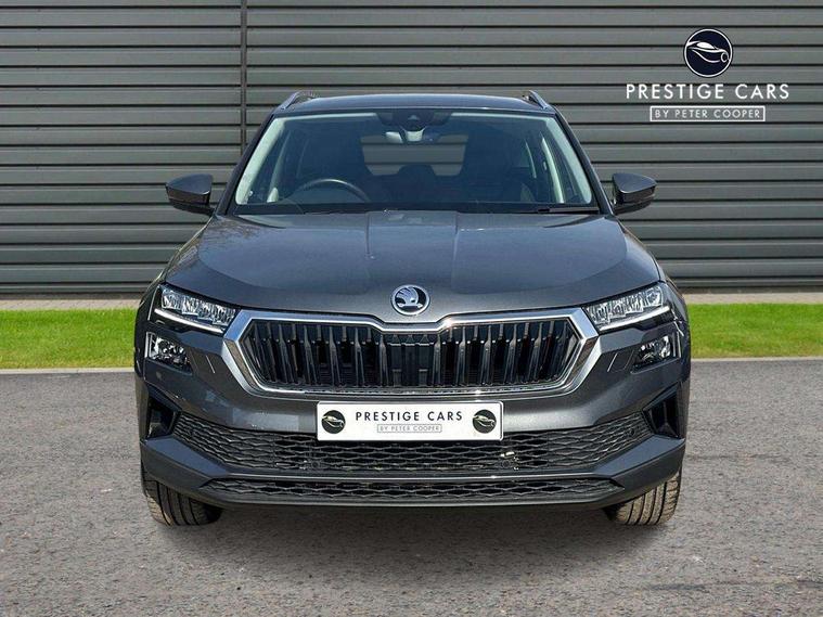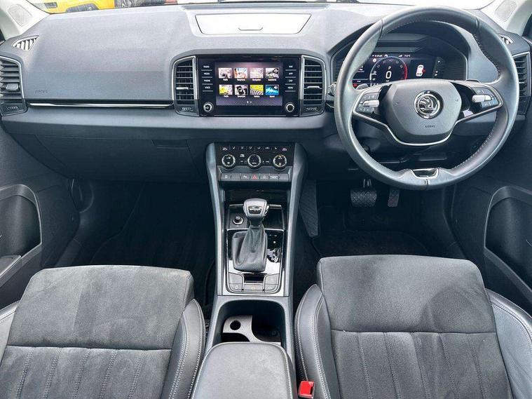 8" Digital display, Advanced driver attention and drowsiness monitor, Emergency services call system, Outside temperature gauge, Sensor for driver assistance systems, Service interval indicator, SmartLink wireless for Apple and wired for Android, Start/stop system with regenerative braking, USB C Port x 2 in front centre console, Virtual Cockpit - 10.25" digital display, Wireless smartphone charging, DAB radio with Bluetooth, USB connection, Acoustic glass, Aero front windscreen wipers with intermittent function, Auto dimming rear view mirror with light and rain sensors, Black electric window control buttons, Body colour door mirrors and handles, Electric front and rear windows with child proof lock, Heated rear windscreen, LED daytime running lights, LED rear lights with high functionality welcome effect and dynamic indicators, Light assistant (coming/leaving home/tunnel light), Plastic scuff plates in door apertures, Privacy glass, Rear side wing doors, Rear spoiler, Rear window wiper with washer system and intermittent control, Safety reflectors on front doors, Third brake light, 1.5 litre bottle holders in driver and front passenger door panels, 12V socket in boot, 12v socket in front centre armrest with storage compartment and rear air vents, 2 spoke leather heated multifunction steering wheel with DSG paddles, 2 x Tablet holder, 3 rear height adjustable headrests, 3 seat bench in 2nd row, 4 foldable roof handles with rear coat hooks, Black floor carpet, Chrome inner door handles, Foldable hooks in the boot, Front head restraints, Height adjustable front three point seats belts with tensioners, Height/reach adjust steering wheel, Ice scraper, Illuminated glovebox, Illuminated luggage compartment, Interior noise suppression, Isofix child seat preparation for front passenger seat, Isofix child seat preparation outer rear, Manual lumbar support for front seats, Pearl grey interior ceiling, Pen holder, Pollen filter, Rear boot cover, Rear reading lights, Rubbish bin door, Safety vest holder, Single front passenger seat, Storage box in upper central dashboard closed, Sunvisors with illuminated vanity mirrors, Textile floor mats, Ticket holder, Design Pack - Karoq, Non Smokers pack, Parking pack - Karoq, Automatic door unlocking in case of crash, Automatic fuel cut off in case of crash, Driver airbag, Electronic parking brake with auto hold function, Emergency rear braking signal, ESC (incl. ABS+MSR+ASR+EDS+HBA+DSR+RBS+MKB), Front side airbags, Head airbags, Hill hold control, Knee airbags, Passenger airbag with switch-off function, Pedestrian monitor, Seatbelt reminder signalisation and pretensioner for all seats, Three point seatbelts rear, Two tone horn, Tyre pressure monitor, Alarm with interior monitoring, back up horn and tilt sensor with safe function, Electronic engine immobiliser, Keyless entry and start/stop, Remote central locking with 2 remote folding keys, Black centre console, Chrome framed air vents, Satin black dashboard, Anti-theft wheel bolts protection, Breakdown and tool kit,