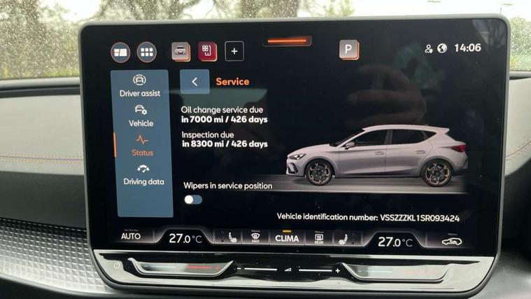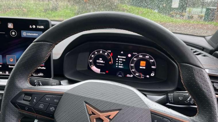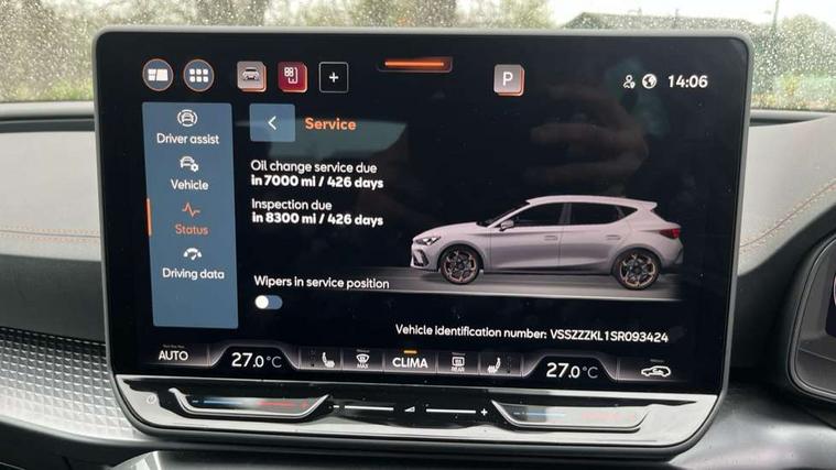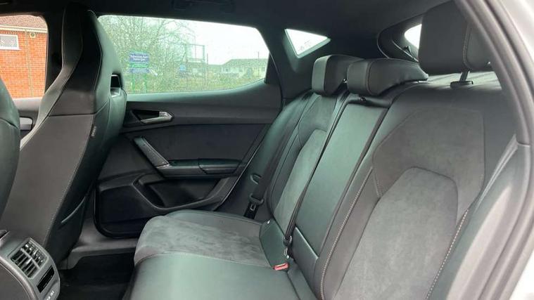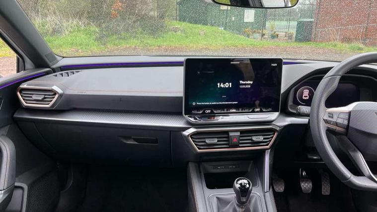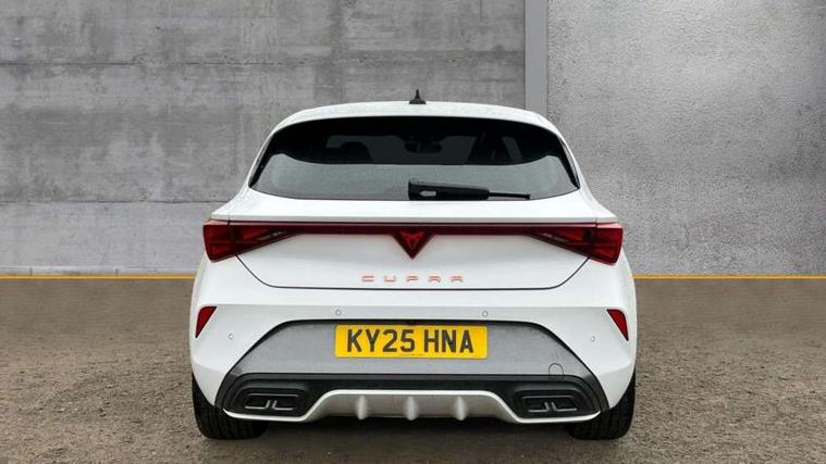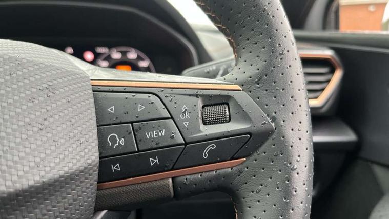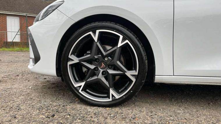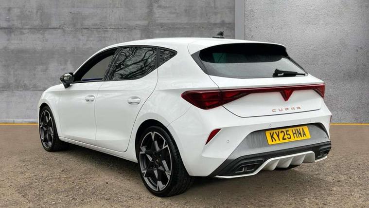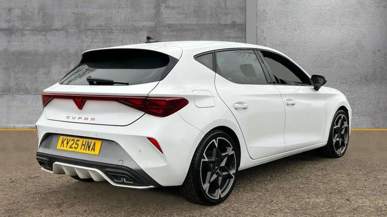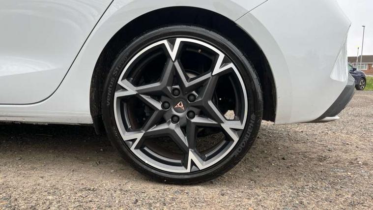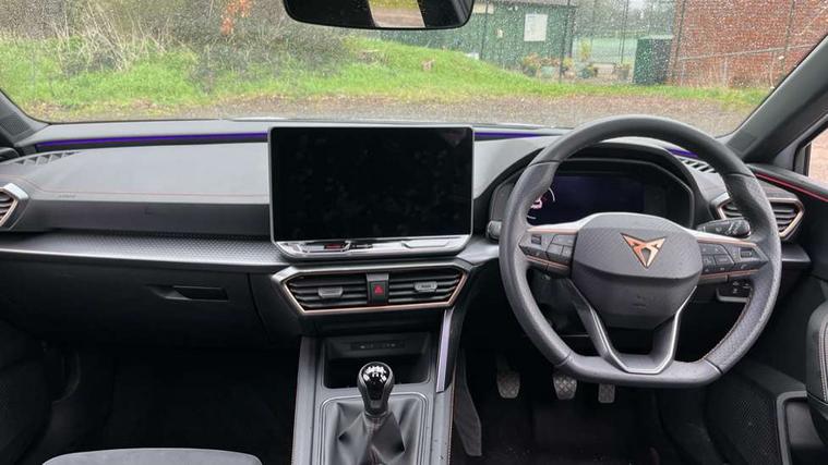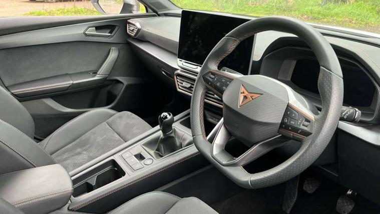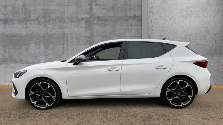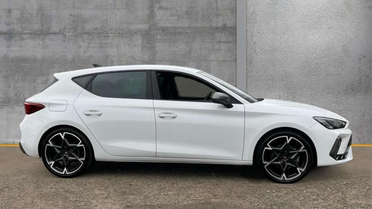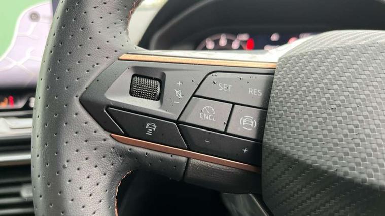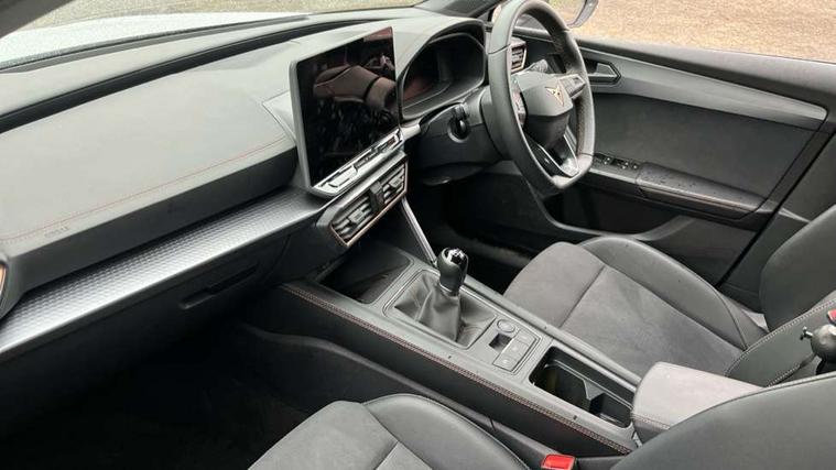 Adaptive cruise control with follow-to-stop and speed limiter, CUPRA drive profile selection with (Comfort/Sport/Individual), throttle response and gearshift mode, Digital cockpit, Dynamic road sign display, E-call, Front and rear parking sensors, Front assist with forward collision warning braking reaction to vehicles, pedestrians and cyclists, Full link smartphone integration with Mirror Link, wireless Apple CarPlay and wired Google Android Auto, Lane assist, Lockable tailgate, Rear view camera, RPM, trip computer, outside temp gauge, instrument light brightness, low fuel warning light, lights on reminder, gearshift indicator, Service interval indicator, Start/stop system with regenerative braking, Wireless phone charger, Auxiliary input socket, Auto dimming rear view mirror, Body colour door handles, Body coloured bumpers, Cupra sports bumpers, Dark tinted rear windows, Electric front/rear windows, Electrically adjustable, heated and folding door mirrors, High beam assist, LED front fog lamps with cornering function, LED headlights with dynamic turn signals, tail lights, rear fog lights with rear coast to coast lighting, LED rear fog lamp, Rain sensing wipers, Rear side wing doors, Rear wash/wipe, Separate daytime running light with automatic headlight control and coming home feature, Third brake light, Welcome light with logo projector in door mirrors, 12v power supply in centre console, 3 seat bench in 2nd row, 5 headrests, 60/40 split rear bench seat with armrest, Ambient lighting (glovebox, footwell, ambient lighting multicoloured), Black headlining, CUPRA Leather flat bottomed, heated, perforated steering wheel, Dinamica cloth upholstery, Electrically adjustable driver seat and lumbar support with memory function + manually adjustable passenger seat, Folding boot cover, Four x USB Type C ports (2 in front and 2 in rear), Front and rear reading lights X 4, Front centre armrest, Heated front seats, Height/reach adjust steering wheel, Illuminated interior front door sills, Interior wraparound lighting, ISOFIX points in outer rear seats with top tether anchorage points, Single front passenger seat, Storage pockets on rear of front seats, Sunvisors with illuminated mirror, Three zone climate control, Dynamic and comfort pack - Leon Cupra, Media system plus with 12.9" display + navigation pack - Leon Cupra, 3 point seatbelts on all rear seats, ABS, Brake control system - ESC and brake booster, Child proof door locks, Cupra black brake calipers, Driver and front passenger airbags with front passenger airbag de-activation, front side and curtain airbags, Electronic parking brake, Hill hold control, Rear disc brakes, Seat belt reminder for front and rear seats, Tiredness recognition system, Tyre pressure monitoring system, Anti theft alarm system with interior monitoring in cab, backup horn and towing protection, KESSY Advanced - Keyless start, keyless entry, Locking wheel bolts, Chrome and copper interior detailing, 19" Polar machined sport black and silver alloy wheel with 91Y tyres, Tool kit,