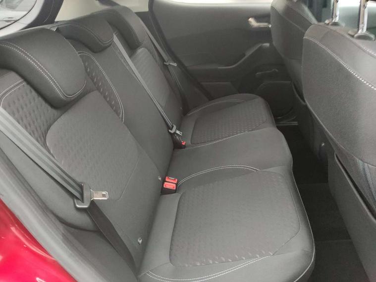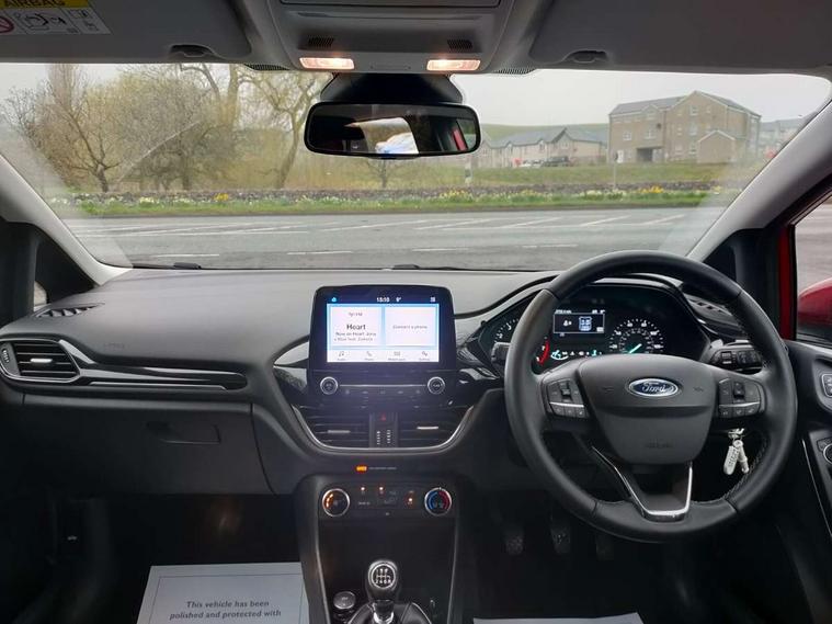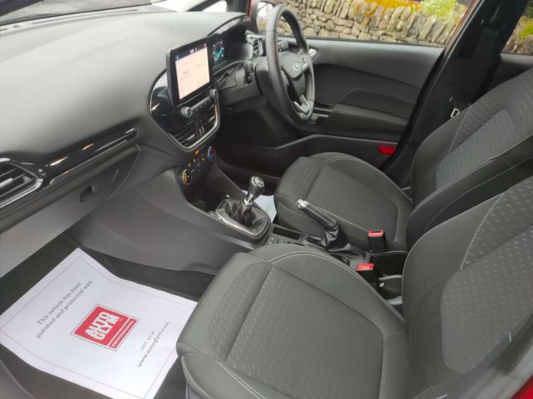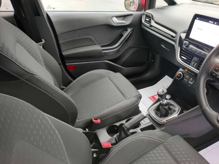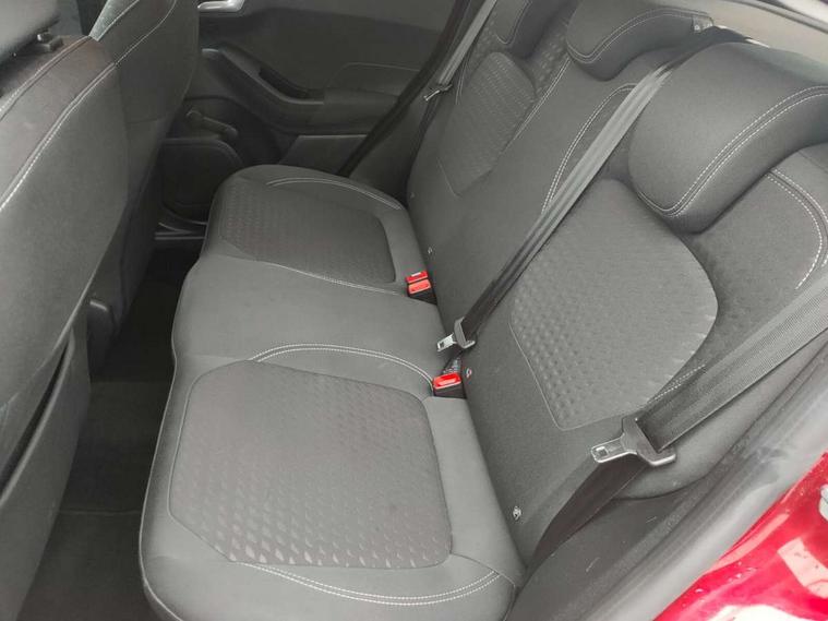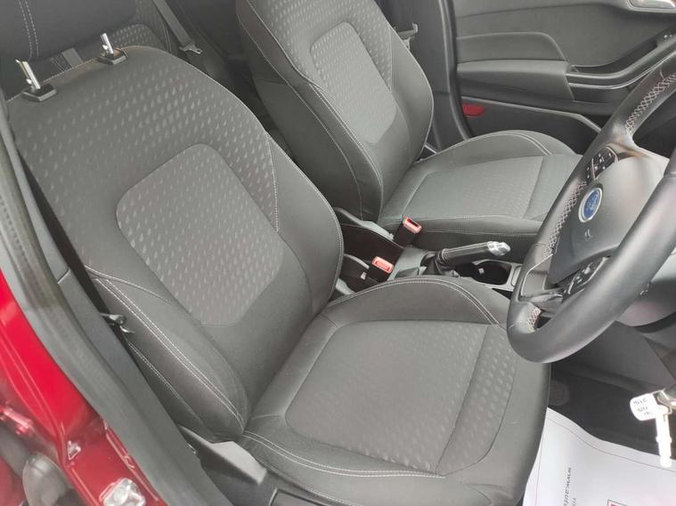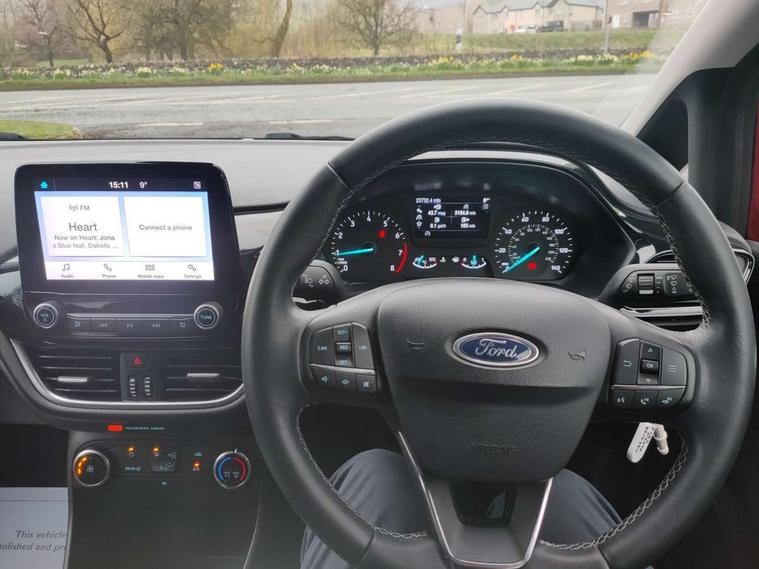 Bluetooth system, Electric power steering, Ford easy fuel, Trip computer, 2 USB ports, Auxiliary input socket, DAB Digital radio, Steering wheel mounted controls, Automatic headlights, Body colour bumpers, Body colour door handles, Body colour electric adjustable heated door mirrors with integral indicators, Body colour rear spoiler, Chrome beltline trim, Cornering front fog lights, Electric front windows/one touch facility, Halogen projector style headlights with static cornering lights + LED daytime running lights, Quickclear heated windscreen, Rear wiper, Tinted glass, Upper front grille chrome surround, 12V Accessory socket in centre console, 3 spoke leather trimmed steering wheel with audio control, 60/40 split folding rear seat, Adjustable head restraints, Boot carpet, Chrome inner door handles, Cloth upholstery, Footwell illumination, Front map reading lights, Front seat and rear pockets, Height adjustable driver's seat, Illuminated glovebox, Leather gear knob, Leather trimmed handbrake handle, Load area light, Luxury woven headliner, Manual air conditioning, Overhead console with sunglasses holder, Pollen filter, Rake/reach adjustable steering wheel, Rear centre head restraint, NCAP Pack - Fiesta, 3 point seatbelts on all rear seats, ABS+EBA, Curtain airbags, Driver and passenger airbags, Drivers knee airbag, Electronic stability control with hill start assist, Front passenger airbag deactivation, Front side airbags, Seatbelt warning, Tyre pressure monitoring system, MyKey system, Remote central locking & engine immobiliser, Thatcham Cat.1 alarm,