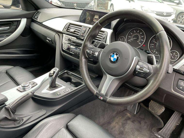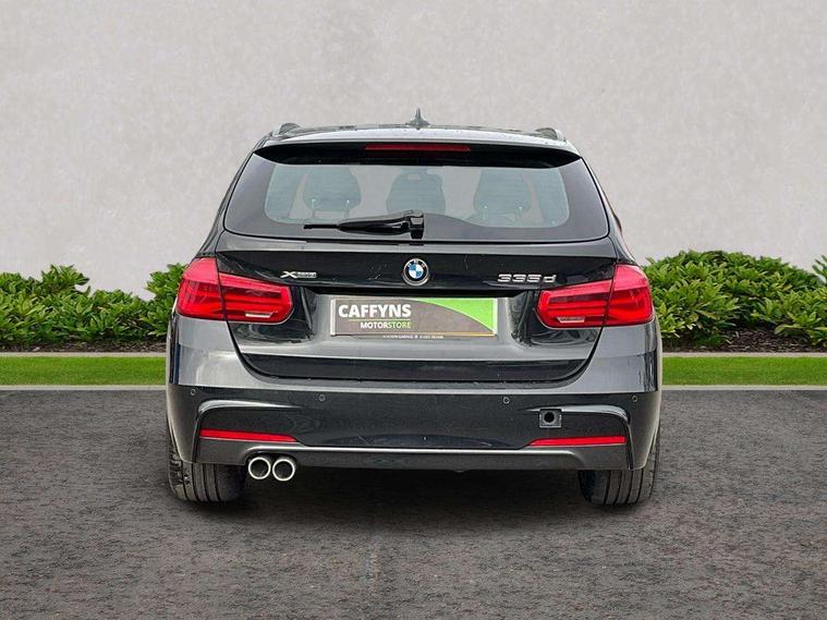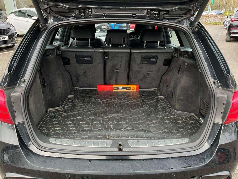 Automatic tailgate operation, BMW Online services, BMW Teleservices, Brake force display, Brake pad wear indicator warning light, Check control system, Digital clock, Door/boot open warning light, Front/rear park distance control, Lights on warning, Oil temperature gauge, On board computer, On board diagnostics, Operation warning of all exterior lights, Outside temperature display, Push button starter, Service interval indicator, Traffic message channel (TMC), Diesel particulate filter, Drive Performance Control, Electronic differential lock, Sports function on gearbox with steering wheel mounted gearshift paddles, Auxiliary point for auxiliary devices, BMW professional radio/CD/MP3, CD Changer preparation, DAB Digital radio, 'Guide me home' headlamps, 2 speed adjustable intermittent wipers with wash/wipe function, Auto dimming rear view mirror, Automatic headlight beam throw control, Body colour bumpers, Body colour door handles, Body colour roof mouldings, Chromed finished twin exhaust, Clear indicator lenses, Door sill finishers, Dynamic brake lights, Electric adjustable door mirrors, Electric front and rear windows with one touch/convenient open/close function, Front ornamental grille with black kidney bars and chrome bezel, Green tinted heat insulating glass, Heated rear window with automatic switch off, Heated windscreen washer jets, High gloss shadow line, Independent opening for tailgate window, LED daytime running lights, LED fog lights, M aerodynamic body styling, Pearl chrome door mirrors, Rain sensor + automatic driving lights control, Rear wash/wipe, Shark fin roof aerial, 12V sockets in front centre console and passenger footwell, 2 bag hooks in luggage compartment, 2 x folding cupholders in instrument panel above glovebox, 3 rear seat head restraints, 4 foldable grab handles - rear with clothes hook, 4 lashing points to secure luggage, 40:20:40 split folding rear seat, Ambient lighting, Automatic interior light soft on/soft off system, Driver and passenger sunvisors with vanity mirrors + slide cover, Dual zone automatic air conditioning, Foldable boot floor with storage compartment, Folding front centre armrest + storage, Front and rear door armrests, Front and rear velour floor mats, Front door storage bins with bottle holder, Front sports seats with electric side bolster adjustment, Glovebox light, Height adjustable front headrests, Indirect front interior illumination - soft-light function, Individual anthracite headlining, Isofix system on outer rear seats, Leather gear knob, Leather gear selector lever handle, Leather handbrake grip, Lockable glovebox, Luggage compartment lighting, Luggage strap, M sports leather steering wheel, Multi-function controls for steering wheel, Reach + rake adjustable steering column, Rear centre armrest with 2 cupholders, Rear storage compartment in multifunction centre console with sliding cover, Retractable luggage cover, Separation net, Storage compartment in rear doors, Through load system, Toolkit located in luggage compartment, Extended lighting package - 3 Series, Interior lights pack - 3 Series Touring, 3 point inertia reel seatbelts + pre-tensioners on outer rear seats, ABS, Automatic Stability Control (ASC), BMW emergency call, CBC - (Cornering brake control), Crash sensor, Driver and passenger airbags, DSC+, Dynamic brake control, Dynamic Traction Control - DTC, Front and rear head airbags, Front passenger airbag deactivation, Front seat side impact airbags, Front seatbelt pretensioners + load limiters, Hill start assist, Rear child proof door locks, Seatbelt warning, Three 3 point rear seatbelts, Twin horns, Tyre pressure monitor, Warning triangle and first aid kit, Automatic drive away locking facility, Central locking fuel filler cap, Centre lock switch, Electronic immobiliser, Key integrated remote control central locking, Remote control alarm, Low rolling resistance tyres, Run-flat tyres,