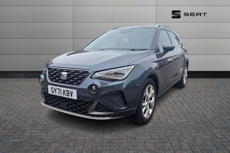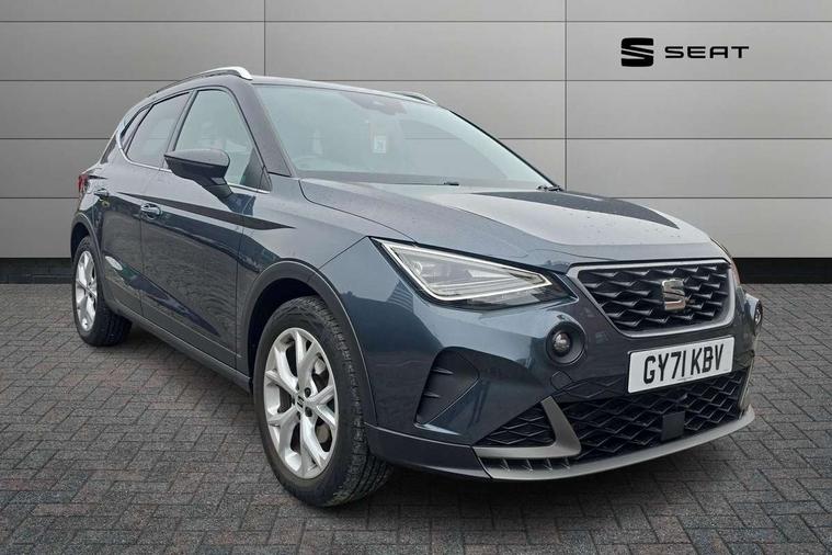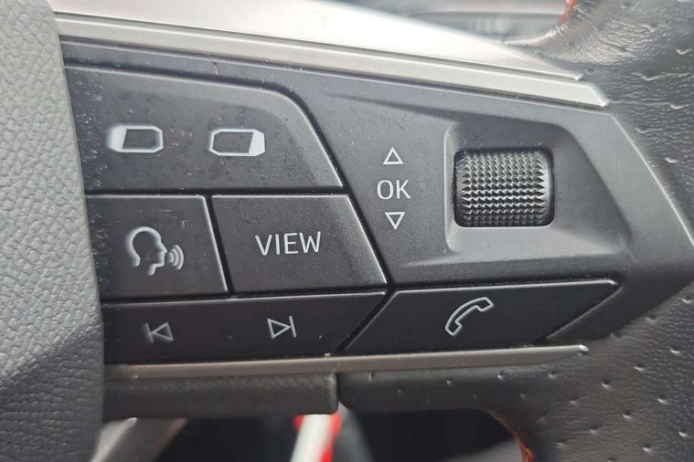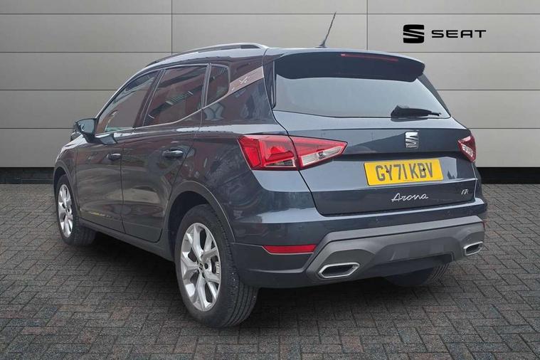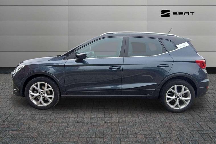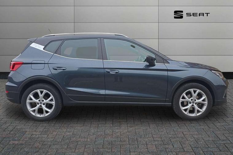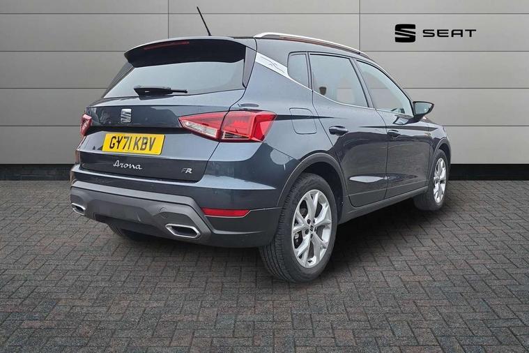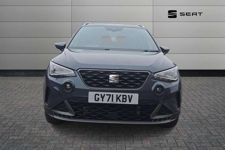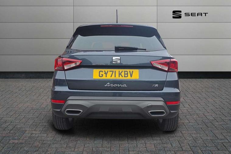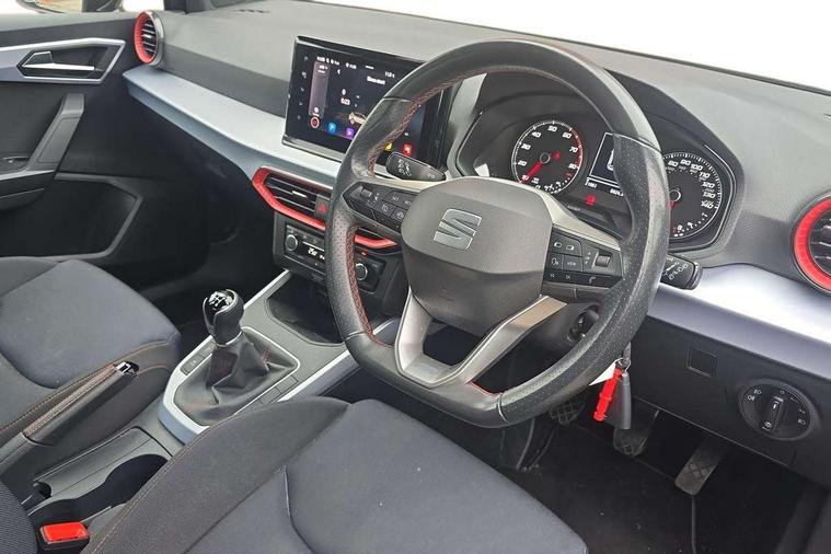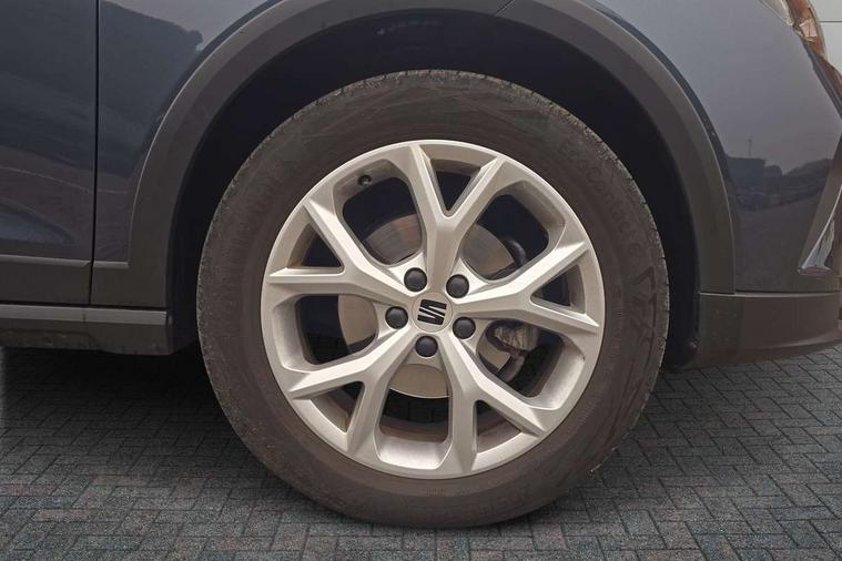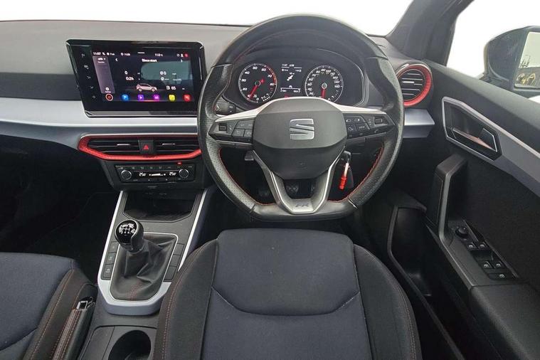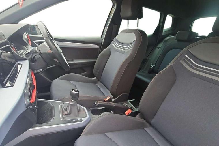 'Lights On' Reminder warning buzzer, Digital clock, Electric speed sensitive power steering, Full Link Smartphone Integration with Mirror Link, Apple Car Play, Google Android Auto with USB cable for Apple and Android compatibility, Lane keeping system, Low fuel warning light, Outside temperature display, Rear parking sensor, RPM counter, SEAT Drive profile - Four different models normal-sport-eco-individual, steering response, throttle response, Trip computer, Bluetooth interface for hands free and audio streaming, DAB digital radio and AM/FM radio, Steering wheel mounted audio controls, Anti theft roof antenna, Auto dimming interior rear view mirror, Automatic activation of hazard warning lights, Body coloured bumpers, Body coloured door handle inserts, Chrome roof rails and window surrounds, Chrome window trim, Dark tinted rear windows, Electric front/rear windows, Electrically adjustable, heated and folding door mirrors, Front fog lights with cornering function and rear fog light, FULL LED automatic headlights with dynamic headlight range control, coming and leaving home, LED daytime running lights, LED rear tail lights and licence plate lights, Protective side mouldings, Rain sensing wipers, Rear spoiler, Rear window wash/wipe, Roof colour door mirrors, Twin exhaust pipe styling hidden exhaust pipe, Visible VIN plate, Windshield wiper with intermittent control and potentiometer, 2 cupholders, 60/40 split folding rear seat, Aircare filter, Black interior roof, Cloth upholstery, Daring red Illuminated coloured air vent, Double boot floor, Driver sunvisor with covered mirror + card holder, Dual zone climate control, Front courtesy light with front and rear reading lights, Front sport seats, Gear shift indicator, Height adjustable front seats, Height/reach adjustable steering column, Illuminated boot, Instrument lighting with brightness control, Interior ambient lighting, Interior light in footwell, central console and door panel, ISOFIX points in outer rear seats with top tether anchorage points, Passenger sunvisor with vanity mirror, Perforated flat bottomed leather steering wheel/gear knob/handbrake with red stitching and FR logo, Two front and three rear height adjustable headrests, Connectivity pack plus - Arona, Interior chrome pack - Arona, 3 point seatbelts on all rear seats, ABS, Active front headrests, Child locks on rear doors, Driver and front passenger airbags with front passenger airbag de activation, front side and curtain airbags, Electronic stability control, Emergency Brake Assist (EBA) and front assist, Front and rear seatbelt reminder, Hill hold control, Multi-Collision braking, Tiredness recognition system, Traction control, Tyre pressure monitoring system, Alarm with back-up horn, Electronic engine immobiliser, Locking wheel bolts, Remote central locking + deadlocks, Tow away protection, Titan black dashboard, 17" Dynamic alloy wheels,