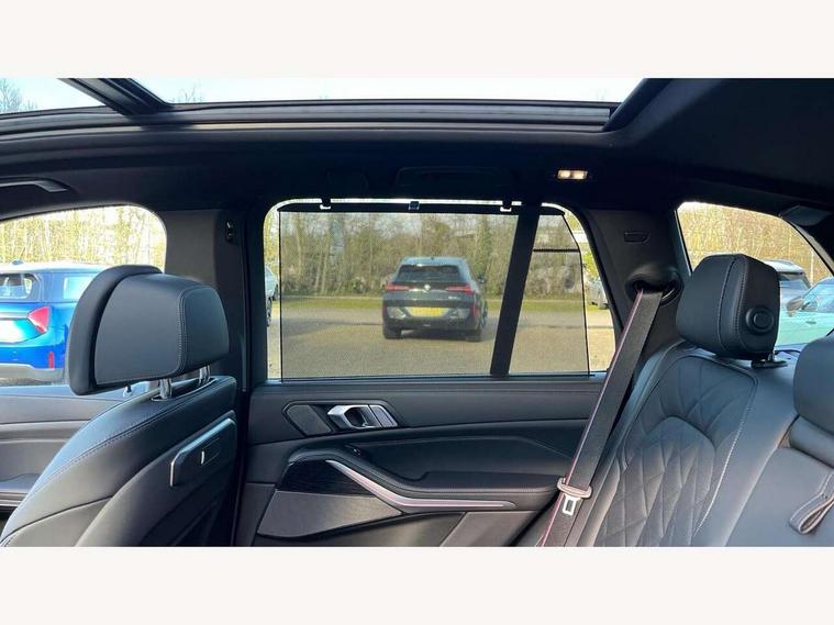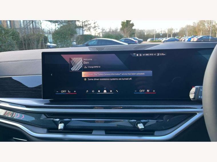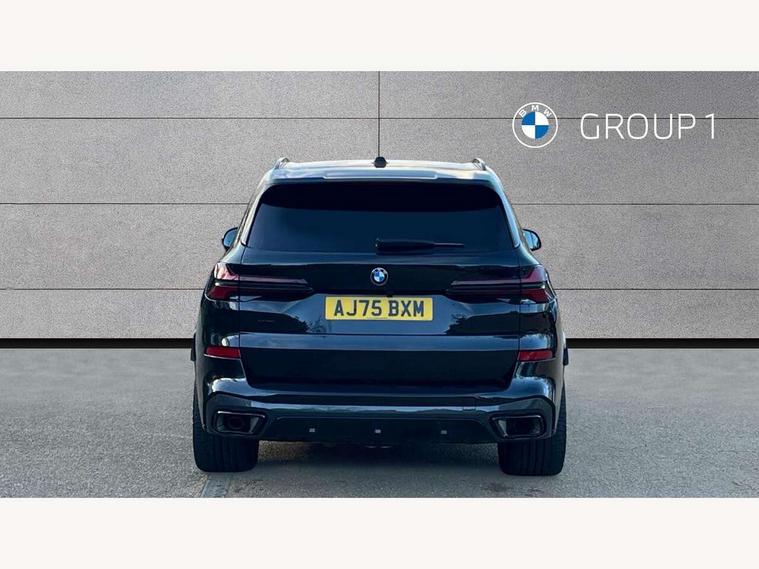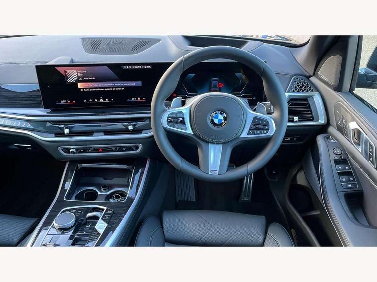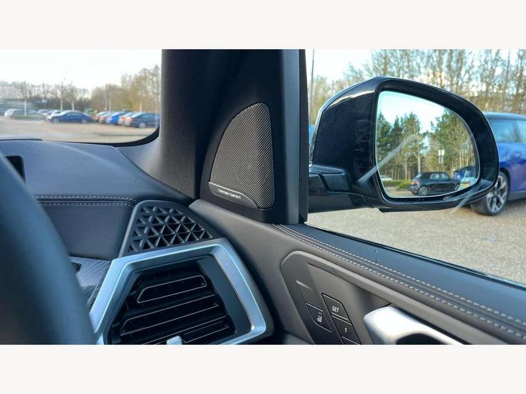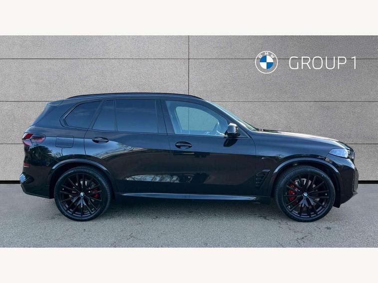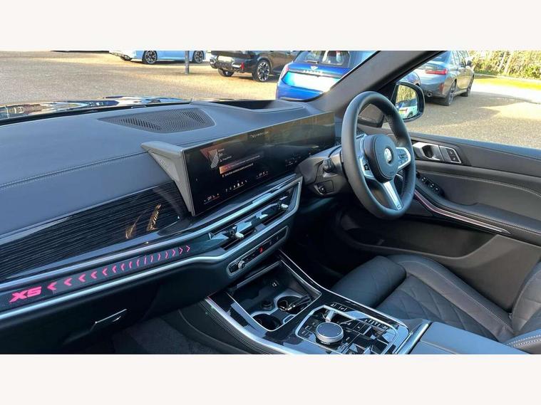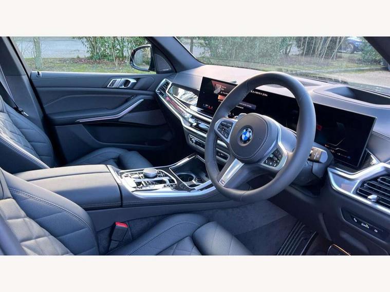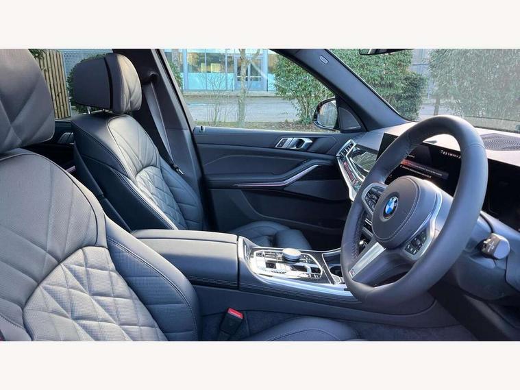 Attentiveness assist, Automatic tailgate operation, BMW ConnectedDrive online services, BMW live cockpit + with curved 12.3 instrument cluster/14.9 central display, nav/Tuner with diversity reception, RDS/4GLTE/remote software upgrade, BMW Recovery system, BMW Teleservices, Condition based service, Cruise control with brake assist, eCall emergency call system, Enhanced bluetooth with wireless charging, Integrated owner's handbook, PAS, Speed limiter, Wi-Fi hotspot, Drive performance control with ECO PRO comfort + sport mode, Eight speed steptronic sport automatic transmission and gearshift paddles on the steering wheel, Adaptive LED Headlights, Front and rear electric windows, High beam assistant, High gloss black shadow line roof rails, LED daytime running lights, Rain sensor, Rear side wing doors, Third brake light in rear spoiler, Variable intermittent rear wash/wipe, 12V - Power sockets with 2x centre console and 1x luggage compartment, 3 seat bench in 2nd row, Entry sills illuminated BMW inscription front and rear, Foldable rear centre armrest with 2 cupholders and storage compartment, Front and rear side armrest integrated into door trim, Grab handles in 1st and 2nd row of seats with Integrated in headliner, at rear with coat hooks, plastic, Headrests for all seats, Luggage compartment separating net, Lumbar support with height and depth adjustment in backrest, Single front passenger seat, Sunvisors with illuminated vanity mirrors and ticket pocket, Three spoke sport M leather steering wheel, Velour floormats, Ambient light interior pack - X5, Driving assistant pack with radar based driver assistance system - X5, Expanded exterior mirror pack - X5/X5 M, M aerodynamics pack - X5, Parking assistant pack - X5, 3 rear seatbelts, Active protection, Airbags - driver/front passenger, rear and side, first and second row seats head airbags, front passenger seat airbag deactivation + knee airbag, Anti-lock braking system (ABS), Automatic Stability Control (ASC), Brake energy regeneration, Cornering brake control (CBC), Crash sensor activating central locking release, hazard warning lights, fuel cut off, interior lighting + activation of safety battery terminal clamp, DSC - Dynamic Stability Control, Dynamic Traction Control - DTC, Electromechanical parking brake with automatic drive away release and auto hold function, Electronic brake force distribution, Hill start assistant, M Sport blue painted brake calipers with 'M' designation, Mechanical child proof lock on rear doors, Tyre pressure monitoring system, Tyre pressure sensors, Ventilated front and rear disc brakes, Warning triangle and first aid kit, Alarm system, Closing system with central locking, Comfort access system, Locking wheel bolts,