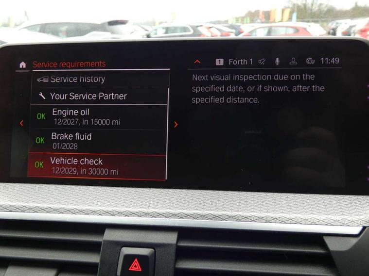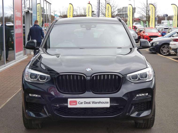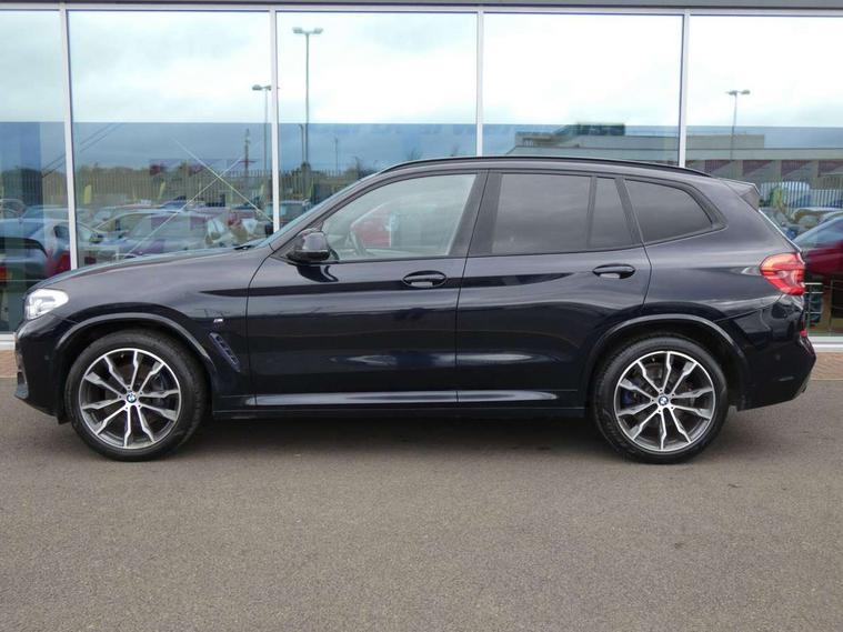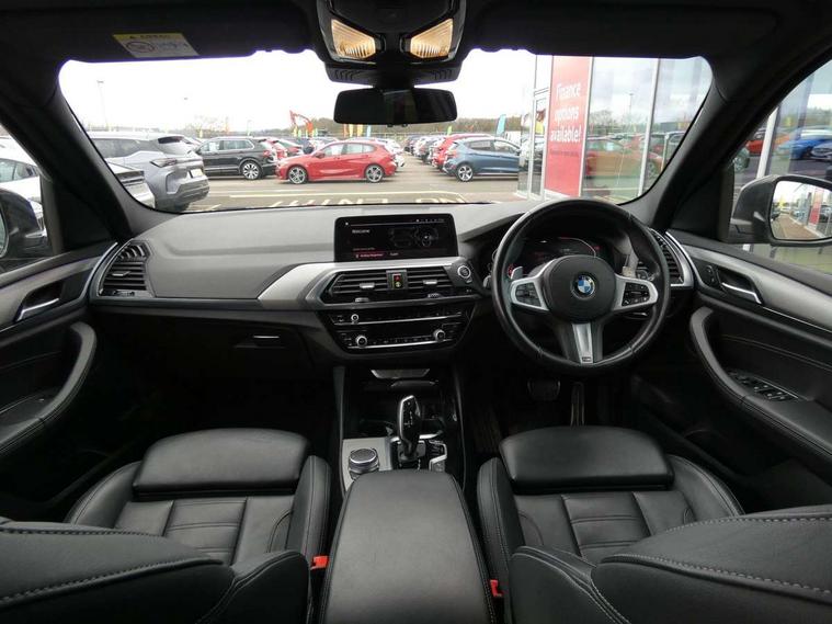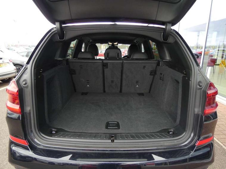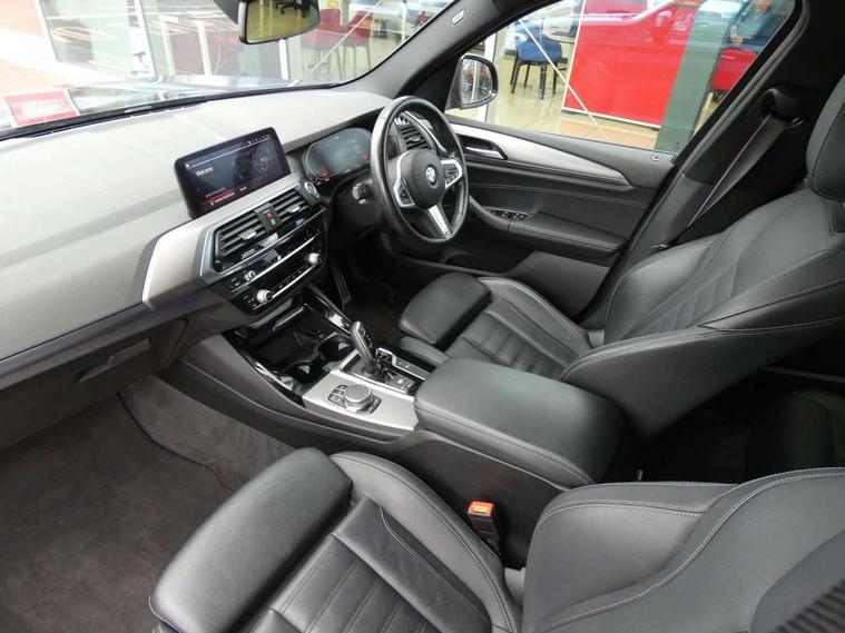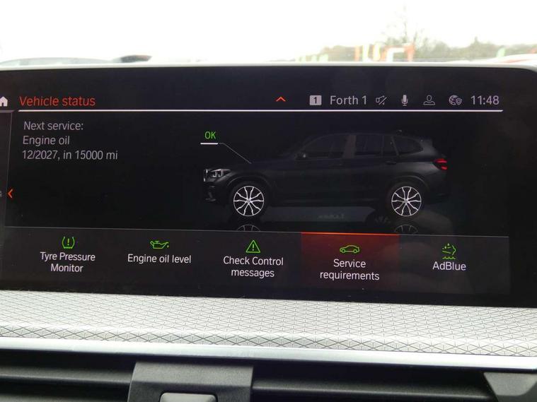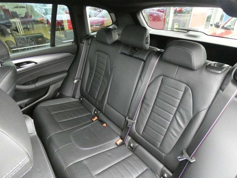 Active Guard incl speed limiting and lane departure functions with auto steering, and front collision warning with brake intervention, Attentiveness assist, Automatic tailgate operation, BMW Live Cockpit Professional sat nav system including 10.25" high resolution display and Intelligent Voice Assistant, BMW Online services, BMW Teleservices, Brake pad wear indicator in front and rear, Check Control warning system for monitoring of lights and door/luggage compartment open warning, Control display - 6.5" colour display screen, Electric Power Steering (EPS) with Servotronic, Front/rear Parking distance control, iDrive Controller with 8 favourite buttons, Lights on warning by audio warning signal when ignition is switched off, Navigation system - BMW Professional multimedia with Hard disc drive (HDD) and 10.25" touch display, Oil sensor for level and grade, warning by check control system, On board computer - average speed+fuel consumption, service interval, clock/date, odometer/trip meter, outside temperature display and ice warning, Optimum shift indicator, Personal Profile - automatic lock when driving away selectable, Real time traffic information, Semi digital instrument cluster, Stop/start system, Automatic transmission with gearshift paddles, Diesel particulate filter, Incorrect fuelling protection, Larger capacity fuel tank, Multi-link rear suspension, Performance Control, Auxiliary socket for external MP3 player, BMW professional radio/CD/MP3, DAB Digital radio, Acoustic glazing, Black finish on B pillars, Body colour door handles, Body colour electric adjust heated aspherical door mirrors, Body colour roof mouldings, Body coloured bumpers, Chrome kidney grille with high gloss black vertical slats, Direction indicator, side repeaters, integrated in exterior mirrors, Dual chrome exhaust, Dynamic brake lights, Exterior mirrors - electrically folding with anti-dazzle, Fingertip control / anti-trap function on electric window, Follow me home headlights, Front and rear bumper system with replaceable deformation elements, Front and rear electric windows, Green tinted heat insulating glass, Heated windscreen washer jets, Height adjustable headlamps, High gloss black door sill finishers, High gloss black shadow line roof rails, High gloss shadowline exterior trim in decorative moulding side frame/recess cover/guide rail/B, C pillars/mirror frame and triangle with mirror base, High level 3rd brake light incorporating LED Technology, Interior rear view electrochromatic mirror with automatic anti dazzle function, LED front fog lights, LED tail lights, Lightweight engineering, M aerodynamic bodystyling, Model designation, Rain sensor including auto headlights activation, Rear wiper, Shark fin antenna, Visible VIN plate, Welcome lighting, Windscreen wipers with adjustable interval, 12V socket in centre console and luggage area, 3 rear headrests, 3 zone automatic air conditioning, 4 lashing points to secure luggage, Ambient lighting, Anthracite headlining, Anthracite Velour floor mats, Driver/passenger sunvisors with ticket holders + illuminated vanity mirrors, Foldable boot floor with storage compartment, Four grab handles integrated in roof lining, Front and rear bottle holders integrated into door trim storage compartments, Front and rear side armrests integrated into door trim, Front centre armrest with storage compartment, Front footwell lights, Front sports seats, Front/rear courtesy lights with soft on/off dimming, Front/rear reading lights, Height adjustable front/rear head restraints, Isofix rear child seat preparation, Leather gear knob, Luggage area underfloor compartment, Luggage compartment lighting, M Sport multifunction leather steering wheel, Parcel shelf removeable and storable under boot floor, Reach and rake adjustable steering column, Rear centre armrest with 2 cupholders, Rear seat centre armrest with two cupholders, Removable / retractable luggage cover, Slope adjustable rear seats, Storage compartment in rear centre console and front/rear door trims, Through loading system with 40/20/40 split folding rear seat, Toolkit located in luggage compartment, Two front cupholders with removable oddments tray/lid, Vernasca leather upholstery, Connected pack professional - X3, ABS/EBD, ADB - Automatic Differential Brake, Automatic Stability Control (ASC), Battery safety cut-off, BMW emergency call, Brake assist, Brake assist function, Brake drying, Brake energy regeneration, Braking pre-tensioning, Child locks on rear doors, Cornering brake control (CBC), Crash Sensor - activation of central locking release, hazard warning light and interior lighting, Deactivation of fuel pump in the event of a crash, Driver and front passenger front and side airbags with passenger deactivation and ITS front and rear head airbags, DSC+, Dynamic brake control, Dynamic Traction Control - DTC, Electromechanical parking brake, Front seat belts warning, Hill descent control, Hill start assist, Seatbelt security check for front seats, Side impact protection, Three point seatbelts to all seats with front and outer rear pyrotechnic belt tensioners and seat belt force limiters, Two tone horn, Tyre pressure monitoring system, Ventilated front and rear disc brakes, Warning triangle and first aid kit, Central locking switch for all doors, fuel filler cap and luggage compartment, Electronic engine immobiliser, Locking wheel nuts, Remote control including two integrated key - one button for open/close all lockable content, windows and separate button for open luggage compartment, Remote control Thatcham category 1 alarm, Start/stop button with Comfort Go keyless engine start and auto Start/stop deactivation button, Low rolling resistance tyres,