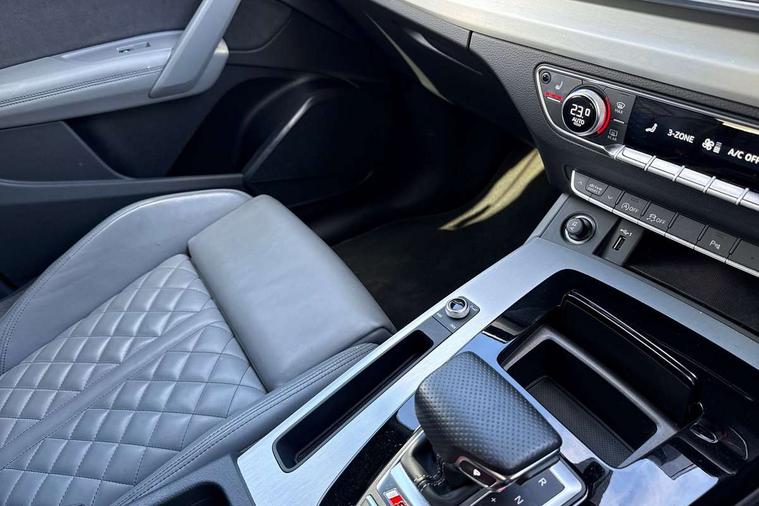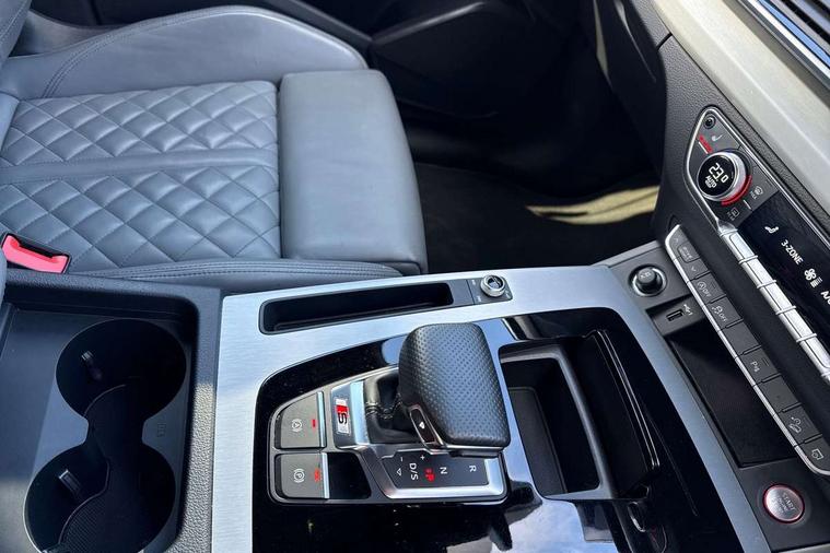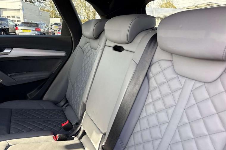 Audi connect safety and service (e-call), Audi connect with Amazon Alexa Integration, Audi drive select, Audi virtual cockpit plus with 12.3" screen and three different layout designs, Audi wireless smartphone interface, Automatic start-stop system with coasting functionality and efficiency programme, Bluetooth interface, Electro - mechanical power assisted steering, MMI navigation plus with 10.1" touch screen, Power tailgate, Reversing camera, Service interval indicator, Voice control system with Audi hotword activation "Hey Audi", 70 litre fuel tank and 24 litre AdBlue tank, Diesel particulate filter, Quattro on demand, S sports suspension, 2 x USB charging port with aux input socket, Audi sound system, DAB Digital radio, Acoustic windscreen, Aluminium roof rails, Audi beam, Audi beam with Audi rings logo, Auto dimming door mirrors, Auto dimming rear view mirror, Automatic headlight adjustment, Automatic headlights and windscreen wipers, Body colour bumpers, Body colour rear diffuser with matt aluminium silver surrounds, Body colour underbody protection, Chrome plated exhaust trims, Daytime running lights, Door sills in Selenite silver, Electric adjustable/heated/folding door mirrors, Front air inlet surrounds in titanium black, Front and rear electric windows, Front radiator grille in honeycomb design, Headlight washers, High gloss black B pillar trims and triangular rear door trim, High level LED brake light, Lower bumpers painted in contrast Manhattan grey, Rear chrome trim strip below lights, Rear privacy glass and rear side windows, Rear side wing doors, Rear wiper, Roof bars, S front and rear bumpers, S Line rear spoiler, S Line side skirts, S specific rear diffuser, 3 rear headrests, 4 way electric lumbar support for driver and front passenger, 40:20:40 split folding 3 rear bench seat in 2nd row with rear centre armrest, Black cloth headlining, Comfort front centre armrest, Contrast stitching on seats, steering wheel and gear lever gaiter, Deluxe 3 zone electronic climate control, Fine Nappa leather upholstery with diamond pattern contrast stitching + front sport seats with S embossed logo, Front/rear floor mats, Fully electrically adjustable seats, Gear lever in black leather, Heated front seats, Height adjustable front head restraints, Height/reach adjustable steering column, Illuminated door sill trims with S logo, ISOFIX child seat mounting and top tether, Luggage compartment cover, Massage function for front seats, Rear seat bench plus, Removable luggage compartment floor, Single front passenger seat, Stainless steel pedals, Sunvisors with vanity mirrors, Extended interior upholstery pack - Q5, High gloss pack - Q5, LED interior light pack - Q5, 3 point seatbelts on all seats, 6 airbags - Driver, front passenger, curtain and side airbags, Electrically operated child locks on rear doors, Electromechanical parking brake, Electronic stabilisation control including ABS, ASR and EDL, Front passenger airbag deactivation, Hill descent control, Hill hold assist, Multi collision brake assist, Pop-up bonnet for pedestrian protection, Pre sense city, Seat belt force limiter, Seatbelt monitoring, Tyre pressure warning, Warning triangle and first aid kit, Anti theft alarm, Anti-theft wheel bolts, Keyless Go access/ignition system, Remote central locking,