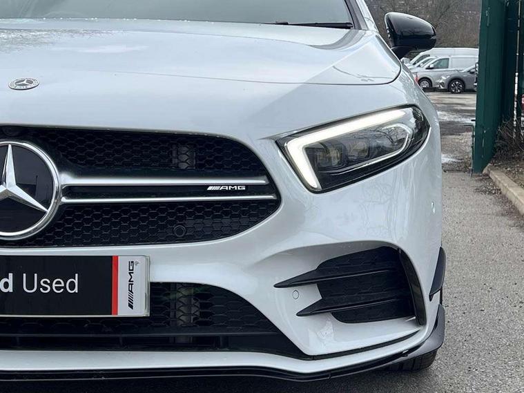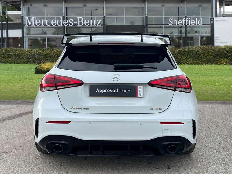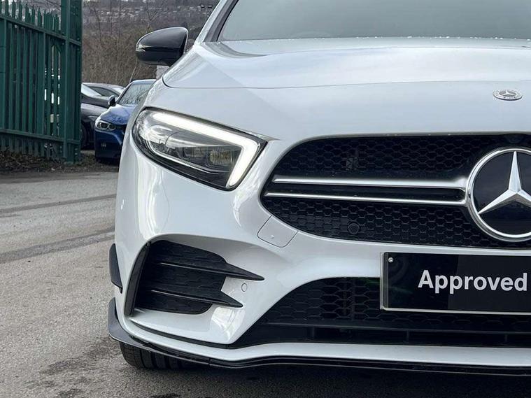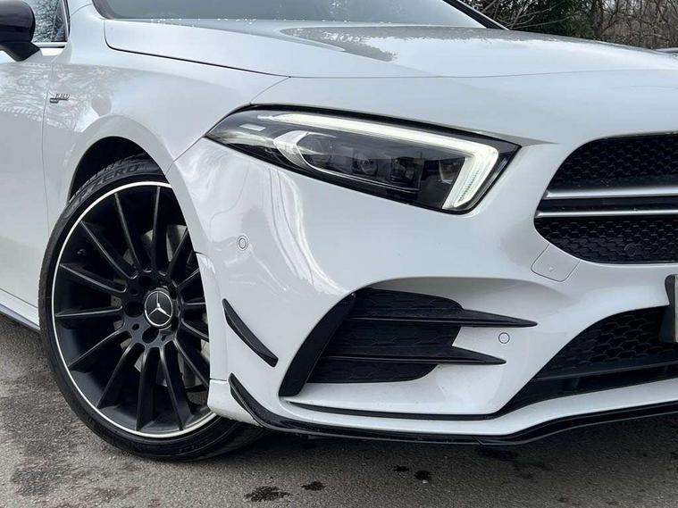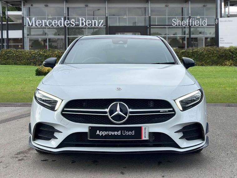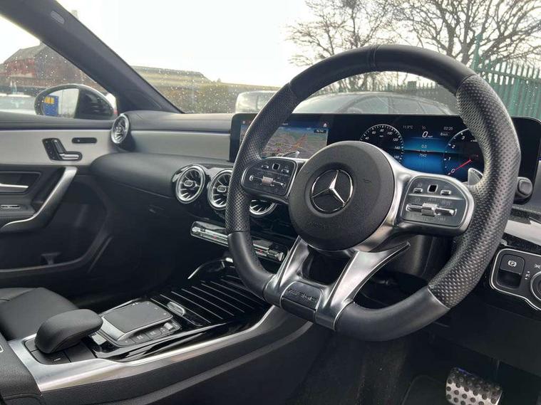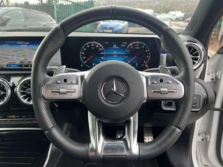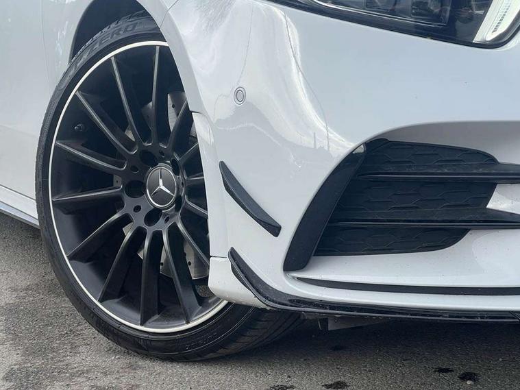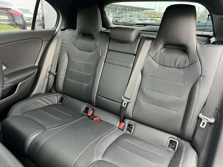 Ultrasonic sensors positioned in the front and rear bumpers, 10.25" Digital instrument cluster display screen, 10.25" media display, 180 degree rear view camera with parking guidelines, Active parking assist with visual and audible warning of detected obstacles, Attention assist, Brake pad wear indicator warning light, Car wash mode, Cruise control + speed limiter, Direct steering, Dual bluetooth interfaces, DYNAMIC SELECT with driving programs (Slippery, Comfort, Sport, Sport+ and Individual), ECO start/stop function, Fluid level warning indicator for fuel, oil, coolant and washer fluid, Hard-disk navigation, Hey Mercedes Voice activation, Lamp failure indicator, Lane keeping system, Mercedes me connect including emergency call system, accident recovery, breakdown management and maintenance, Mercedes me remote services, Outside temperature gauge, Owners manual in English, Pre-installation for car sharing, Preinstallation for Mercedes Benz link, Service indicator (ASSYST), Smartphone integration with Apple CarPlay and Android auto, Speed limit assist, Speed sensitive power steering, Traffic sign assist, Trip computer, AMG performance suspension, Rear axle multi-link, Suspension with adaptive damping system, 2 USB ports (type C) in rear stowage compartment and one in front of center console, 6 speakers, DAB Digital radio, MBUX multimedia system with DAB digital radio and touchpad including satellite navigation, Mercedes-Benz sound system - 100W, 4 Electric Front and Rear windows, Adaptive brake lights, AMG bodystyling - Front apron with splitter in chrome, rear apron with chrome trim and chrome visible trim elements in tailpipe, AMG Front apron with flics as air deflector elements on the outer air intakes, AMG radiator grille with twin blade lamella and AMG Lettering, AMG Rear apron with specific diffuser look with four vertical fins and two round chrome plated tailpipe trim elements with a diameter of 90 mm, AMG spoiler lip on roof, AMG Sports exhaust system with two round tailpipes attached in rear apron, Automatic headlights, Black weather strip, Body colour bumpers, Body colour door handles with chrome inserts, Body colour side skirt, Electric adjustable and heated door mirrors with integrated LED side indicators, Front wings wheel arches with TURBO 4MATIC lettering, Headlamp assist automatic headlamp activation, Heated glass rear windscreen + timer control, LED daytime running lights, LED High level third brake light, LED tail lamp, Multibeam LED headlights with adaptive highbeam assist plus, Panoramic sliding sunroof, Privacy glass, Radio aerial, Rain sensing windscreen wipers with two sensitivity settings, Rear fog lights, Rear side wing doors, Rear wiper, Trim elements on louvres in outer air inlets in high gloss black, Wider wheel arches for AMG wheels, 3 seat bench in 2nd row, 40:20:40 split folding rear seats, AMG Performance steering wheel in nappa leather, Auto Mercedes-Benz child seat recognition sensor, Black air vents with surround in silver chrome, Black roof lining, Brushed stainless steel sports pedals with rubber studs, Controller on centre console with chrome surround, Electrically adjustable front memory seats including lumbar support, Floor mats with AMG lettering, Front centre armrest with storage compartment, Front seat backs luggage nets, Heated front seats, Height/reach adjustable steering column, Illuminated AMG front door sills with changeable cover, Interior lighting - 64 colour Ambient lighting, Interior mirror with reading lamps in black and frameless, ISOFIX and top tether child seat fixing points in two outer rear seats, Rear armrest with 2 cupholders, Rear head restraints, Seat occupancy sensor for front passenger seat, Silver coloured aluminium gear shift paddles on steering wheel, Single front passenger seat, Sports seats with integrated headrests, Stowage compartment in centre console with retractable cover, Sunvisors with illuminated vanity mirrors, Touchpad on center console, Twin front cupholders, Two zone thermotronic luxury automatic climate control, Aerodynamic pack - A Class, AMG night pack - A Class, Light and sight pack - A Class, Mirror package - A Class, Seat comfort pack - A Class, 3 rear 3 point seatbelts, ABS with Brake Assist, Active bonnet, Active brake assist includes forward collision warning system with autonomous braking, Adaptive brake assist with hold function and hill start assist, Black seatbelts, Childproof locks manually operated for rear doors and electrically operated for rear power windows, Crash responsive emergency lighting, Driver and passenger head and side airbags, Drivers knee airbag, Dual stage driver/passenger airbags, Electronic parking brake, ESP curve dynamic assist, ESP with ASR, Front and rear seatbelt reminder, Front brake calipers with AMG lettering, Perforated front brake discs, Tyre pressure monitoring system, Warning triangle and first aid kit, Window airbags, Alarm system/interior protection/immobiliser, Keyless entry lock/unlock, Keyless Go, Remote central locking and crash sensor with emergency opening function, Urban guard vehicle protection system with immobiliser and interior protection, Light aluminium with longitudinal grain interior trim, 19" AMG multi-spoke matt black painted light alloy wheels with high sheen finish, Summer tyres, Tirefit sealant kit,
