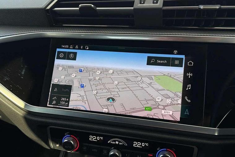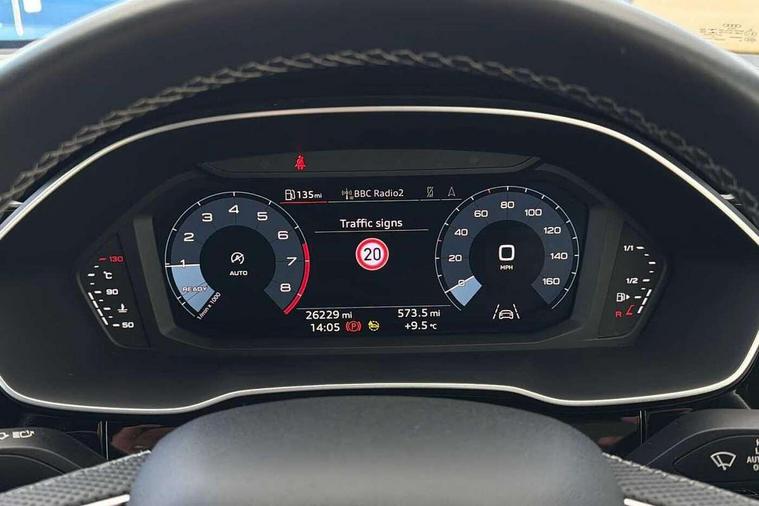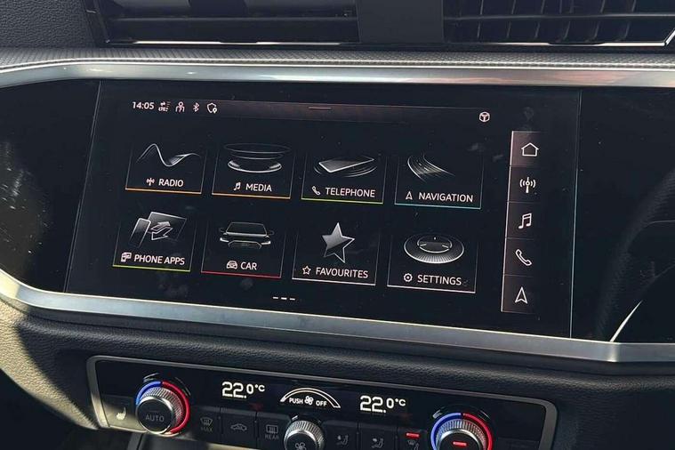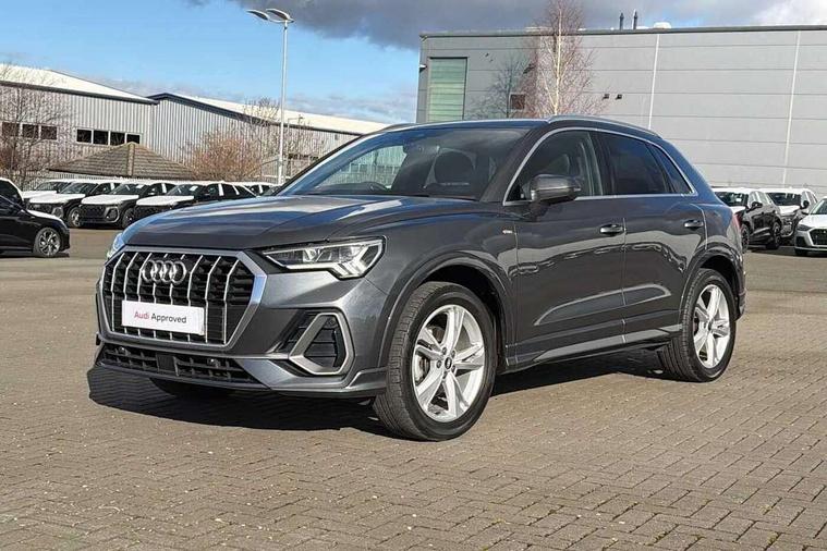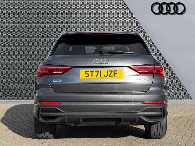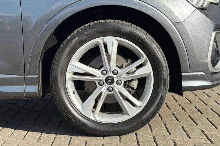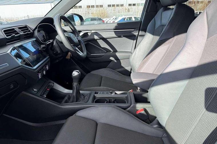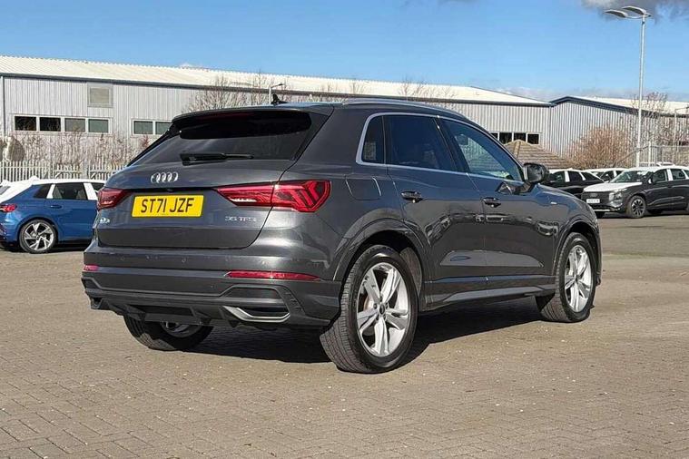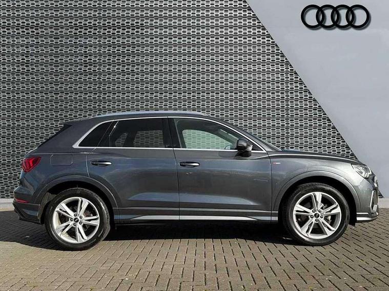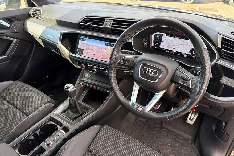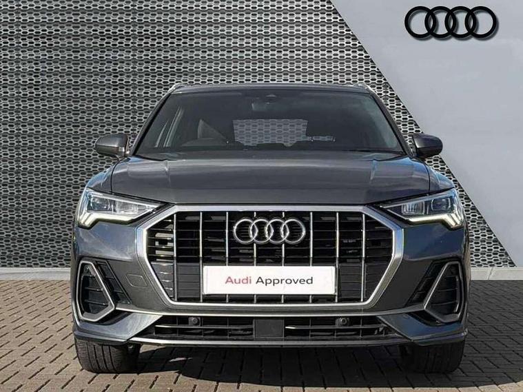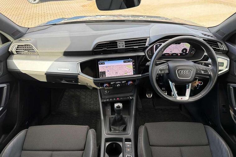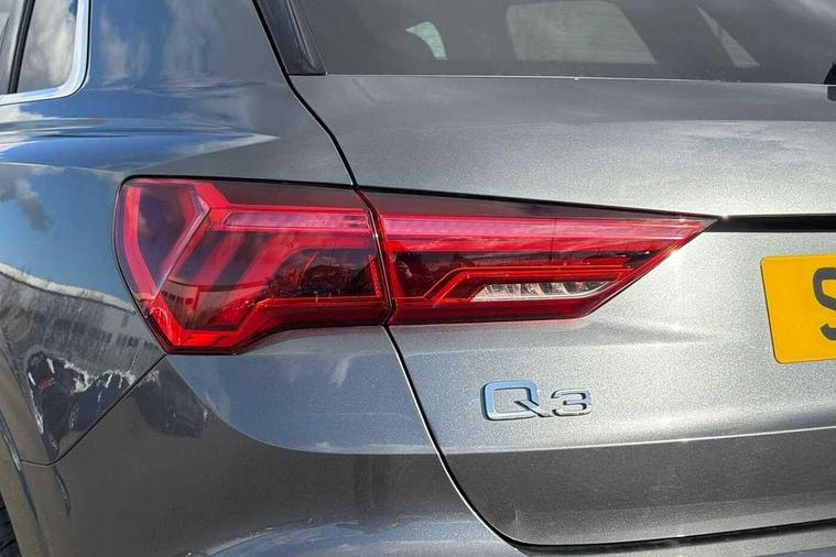 Amazon alexa Integration, Audi connect safety and service (e-call), Audi drive select, Audi lane departure warning, Audi Virtual Cockpit - 10.25" display, Bluetooth interface, Camera based traffic sign recognition, Cruise control + speed limiter, MMI Navigation Plus with high resolution 10.1 inch touchscreen colour display, Power operated tailgate, Progressive steering, Rear parking sensors, Service interval indicator, Smartphone interface includes wireless Apple carplay/Android Auto, Start stop system with recuperation, Voice control system with natural language interaction, Sports suspension, 2 USB-C ports with charge and data functions, 6 passive loudspeakers, DAB digital radio module, Acoustic windscreen, Aluminium roof rails, Aluminium window trim, Auto dimming frameless rear view mirror, Body coloured bumpers, Electrically folding, adjustable and heated door mirrors with integrated LED side indicators and kerb view function for passenger side, Front and rear electric windows, Front fog lights, Front side air inlets in matt platinum grey, Front spoiler blade in matt platinum grey, Grille vertical bars in aluminium silver/Matt, High gloss black finish B and C pillars, LED headlights with LED daytime running lights and dynamic rear indicator, LED rear lights, Privacy glass dark tinted rear and rear-side windows (from B-pillar backwards), Rain and light sensors, Rear diffuser strip in matt titanium black, S line badges on front wings, S Line front and rear bumpers, Side skirt insert in matt Platinium grey, Silver chrome grille surround, Titanium black radiator grille, 12V socket in rear centre console, 40:20:40 folding with manual adjustment for 60:40 forwards/backwards position and backrest angle, Adjustable rear seat bench/backrest with centre armrest and cupholder, Black cloth headlining, Dual zone electronic climate control, Front and rear black floor mats with contrast stitching in rock grey, Front and rear headrests, Front and rear roof module including reading lights, Front centre armrest, Glove compartment lighting, Height and reach adjustable steering wheel, Illuminated door sill trims with S logo, ISOFIX child seat mounting for front passenger with airbag deactivation and outer rear seat including top tether attachment point for outer rear seats, Luggage compartment light, Manual front seats with height adjustment, Perforated leather gearknob, Stainless steel luggage compartment sill finisher, Stainless steel pedals, Non smoking pack - Q3, 3x3 point rear seatbelts, 6 airbags - Driver, front passenger, curtain and side windows, Audi pre-sense front with pedestrain and cyclist recognition, Electrically operated child locks on rear doors, Electromechanical parking brake, Electronic stabilisation control including ABS, ASR and EDL, Hill descent control, Hill hold assist, Pre sense basic, Seatbelt monitoring, Tyre pressure warning, Warning triangle and first aid kit, Anti theft alarm, Anti theft wheel bolts, Remote central locking, Dark matt brushed aluminium inlay, Detail dashboard around MMI touch colour display in glass look, black with surround in aluminium look, Leatherette door armrest,