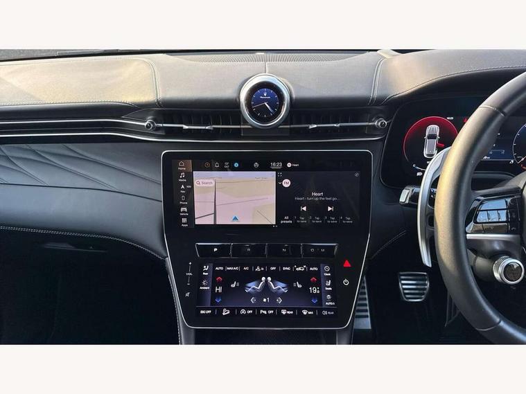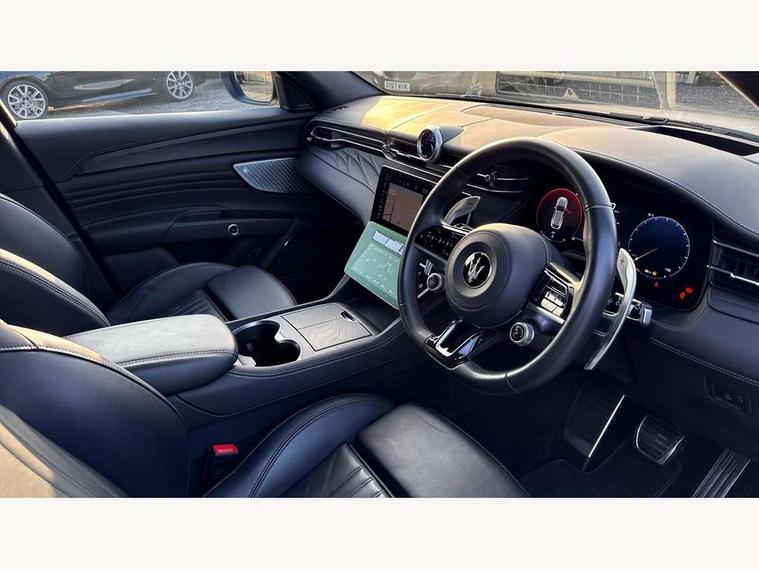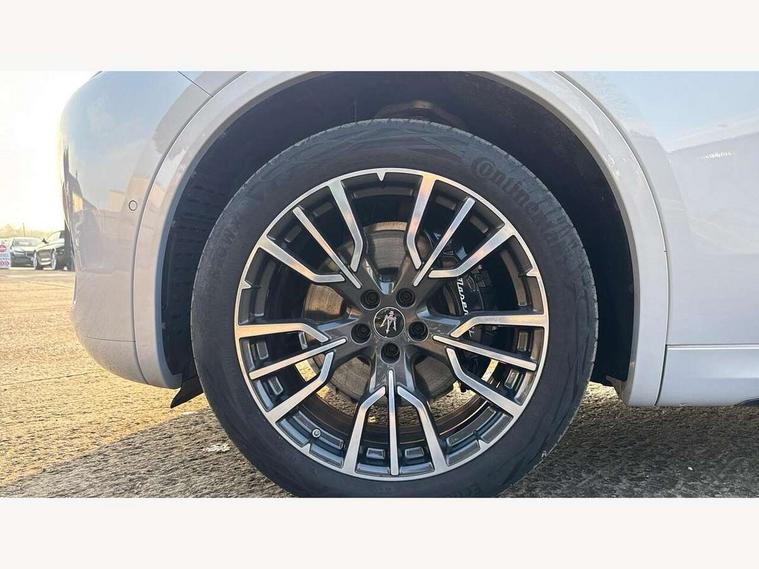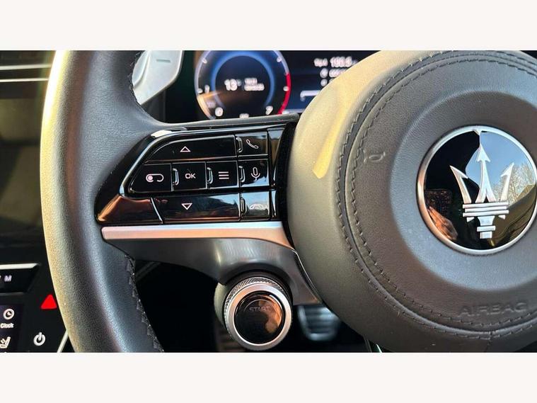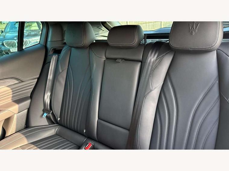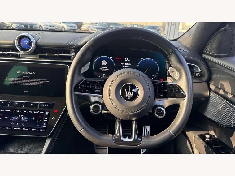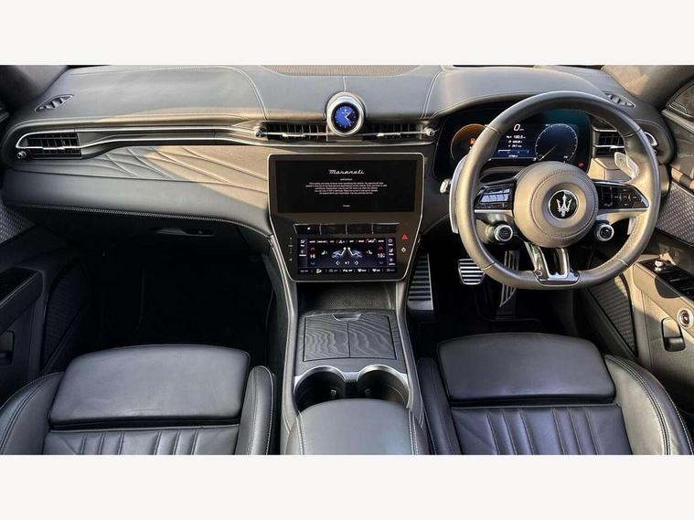 12.3" full TFT digital colour display cluster with onboard computer and driver information, 12.3" HD touch screen central display with Maserati Intelligent Assistant (M.I.A) and satelite navigation, Android Automotive OS, 8.8" multifunction comfort display with smart gestures (controls for front/rear climate, seats, headlights, ambient lighting, clock & air suspension), Apple CarPlay and Android Auto, Bluetooth, Connectivity Services (Europe), Drive mode selector with dedicated drive modes (Comfort, GT, Offroad, Sport), E-call, Electronic Power Steering (EPS), Front and rear parking sensors with rear active braking, Head up Display, Maserati connect, Start and stop engine function, TBM (Telematic Box Module) for Connectivity, Wireless charger, All wheel drive system, Mechanical limited slip differential (M-LSD), Multilink front suspension with semi virtual steering axis and multilink rear suspension with lower control arm, ZF - 8 speed automatic transmission, 4 USB charging port, Digital Audio Broadcast (DAB), Air shutter control, Auto dimming interior frameless mirror, Automatic headlight activation with dusk sensor, Badges in black finish, Black side skirts inserts, Body coloured bumpers, Chrome door handles, Daylight opening (DLO) in black finish, Demist sensor, Front and rear aluminium door sills, Front and rear electric windows with anti-pinch sensor, Front grille with vertical grille bars in piano black finish, Front splitter in black, Heated door mirrors, Heated rear windscreen, Heated windscreen washer nozzles, Infrared (IR) protection windscreen, LED daytime running lights, LED rear fog light, LED tail lights and third stop light, Power folding door mirrors including memory, Puddle lights, Quad tips exhaust system in black finish, Rain sensor, Rear side wing doors, Rear spoiler, Rear wiper, 14 way power front sports seats with driver's side memory fuction, 3 seat bench in 2nd row, 40/20/40 split folding rear seat, Air quality sensor, Ambient lighiting on dashboard and door panels, Brushed stainless steel sports pedals, Driver and passenger sunvisor with mirror and courtesy light, Fabric headlining trim, Front and rear head restraints with embossed Trident logo, Front and rear internal floor mats in velour, Front armrest with 12V power outlet, Heated front seats, Leather multifunction steering wheel in satin chrome with fixed aliminium paddle shifters, Maserati digital smart clock on dashboard, Power height and reach adjustable steering column, Rear armrest with 2 cupholders, Rear seats with ski hatch, Single front passenger seat, Three zone automatic climate control, Two front cup holders, 3x3 point rear seatbelts, Acceleration Slip Regulation (ASR), Antilock Braking System (ABS), Electronic Brake Distribution (EBD) and Motor Slip Regulation (MSR), Advanced brake assist, Automated emergency braking with pedestrian recognition, Child locks on rear doors, Driver and passenger advanced dual stage front airbags, Electronic parking brake, Electronic Stability Control (ESC), Front and rear side curtain airbags, Front seat belts with pre-tensioners and load limiters, rear seat belts with load limiters, Front seat mounted side airbags, Hill descent control, Hill start assist, Integrated vehicle control, Manual passenger airbag deactivation function, Performance braking system - Ventilated brakes: 350mmX28mm with fixed, four piston callipers at front, 330mmX22mm with floating MOC calliper at rear, Tyre pressure monitoring system, Vehicle domain control (VDC), Keyless entry and keyless go function, Perimeter alarm system including volumetric sensing, anti-lift device and electronic immobiliser, Vodafone stolen vehicle recovery with automatic driver recognition and remote inhibition, Wearable key, 3 years premium service plan, Fix and go tyre sealing compound and electric air compressor,