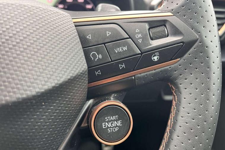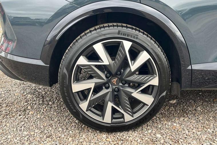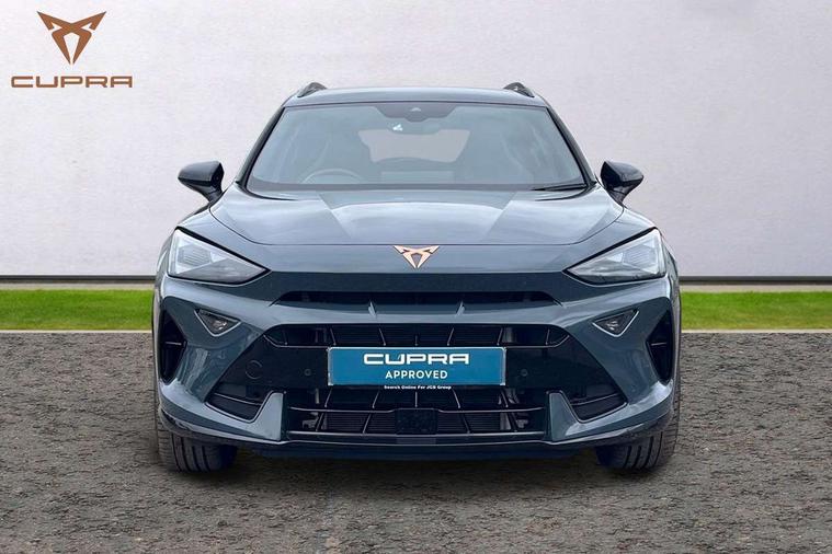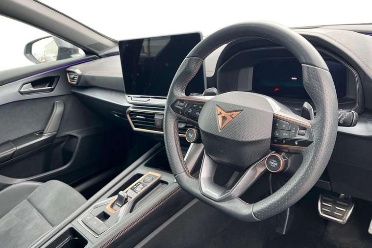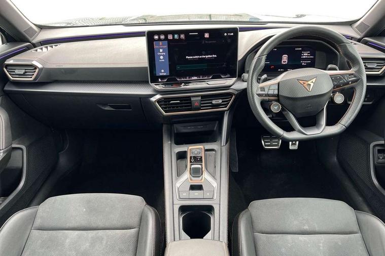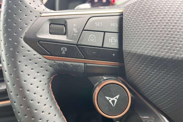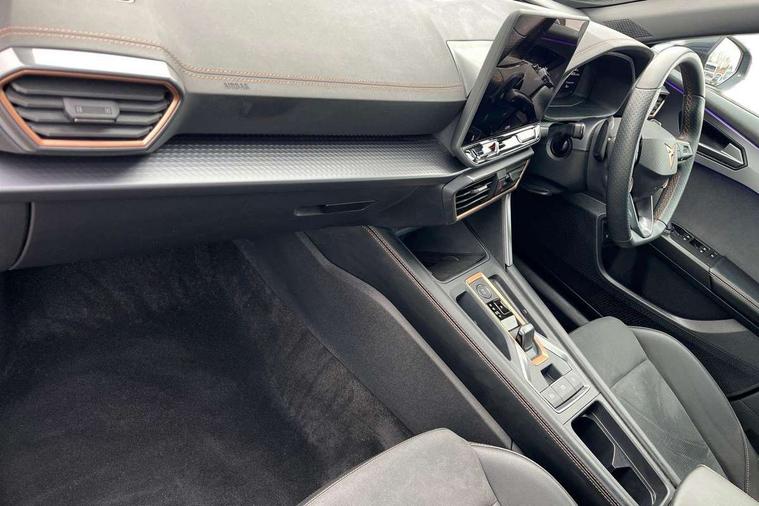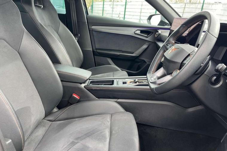10.25" digital cockpit and configurable dashboard, Adaptive cruise control with follow-to-stop and speed limiter, Advanced driver alert system, Driving profile selection, Dynamic road sign display, Emergency steering support with turn assist, Forward collision warning with automatic braking, Front and rear parking sensors, Full link phone integration, Lane assist, Progressive steering, Rear view camera, RPM, trip computer, outside temp gauge, instrument light brightness, low fuel warning light, lights on reminder, gearshift indicator, Service interval indicator, Start/stop system with regenerative braking, Virtual pedal and electric tailgate, Voice control system, Wired Android Auto, Wireless apple carplay, Wireless phone charger, 10 amp mode 2 charging cable, 32 amp mode 3 charging cable, CUPRA sport suspension, Electronic locking differential and dynamic traction support, 2 front and 2 rear USB type C sockets, Media system with navigation, 12.9" touchscreen display, voice control, DAB, steering wheel mounted controls, Auto dimming rear view mirror, Body colour door handles, Body coloured bumpers, Dark grey wing mirror, Daytime running light with automatic headlight control and coming home feature, Door panel ambient lighting, Dynamic headlight range control, Electric front/rear windows, Electrically adjustable heated and folding door mirrors with memory function, Gloss black roof rails and window surrounds, High beam assist, LED 3rd brake light, LED front fog lamps with cornering function, LED Headlights, LED Taillights with dynamic indicator, Rain sensing wipers, Rear diffuser with copper simulated exhaust pipes, Rear fog lights, Rear side wing doors, Rear wash/wipe, Tinted rear windows, Welcome lights (within exterior mirror housing), 12V socket, 2 front and 2 rear reading lights, 3 seat bench in 2nd row, 60/40 split rear bench seat with armrest and mechanical seat release, Black headlining, Black interior roof lining, Cupra sports pedals, Dust/pollen filter, Electrically adjustable driver's seat with memory and lumbar support, Front and rear head restraints, Front centre armrest, Heated front seats, Heated supersports multifunction leather steering wheel with satellite buttons and gear shift paddles, Height/reach adjust steering wheel, Illuminated aluminium doorsteps, Illuminated interior front door sills, Illuminated sunvisor with mirror, Isofix, Leather dashboard, door insert and side trim panel, LED smart wraparound lighting, PVC/Dinamica microfiber upholstery + bucket seats, Satellite steering wheel, Single front passenger seat, Storage pockets on rear of front seats, Three zone climate control with control panel in rear, 3 point seatbelts on all rear seats, ABS, Brake control system - ESC and brake booster, Child proof door locks, Driver and front passenger airbags with front passenger airbag de-activation, Electronic parking brake, Front and rear disc brakes, Front side curtain airbags, Hill hold control, Public e-call, Seat belt reminder for front and rear seats, Tyre pressure monitoring system, Anti theft alarm system, KESSY Advanced - Keyless start, keyless entry with SAFELOCK, Locking wheel bolts, Copper and aluminium interior detailing, 19" Sandstorm machined sport black and silver alloy wheels, Breakdown and tool kit,