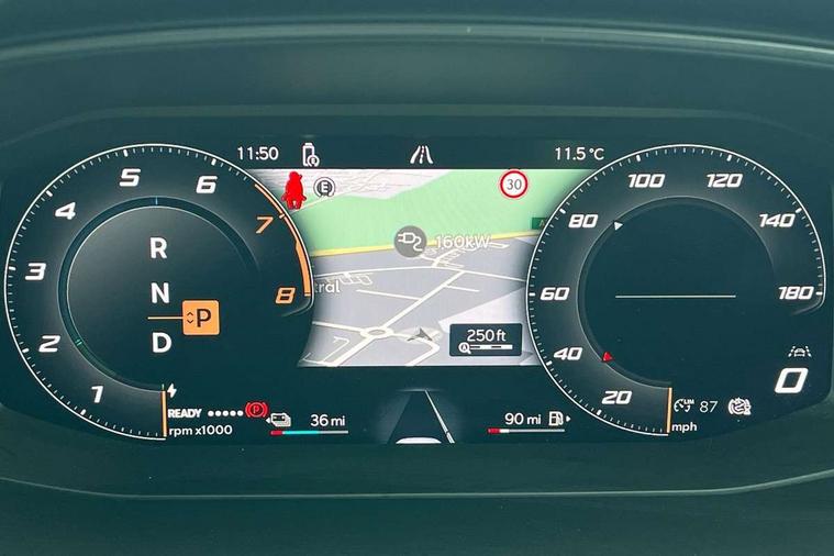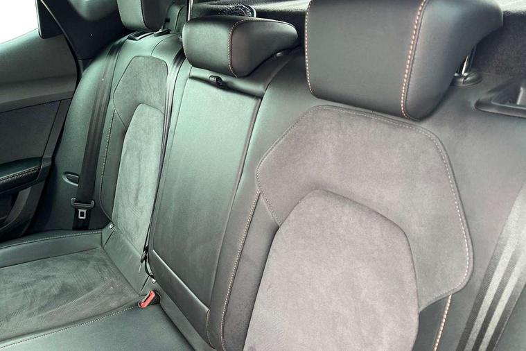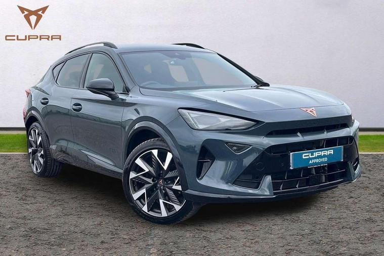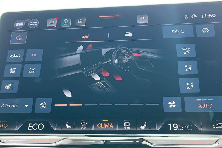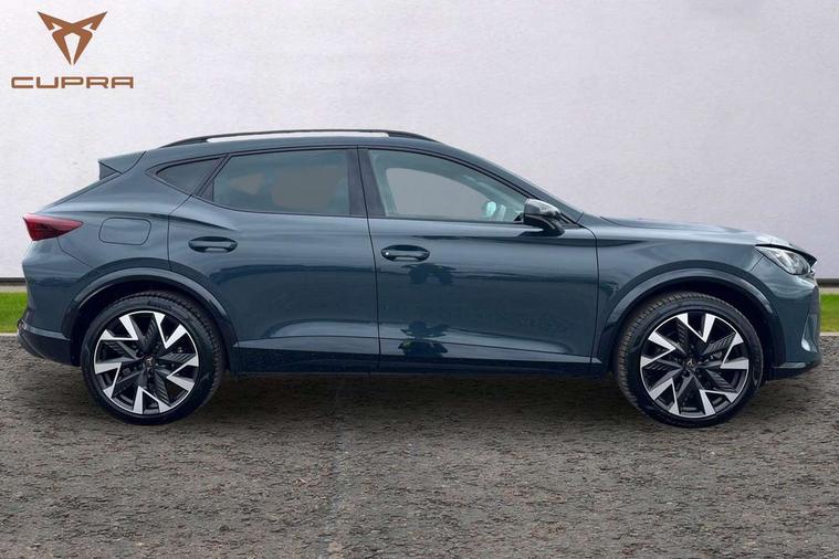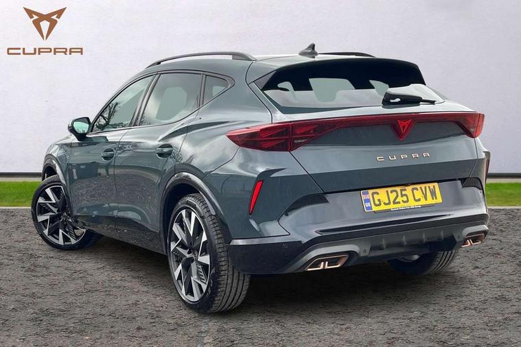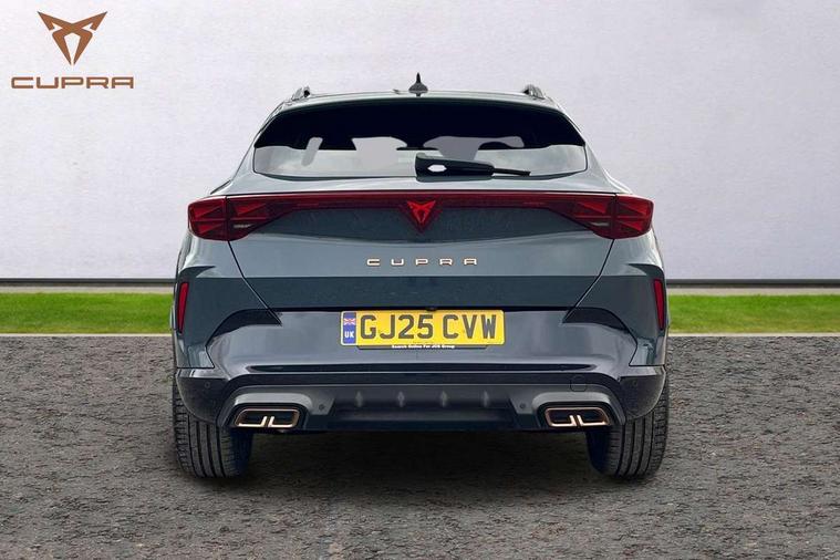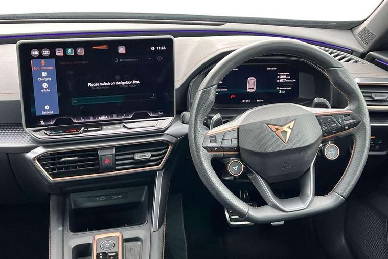 10.25" digital cockpit and configurable dashboard, Adaptive cruise control with follow-to-stop and speed limiter, Advanced driver alert system, Driving profile selection, Dynamic road sign display, Emergency steering support with turn assist, Forward collision warning with automatic braking, Front and rear parking sensors, Full link phone integration, Lane assist, Progressive steering, Rear view camera, RPM, trip computer, outside temp gauge, instrument light brightness, low fuel warning light, lights on reminder, gearshift indicator, Service interval indicator, Start/stop system with regenerative braking, Virtual pedal and electric tailgate, Voice control system, Wired Android Auto, Wireless apple carplay, Wireless phone charger, 10 amp mode 2 charging cable, 32 amp mode 3 charging cable, CUPRA sport suspension, Electronic locking differential and dynamic traction support, 2 front and 2 rear USB type C sockets, Media system with navigation, 12.9" touchscreen display, voice control, DAB, steering wheel mounted controls, Auto dimming rear view mirror, Body colour door handles, Body coloured bumpers, Dark grey wing mirror, Daytime running light with automatic headlight control and coming home feature, Door panel ambient lighting, Dynamic headlight range control, Electric front/rear windows, Electrically adjustable heated and folding door mirrors with memory function, Gloss black roof rails and window surrounds, High beam assist, LED 3rd brake light, LED front fog lamps with cornering function, LED Headlights, LED Taillights with dynamic indicator, Rain sensing wipers, Rear diffuser with copper simulated exhaust pipes, Rear fog lights, Rear side wing doors, Rear wash/wipe, Tinted rear windows, Welcome lights (within exterior mirror housing), 12V socket, 2 front and 2 rear reading lights, 3 seat bench in 2nd row, 60/40 split rear bench seat with armrest and mechanical seat release, Black headlining, Black interior roof lining, Cupra sports pedals, Dust/pollen filter, Electrically adjustable driver's seat with memory and lumbar support, Front and rear head restraints, Front centre armrest, Heated front seats, Heated supersports multifunction leather steering wheel with satellite buttons and gear shift paddles, Height/reach adjust steering wheel, Illuminated aluminium doorsteps, Illuminated interior front door sills, Illuminated sunvisor with mirror, Isofix, Leather dashboard, door insert and side trim panel, LED smart wraparound lighting, PVC/Dinamica microfiber upholstery + bucket seats, Satellite steering wheel, Single front passenger seat, Storage pockets on rear of front seats, Three zone climate control with control panel in rear, 3 point seatbelts on all rear seats, ABS, Brake control system - ESC and brake booster, Child proof door locks, Driver and front passenger airbags with front passenger airbag de-activation, Electronic parking brake, Front and rear disc brakes, Front side curtain airbags, Hill hold control, Public e-call, Seat belt reminder for front and rear seats, Tyre pressure monitoring system, Anti theft alarm system, KESSY Advanced - Keyless start, keyless entry with SAFELOCK, Locking wheel bolts, Copper and aluminium interior detailing, 19" Sandstorm machined sport black and silver alloy wheels, Breakdown and tool kit,