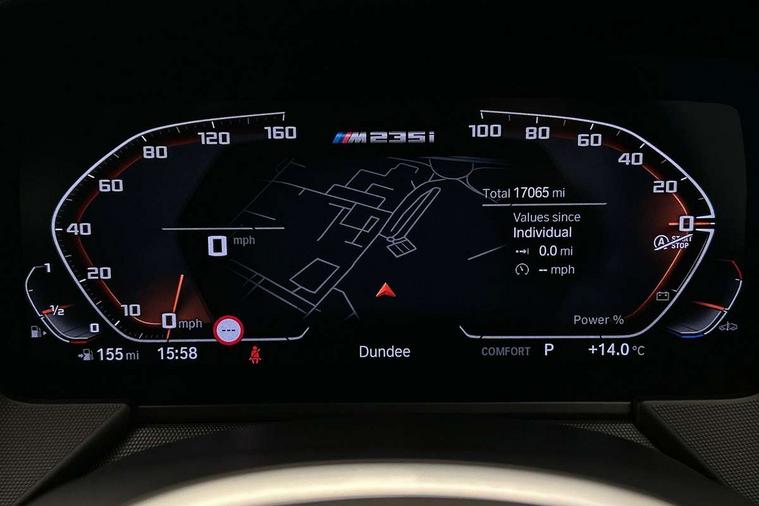 Active guard plus, Attentiveness assist, Auto start-stop, BMW ConnectedDrive online services, BMW Intelligent Personal Assistant, BMW Live Cockpit Professional with 10.25" high resolution instrument and control display, BMW Online services, BMW operating system with 7.0 mid interface, BMW Teleservices, Check Control warning system for monitoring of lights and door/luggage compartment open warning, Cruise control with braking function, Electro hydraulically controlled multi plate clutch in rear axle, Energy efficient operating strategy, iDrive controller with 7 short cut favourite buttons on centre console, Integrated navigation data with map data via USB +features such as 3D landmarks and micro city models, Integrated owners handbook, Intelligent voice assistant, Lane departure warning system, M Sport steering with M235i xDrive M performance specific settings, On board computer - average speed+fuel consumption, service interval, clock/date, odometer/trip meter, outside temperature display and ice warning, Optimum shift indicator, Personal Profile, Pull away assistant, Speed limiting function, 2 balance shafts, 8 speed sport automatic transmission with electronic selector lever, auto P function, coasting idle, race track, sport, gearchange display manual mode, Aluminium lightweight construction, BMW TwinPower twin-scroll Turbo four-cylinder petrol engine, Double VANOS, Drive performance control with ECO PRO comfort + sport mode, Electronic differential lock, Engine cover with M performance designation, High precision injection, Larger fuel tank capacity (50 litres), Launch control, M235i specific heavily de-throttled engine intake air guide, M235i specific high-performance cooling package, M235i specific larger turbocharger with integrated divert-air valve, Performance Control, Petrol Particulate Filter, Power transmission of front wheel drive on the rear axle via angle transmission on the front axle differential and two part cardan shaft, VALVETRONIC engine management, Variable, stepless and infinitely adjustable distribution of drive torque between the front and rear axles, xDrive intelligent all wheel drive with M235i specific reinforced components, 2x USB Type C ports (for charging and data transfer), 4G LTE Connectivity with hard wied 4G network sim card, DAB digital radio, MP3 players and RDS double tuner, Auto wipers, Automatically dimming rear view mirror, Body colour door handles, Direction indicator side lights integrated exterior mirrors, Electric windows - front and rear, with open/close fingertip control and trap release, Exterior mirrors - electrically folding with anti-dazzle, Fading support, Follow me home headlights, Front and rear bumper system with replaceable deformation elements, Front door sill finishers in black plastic with M235i designation, Heated, electrically adjustable exterior mirror aspheric on driver side, convex on passenger side, High gloss black B pillar finish, High gloss shadow line exterior trim, High level third brake light, LED daytime running lights, Lightweight engineering, M Performance exhaust system with valve control and minimised exhaust back pressure, M rear spoiler, Model designation on right side of tailgate includes xDrive designation onleft handside for M235i xDrive, Preparation for high beam assistant, Rain sensor with automatic headlight activation, Rear boot, Rear fog lights, Rear side wing doors, Reinforced crank drive, new pistons and adapted con rods, Reversing light in rear light cluster, Welcome lighting, 12V power socket in centre console, 2 cupholders in front centre console, 3 rear seat head restraints, 3 rear seats, 3 spoke M sports design leather steering wheel finished in nappa leather with specific M badge, Additional under floor storage in luggage compartment, Anthracite finished floor mats with contrasting surround, Anthracite headlining, Automatic two zone climate control air conditioning, Child seat ISOFIX attachment for two outer rear seats and front passenger seat with anchorage points, Conditioned based service, Driver and front passenger seat heating, Front and rear door pockets including bottle trays, Front and rear side armrests integrated into door trim, Front armrest foldable with integrated storage compartment, Front centre interior light over interior mirror and rear centre automatic interior light when door is opened/ignition switched off or via remote key, Front head restraints, Front M Sport seats, Front passenger seat, Glove compartment, Glovebox with light, Luggage compartment lighting, Manually adjustment steering wheel column, Multi-function controls for steering wheel, Shift-by-wire selector shift, Steering wheel paddles, Sun visors with vanity mirrors and insert tab, Through loading system with 40/20/40 split folding rear seat, Two lashing eyes, Additional interior lighting pack - 2 Series Gran Coupe, Connected pack professional - 2 Series Gran Coupe, Extended storage pack - 2 Series Gran Coupe, M Sport exterior styling aerodynamics pack - 2 Series Gran Coupe 235i, 2 tone horn, Airbag - Front driver and passenger, front and rear head, front side, curtain head protection, manual deactivation of front passenger airbag possible, Anti lock braking system (ABS) with cornering brake control, BMW emergency call, Brake drying, Braking readiness, City braking function, Crash sensor activating of airbags, Unlocking doors, hazard warning lights, interior light, safety battery terminal, Dynamic stability control + (DSC+), Dynamic Traction Control - DTC, Electrically operated hand brake, Integrated torsen mechanical limited slip differential on front axle, M Sport braking system in blue high gloss + blue painted brake calipers with M designation, M sport seatbelt, Rear brake discs, Rear child proof door locks, Seat belt security check for driver and front passenger, Seatbelt warning, Side impact protection, Three point seat belts on all seats including front belt stopper, pyrotechnic belt tensioners and belt forc