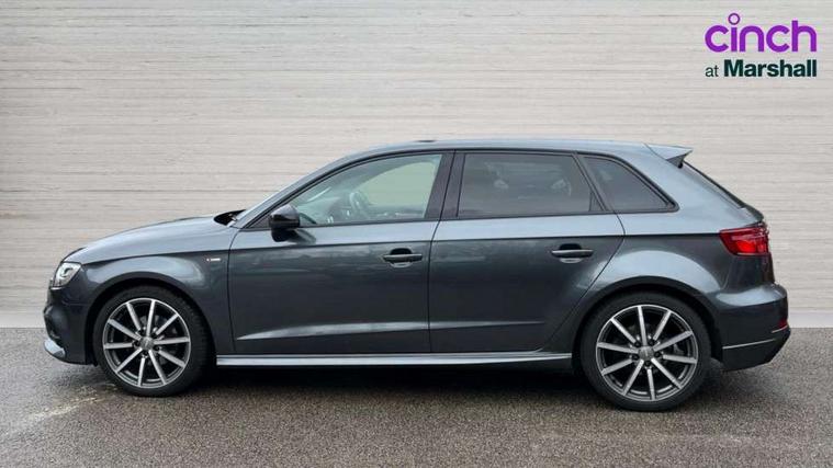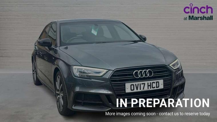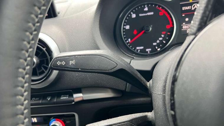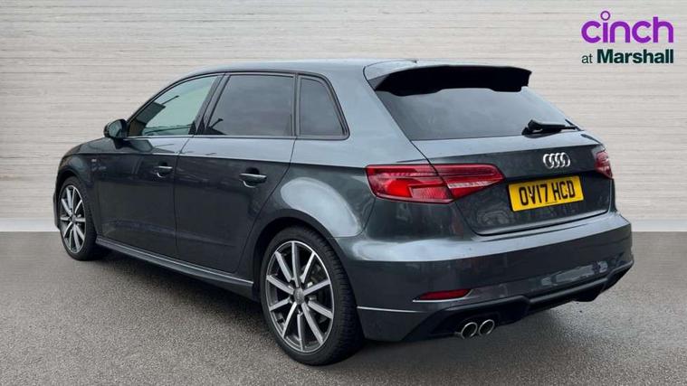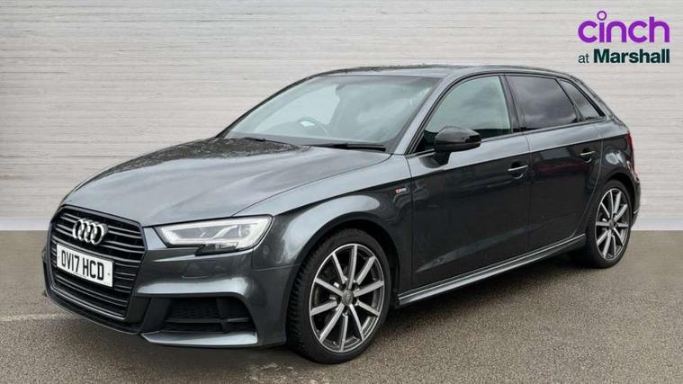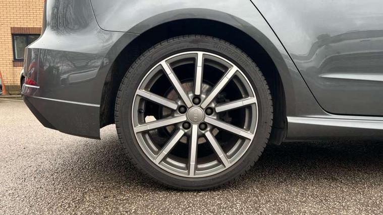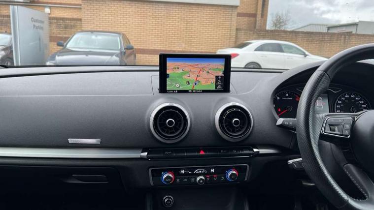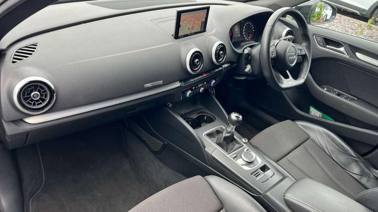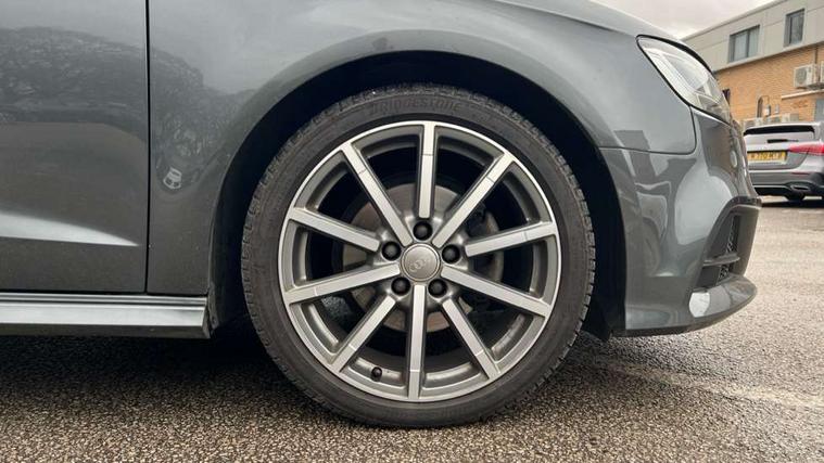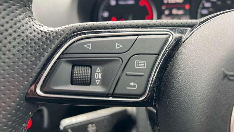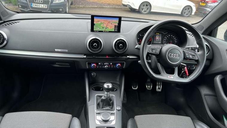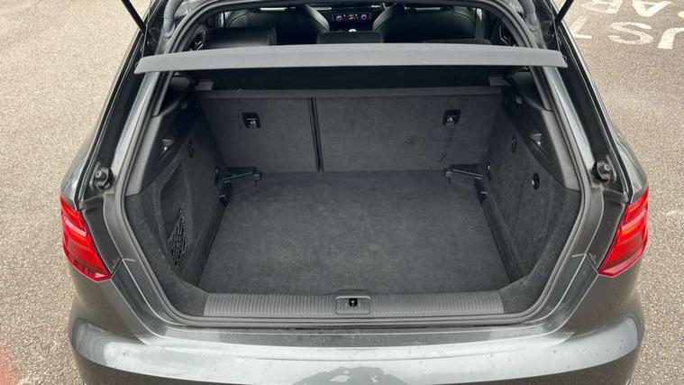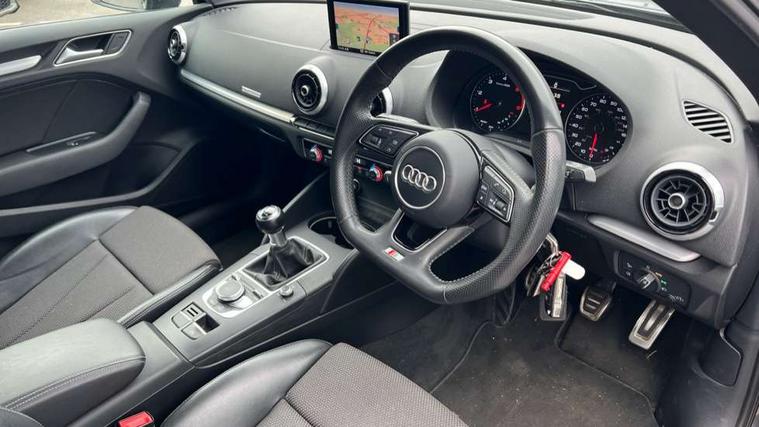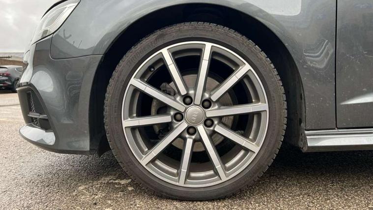 Audi connect, Audi drive select, Audi smartphone interface, Colour driver's information system display, Mobile telephone preparation - bluetooth interface, Service interval indicator, Speed limit display, Voice control system, Diesel particulate filter, 2 USB ports, Audi music interface, Auxiliary input socket, DAB Digital radio, Black door mirrors, Black window surrounds, Body colour bumpers with black insert, Body colour roof spoiler, Chrome exhaust tailpipes, Electric front windows, Electric operated/heated door mirrors, Electric rear windows, Heated windscreen washer jets, LED daytime running lights, Matt black radiator grille, Privacy glass, Rear wiper, S Line body styling, Sport specific side air inlet grille and diffuser insert, 3 adjustable rear headrests, 3 spoke flat bottomed multi-function leather steering wheel, 4 lashing points to secure luggage, Adjustable front armrest, Black cloth headlining, Dual zone electronic climate control, Front and rear interior lights with delay, Front passenger seat isofix location point, Front/rear floor mats, Height/depth adjustable steering column, Illuminated glovebox, ISOFIX child seat preparation+airbag deactivation, Jack and tool kit, Stainless steel pedals, Storage compartment in centre console, Storage compartment under front seats, Storage compartments in doors, Black styling pack - A3/S3, LED interior light pack - A3/RS3, Light and rain sensor pack - A3 Hatchback/Sportback, Storage and luggage pack - A3/RS3, 3 point seatbelts on all seats, ABS/EBD, Active bonnet, Active front headrests, ASR, Curtain airbags, Driver and passenger side airbags, Driver/Front Passenger airbags, Drivers knee airbag, EDL, Electromechanical parking brake, ESC - Electronic Stability Control + traction control, Front passenger airbag deactivation, Manual rear child locks, Multi-Collision braking, Seatbelt warning, Tyre pressure monitor, Warning triangle and first aid kit, Anti theft alarm, Anti-theft wheel bolts, Remote control central locking, Thatcham category 1 alarm + immobiliser, Aluminium air vent surrounds, Aluminium trim elements, 18" 10 spoke design alloy wheels in matt titanium look with diamond cut finish, Space saver spare wheel,