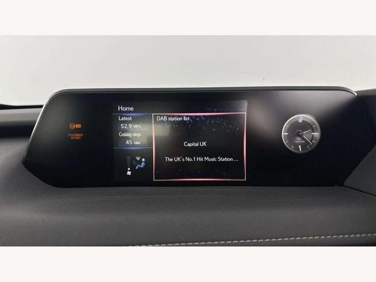 4 driving modes EV/Eco/Normal/Sport, 7" Lexus media display, 7" TFT instrument cluster, Analogue clock with GPS function, Apple car play/Android Auto, Compatible mobile phone bluetooth with audio streaming, E-call, Electric power steering (EPS) with speed sensitive features, Lane change flasher function, Lexus link connected services, Lexus safety systems + includes dynamic radar cruise control, pre collision system day and night, lane tracing assist, road sign assist, Push button start, Remote touch interface, Trip computer, Vehicle Dynamics Integrated Management (VDIM), Vehicle Stability Control (VSC), 2 front USB and 2 rear USB charging points, 6 speakers, AM/FM and DAB radio, AUX socket with VTR compatibility, CD player, Acoustic windscreen, Aero stabilising arch mouldings, Aero stabilising rear lights, Aero ventilated wheels, Bi-LED (low and high beam) headlights with Auto High Beam (AHB), Black roof drip mouldings, Black wheel arches, Body adhesive, laser screw welding and laser brazed roof structure, Body coloured bumpers, Electric adjustable/heated door mirrors, Front and rear one touch power windows, with anti-jam protection, Headlight cleaners, LED daytime running lights, LED tail lights, LED third brake light, Light green UV glass, Rain sensor windscreen wipers, Rear side wing doors, Rear wiper, Shark fin roof aerial, Single hidden exhaust pipe, Towing preparation, Variable front intermittent wipers, 12V accessory port centre console and luggage compartment, 2 cup holders in the front and rear centre console, 2 x folding shopping bag hooks in boot, 2 x sun visors with vanity mirror and lamp, 3 seat bench in 2nd row, 4 x tie down hooks in the boot, 5 headrests, 6 way driver and passenger manually adjustable front seats, 60/40 split folding rear seat, Card holder installed in driver and passengers sun visors, Centre armrest with storage, Driver and passenger door pocket, Dual zone electronic climate control + Nano-E humidity sensor, Glovebox, Illuminated entry system, Leather gear lever, Leather steering wheel, LED interior illumination, Map pockets in the rear of passenger's front seat, Premium fabric upholstery, Rear air vents with 2 USB chargers, Rear armrest with 2 cupholders, Single passenger seat, Storage tray under audio panel, Textile carpet mats, Tilt/reach adjustable steering column, Under deck storage, Under desk side storage, 2 x Isofix child rear seat restraints, 3x3 point rear seatbelts, Anti-lock braking system (ABS), BAS (Brake Assist System), Driver and front passenger 2 stage airbag, Driver and front passenger knee airbag, Driver/front passenger side airbags, EBD - Electronic brakeforce distribution, ECB (Electronically Controlled Brake System), Electric child locks, Electric parking brake, Front adjustable seatbelt anchor points, Front and rear curtain shield airbags, Front outer seatbelt+pre-tensioners, force limiter+tension reduction: 3-point with active safety link to PCS, Hill start assist control (HAC), Passenger airbag cut-off device, Rear outer seatbelt+pre-tensioners, force limiter+tension reduction: 3-point with active safety link to PCS, Centre belt w/o pre tensioner+force limiter, Secondary Collision Brake (SCB), TRC (Traction Control), Tyre pressure warning, 2 x remote key fobs, Anti theft system : Alarm instruction sensor, glass breakage sensor and engine immobiliser, Locking wheel nuts, Remote central door locking, Speed sensitive auto door locking, Two motion door lock with double lock, VIN Window etching, 17" Alloy wheels, Tyre repair kit,