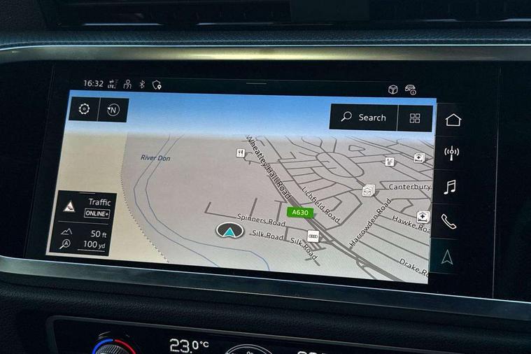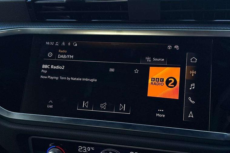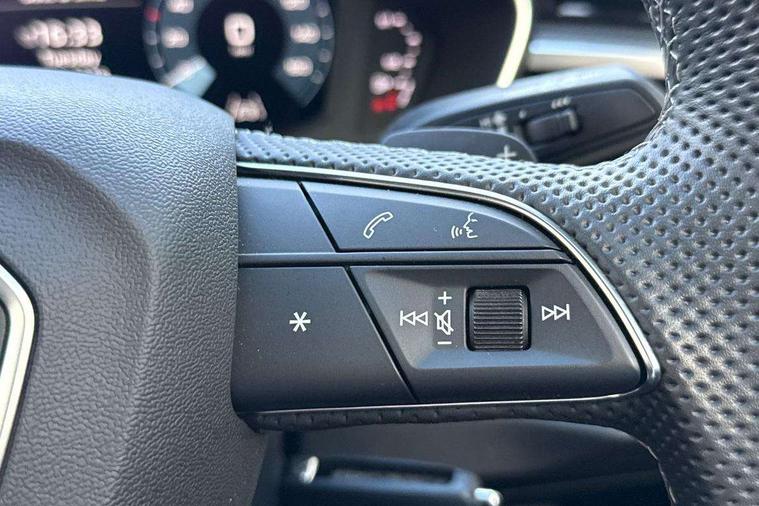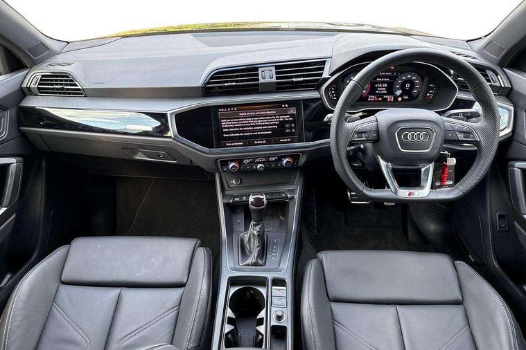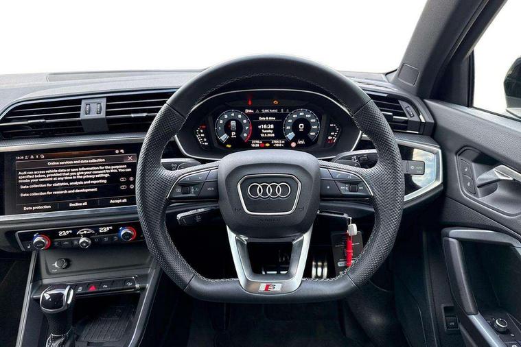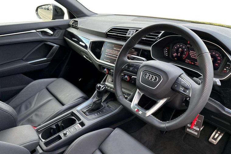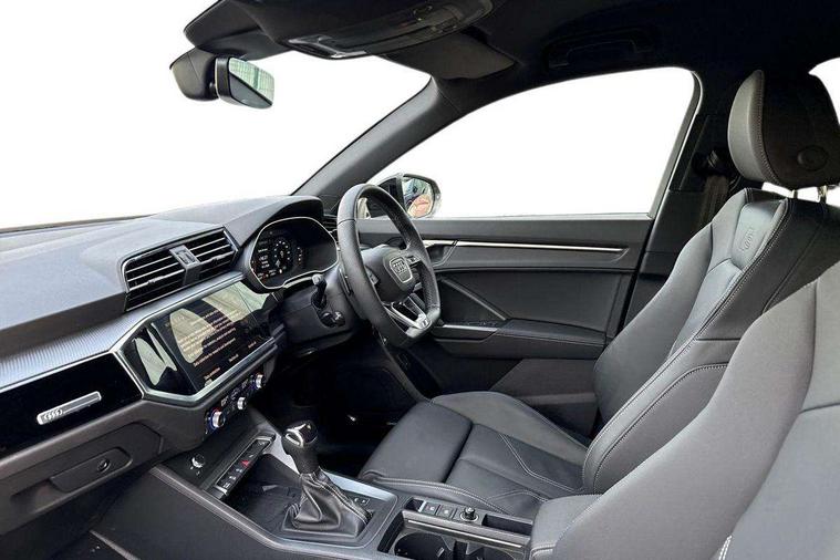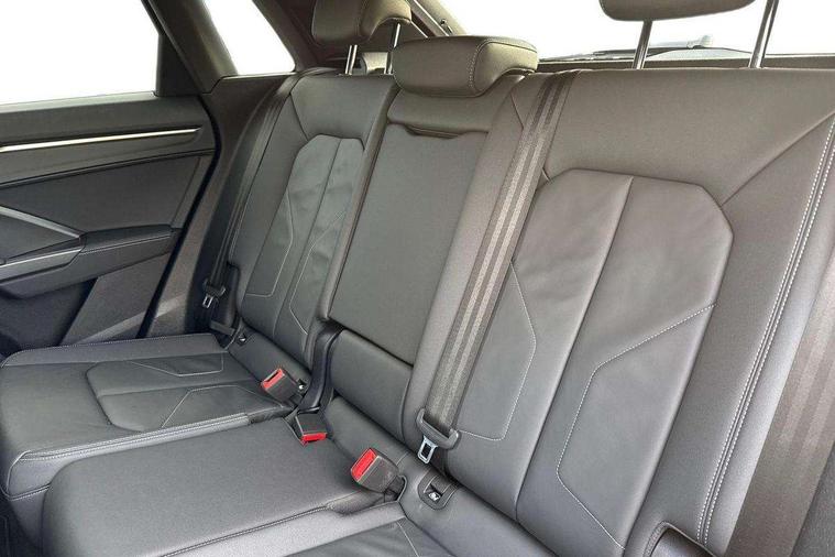 Amazon alexa Integration, Audi connect safety and service, Audi drive select, Audi lane departure warning, Audi Virtual Cockpit - 10.25" display, Bluetooth interface, Camera based traffic sign recognition, Distraction and Fatigue warning, Legal emergency call, MMI Navigation Plus with high resolution 10.1 inch touchscreen colour display, Power operated tailgate, Progressive steering, Service interval indicator, Smartphone interface includes wireless Apple carplay/Android Auto, Start stop system with recuperation, Voice control system with natural language interaction, Sports suspension, 2 USB-C ports with charge and data functions, 6 passive loudspeakers, DAB digital radio module, Acoustic windscreen, Anthracite black radiator grille, Audi Beam uses LEDs to project the Audi logo onto the ground as you exit your Q3, Auto dimming door mirrors, Auto dimming frameless rear view mirror, Black roof rails, Electrically folding, adjustable and heated door mirrors with integrated LED side indicators and kerb view function for passenger side, Front and rear electric windows, Front fog lights, Grille vertical bars in aluminium silver/Matt, High gloss black finish B and C pillars, LED Dynamic rear indicators, LED headlights with LED daytime running lights, LED rear lights, LED third brake light, Privacy glass dark tinted rear and rear-side windows (from B-pillar backwards), Rain and light sensors, Rear diffuser grille in grained matt black, Rear diffuser strip in matt anthracite black, Rear side wing doors, Rear wiper, S line bumpers in contrasting Manhattan grey, Variable front intermittent wipers, 12V socket in rear centre console, 3 seat bench in 2nd row, 40:20:40 folding with manual adjustment for 60:40 forwards/backwards position and backrest angle, Adjustable rear seat bench/backrest with centre armrest and cupholder, Black carpet mats, Black cloth headlining, Dual zone electronic climate control, Electric lumbar support, Front and rear black floor mats with contrast stitching in rock grey, Front and rear headrests, Front centre armrest, Height and reach adjustable steering wheel, Illuminated door sill trims with S logo, ISOFIX child seat mounting for front passenger with airbag deactivation and outer rear seat including top tether attachment point for outer rear seats, Luggage compartment sill protection in stainless steel, Manual front seats with height adjustment, Perforated leather gearknob, Single front passenger seat, Stainless steel pedals, Twin leather upholstery with front sport seats + S embossing, Black styling pack - Q3, Non smoking pack - Q3, 3x3 point rear seatbelts, 6 airbags - Driver, front passenger, curtain and side windows, Audi pre-sense front with pedestrain and cyclist recognition, Electrically operated child locks on rear doors, Electromechanical parking brake, Electronic stabilisation control including ABS, ASR and EDL, Front seatbelt reminder, Hill descent control, Hill hold assist, Pre sense basic, Seatbelt monitoring, Tyre pressure warning, Warning triangle and first aid kit, Anti theft wheel bolts, Immobiliser, Remote central locking, Thatcham approved category 1 anti theft alarm, Aluminium look interior elements, Detail dashboard around MMI touch colour display in glass look, black with surround in aluminium look, Leatherette door armrest, Piano black inlay,