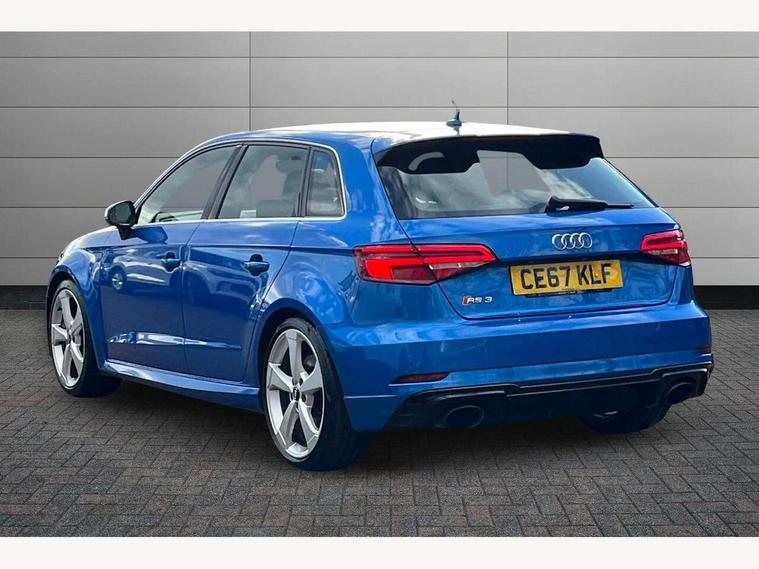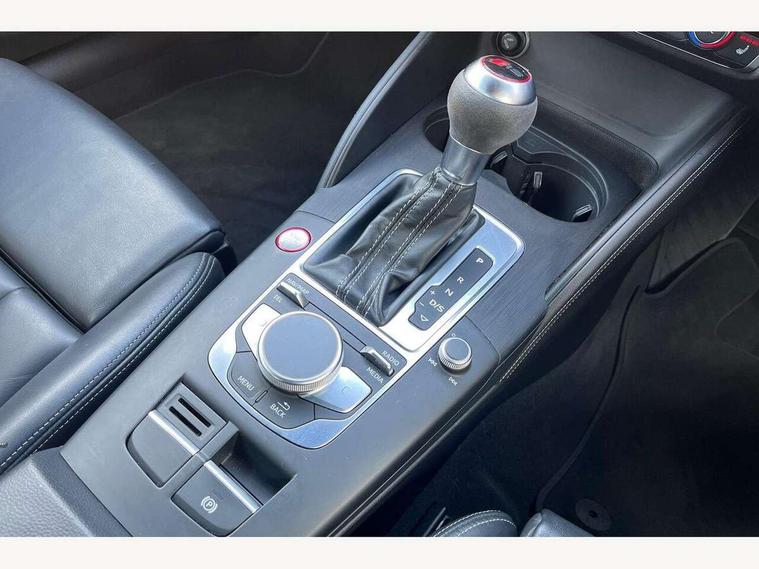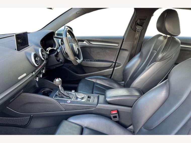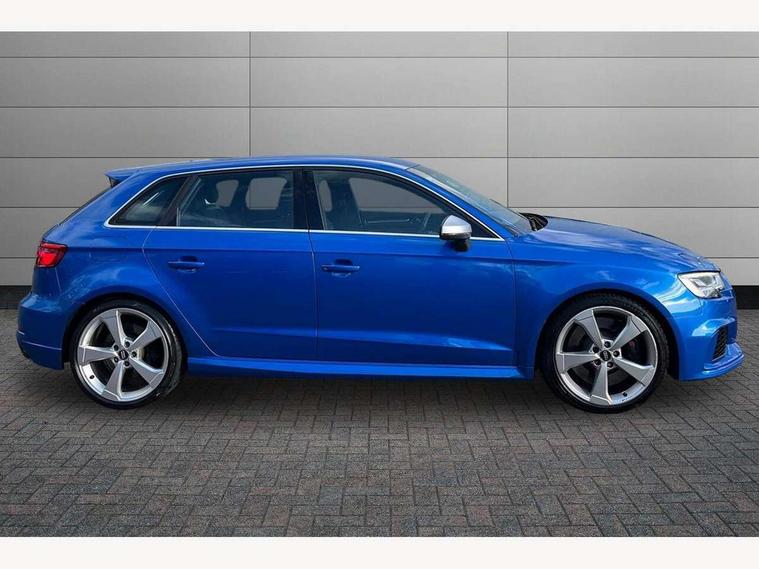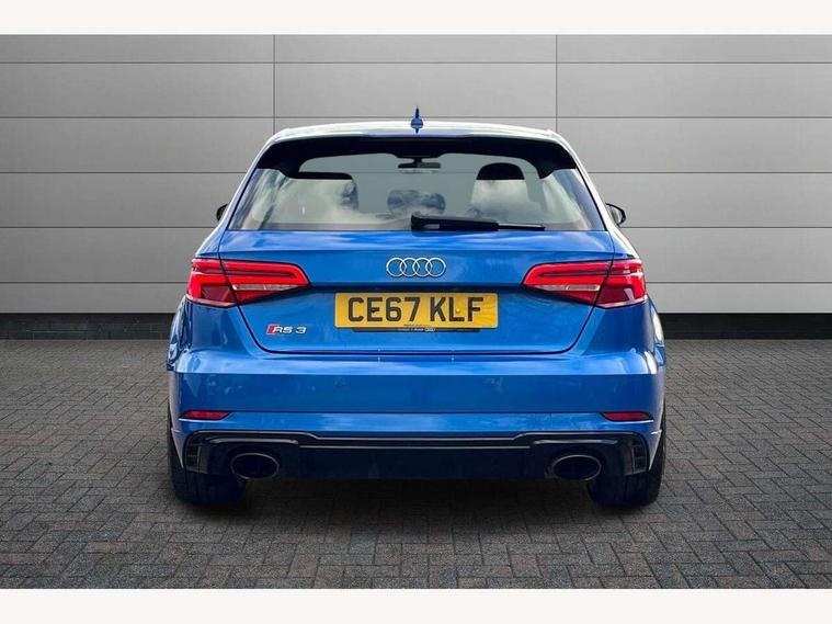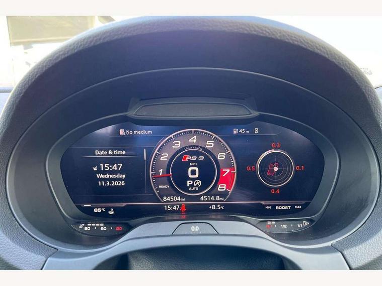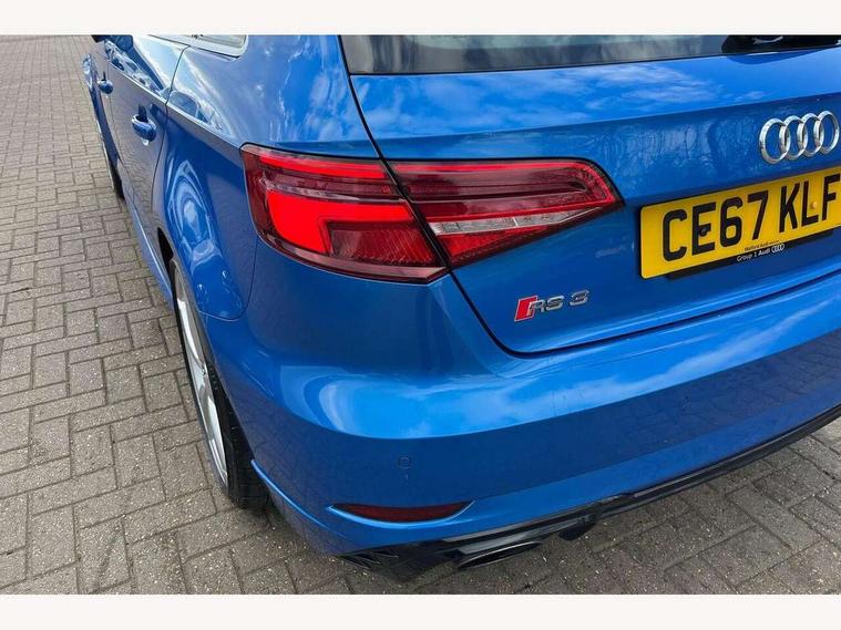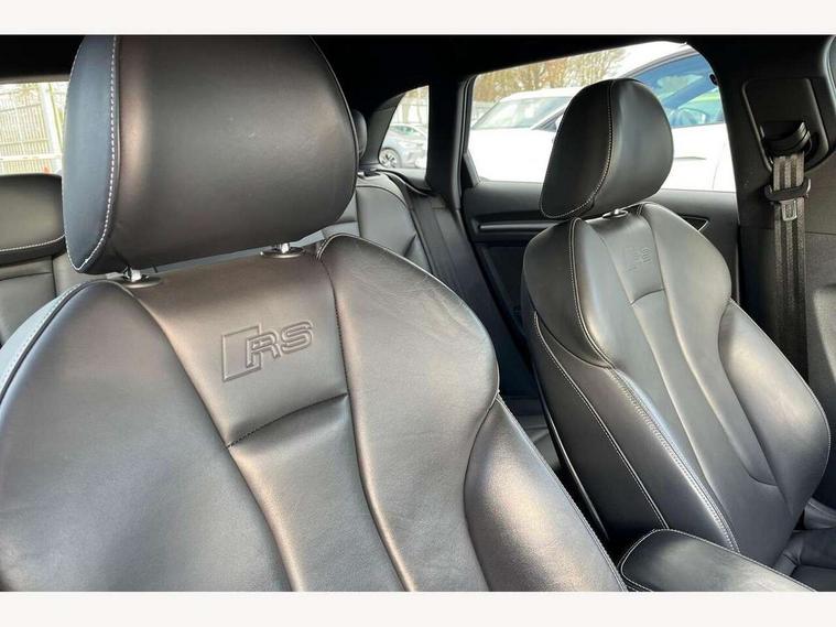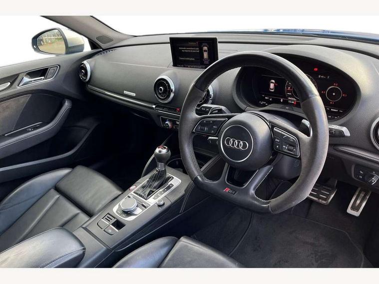 Audi connect, Audi drive select, Audi smartphone interface, Audi virtual cockpit - 12.3" high-resolution LCD display with fully customisable instrument cluster, Colour driver's information system display, MMI navigation plus with MMI touch, Mobile telephone preparation - bluetooth interface, Progressive power assisted steering, Service interval indicator, Speed limit display, Voice control system, RS sports suspension, 2 USB ports, Audi music interface, Auxiliary input socket, DAB Digital radio, Audi Beam uses LEDs to project the Audi Sport logo, Auto dimming rear view mirror with light and rain sensors, Black high gloss front air inlet, Body coloured side sills, Electric front windows, Electric operated/heated door mirrors, Electric rear windows, Headlight washers, Heated windscreen washer jets, High gloss black rear diffuser, LED daytime running lights, Rear wiper, RS design body styling, 3 adjustable rear headrests, 3 spoke flat bottomed sports multifunctional leather steering wheel with aluminium look gearshift paddles, 4 lashing points to secure luggage, 60/40 split folding rear seat, Adjustable front armrest, Dual zone electronic climate control, Front and rear interior lights with delay, Heated front seats, Height/depth adjustable steering column, ISOFIX child seat preparation+airbag deactivation, Jack and tool kit, Stainless steel pedals, Storage compartment in centre console, Storage compartment under front seats, Storage compartments in doors, Black Styling pack - RS3, LED interior light pack - A3/RS3, Non smoking pack - RS3, Storage and luggage pack - A3/RS3, 3 point seatbelts on all seats, ABS/EBD, Active bonnet, Active front headrests, ASR, Curtain airbags, Driver and passenger side airbags, Driver/Front Passenger airbags, Drivers knee airbag, EDL, Electromechanical parking brake, ESC - Electronic Stability Control + traction control, Manual rear child locks, Multi-Collision braking, Seatbelt warning, Warning triangle and first aid kit, Anti theft alarm, Anti-theft wheel bolts, Remote control central locking, Thatcham category 1 alarm + immobiliser, Aluminium trim elements, Tyre repair kit,