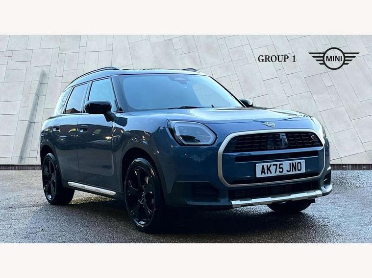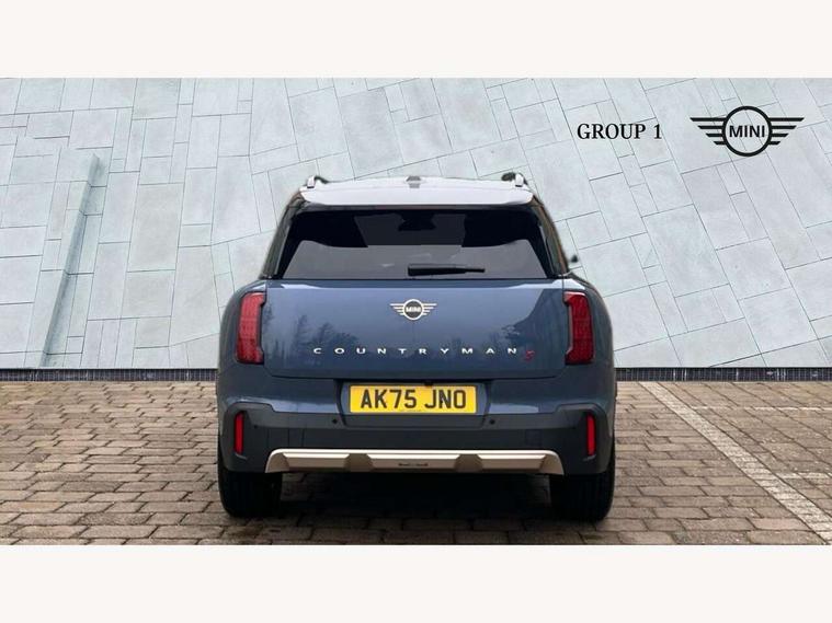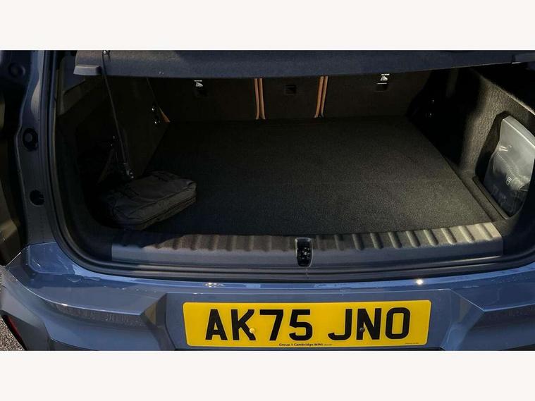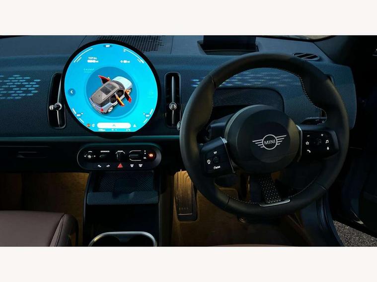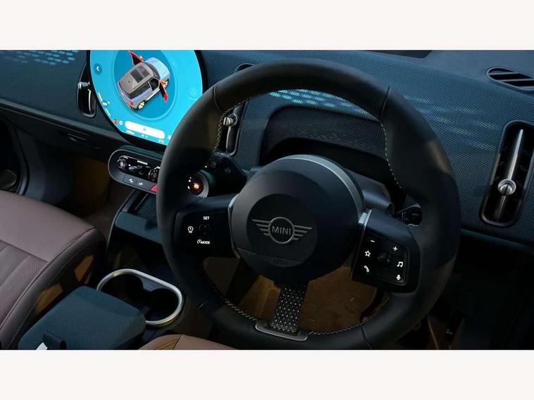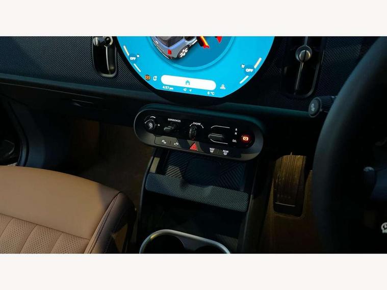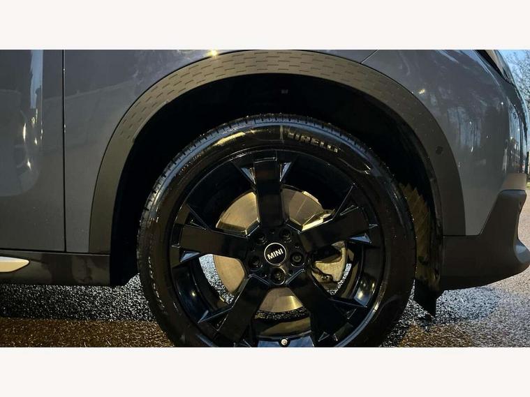 Bluetooth connection, Circular OLED Screen, Compatible mobile phone bluetooth with audio streaming, Cruise Control (DCC), Digital dashboard display, Driving assistant, Driving Assistant Plus Preparation, E-call, Electro-mechanical speed dependant steering assistance, MINI Experience Modes, MINI Head up display, Mini navigation system, MINI TeleServices, Parking assistant in camera and ultrasound based assistance system, rear view camera, parking aid and distance control, Auto transmission with Paddles, Larger capacity fuel tank, 6 speakers, DAB Digital radio, Personal eSim, Auto tailgate, Electric adjustable heated door mirrors, Front and rear electric windows, Heated rear window, High beam assistant, Interior rear-view mirror with automatic anti-dazzle function, LED daytime running lights, LED headlights with extended contents including Adaptable light signatures, LED rear lights, LED third brake light, Logos in Vibrant Silver, Rain sensor with auto headlights, Rear side wing doors, Rear window wiper, Roof rails, Vibrant silver grille surround, 3 Seat sliding rear bench in 2nd row, Anthracite headliner, Auto air conditioning, Driver and front passenger seat heating, Floor mats, Front armrest, Front headrests, Front sport seats, Heated steering wheel, Height and length steering column adjustment, Lidded storage box in Petrol knit, Luggage compartment separating net, Rear headrests, Seat adjustment for rear seats, Single front passenger seat, Sport Vescin Steering Wheel, Sunvisors with vanity mirrors, Vescin synthetic leather upholstery, Vibrant Silver sill inlay, Wireless charging tray, Interior and exterior mirror package - Mini Countryman, 3x3 point rear seat belts, 6 Airbags - front, side, head and seat belt tensioners, ABS, DSC - Dynamic Stability Control, Electronic handbrake, Electronic Stability Programme (ESP), Front ISOFIX (iSize), Hill descent control, Hill hold assist, Hill start assist, Manual rear child locks, Traction control, Tyre pressure monitoring system, Warning triangle, Alarm system with tilt sensor, monitoring doors, bonnet interior and tailgate, Auto drive away locking, Comfort access system, Deadlocking function, Electronic vehicle immobiliser, Locking wheel bolts, Remote control locking, Start/stop toggle with keyless go, Tyre repair kit plus,