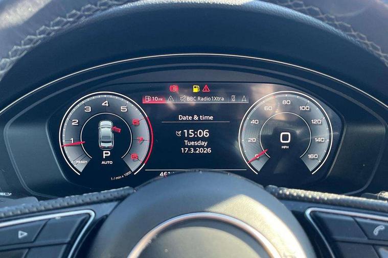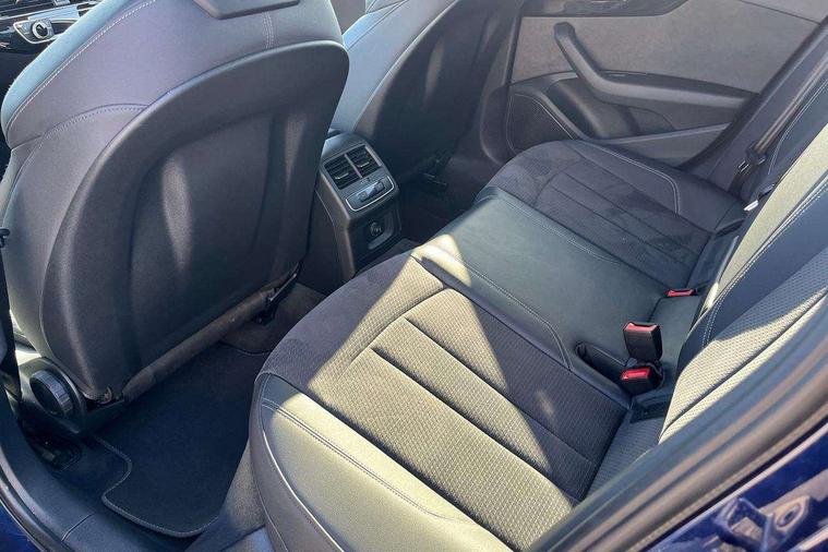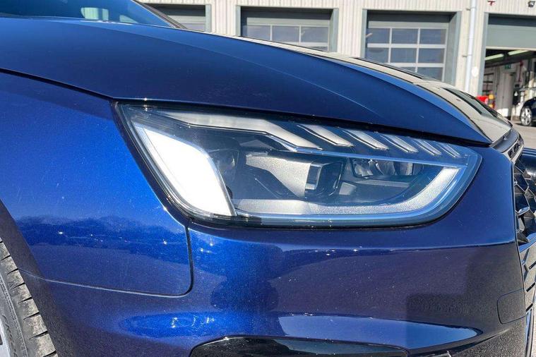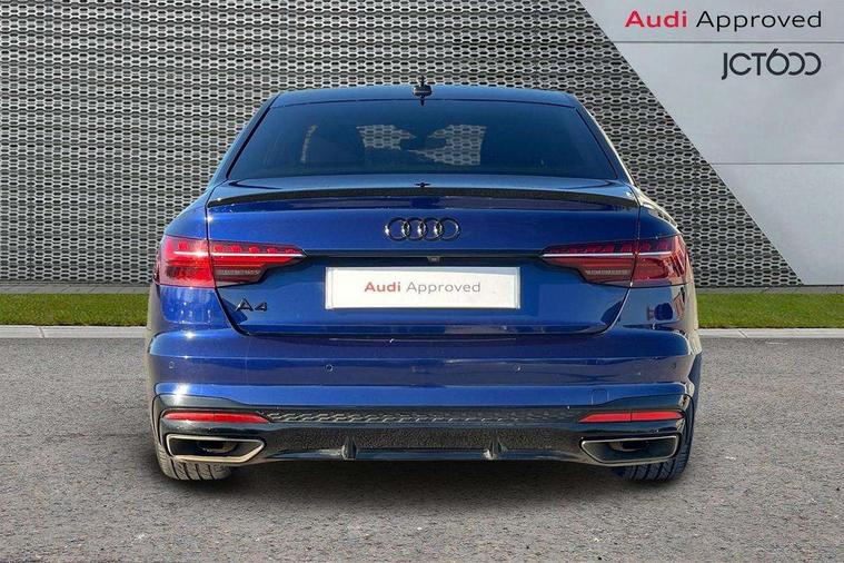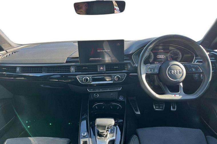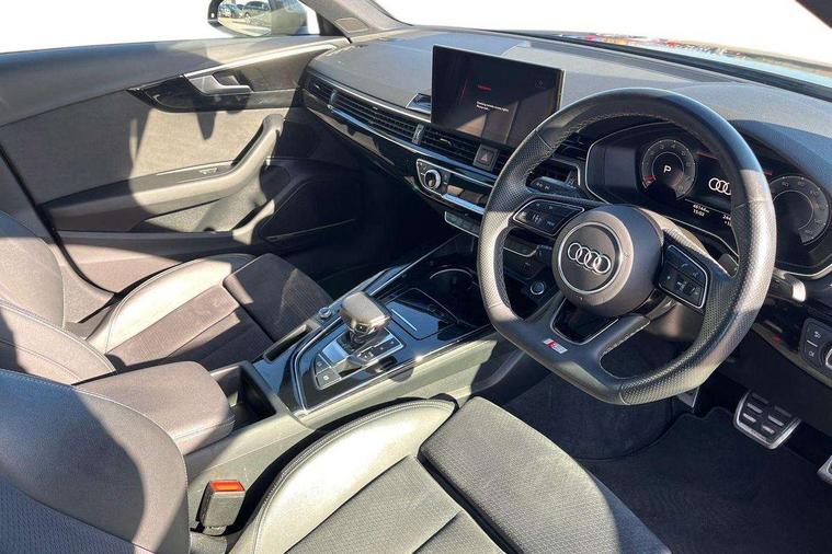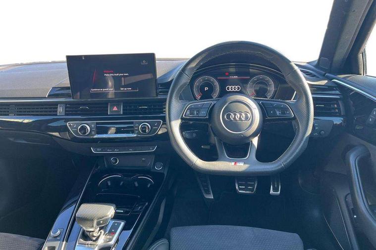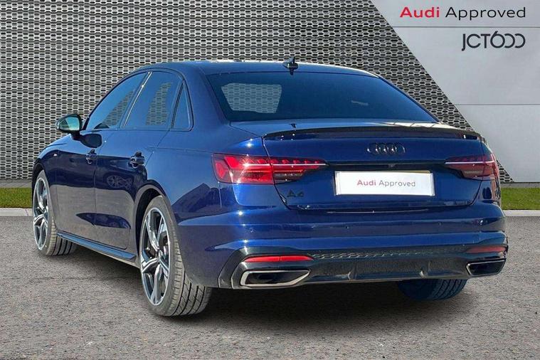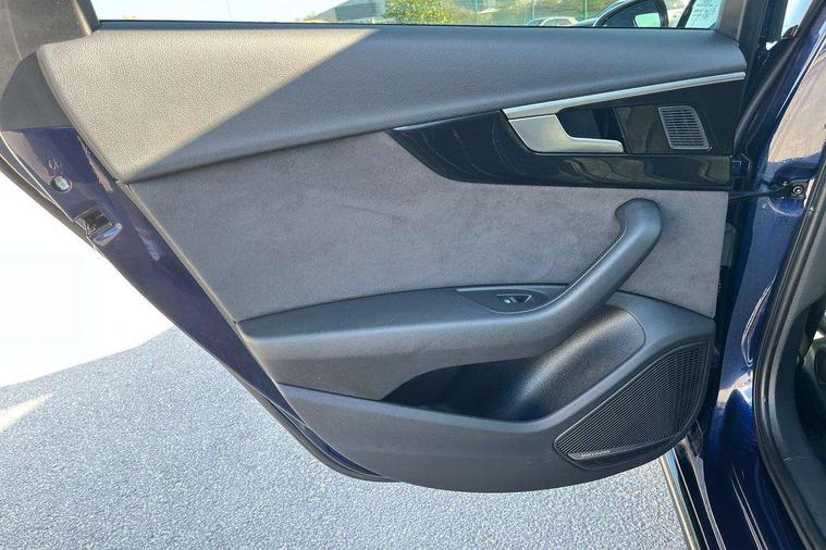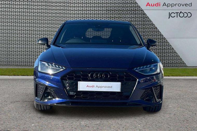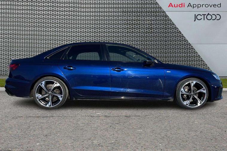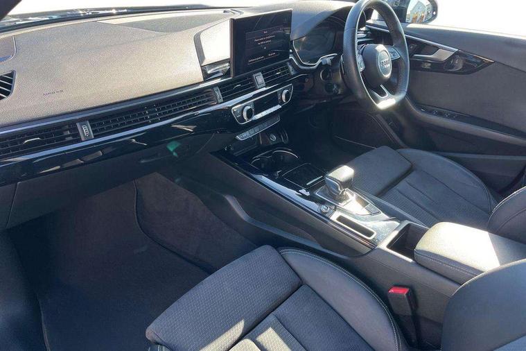 Audi connect safety and service (e-call), Audi connect with Amazon Alexa Integration, Audi drive select, Audi smartphone interface, Audi virtual cockpit, Automatic start-stop system with coasting functionality and efficiency programme, Bluetooth interface, Electric boot lid release, Electromechanical power steering, Email, calendar and text messages displayed via MMI, MMI Navigation plus with MMI touch includes 10.1" high resolution colour MMI display, 3D map, Voice control system, 54 litre fuel tank, Sports suspension lowered by 23mm, 2 USB charging ports, 8 passive loudspeakers, DAB digital radio reception, Audi beam uses LEDs to project the audi logo onto the ground as you exit your A4, Auto dimming rear view mirror, Black Audi rings and black badging (model name in black badging, no engine badging), Body colour door handles, Body colour front spoiler lip, Body colour side sill trim, Electrically folding auto dimming/adjustable/heated door mirrors with LED side indicators and kerb view function for passenger side, Exhaust tailpipes in high dark chrome, Front and rear bumpers with side skirts, Grained matt black side air inlets with matt aluminium silver inlay, High beam assistant, High gloss black B pillar trims and triangular rear door trim, LED headlights with LED rear lights + dynamic rear indicators + headlight adjustment and high beam, turning light + LED daytime running lights, LED third brake light, Privacy glass, Rain and light sensors, Rear boot, Rear diffuser in matt black with trim strip in matt aluminium silver, Rear side wing doors, S Line badges on the front wings, Variable intermittent front wash/wipe, Windscreen with acoustic glazing, 4 way electric lumbar support for driver and front passenger, 40/20/40 split folding 3 rear seat bench in 3 parts with rear centre armrest, Black cloth headlining, Black perforated leather gearknob, Contrast stitching on seats, steering wheel and gear lever gaiter, Deluxe 3 zone electronic climate control, Door sill trims with aluminium inlay, Front and rear head restraints, Front centre armrest, Heated front seats, Illuminated door sill trims with S logo, ISOFIX child seat mounting and top tether, Manual seat adjustment, Single front passenger seat, Stainless steel pedals and foot rest, Black styling pack - A4 Saloon, LED Interior light pack - A4/S4, 3 rear seatbelts, 6 airbags - Driver, front passenger, curtain and side windows, Electronic Stabilisation Control (ESC) including ABS, ASR and EDL, Hill hold assist, Multi collision brake assist, Pop-up bonnet for pedestrian protection, Pre sense city, Rear door child safety locks, Seatbelt monitoring, Warning triangle and first aid kit, Anti theft alarm, Anti theft wheel bolts, Central locking, Keyless Go, Piano black finish inlay, 19" 5 arm flag design Audi sport diamond cut alloy wheels in gloss anthracite black, Tool kit, Tyre repair kit,