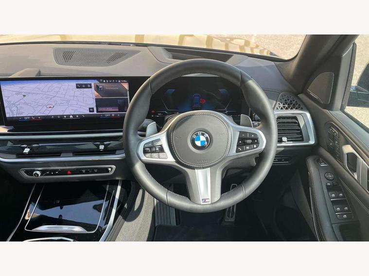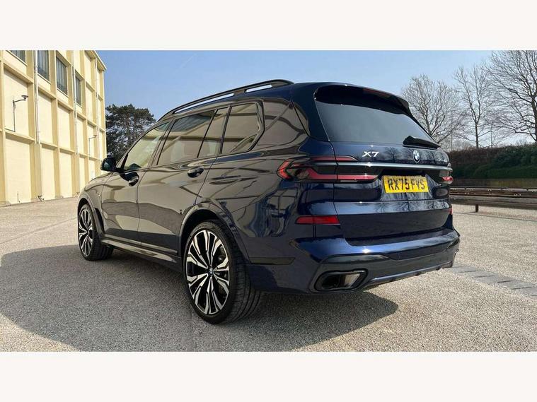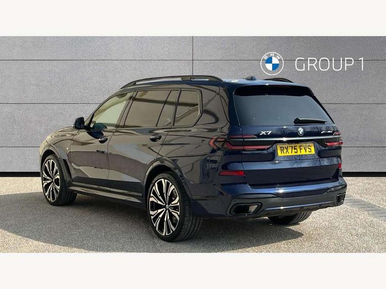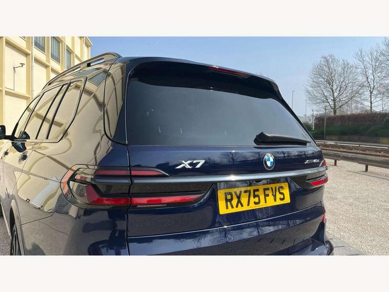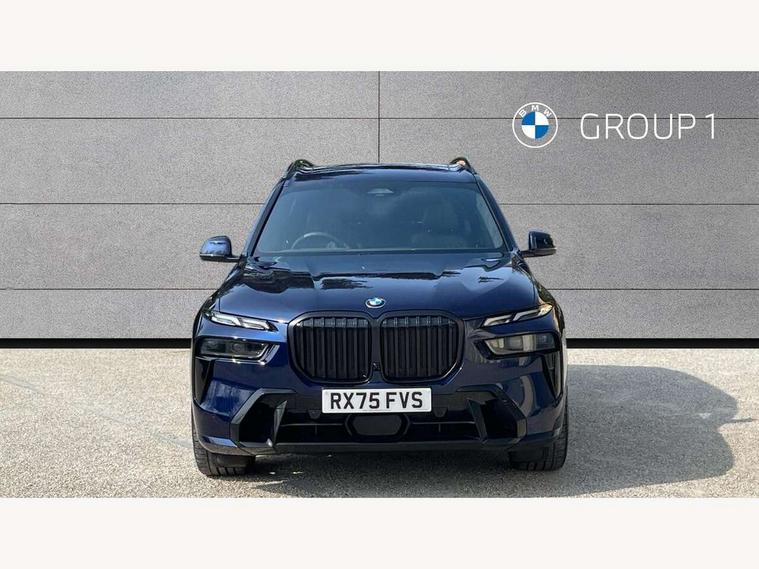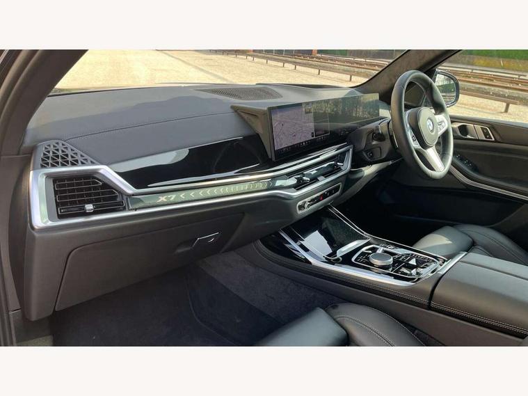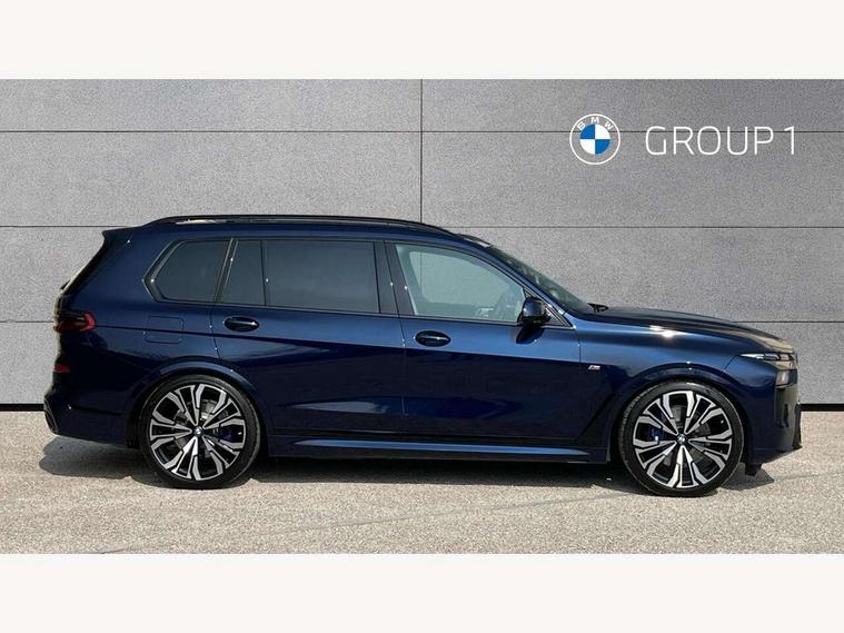 Attentiveness assist, Automatic start/stop function, Automatic tailgate operation, BMW ConnectedDrive online services, BMW Drive recorder, BMW gesture control, BMW Teleservices, Brake pad wear indicator in front and rear, Condition based service, Integrated owner's handbook, Live Cockpit Professional with head up display including 12.3" instrument cluster and 14.9" central display, Parking assistant pro including reversing assistant, PDC, lateral parking aid, reversing assist camera, parking drive off monitoring, 48V Mild hybrid technology, 8 speed automatic with steptronic transmission including automatic hold function and gearshift paddles on the steering wheel, Drive experience switch with comfort mode + ECO PRO + sport mode, Permanent all wheel drive, 2 rear USB-C ports, 2x Front USB (1x USB-C, 1x USB-A), DAB radio, Personal eSim, Acoustic glazing, Adaptive air flap control bars in high gloss black, Air breather and door claddings in high gloss chrome, Body coloured wheel arches, Dynamic brake lights with LED technology, Electrically adjustable and heated aspheric folding side mirrors with auto dimming, electric fold in function, automatic parking function, Exterior and central air inlets in front bumper painted pearl chrome, Follow me home headlight function, Frameless interior mirror, Front and rear electric windows, Heated windscreen washer nozzles, High beam assist, High gloss black shadow line roof rails, High gloss black shadowline trim in side/window frame, window recess cover, window guide, B and C pillar, mirror triangle, mirror base, mirror frame, Integrated turn indicators (door), LED daytime running lights, LED rear lights, LED third brake light in rear spoiler, Rain sensor with automatic headlight activation and windscreen wiper control, Rear side wing doors, Sump guard front and rear painted in silver, Trailer stabilisation logic, 12V - Power sockets with 2x centre console and 1x luggage compartment, 2 seat bench in 3rd row, 2x cupholders in front, rear centre armrest and two in third row seats, 3 seat bench in 2nd row, 3 spoke M leather multifunction steering wheel, 40:20:40 split folding rear seat backrests, Ambient lighting strip in the instrument panel with illuminated, Armrest in front centre console, Compartment in front of cupholder, Driver and front passenger sunvisors with illuminated vanity mirrors and ticket holder, Electrical steering column with adjustable height and length with activation and control on the steering column, Entry sills with illuminated M inscription, Fold down flush into floor of luggage compartment 50:50, Front and rear colour co-ordinated with all standard carpet colours, Front and rear door pockets, Front and rear side armrests integrated into door trim, Front seat back pockets, Grab handles, Height adjustable front headrests, Height adjustable rear headrests, Lockable glove compartment, Nano filter, Single front passenger seat, Soft close doors, Storage tray and compartment with lid in centre console, Wireless charging tray, Additional storage compartment pack - X7, Ambient light interior pack - X7, Connected Package Professional - X7, Interior lighting pack - X7, Luggage compartment pack - X7, M aerodynamics pack - X7, M Sport pack - X7, 3 point seatbelts on all seats, front pyrotechnic belt tensioners, stopper and belt force limiters, front and outer rear seats, Acoustic protection for pedestrians, Active protection, Airbag - Front driver and passenger, side airbags and Head airbags, Anti lock braking system (ABS) with cornering brake control, BMW emergency call, Child seat ISOFIX attachment rear outer seats in 2nd row and both seats in 3rd row includes top tether, Comfort access system with digital key plus, Comfort cushion seats for outer seats in 2nd row, Crash sensor inclu activation of airbags, interior light, safety battery terminal clamp, hazard warn flasher, unlock doors, deactivation of fuel pump, DSC - Dynamic Stability Control, Dynamic Traction Control - DTC, Electromechanical parking brake with automatic drive away release and auto hold function, Front and rear brake discs with interior ventilation, Hill descent control, Integrated braking system, Manual child lock in rear doors, PC iBrake PostCrash approach control warning with light braking function, Tyre pressure monitoring system, Tyre pressure sensors, Variable torque distribution, Warning triangle and first aid kit, Alarm, Central locking including 2 vehicle keys with integrated emergency key, Engine immobiliser, Locking wheel bolts, Galvanic embellisher for controls,