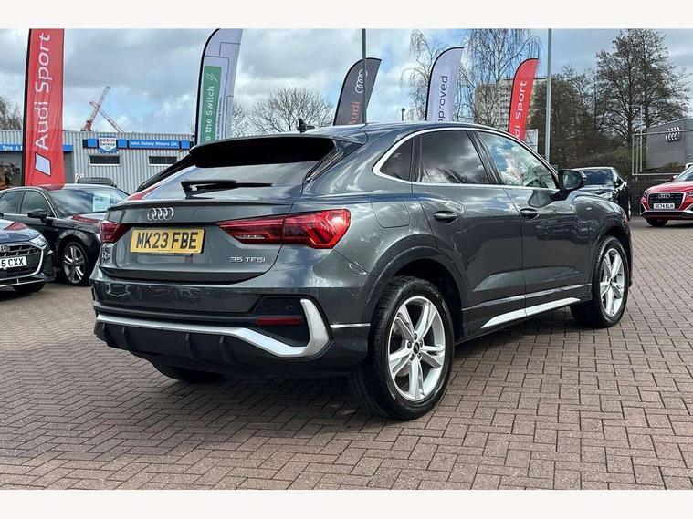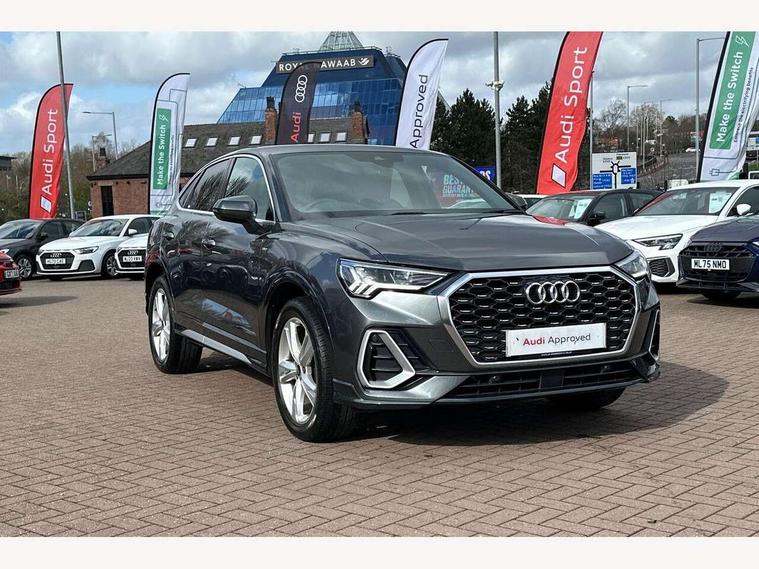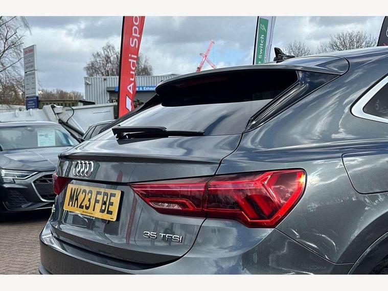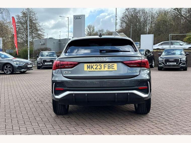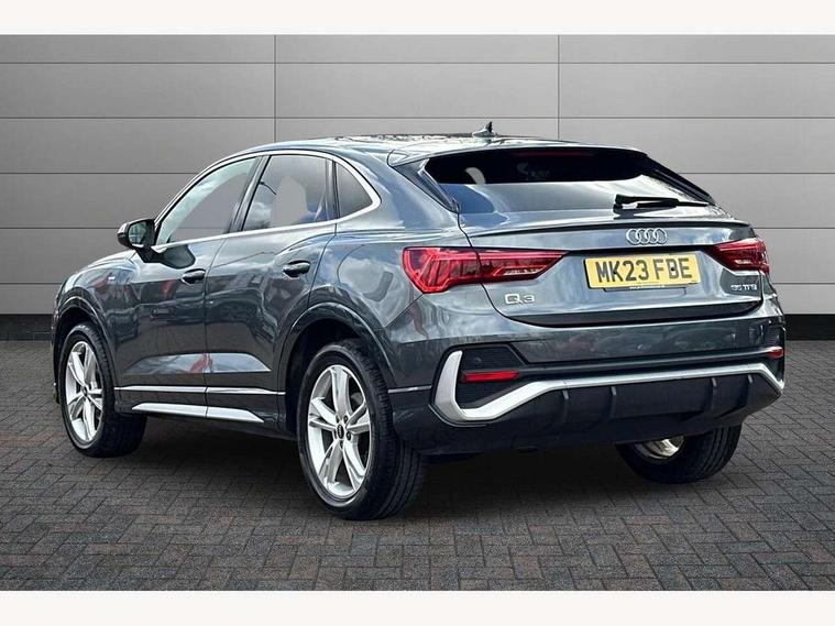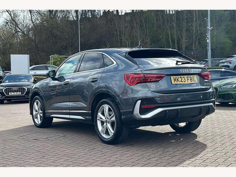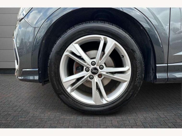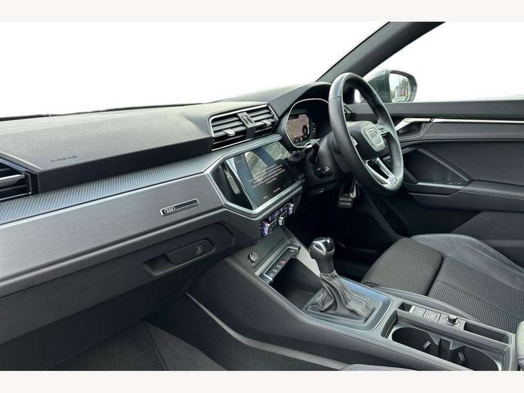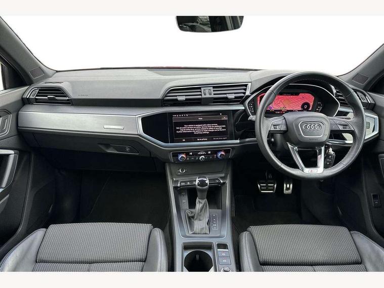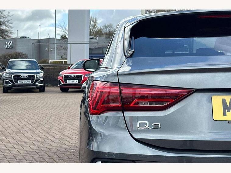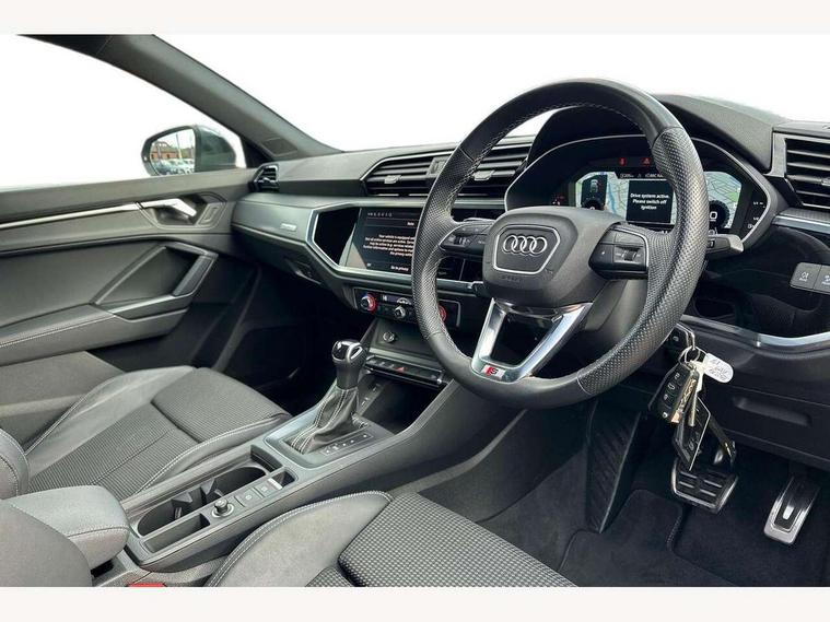 Audi drive select, Audi lane departure warning, Audi Virtual Cockpit - 10.25" display, Bluetooth interface, Camera based traffic sign recognition, Legal emergency call, MMI Navigation Plus with high resolution 10.1 inch touchscreen colour display, Power operated tailgate, Progressive steering, Service interval indicator, Smartphone interface includes wireless Apple carplay/Android Auto, Start stop system with recuperation, Voice control system with natural language interaction, Sports suspension, 2 USB-C ports with charge and data functions, 6 passive loudspeakers, DAB digital radio module, Acoustic windscreen, Aluminium window trim, Auto dimming frameless rear view mirror, Diffuser grille in grained matt black, Diffuser trim in selenite silver, Electrically folding, adjustable and heated door mirrors with integrated LED side indicators and kerb view function for passenger side, Front and rear electric windows, Front fog lights, Front side air inlets in selenite silver, Front underbody protection in manhattan grey paint finish, Grille surround in aluminium silver matt, High gloss black finish B and C pillars, LED Dynamic rear indicators, LED headlights with LED daytime running lights, LED rear lights, LED third brake light, Privacy glass dark tinted rear and rear-side windows (from B-pillar backwards), Radiator grille in anthracite black with inlay in matt aluminium silver, Rain and light sensors, Rear side wing doors, Rear underbody protection in matt black, Rear wiper, S line badges on front wings, S line front and rear bumpers and side skirts in contrasting Manhattan grey paint finish, Side skirt insert in matt Platinium grey, Variable front intermittent wipers, 12V socket in rear centre console, 3 seat bench in 2nd row, 3 spoke leather multifunction steering wheel features S badging and grips in perforated leather with contrast stitching, 40:20:40 folding with manual adjustment for 60:40 forwards/backwards position and backrest angle, Adjustable rear seat bench/backrest with centre armrest and cupholder, Black cloth headlining, Dual zone electronic climate control, Front and rear black floor mats with contrast stitching, Front and rear headrests, Front and rear roof module including reading lights, Front centre armrest, Glove compartment lighting, Height and reach adjustable steering wheel, Illuminated door sill trims with S logo, ISOFIX child seat mounting for front passenger with airbag deactivation and outer rear seat including top tether attachment point for outer rear seats, Luggage compartment light right in white, Luggage compartment sill protection in stainless steel, Manual front seats with height adjustment, Perforated leather gearknob, Single front passenger seat, Stainless steel pedals, Ambient lighting pack - Q3, Non smoking pack - Q3, 3x3 point rear seatbelts, 6 airbags - Driver, front passenger, curtain and side windows, Audi pre-sense front with pedestrain and cyclist recognition, Electrically operated child locks on rear doors, Electromechanical parking brake, Electronic stabilisation control including ABS, ASR and EDL, Front seatbelt reminder, Hill descent control, Hill hold assist, Pre sense basic, Seatbelt monitoring, Tyre pressure warning, Warning triangle and first aid kit, Anti theft alarm, Anti theft wheel bolts, Immobiliser, Remote central locking, Aluminium look interior elements, Black dashboard, Dark matt brushed aluminium inlay, Detail dashboard around MMI touch colour display in glass look, black with surround in aluminium look, Leatherette door armrest,