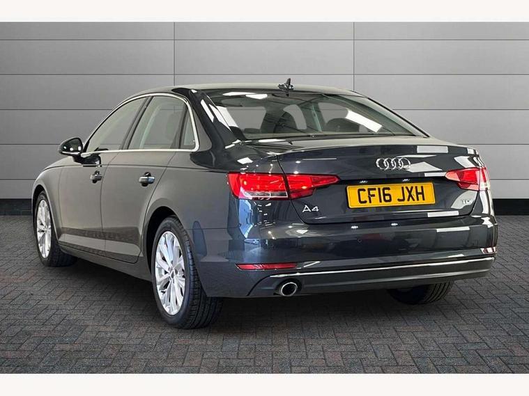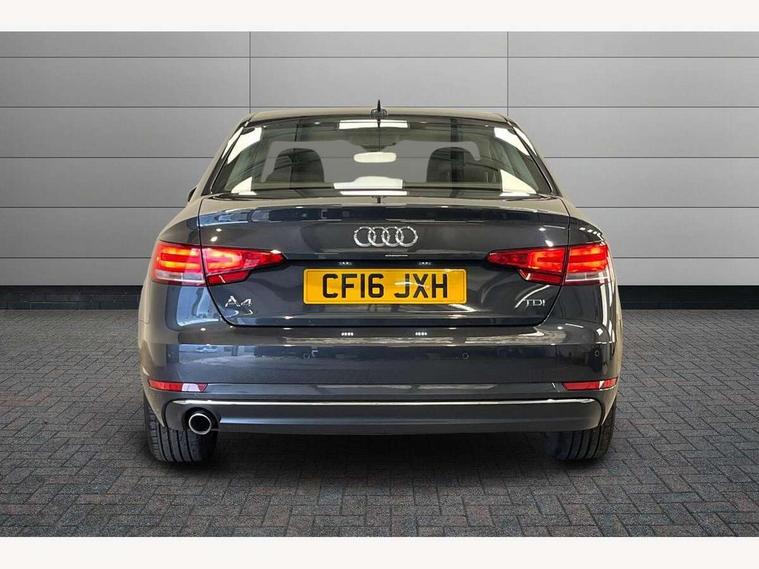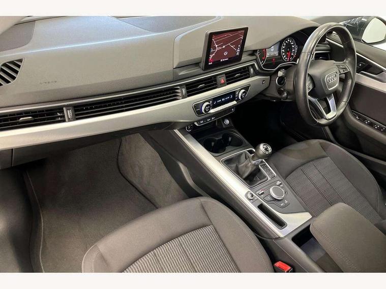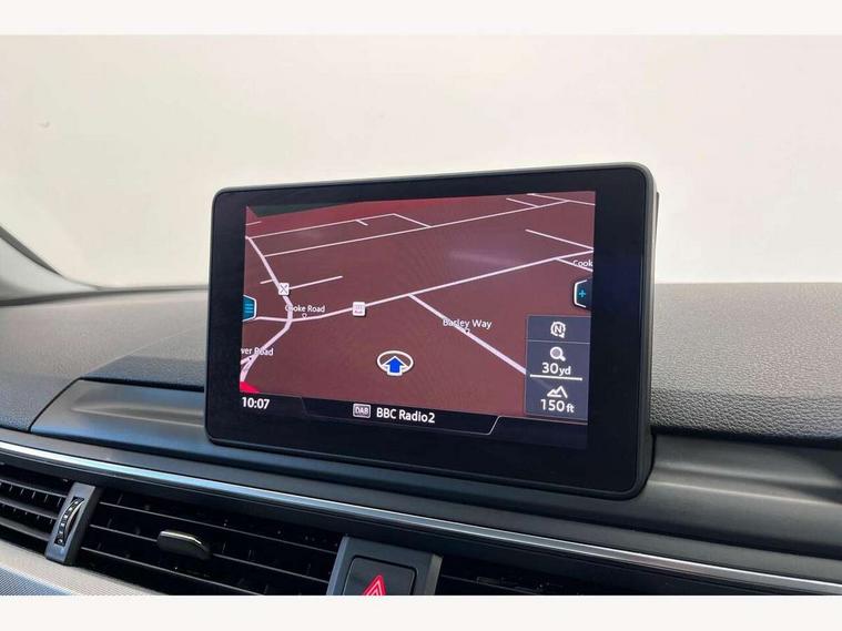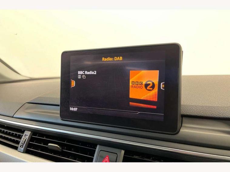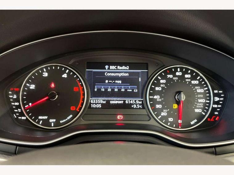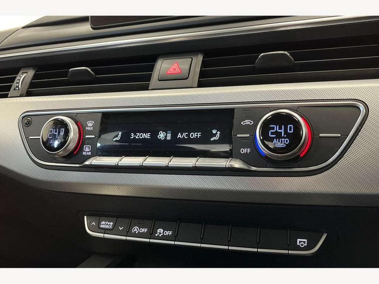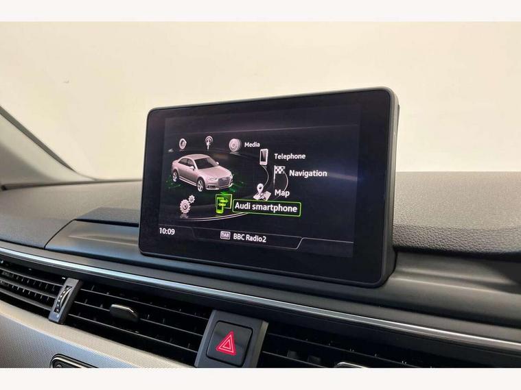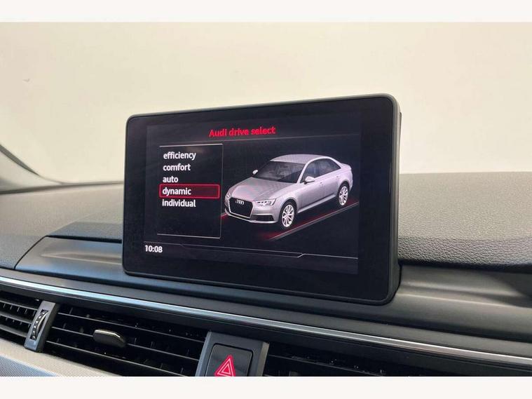 Audi drive select, Audi parking system plus with front and rear sensors, Audi Pre sense collision avoidance, Audi smartphone interface, Auto boot lid opening, Electro-mechanical PAS, Service interval indicator, Stop/start button, Voice control system, 2 USB ports, Aux input, DAB digital radio module, MMI radio plus with CD player, Acoustic windscreen, Auto dimming rear view mirror, Automatic headlights + automatic windscreen wipers, Body colour bumpers, Body colour door mirrors, Chrome rolled exhaust, Electric adjustable heated door mirrors, Electric front windows, Electric rear windows, Headlight range control, LED daytime running lights, Rear diffuser in Titan black, Titan black radiator grille with chrome inlay, 3 zone climate control, Aluminium door sill trims, Front centre armrest with 12v socket, Front/rear floor mats, Gearshift paddles, Isofix child seat preparation for front passenger/outer rear seats inc passenger airbag deactivation, Jack and tool kit, Reach + rake adjustable steering column, Rear headrests, Split folding rear seats, Sunvisors with vanity mirrors, Top tether anchor plate for isofix child seat, Exterior aluminium pack - A4, 3 point seatbelts on all rear seats, ABS/EBD, Adaptive driver and front passenger airbags, Electromechanical parking brake, ESP, First aid kit, Front head airbags, Front seatbelt pretensioners + load limiters, Front side airbags, Seatbelt warning, Traction control, Tyre pressure monitoring system, Warning triangle, Locking wheel bolts, Remote central locking, Thatcham category 1 alarm + immobiliser, Low rolling resistance tyres, Space saver spare wheel,