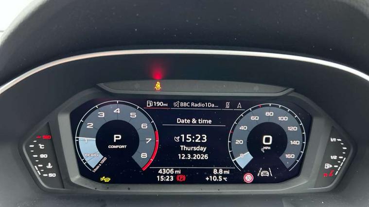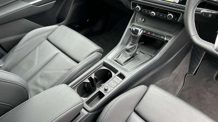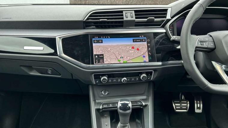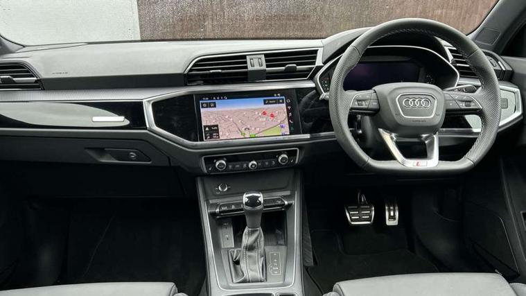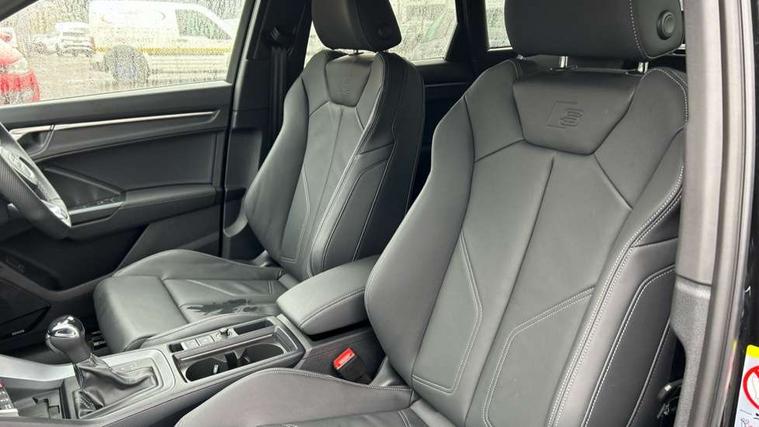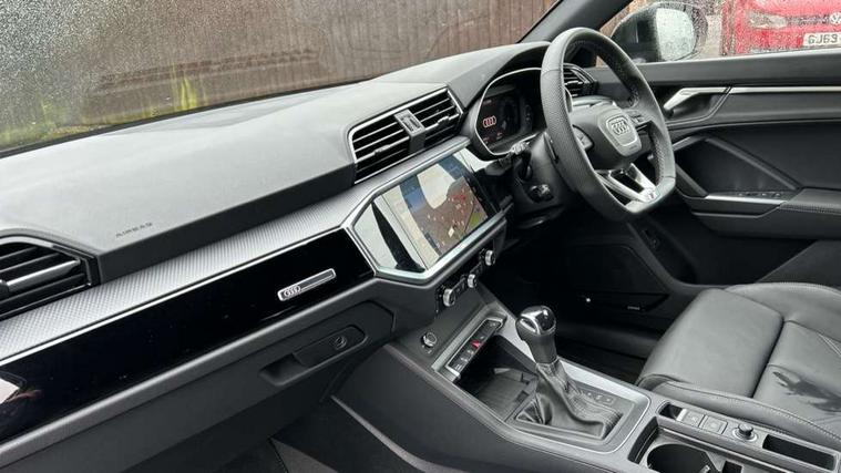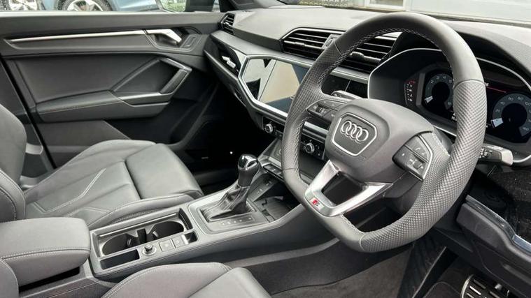 Amazon alexa Integration, Audi connect safety and service, Audi drive select, Audi lane departure warning, Audi Virtual Cockpit - 10.25" display, Bluetooth interface, Camera based traffic sign recognition, Distraction and Fatigue warning, Legal emergency call, MMI Navigation Plus with high resolution 10.1 inch touchscreen colour display, Power operated tailgate, Progressive steering, Service interval indicator, Smartphone interface includes wireless Apple carplay/Android Auto, Start stop system with recuperation, Voice control system with natural language interaction, Sports suspension, 2 USB-C ports with charge and data functions, 6 passive loudspeakers, DAB digital radio module, Acoustic windscreen, Anthracite black radiator grille, Audi Beam uses LEDs to project the Audi logo onto the ground as you exit your Q3, Auto dimming door mirrors, Auto dimming frameless rear view mirror, Black roof rails, Electrically folding, adjustable and heated door mirrors with integrated LED side indicators and kerb view function for passenger side, Front and rear electric windows, Front fog lights, Grille vertical bars in aluminium silver/Matt, High gloss black finish B and C pillars, LED Dynamic rear indicators, LED headlights with LED daytime running lights, LED rear lights, LED third brake light, Privacy glass dark tinted rear and rear-side windows (from B-pillar backwards), Rain and light sensors, Rear diffuser grille in grained matt black, Rear diffuser strip in matt anthracite black, Rear side wing doors, Rear wiper, S line bumpers in contrasting Manhattan grey, Variable front intermittent wipers, 12V socket in rear centre console, 3 seat bench in 2nd row, 40:20:40 folding with manual adjustment for 60:40 forwards/backwards position and backrest angle, Adjustable rear seat bench/backrest with centre armrest and cupholder, Black carpet mats, Black cloth headlining, Dual zone electronic climate control, Electric lumbar support, Front and rear black floor mats with contrast stitching in rock grey, Front and rear headrests, Front centre armrest, Height and reach adjustable steering wheel, Illuminated door sill trims with S logo, ISOFIX child seat mounting for front passenger with airbag deactivation and outer rear seat including top tether attachment point for outer rear seats, Luggage compartment sill protection in stainless steel, Manual front seats with height adjustment, Perforated leather gearknob, Single front passenger seat, Stainless steel pedals, Twin leather upholstery with front sport seats + S embossing, Black styling pack - Q3, Non smoking pack - Q3, 3x3 point rear seatbelts, 6 airbags - Driver, front passenger, curtain and side windows, Audi pre-sense front with pedestrain and cyclist recognition, Electrically operated child locks on rear doors, Electromechanical parking brake, Electronic stabilisation control including ABS, ASR and EDL, Front seatbelt reminder, Hill descent control, Hill hold assist, Pre sense basic, Seatbelt monitoring, Tyre pressure warning, Warning triangle and first aid kit, Anti theft wheel bolts, Immobiliser, Remote central locking, Thatcham approved category 1 anti theft alarm, Aluminium look interior elements, Detail dashboard around MMI touch colour display in glass look, black with surround in aluminium look, Leatherette door armrest, Piano black inlay,