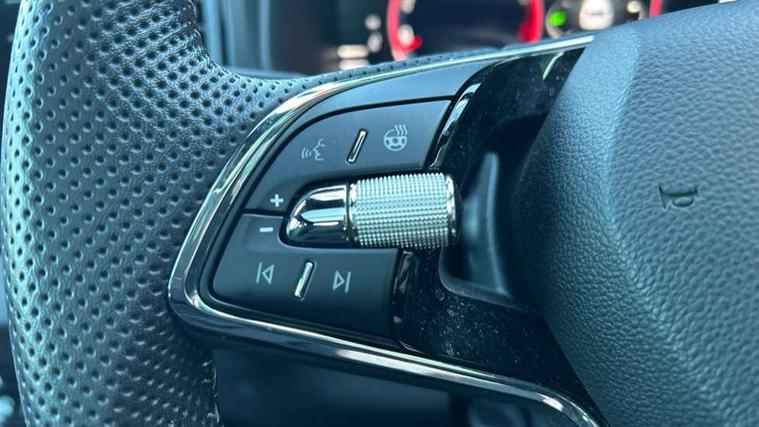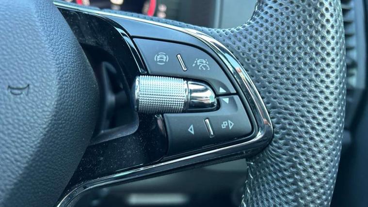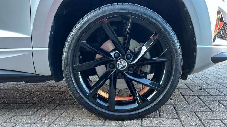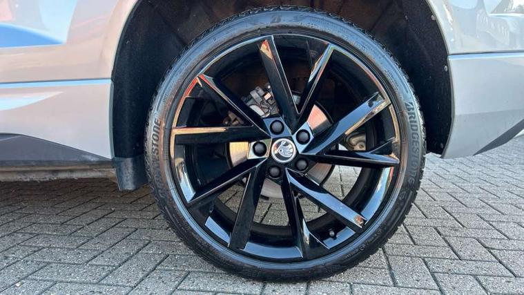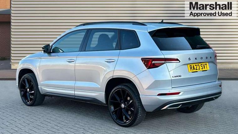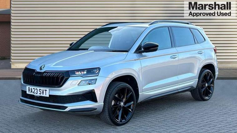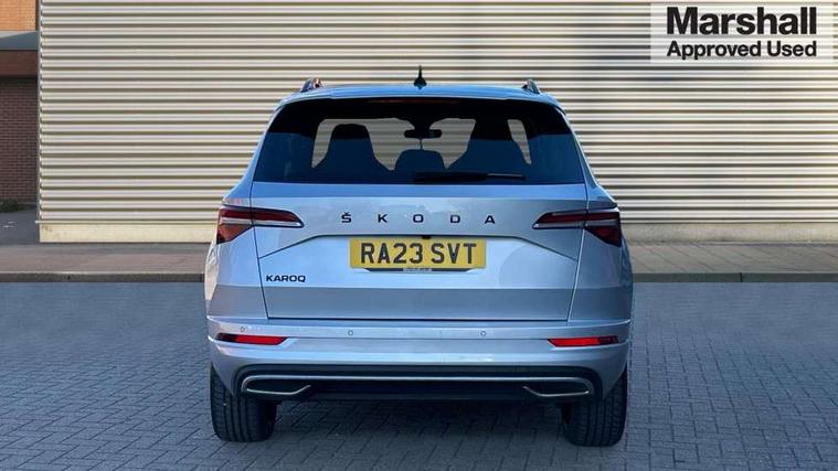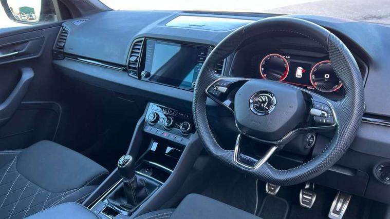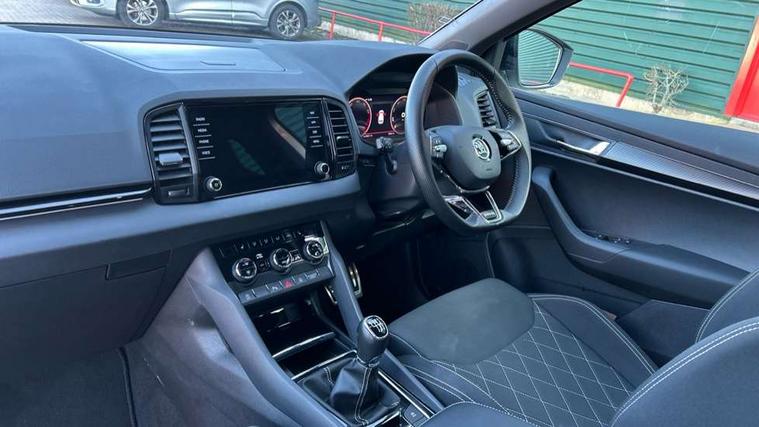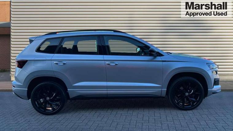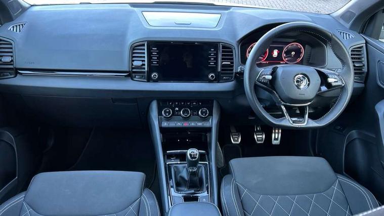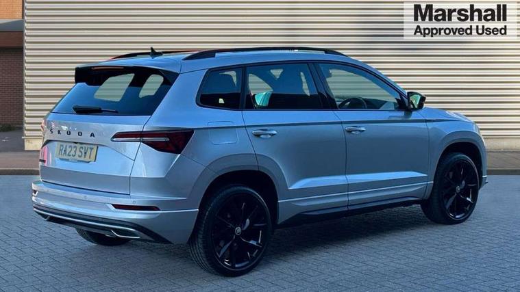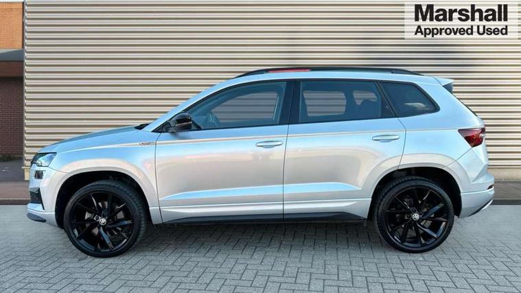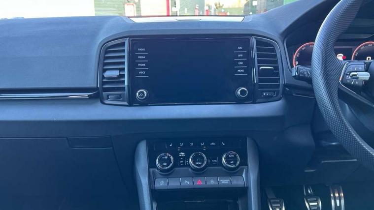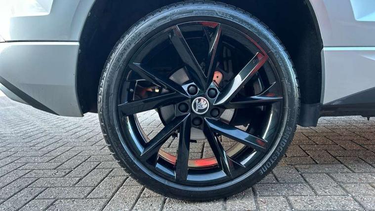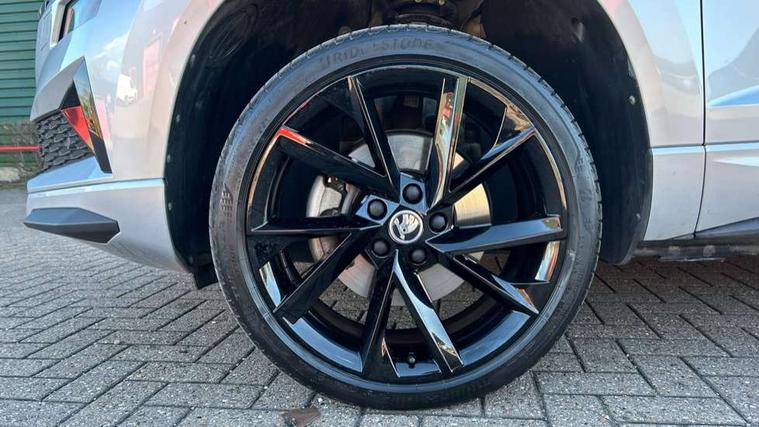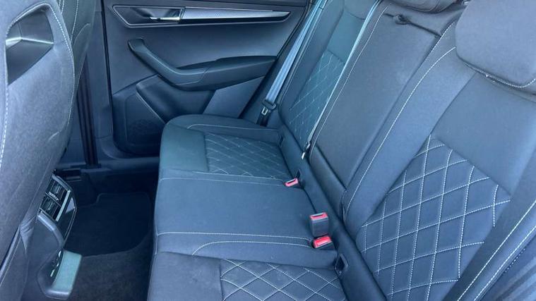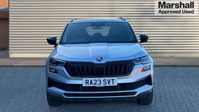 8" Digital display, Care connect, Driver fatigue sensor, Emergency services call system, Outside temperature gauge, Service interval indicator, SmartLink wireless for Apple and wired for Android, Start/stop system with regenerative braking, USB C Port x 2 in front centre console, Virtual cockpit, Virtual pedal with electrically operated boot door, 8 Speakers, DAB radio with Bluetooth, USB connection, Wireless charging without wireless aerial connection, Acoustic glass, Aero front windscreen wipers with intermittent function, Auto dimming rear view mirror with light and rain sensors, Black door mirrors, Black electric window control buttons, Black radiator grille, Black roof rails, Body colour door handles, Electric front and rear windows with child proof lock, Front door steps with SportLine logo, Heated rear windscreen, LED daytime running lights, LED rear lights with high functionality welcome effect and dynamic indicators, Light assistant (coming/leaving home/tunnel light), Panoramic sliding sunroof, Plastic scuff plates, Privacy glass, Protective door side sills in body colour, Rear diffuser, Rear side wing doors, Rear spoiler, Rear window wiper with washer system and intermittent control, Safety reflectors on front doors, Skoda lettering on tailgate in black, Sportline badge on front fender, Sportline decorative inserts with badging, Sports front and rear bumpers, 1.5 litre bottle holders in driver and front passenger door panels, 12V socket in boot, 12v socket in front centre armrest with storage compartment and rear air vents, 3 rear height adjustable headrests, 3 seat bench in 2nd row, 3 spoke leather sports multifunction steering wheel and silver stitching, 4 foldable roof handles with rear coat hooks, Black floor carpet, Black roof headlining, Chrome inner door handles, Double sided boot floor, Foldable hooks in the boot, Front head restraints, Height adjustable front three point seats belts with tensioners, Height/reach adjust steering wheel, Ice scraper, Illuminated glovebox, Illuminated luggage compartment, Isofix child seat preparation outer rear, Manual lumbar support for front seats, Pen holder, Pollen filter, Rear boot cover, Rear reading lights, Rear seats fixed folding and divided 60:40, Rubbish bin door, Safety vest holder, Single front passenger seat, Storage box in upper central dashboard closed, Sunvisors with illuminated vanity mirrors, Textile floor mats, Ticket holder, Titan black interior ceiling, Welcome animation with sportline logo, Boot pack - Karoq, Light Pack - Karoq, Parking pack - Karoq, Automatic door unlocking in case of crash, Automatic fuel cut off in case of crash, Child locks on rear doors, Driver airbag, Electronic parking brake with auto hold function, Emergency rear braking signal, ESC including ABS, MSR, ASR, EDS, HBA, DSR, RBS, MKB and traction control, Front side airbags, Hill hold control, Knee airbags, Passenger airbag with switch-off function, Pedestrian monitor, Seatbelt reminder signalisation and pretensioner for all seats, Three point seatbelts rear, Two tone horn, Tyre pressure display, Tyre pressure monitor, Alarm with interior monitoring, back up horn and tilt sensor with safe function, Electronic engine immobiliser, Keyless entry and start/stop, Remote central locking with 2 remote folding keys, Black air vent surround, Black centre console, Satin black dashboard, Satin black door trim, 19" Sagitarius anthracite alloy wheels with matt black aero inserts, Anti-theft wheel bolts protection, Matt black aero hub caps, Storage on wheel cover, Tool kit,