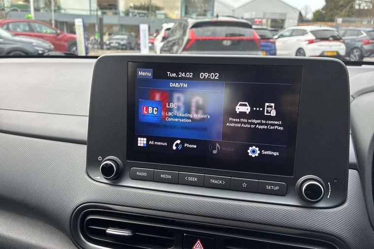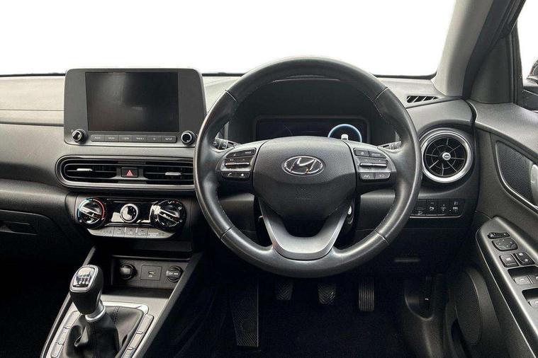 8" Touchscreen display audio + smart device integration, Bluetooth connectivity, Cruise control + speed limiter, Digital clock, Driver attention warning, Driver supervision instrument cluster with 10.25" LCD display, eCall emergency call system, Forward collision avoidance assist with pedestrian detection, Lane follow assist, Lane keep assist, Leading vehicle departure alert (LVDA), Parking system with rear camera and guidance system, PAS, Phone connection with apple carPlay and android auto, Rear parking sensor, Roadside assistance, Windscreen washer fluid sensor and warning indicator, 6 speakers (2 front, 2 tweeters, 2 rear), Front USB ports, RDS and Digital DAB, Steering wheel mounted audio/phone controls, Automatic headlights with dusk sensor, Body colour door mirrors and handles, Door mirror integrated indicators, Electric front/rear windows with drivers one touch/anti-trap, Electrically adjustable and heated door mirrors, Halogen headlights, Halogen rear lights, LED daytime running lights, Positioning Lights - LED, Rear spoiler with integrated LED brake light, Rear wiper, Roof rails, Tinted glass with front door glass and windscreen with shade band, 12V power outlet in front console, 60/40 split folding rear seat, Adjustable head restraints, Air conditioning, Centre interior light, Cloth upholstery, Door scuff plate, Driver's seat height adjustment, Driver/passenger sunvisors and illuminated vanity mirrors, Front interior light, Front passenger seat manual adjustments, Height/reach adjustable steering column, Isofix rear child seat fastenings, Leather wrapped steering wheel and gear knob, Luggage compartment lighting, Luggage hooks, Metal paint effect interior door handles, Parcel shelf, Rear centre console with air vents, Sunglasses holder, Vertical adjustment rear head restraints, Trailer wiring package - Kona, Airbags - front, front side and curtain airbags, Anti-lock brake system, Childproof rear door locks, Downhill brake control, EBD + Brake Assist, Electronic stability control, Fasten seatbelt reminder, Fixed 3 point for second row centre passenger seatbelt, Front seatbelt pretensioners, Height adjustable front seatbelts, Hill start assist control (HAC), Manual parking brake, Passenger airbag deactivate switch, Rear seat alert, Traction control, Tyre pressure monitoring system, Alarm/immobiliser, Deadlocks, Folding key, Locking wheel nuts, Remote central locking, 17" alloy wheels,